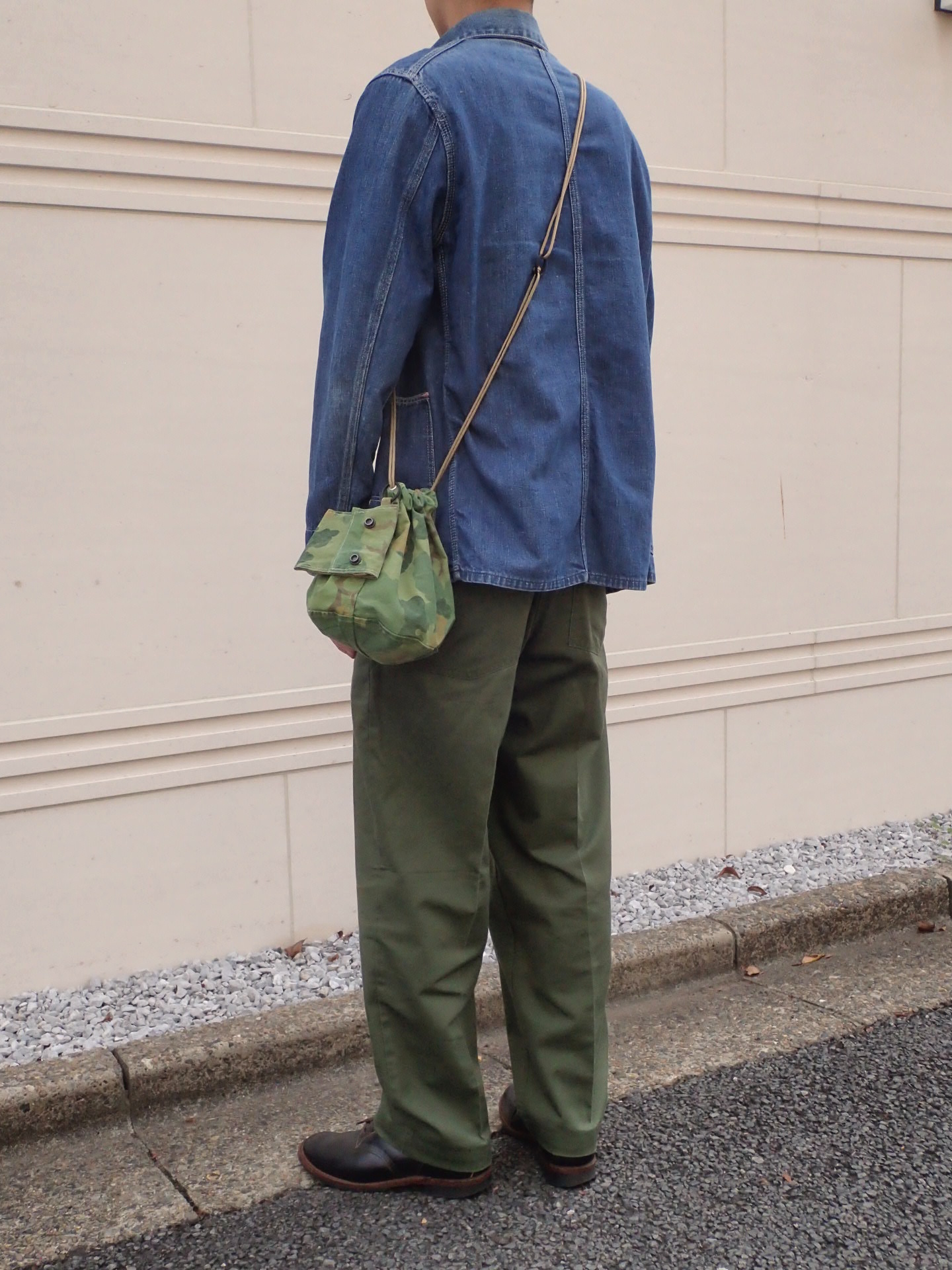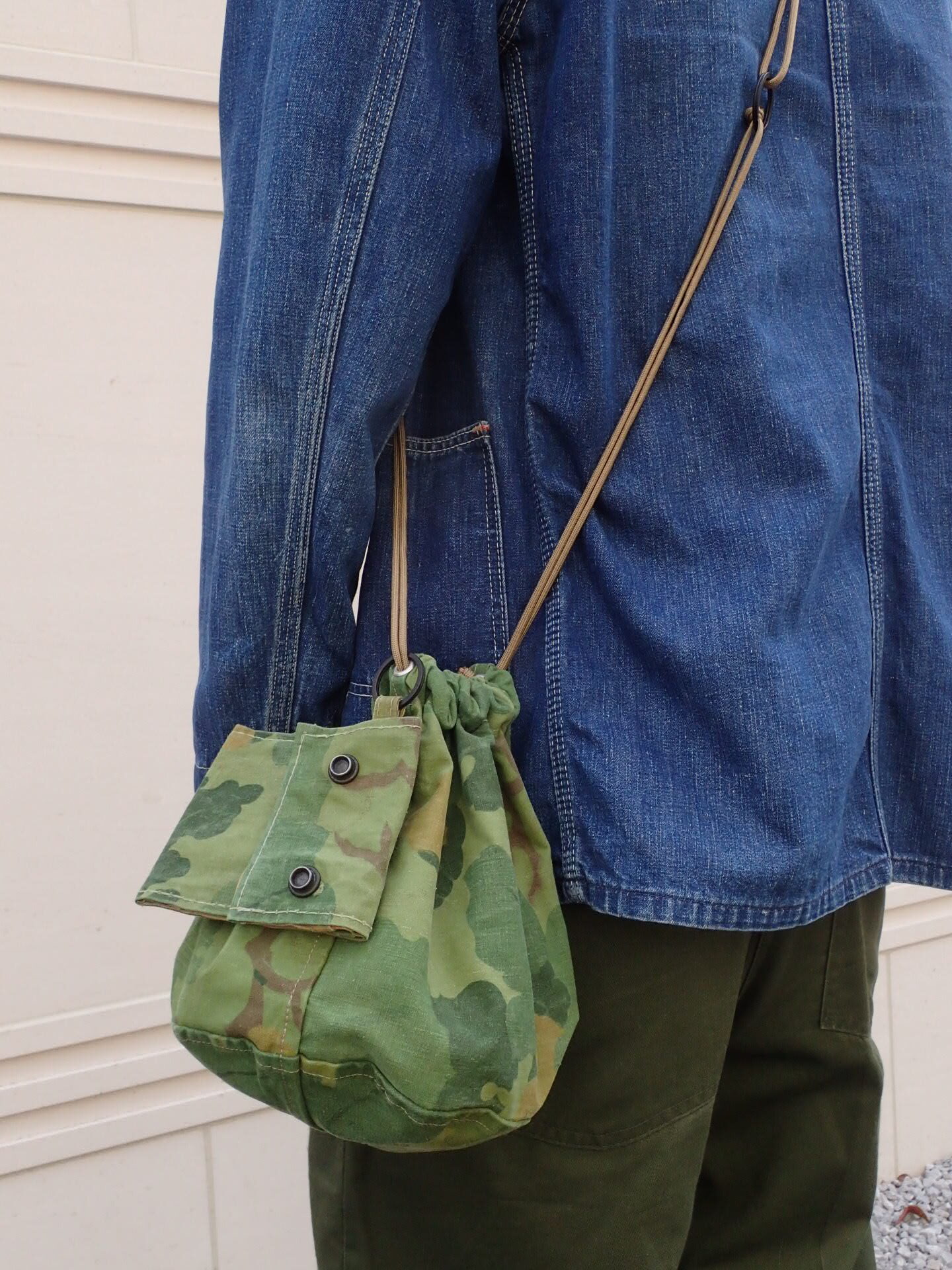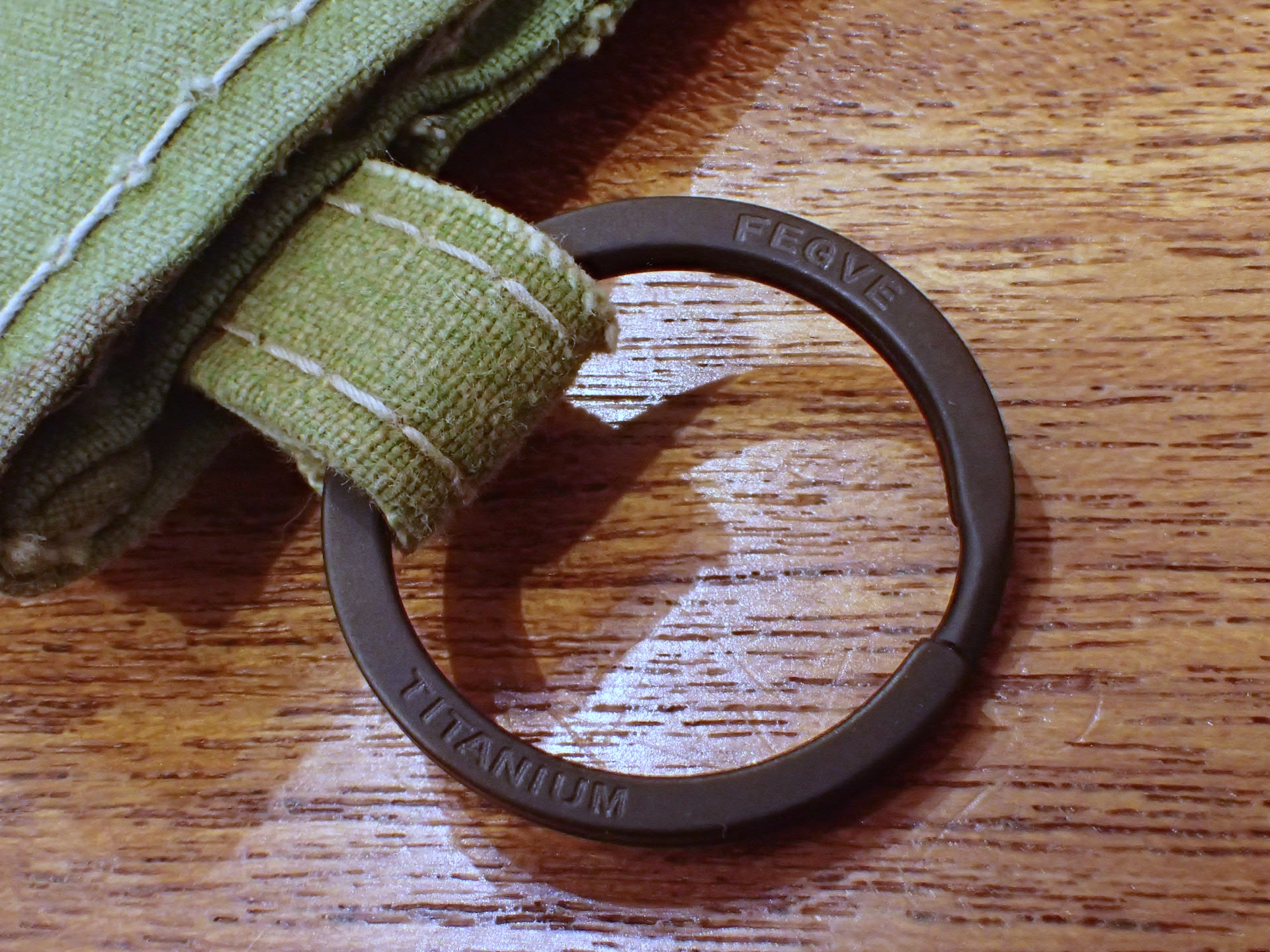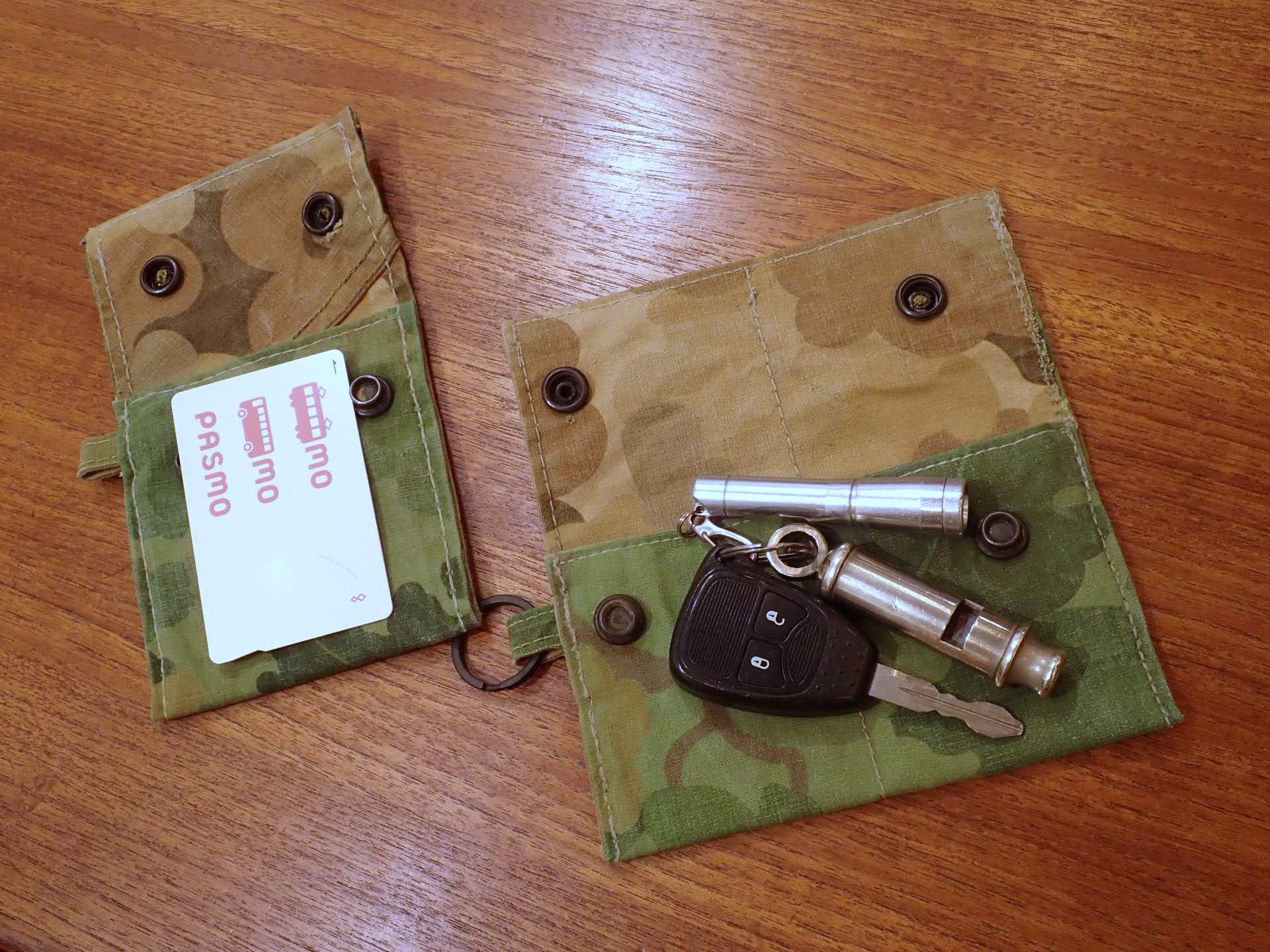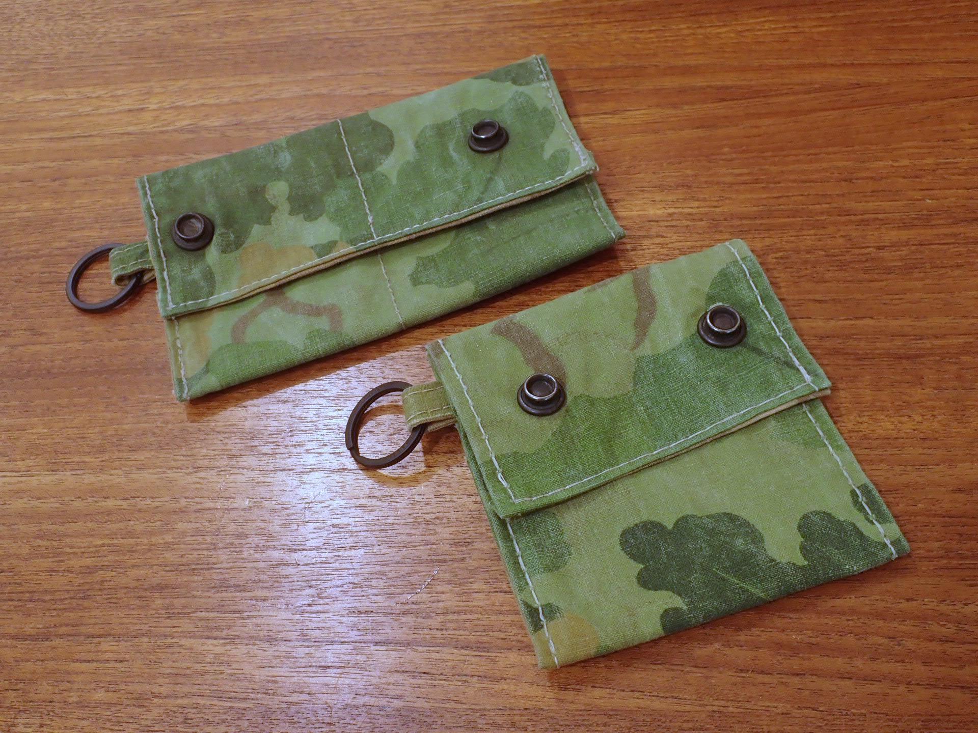 1950年代に使用されたアメリカ海兵隊のテントは2枚を連結して使用されました。この連結に使用したドットボタンをそのまま生かし、2種類のポーチを製作しました。ドットボタンのテイストに合わせ、マットブラック塗装されたチタン製キーリングを装着しています。エフェクツバッグに外付けすることができるので、鍵などを入れるのに便利です。