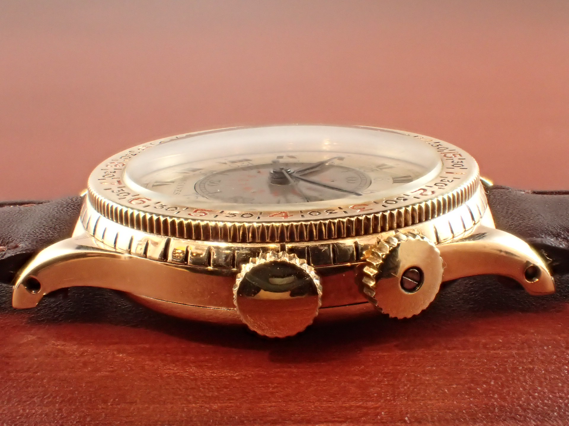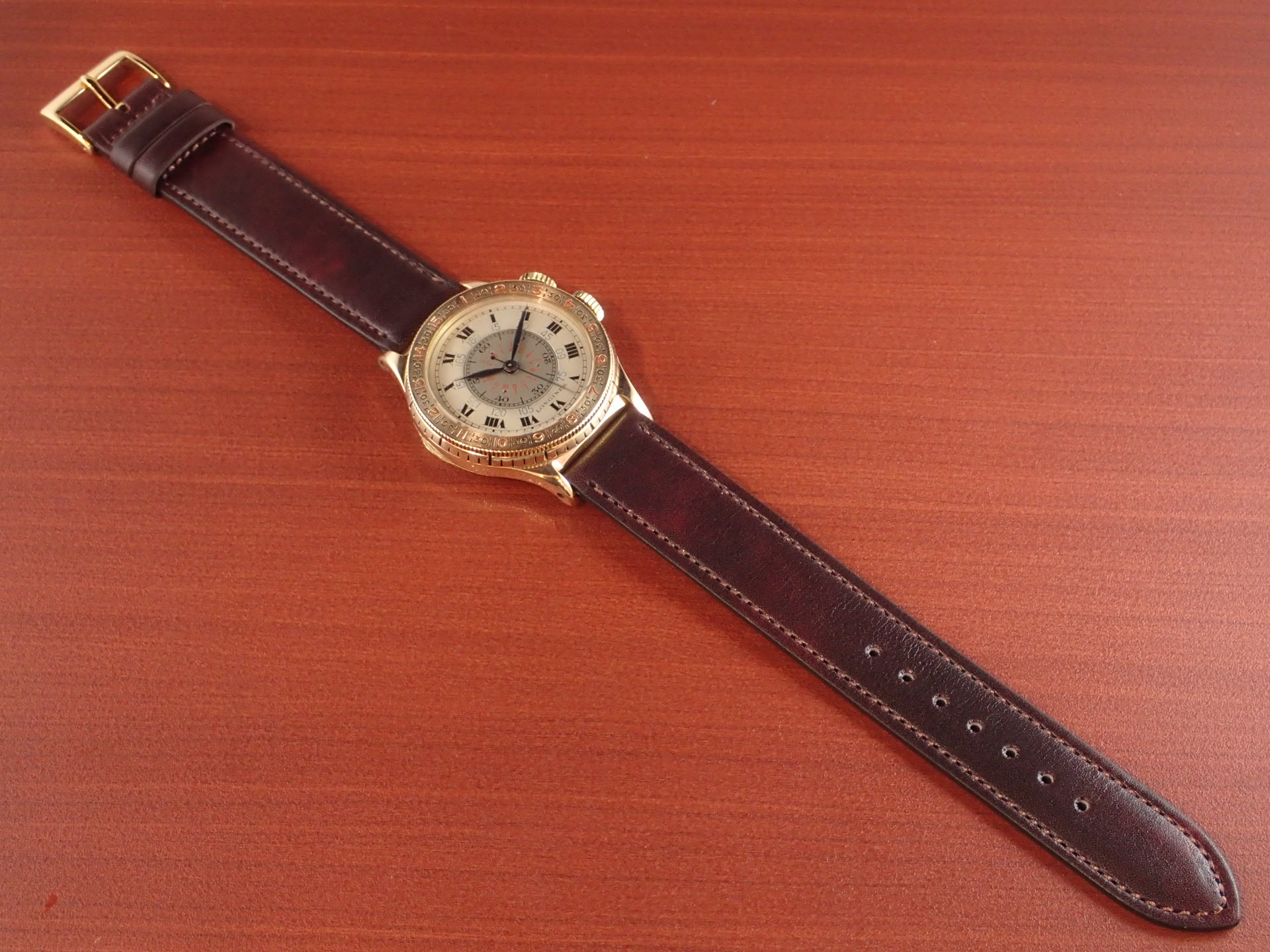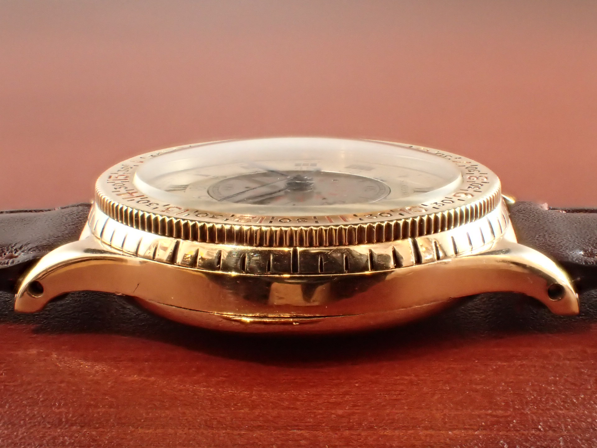 過去、私が見たなかで最高のコンディションを維持しています。インナーレジスターの赤いプリントが若干薄くなっていますが、これほど良い状態の文字盤はなかなか見られないと思います。ブルースチールのリーフハンドもとても綺麗です。ケースはオープナー傷すらない、とても素晴らしい状態。風防以外はオリジナル。ムーブメントはキャリバー10L(10.68N)を搭載、こちらもかなり良い状態を維持しています。分解掃除済みで日差30秒程度で稼働しています。