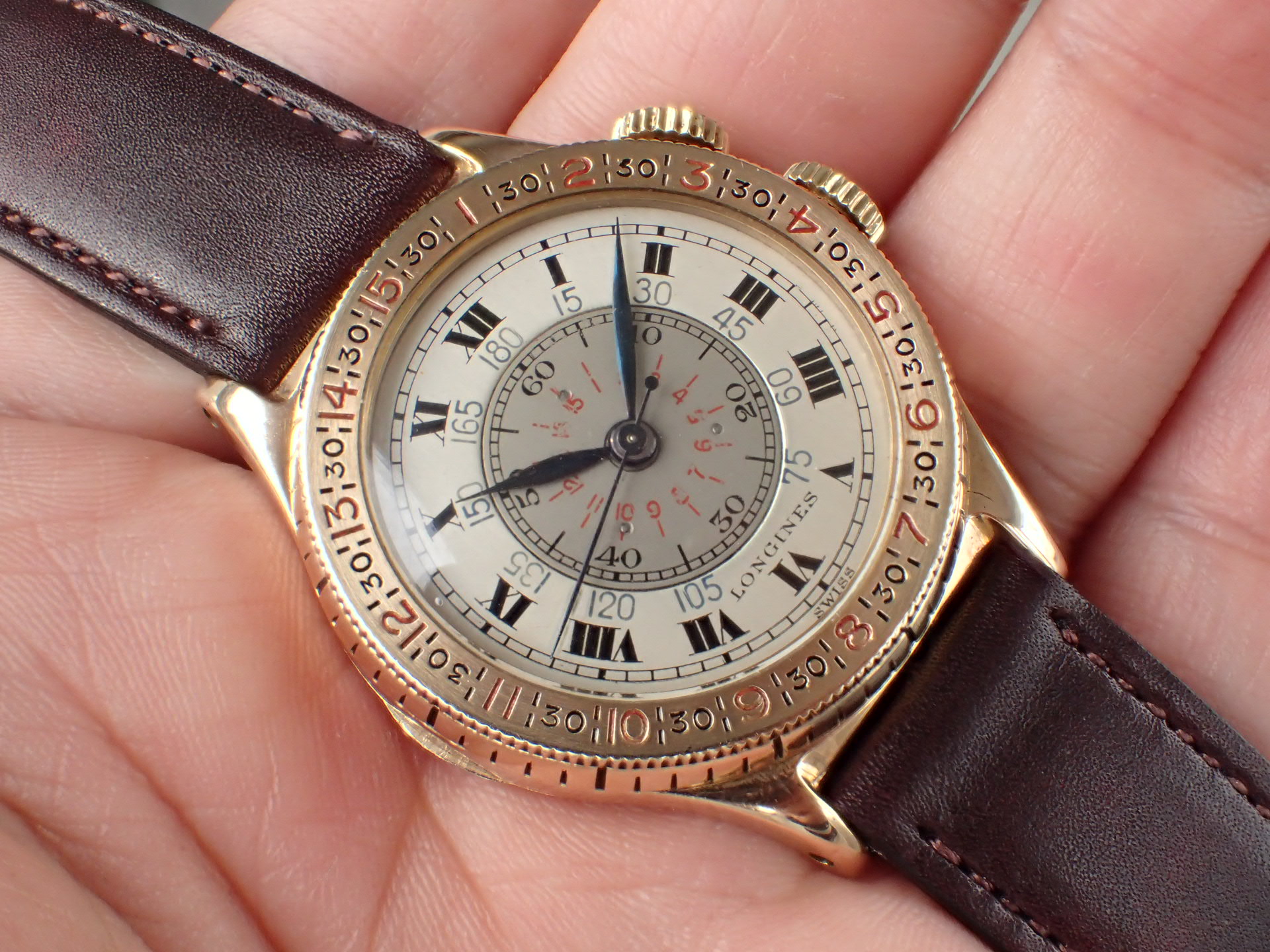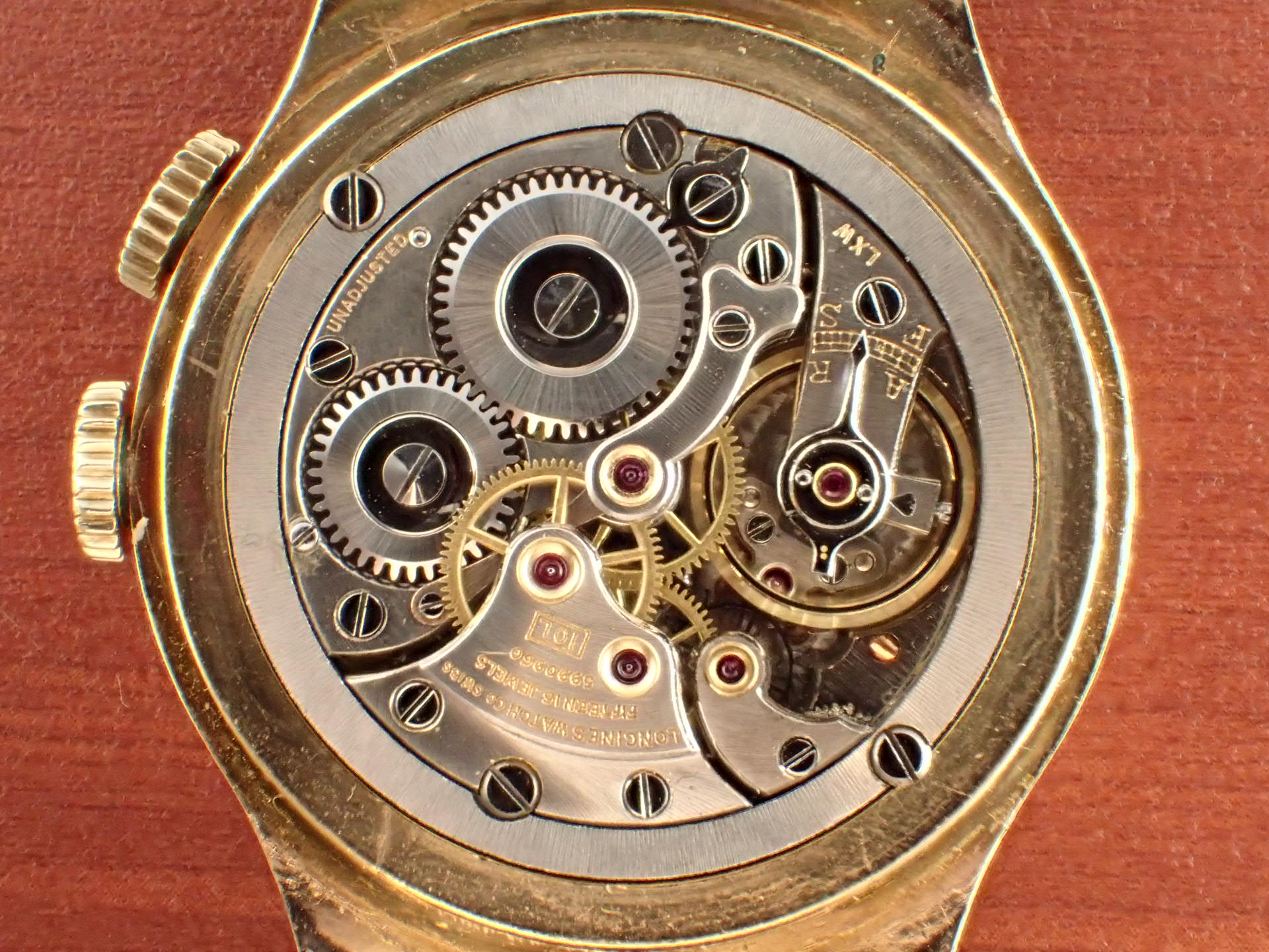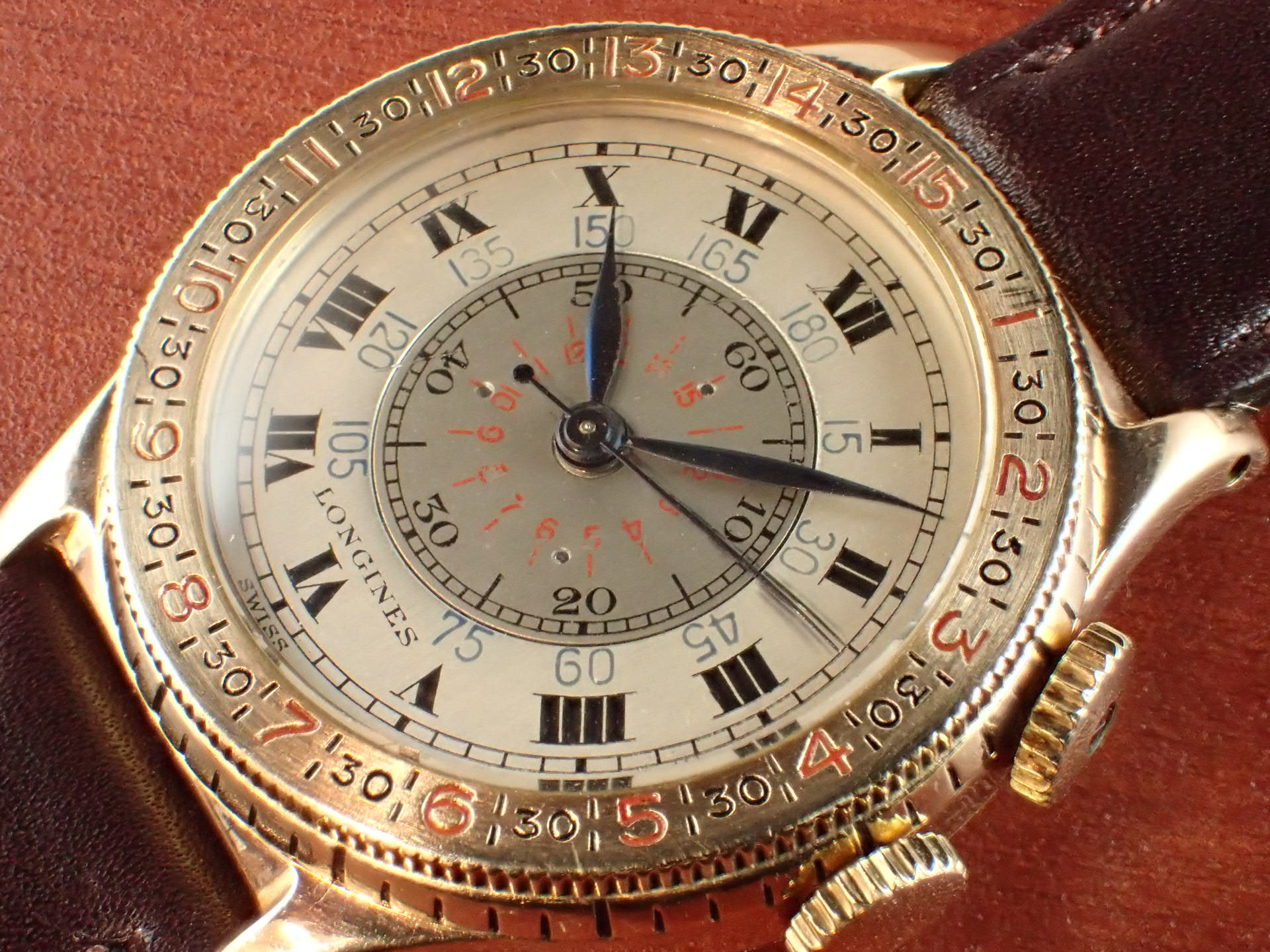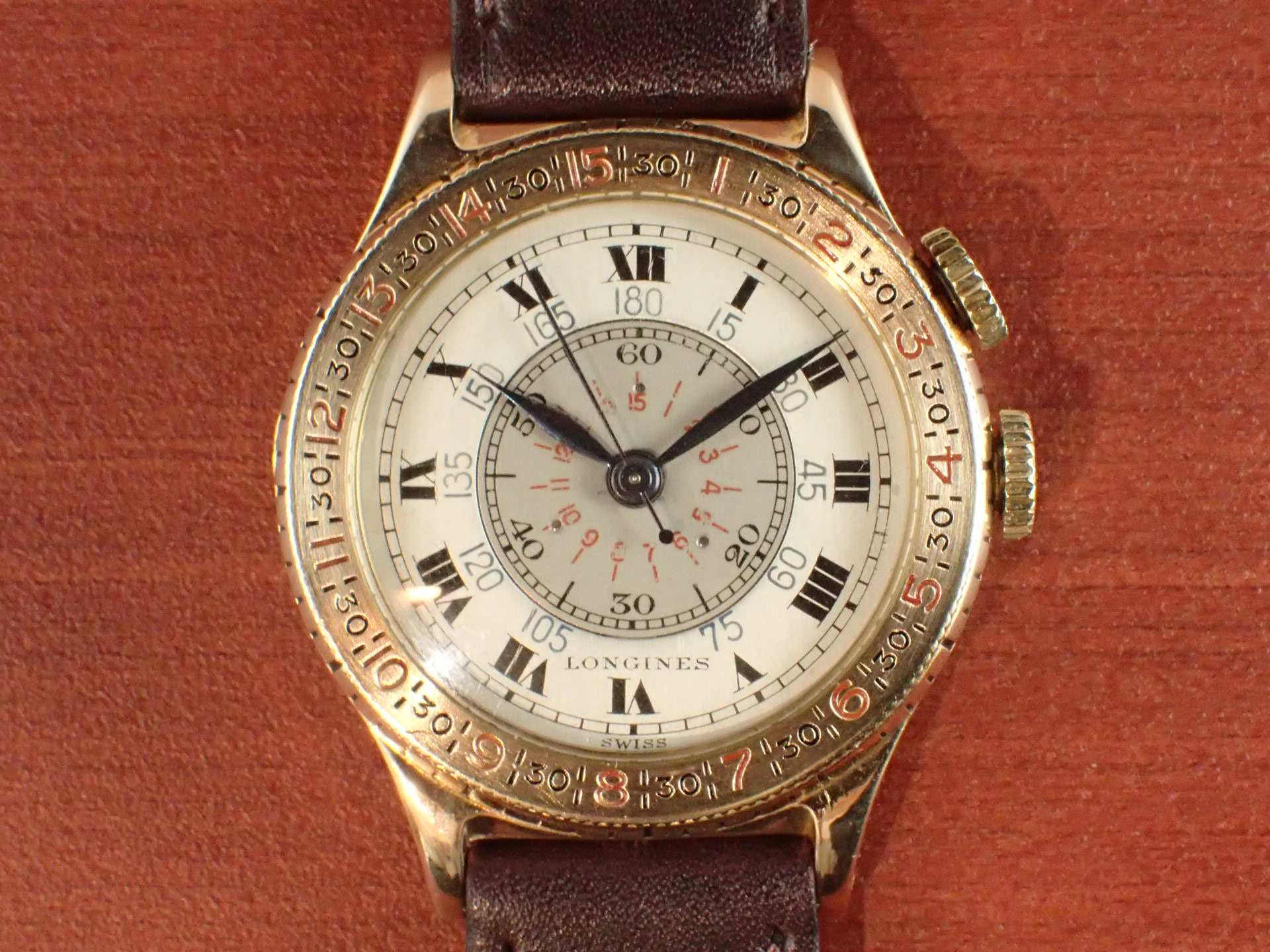 過去、私が見たなかで最高のコンディションを維持しています。インナーレジスターの赤いプリントが若干薄くなっていますが、これほど良い状態の文字盤はなかなか見られないと思います。ブルースチールのリーフハンドもとても綺麗です。ケースはオープナー傷すらない、とても素晴らしい状態。風防以外はオリジナル。ムーブメントはキャリバー10L(10.68N)を搭載、こちらもかなり良い状態を維持しています。分解掃除済みで日差30秒程度で稼働しています。