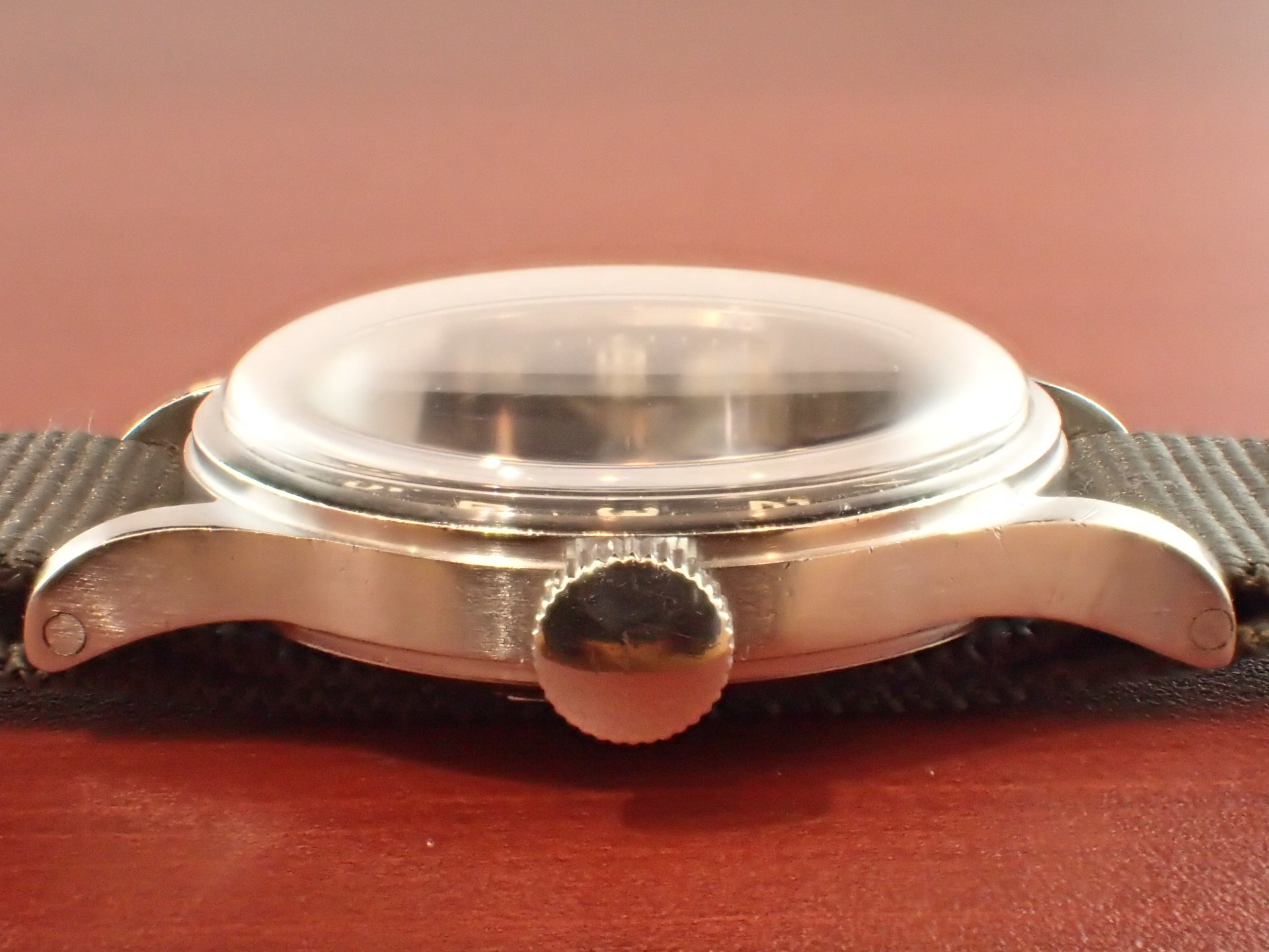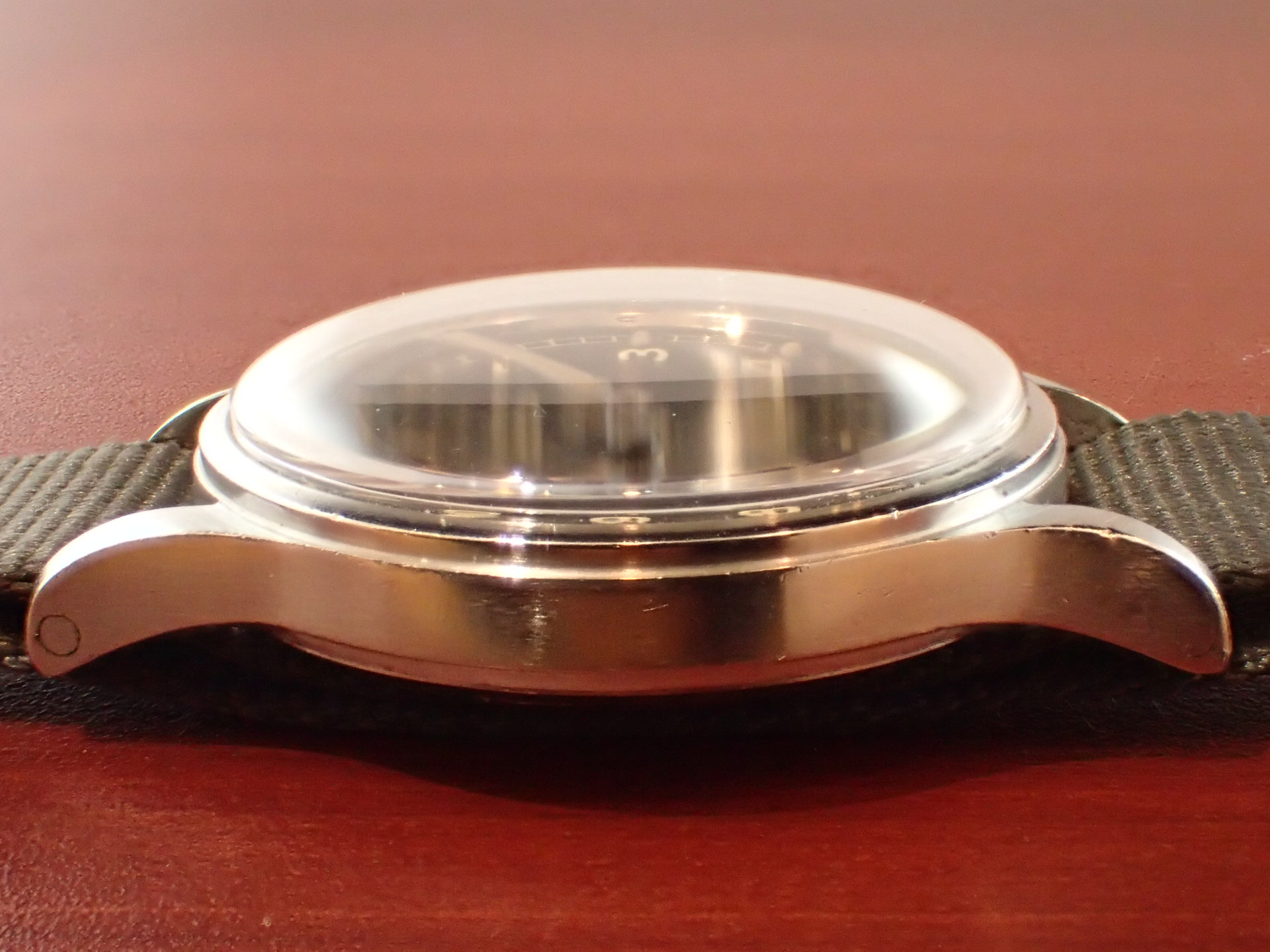 第二次世界大戦でイギリス陸軍が使用した通称「W.W.W.」。このシリーズは当時、12社のメーカーが供給しました。通称「ダーティ・ダース」。性能が高い、30mmキャリバー、30T2を搭載。なかなか綺麗なモデルが見つかりにくい状況です。文字盤はプリントの剥がれもほとんどなく、目立つ傷や汚れがない、大変良い状態です。ケースは小傷がありますが、痩せている感じもなく良い状態です。初級者から上級者まで楽しめるミリタリーウォッチ。スーツでもカジュアルでもカッコよく使えます。ムーブメントは綺麗な状態です。分解掃除済みで日差30秒程度で稼働しています。