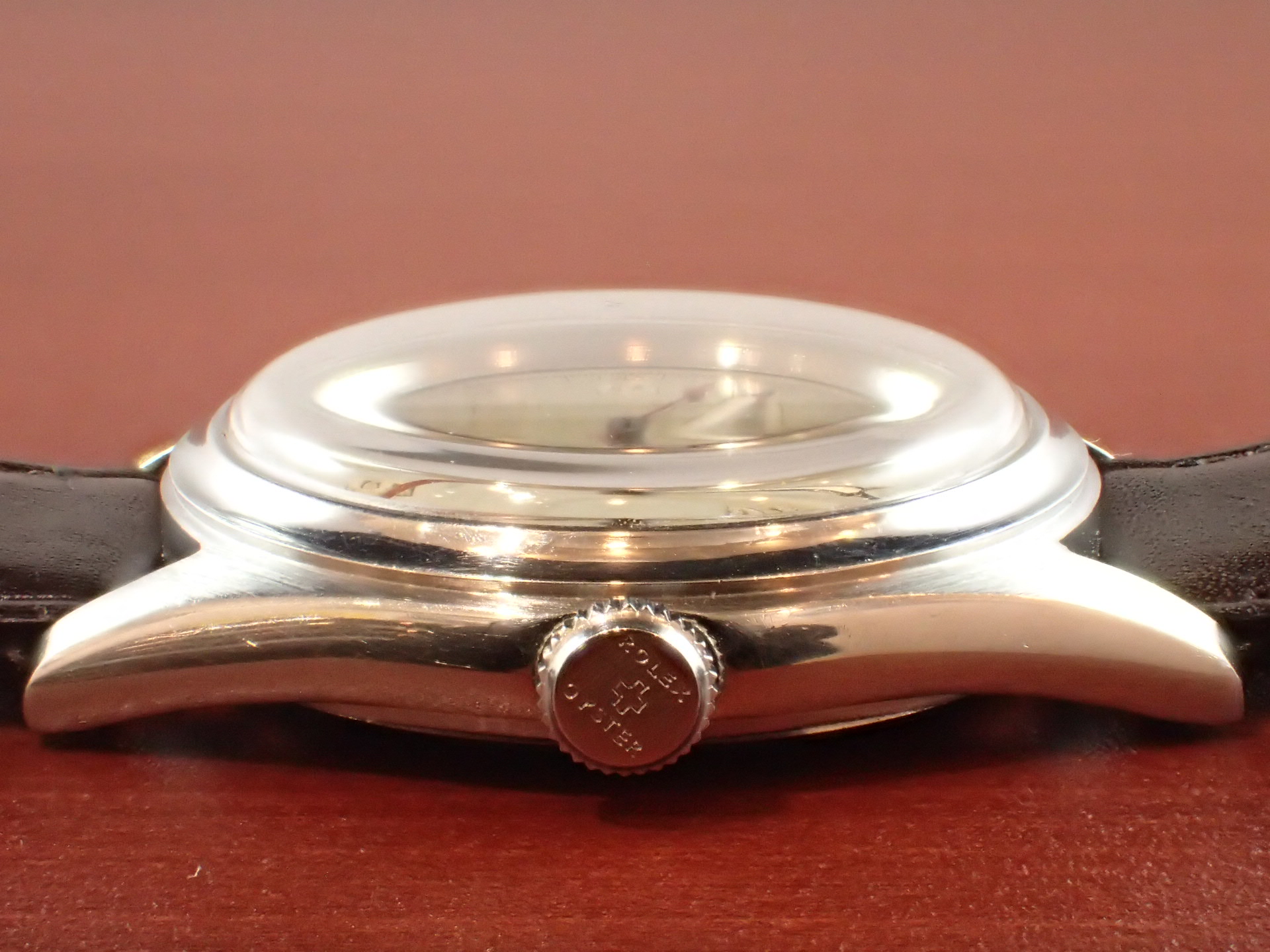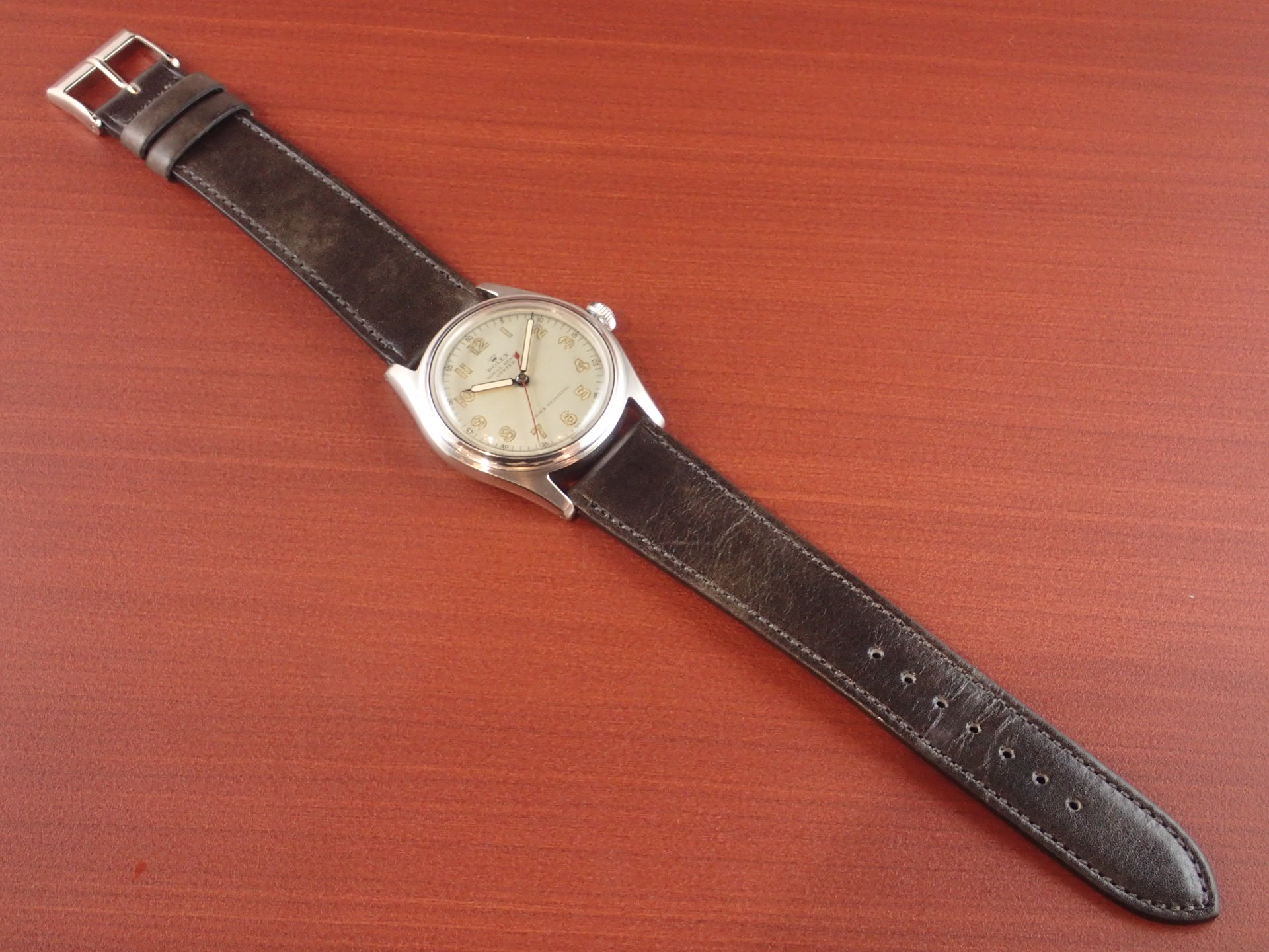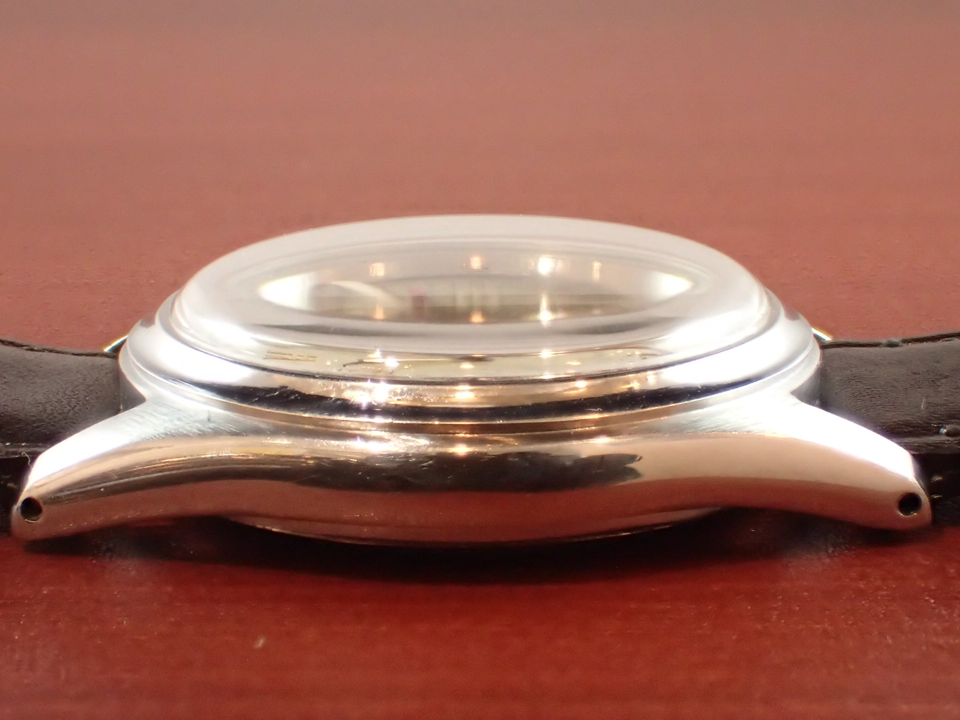 1940年代にロレックスが製造したロイヤルジャイアント、Ref.4461です。反り返ったベゼルが特徴のモデルは、Ref.4444やRef.6044などボーイズサイズのモデルを思い浮かべますが、こちらは34mmケースの希少なモデルです。ペットネームも珍しく「ROYAL GIANT」と表記されており、ボーイズサイスのRef.4444 OYSTER ROYALのビックケースという事で付けられたペットネームでしょうか。シルバーダイアルは、夜光塗料のアラビアインデックスと40年代らしいデザインです。長短針はブルースチールのシリンジハンドで、秒針は赤いペイントがされています。文字盤は少々の経年変化が見られますが、肉眼では気にならない程度で、目立つような傷もなく、雰囲気は良いです。ケースは若干のポリッシュ感がありますが、概ね良好な状態です。ムーブメントはショックレジスティングの耐震装置付きで、良い状態です。分解掃除済みで日差30秒程度で稼働しています。