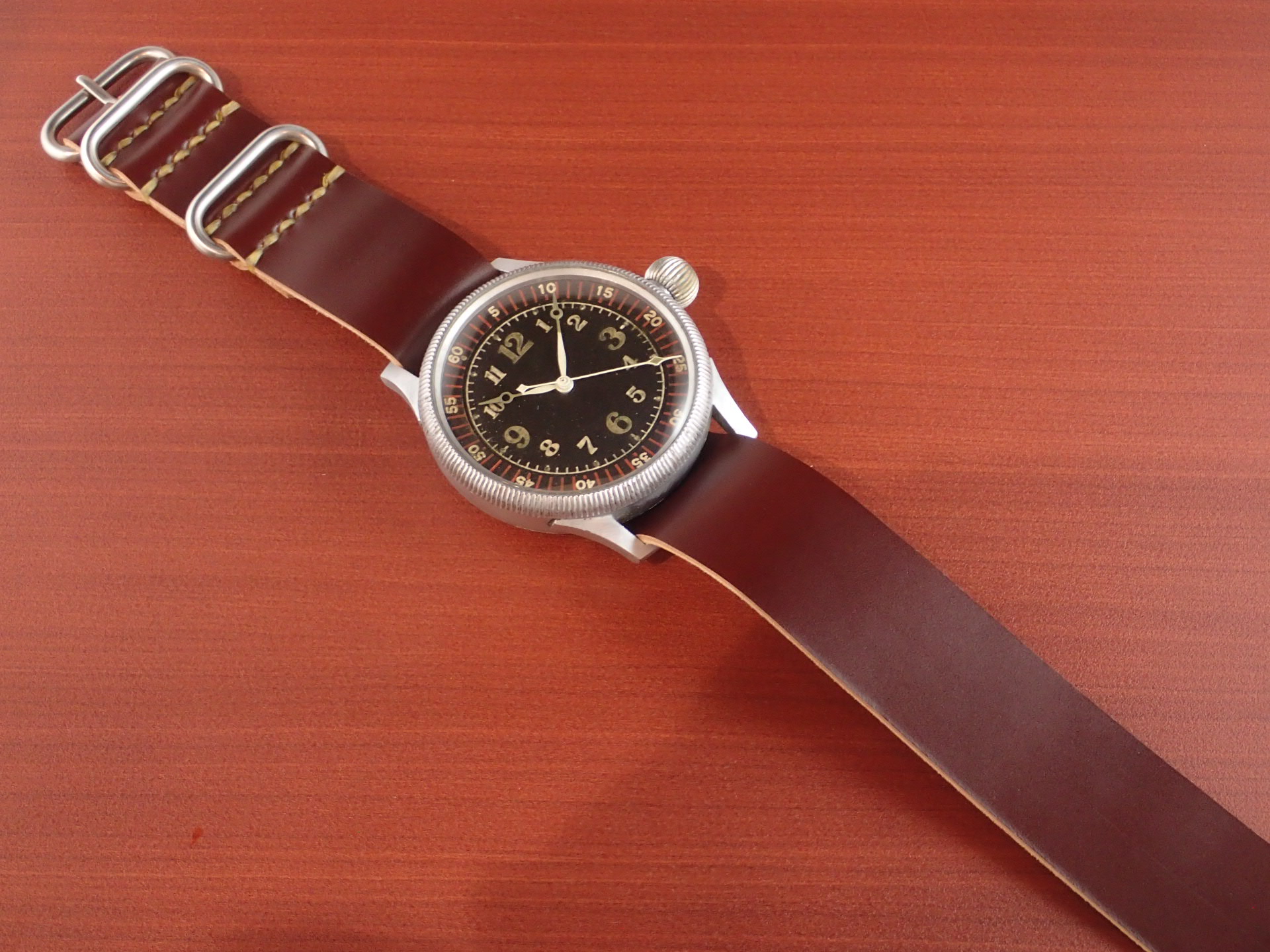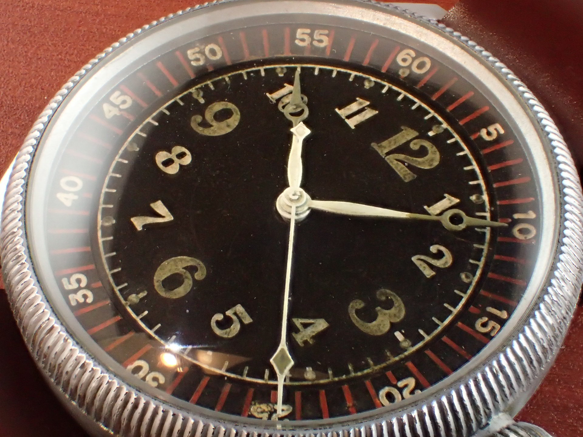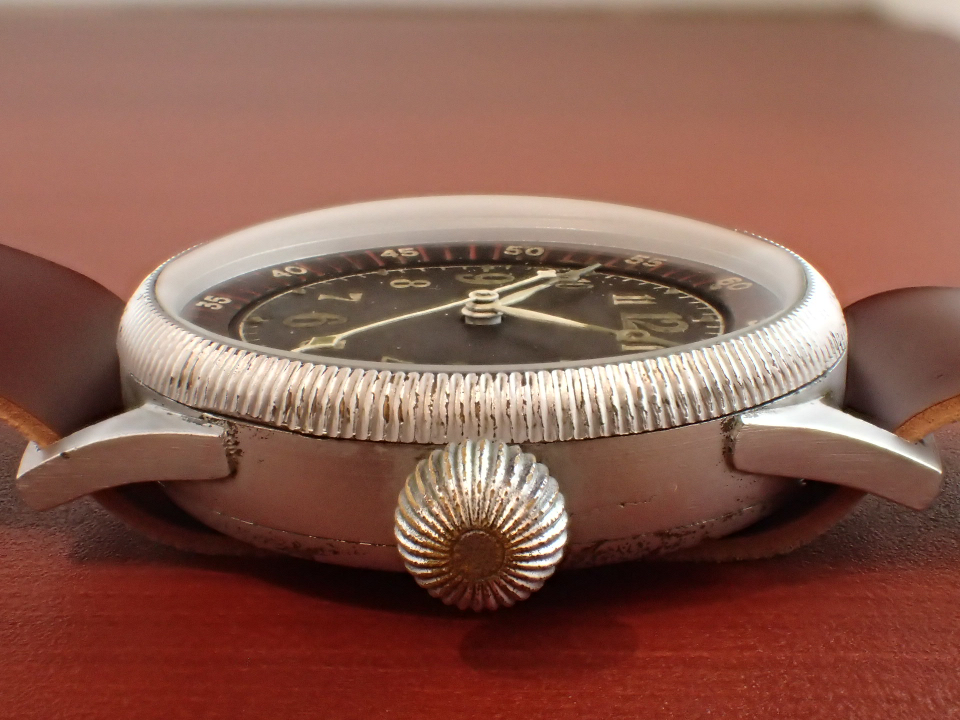 太平洋戦争(第二次世界大戦)時、旧日本海軍の零戦パイロットが使用した天測時計です。海外では「KAMIKAZE(神風)」と呼ばれ、コレクターズアイテムとなっています。グローブを装着したままでも用意に操作できる大きなリューズと回転ベゼルが特徴的。文字盤のプリント部が凹んだエンボス仕様になっています。回転ベゼルの赤い刻みは長いタイプと短いタイプがあります。この個体は短いタイプです。ムーブメントは19型で7石、9石、15石が存在。違いは石の数のみで、初期モデルは15石、その後、9石、7石とグレードダウンされていきました。この個体は9石のタイプです。支給モデルのこちらは裏蓋に支給番号、裏蓋の裏には海軍を示すイカリマークが見られます。裏蓋には「空兵 第四九八六号」と刻印されています。文字盤は少々の経年変化が見られますが、夜光はオリジナルで、雰囲気は良いです。ケースは裏蓋のメッキに剥がれが見られますが、その他は全体的に良い状態です。ムーブメントの状態は良く、リューズ周りの状態も良いです。革ベルトは牛革の引き通しタイプを装着しています。分解掃除後のお渡し。