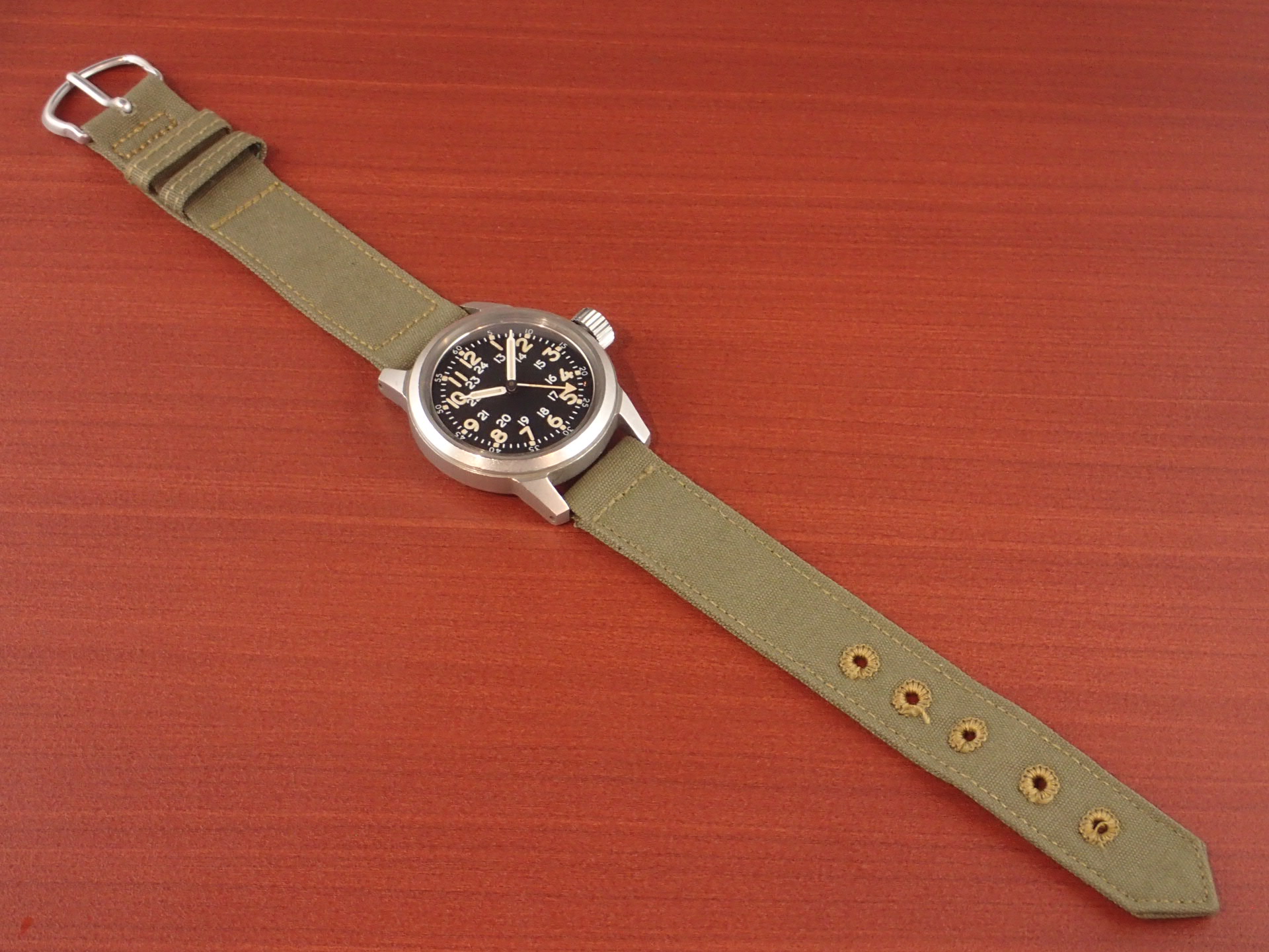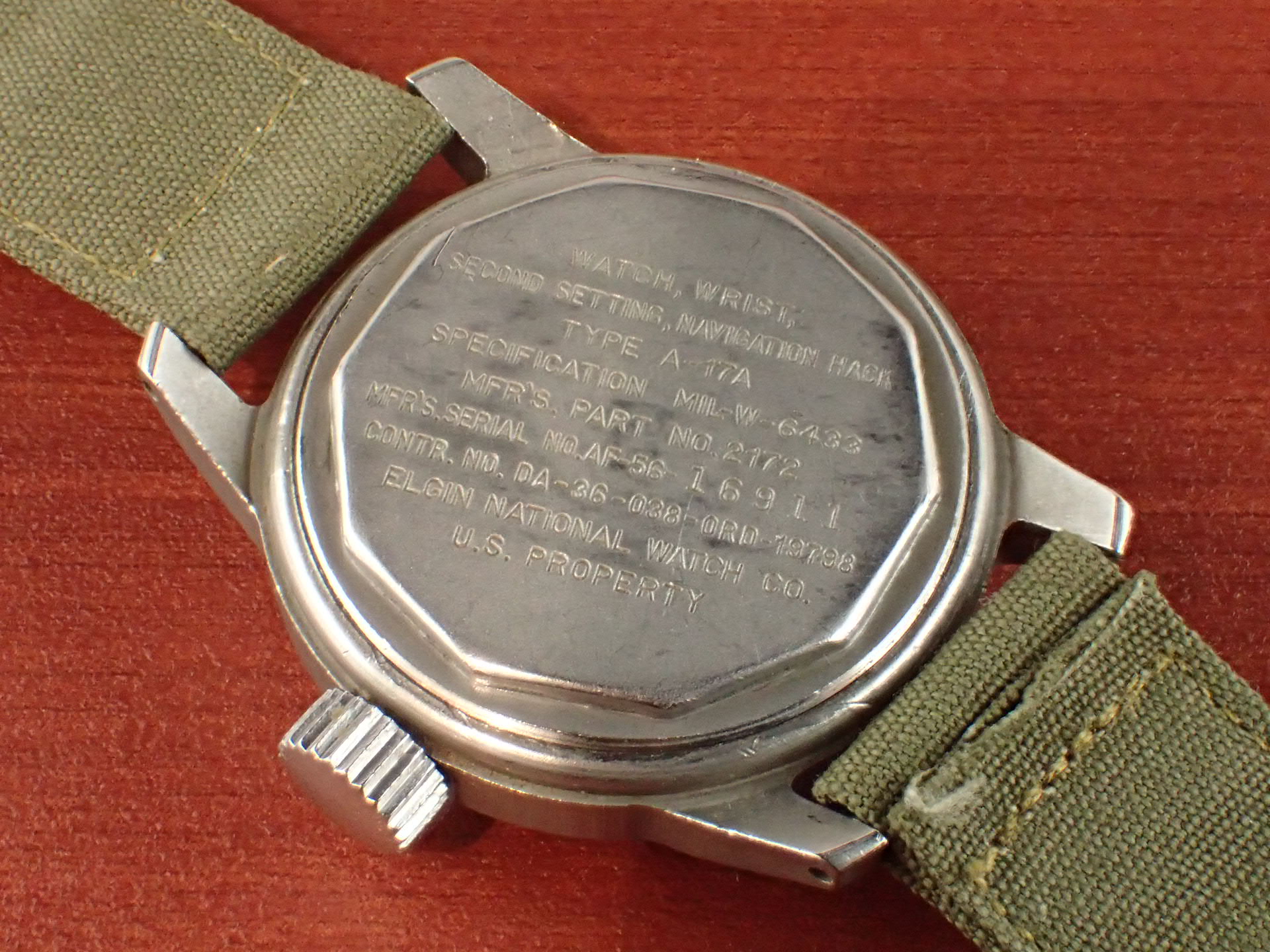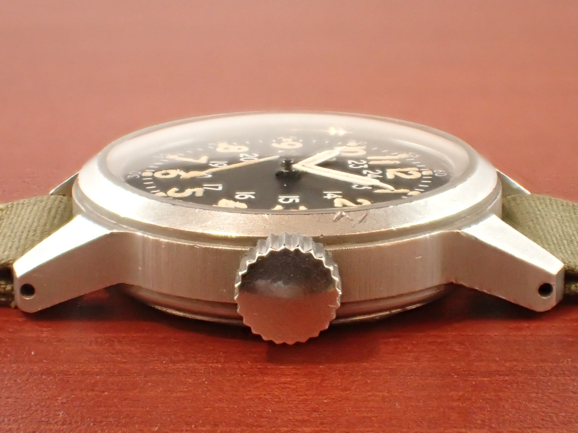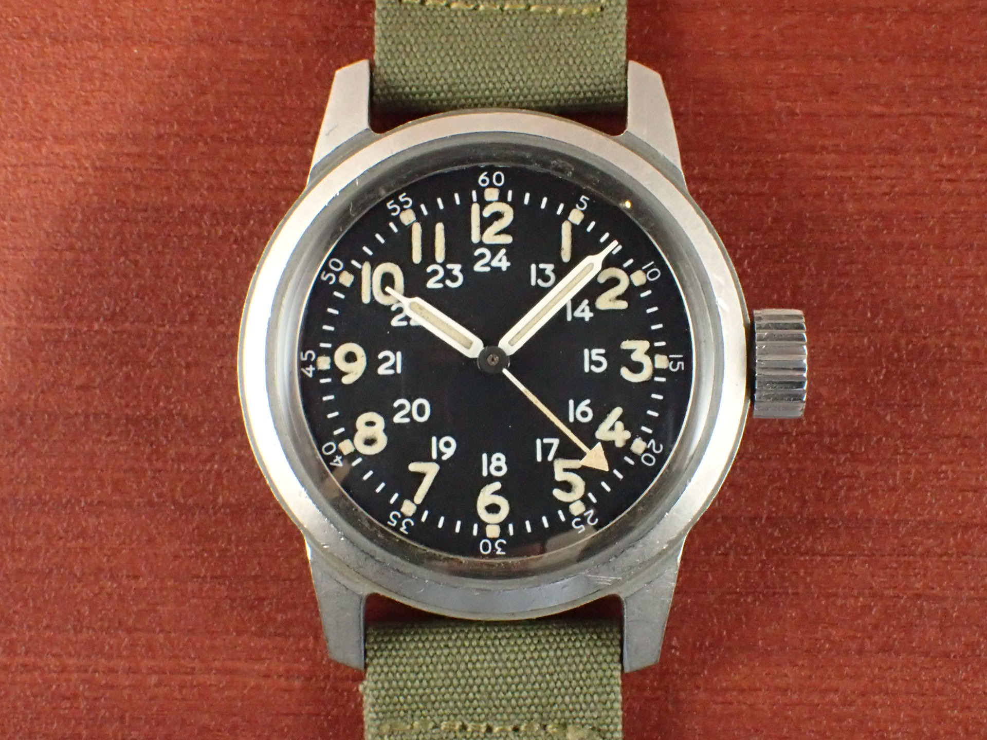 1956年にアメリカ軍に支給されたタイプA-17Aです。文字盤は気になるダメージのない綺麗な状態です。隠し文字で「ELGIN」のロゴが見られます。インデックス、針の夜光も当時のラジウムのままで良い色合いをしています。ケースは小傷が見られますが、意図的なポリッシュはされておらず、当時のマット仕上げが残っています。ムーブメントはハック付きのキャリバー685を搭載。ベルトは当時米軍が使用していたコットンベルトを装着。タイプA17Aと言えば、ブローバが一般的に知られていますが、このエルジンは非常にレアで良い状態のものは滅多に入荷しません。分解掃除後のお渡し。