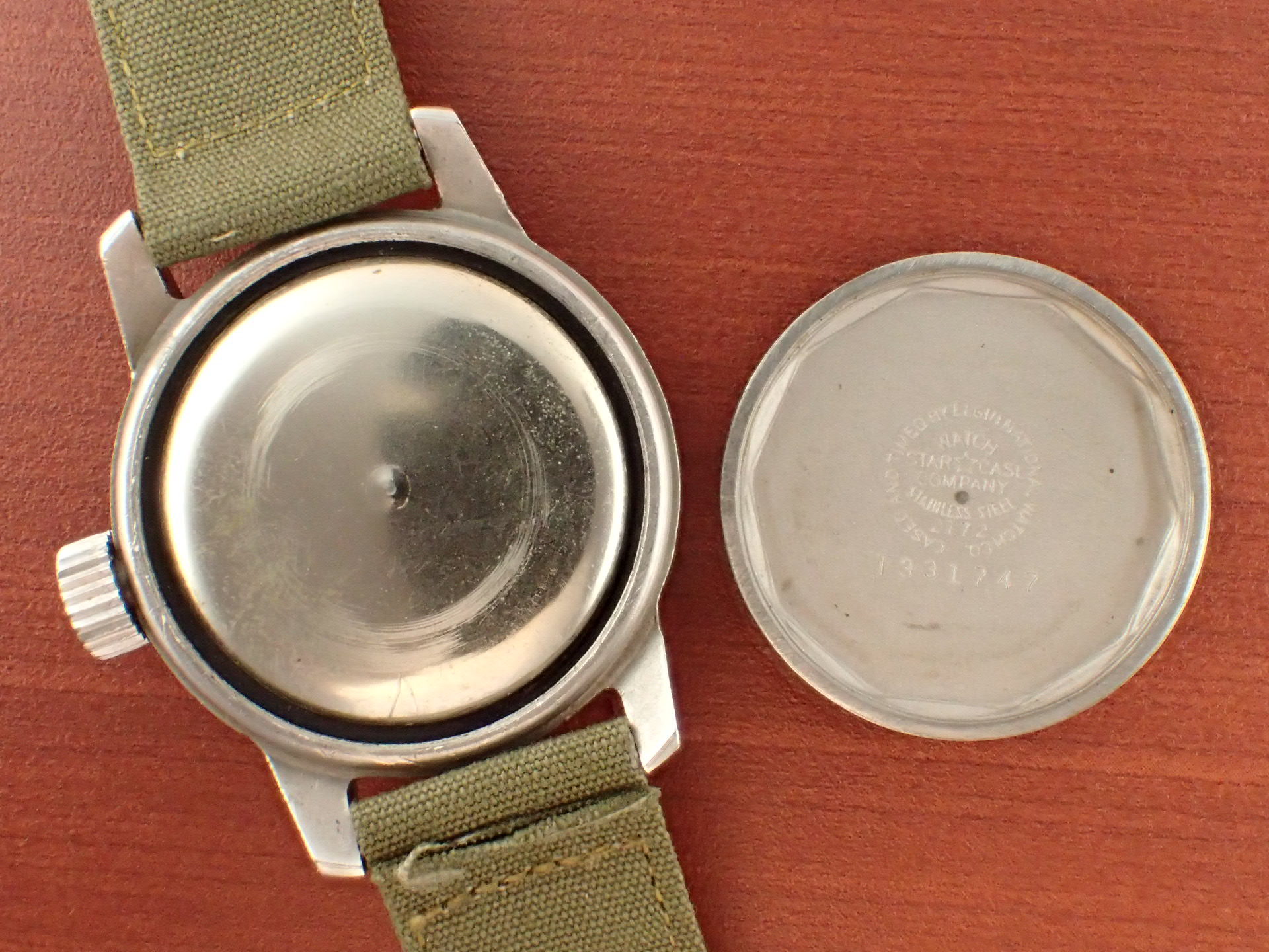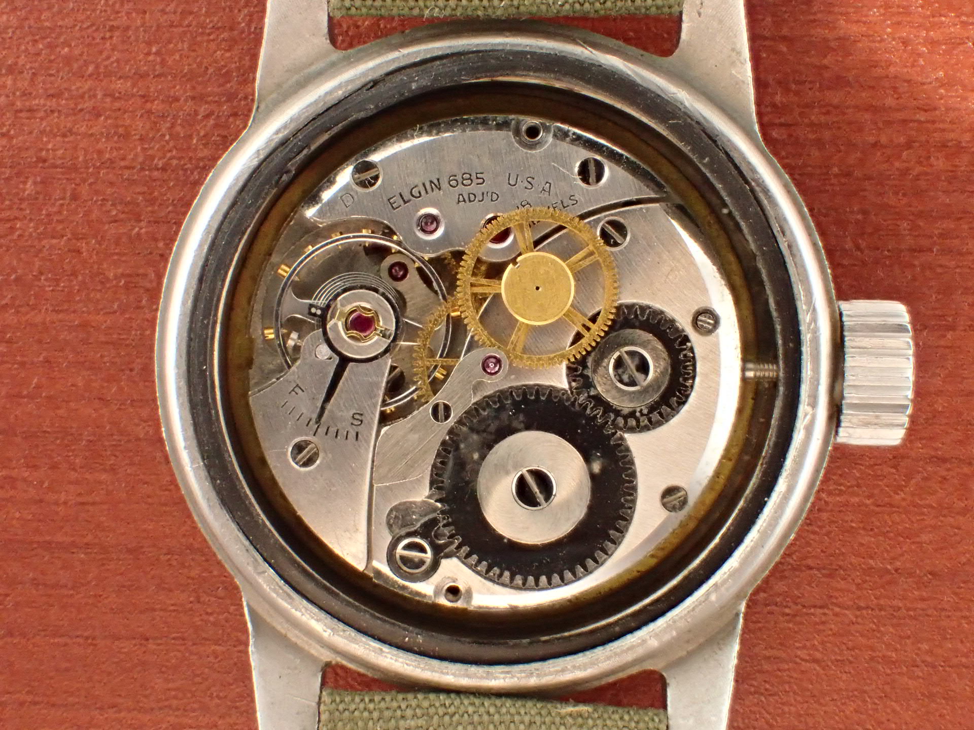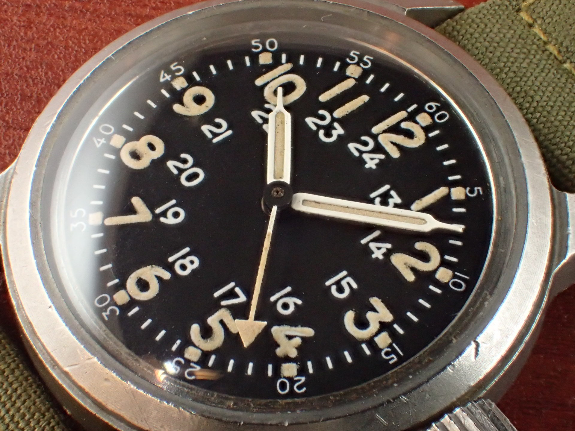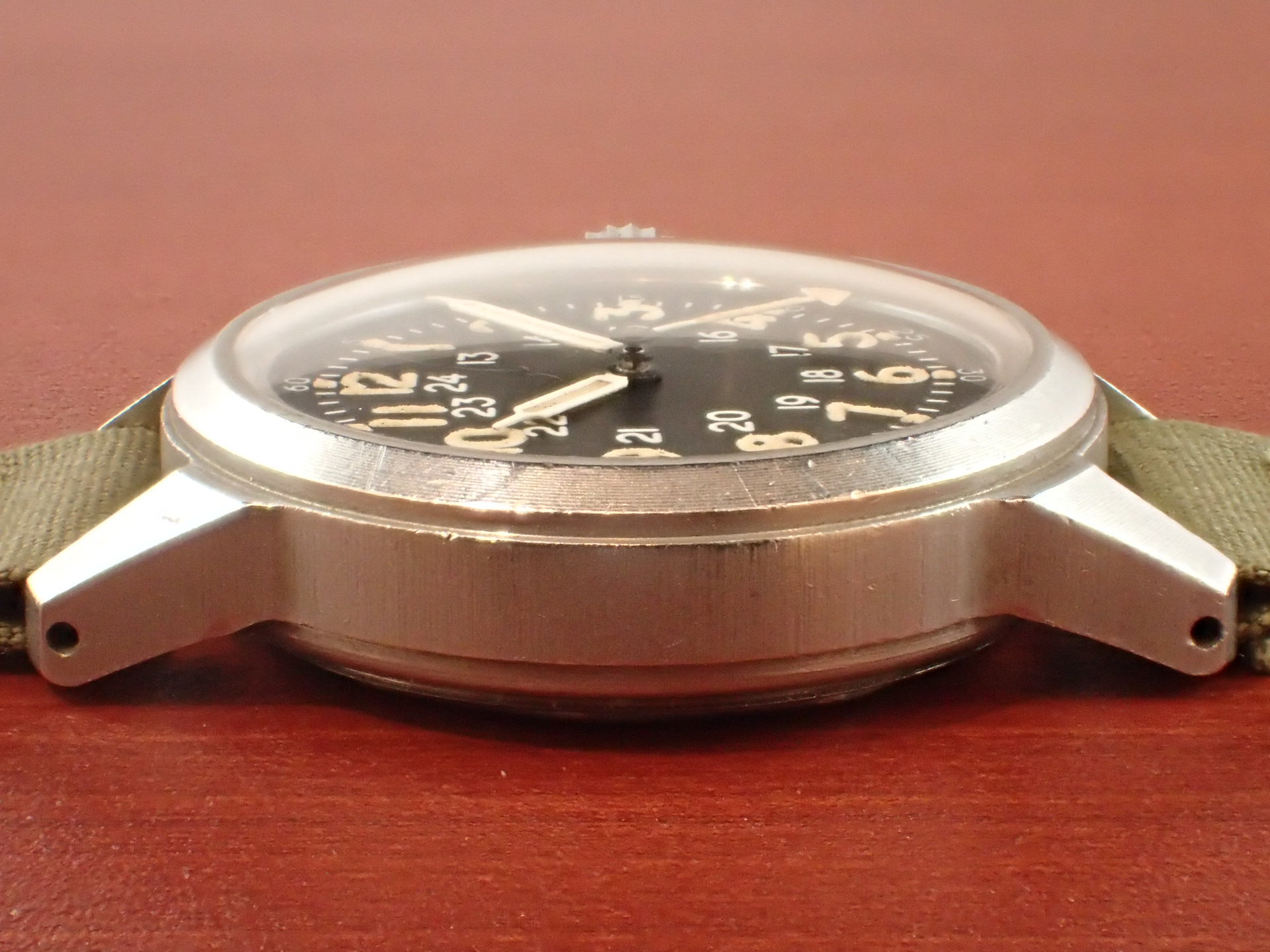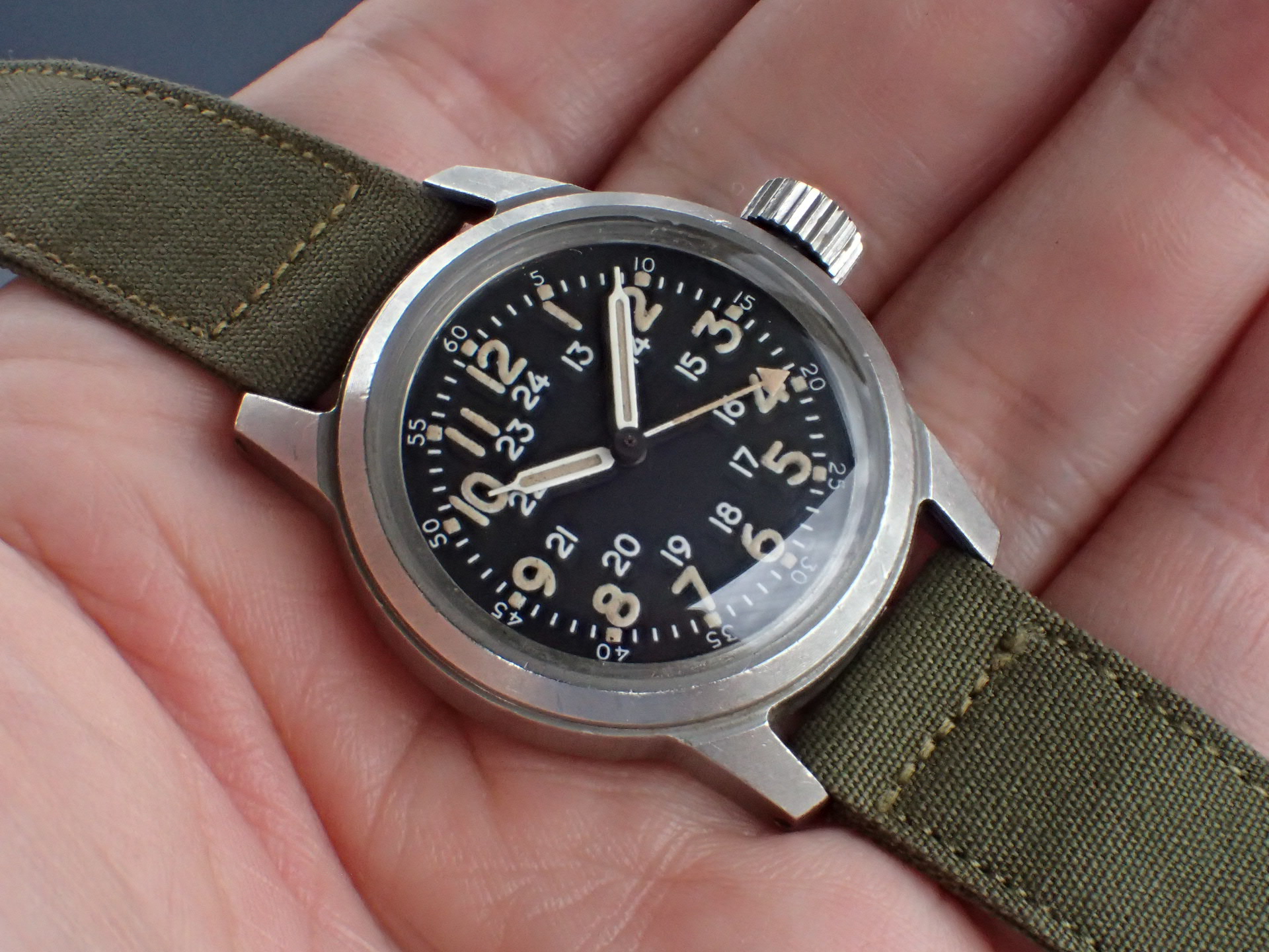1956年にアメリカ軍に支給されたタイプA-17Aです。文字盤は気になるダメージのない綺麗な状態です。隠し文字で「ELGIN」のロゴが見られます。インデックス、針の夜光も当時のラジウムのままで良い色合いをしています。ケースは小傷が見られますが、意図的なポリッシュはされておらず、当時のマット仕上げが残っています。ムーブメントはハック付きのキャリバー685を搭載。ベルトは当時米軍が使用していたコットンベルトを装着。タイプA17Aと言えば、ブローバが一般的に知られていますが、このエルジンは非常にレアで良い状態のものは滅多に入荷しません。分解掃除後のお渡し。