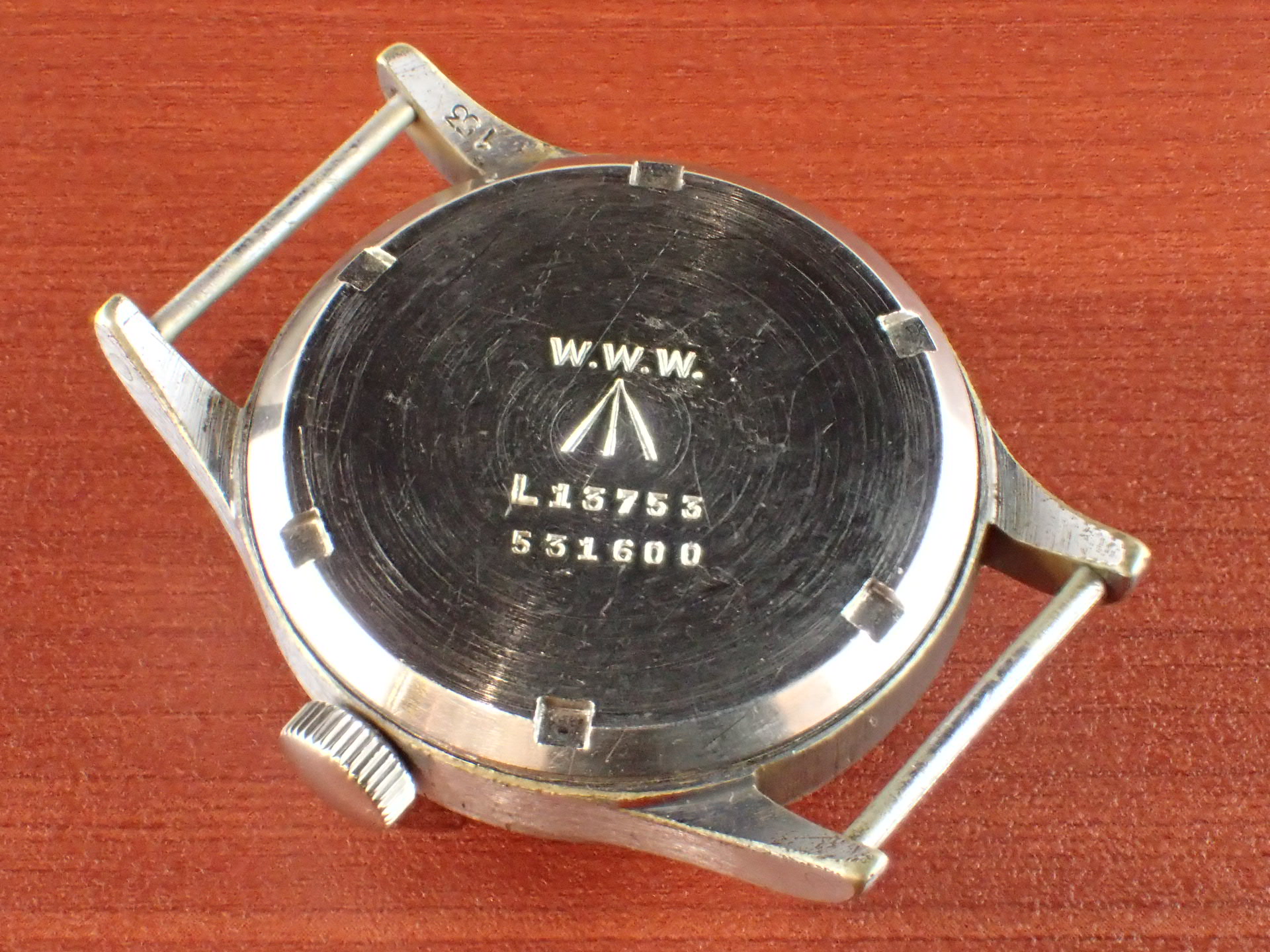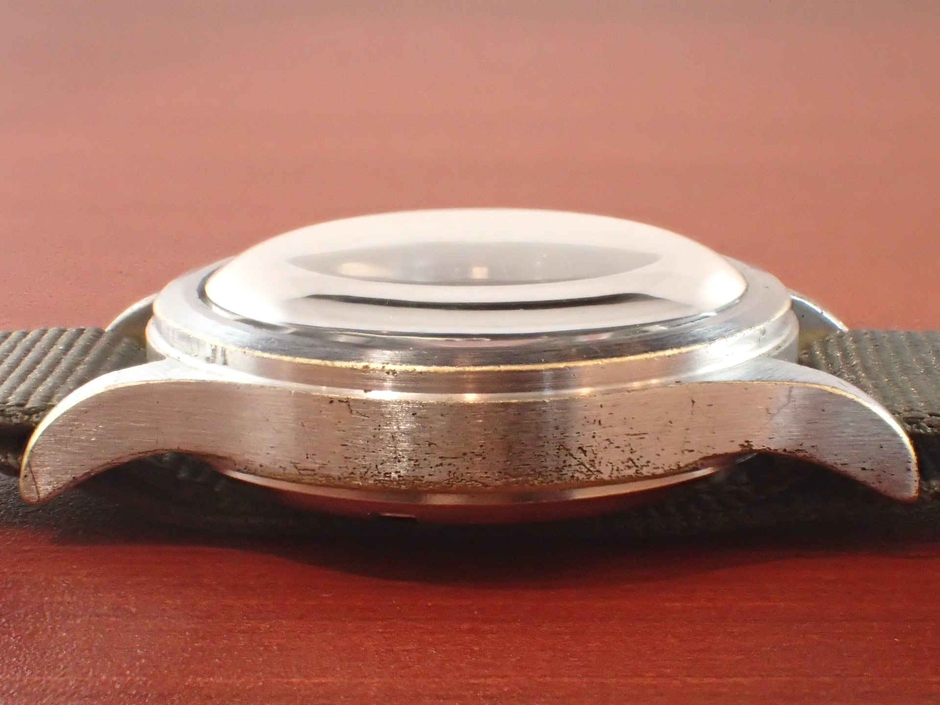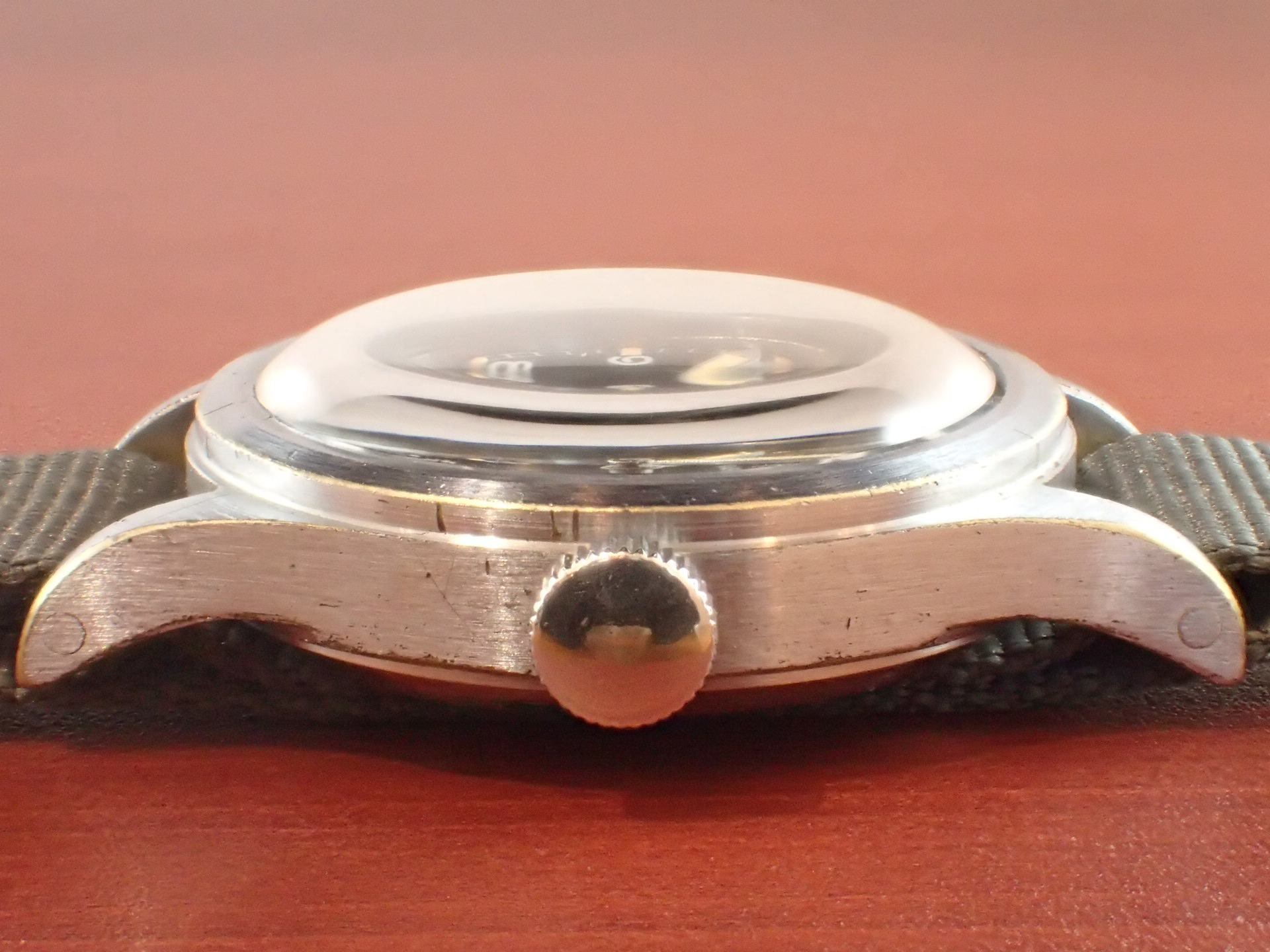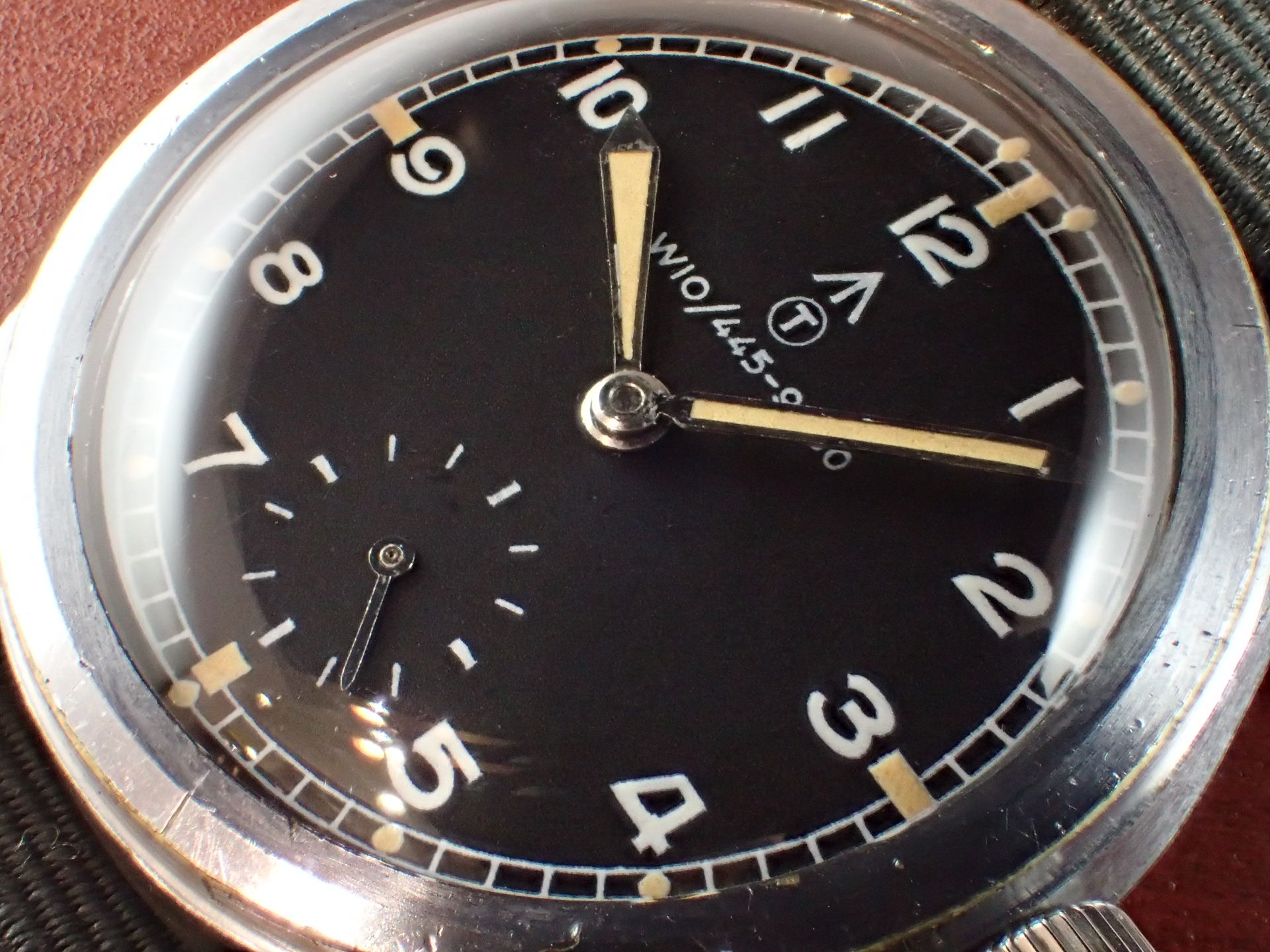 第二次世界大戦でイギリス陸軍が使用したW.W.W.、通称「ダーティダース」シリーズ。大戦末期に製造されたこのシリーズのモデルは、戦後においても長く使用されました。このモデルは、イギリス国防省(MoD)が、1960年代にそのモデルをNATOストックナンバーが入った文字盤に交換して使用したもの。文字盤にブランド名は入らず、NATOストックナンバーのみを表記。「W10」は陸軍を表す識別記号。このNATO文字盤、レコードの他には、IWC、オメガ、ティモールにも存在しています。記号はそれぞれ次のようになっています。レコード:W10/445-9830、IWC:W10/445-5890、オメガ:W10/445-2031、ティモール:W10/445-9855。裏蓋の「L」はレコードを表す識別コードです。ミリタリーウォッチならではヒストリーがあるモデルで面白く、またカッコイイです。文字盤は、目立つ傷や汚れがない綺麗な状態です。ケースサイドにメッキの薄くなった箇所がありますが、概ね良好です。分解掃除後のお渡し。