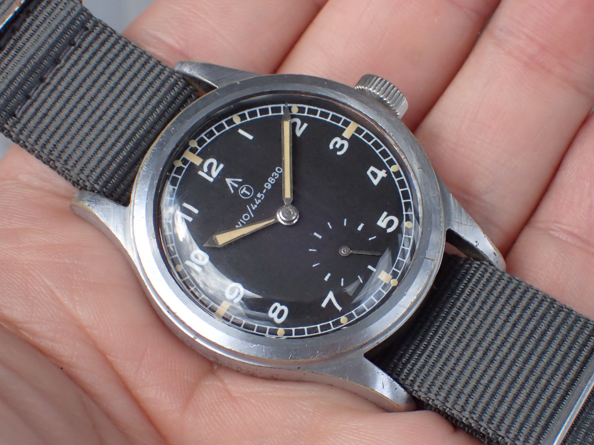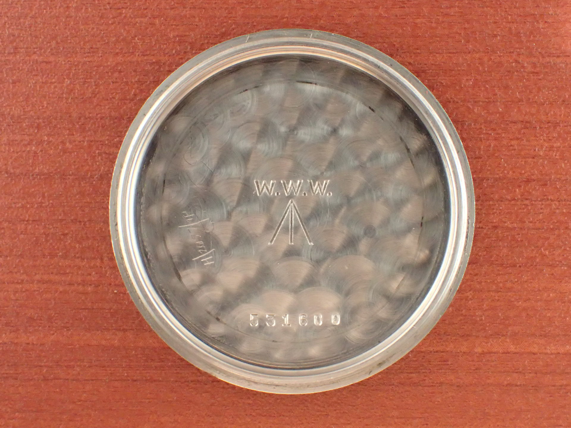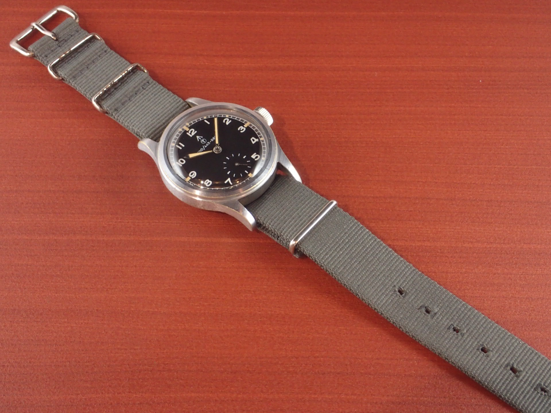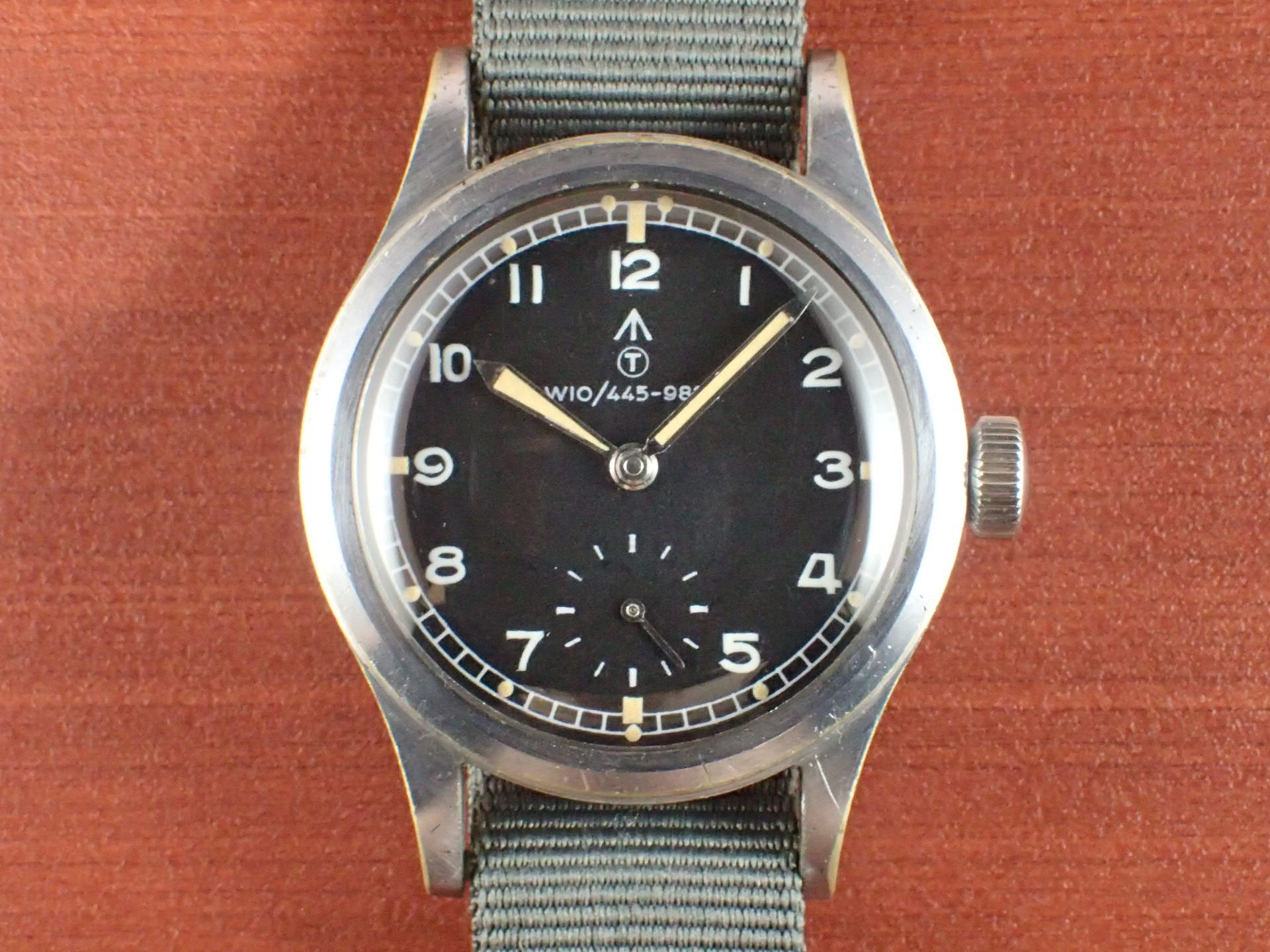 第二次世界大戦でイギリス陸軍が使用したW.W.W.、通称「ダーティダース」シリーズ。大戦末期に製造されたこのシリーズのモデルは、戦後においても長く使用されました。このモデルは、イギリス国防省(MoD)が、1960年代にそのモデルをNATOストックナンバーが入った文字盤に交換して使用したもの。文字盤にブランド名は入らず、NATOストックナンバーのみを表記。「W10」は陸軍を表す識別記号。このNATO文字盤、レコードの他には、IWC、オメガ、ティモールにも存在しています。記号はそれぞれ次のようになっています。レコード:W10/445-9830、IWC:W10/445-5890、オメガ:W10/445-2031、ティモール:W10/445-9855。裏蓋の「L」はレコードを表す識別コードです。ミリタリーウォッチならではヒストリーがあるモデルで面白く、またカッコイイです。文字盤は、目立つ傷や汚れがない綺麗な状態です。ケースサイドにメッキの薄くなった箇所がありますが、概ね良好です。分解掃除後のお渡し。