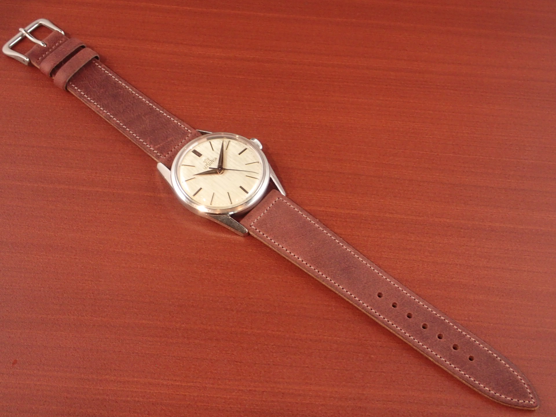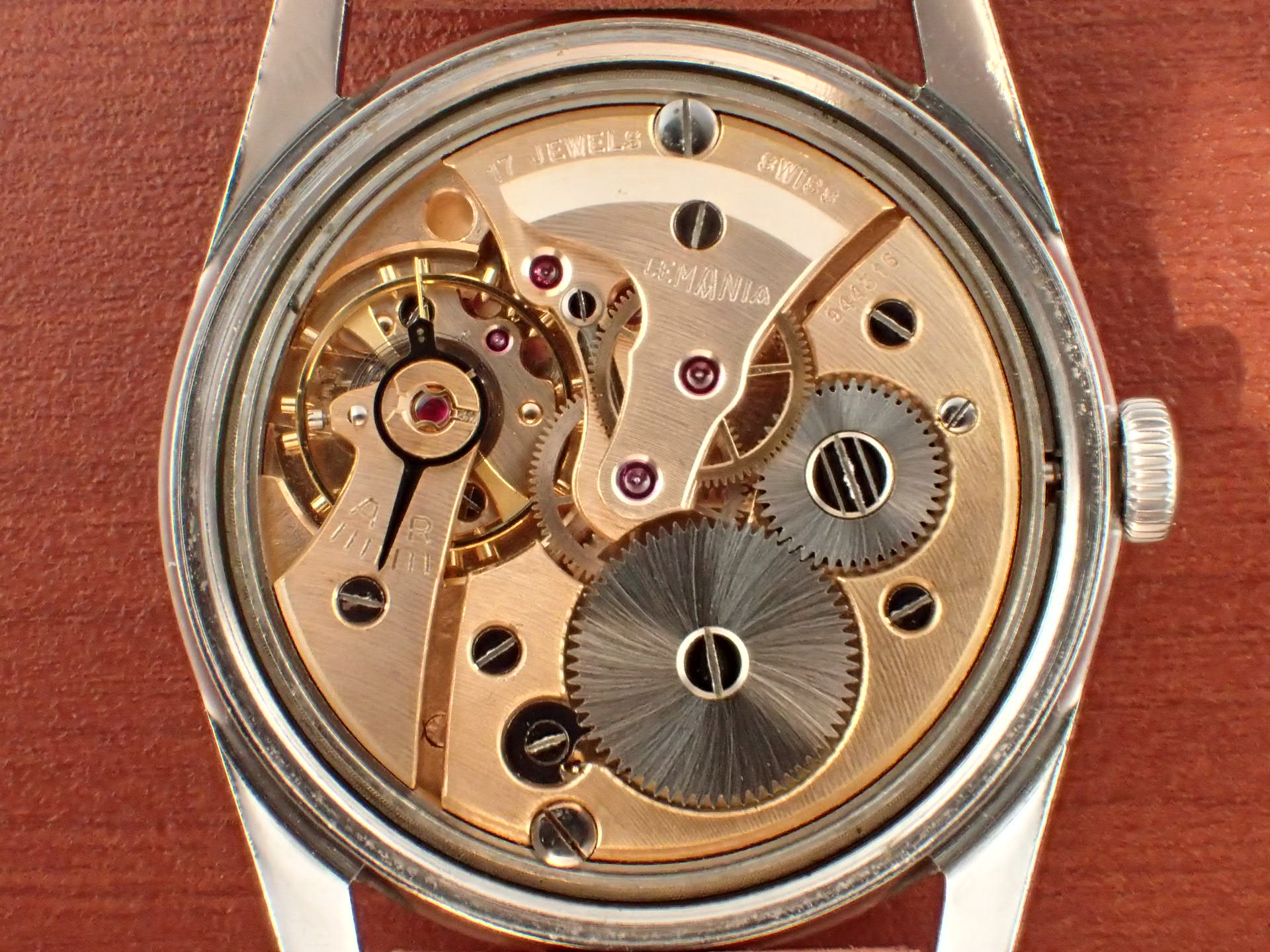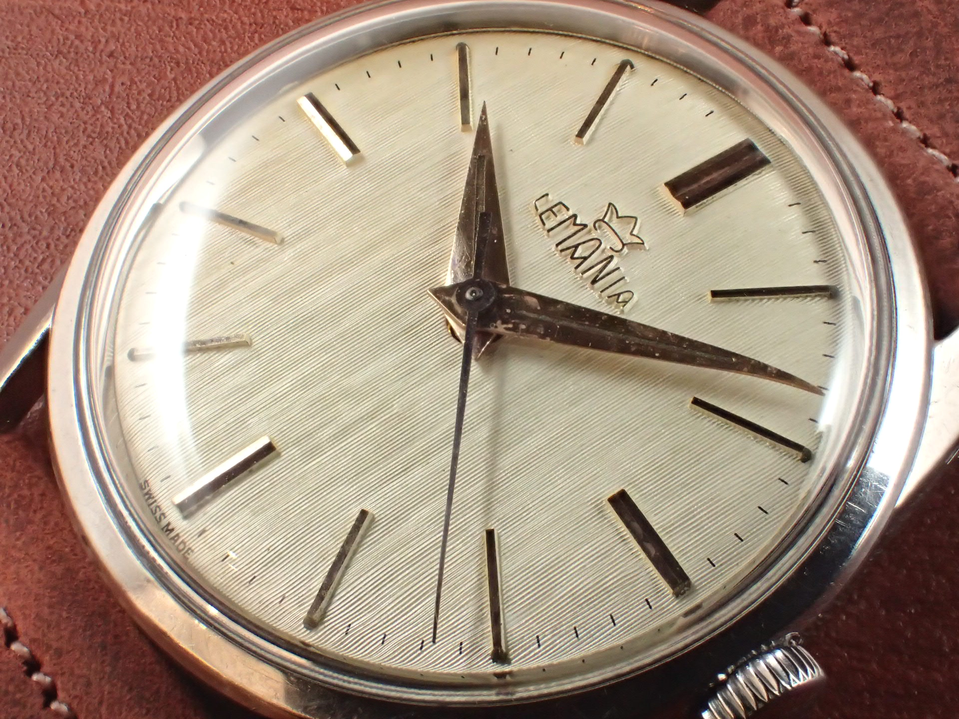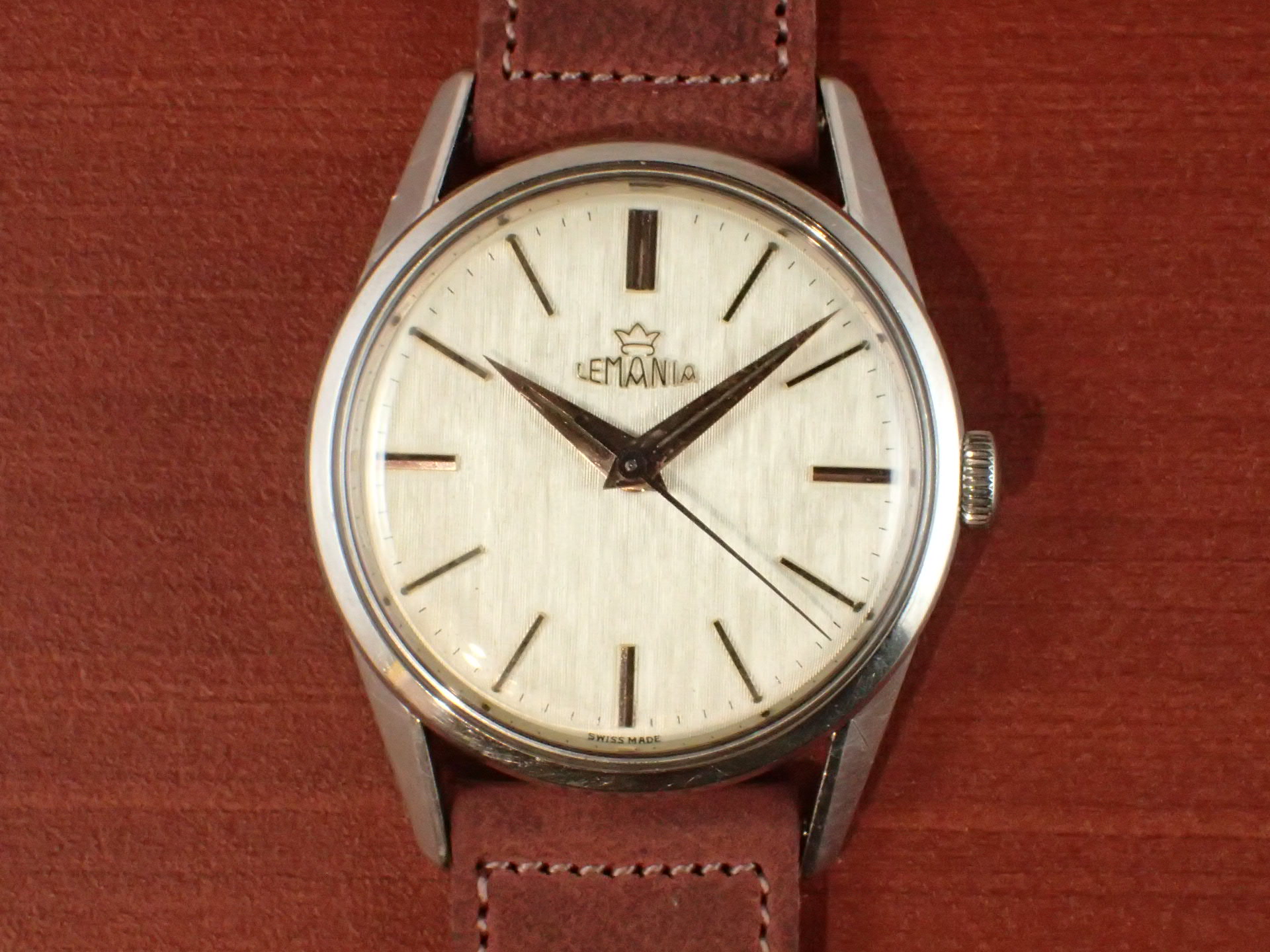 1960年代にレマニアが製造した時計です。シルバー文字盤は、不規則に縦のラインが入る事で、木目の様に見える面白い仕上げです。状態も良く、プリントの剥がれや傷のようなダメージはありません。ケースは全体に小傷がありますが、磨きを感じない自然な状態です。ムーブメントはキャリバー3000をセンターセコンドに改良した3060を搭載しています。インカブロックの耐震装置付きです。分解掃除済みで日差30秒程度で稼働してします。