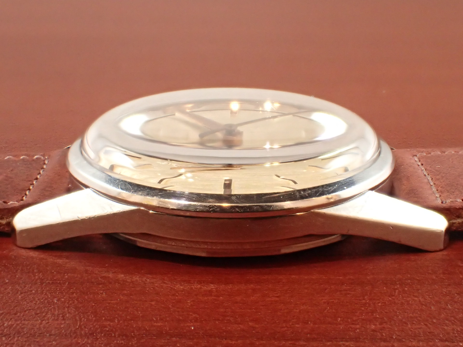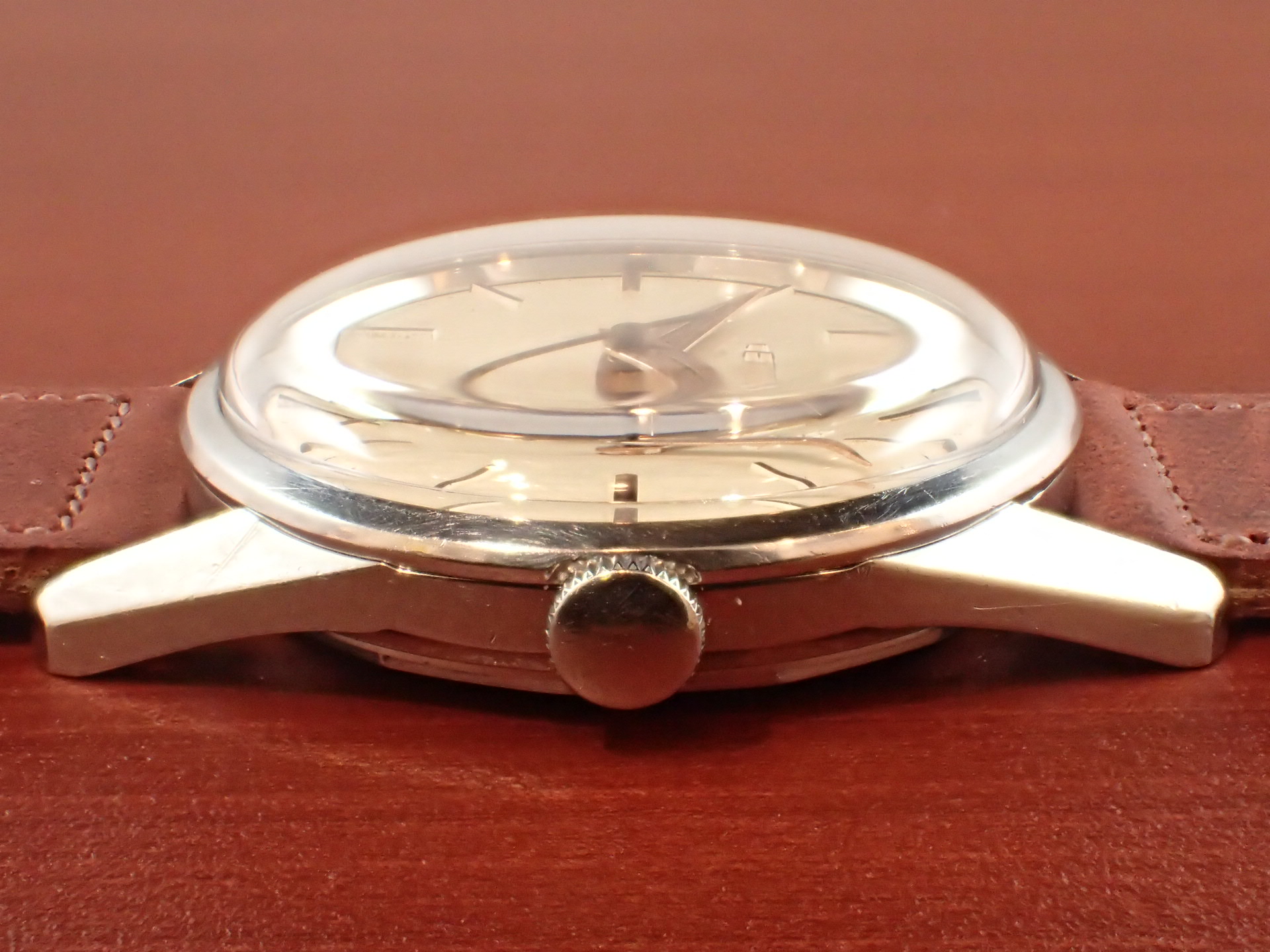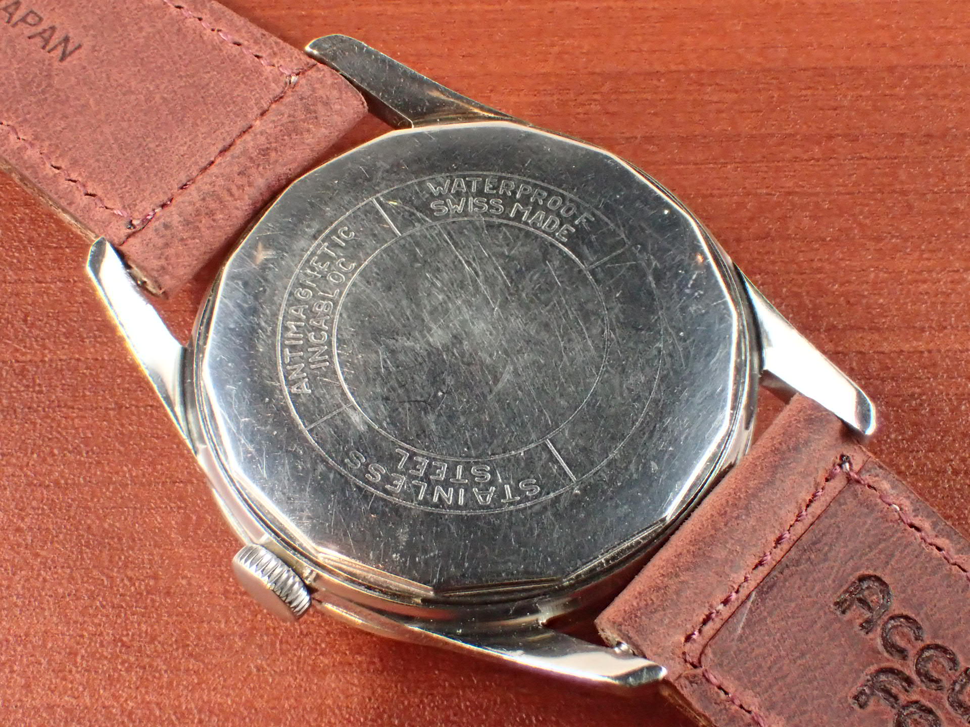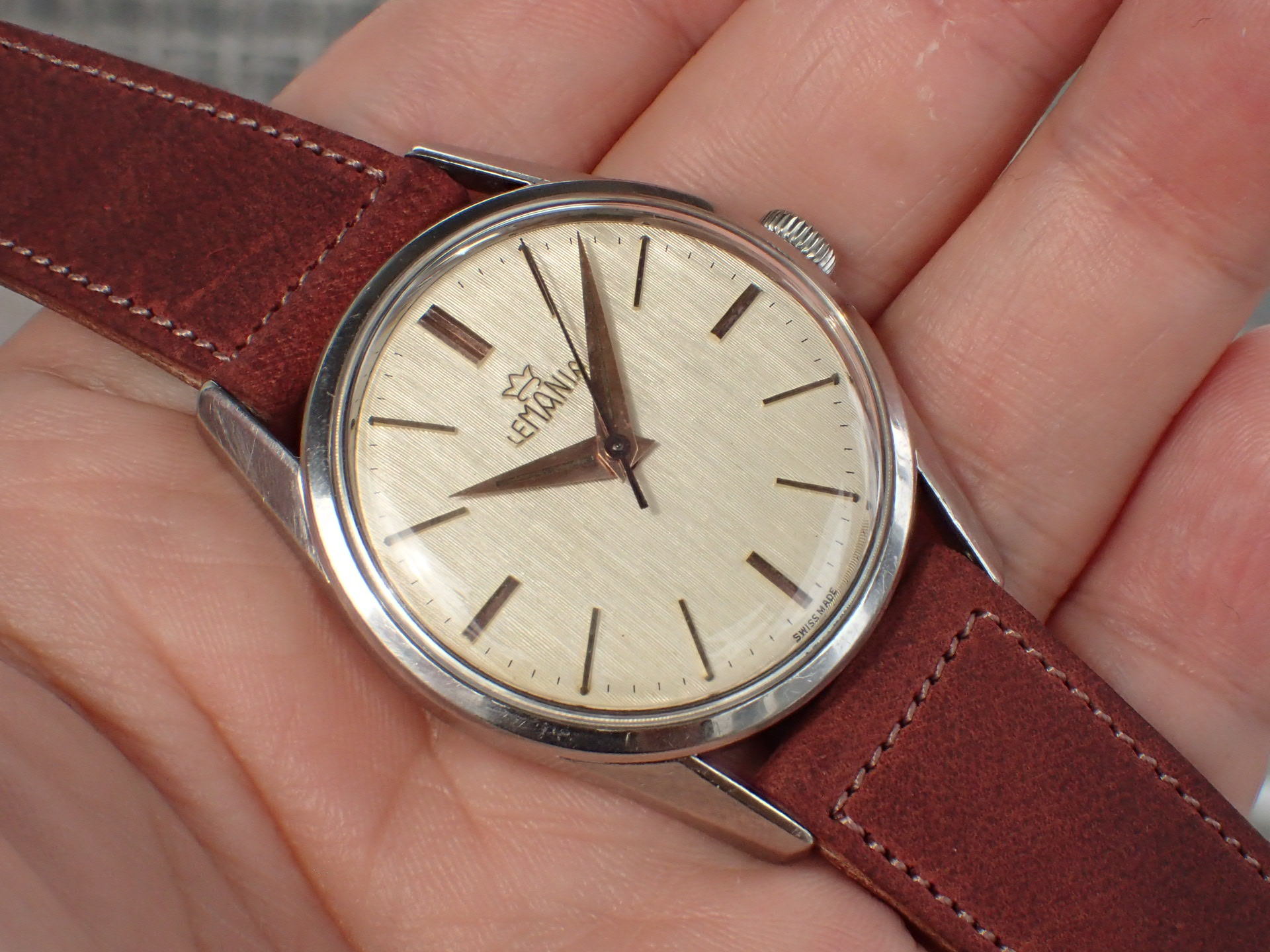 1960年代にレマニアが製造した時計です。シルバー文字盤は、不規則に縦のラインが入る事で、木目の様に見える面白い仕上げです。状態も良く、プリントの剥がれや傷のようなダメージはありません。ケースは全体に小傷がありますが、磨きを感じない自然な状態です。ムーブメントはキャリバー3000をセンターセコンドに改良した3060を搭載しています。インカブロックの耐震装置付きです。分解掃除済みで日差30秒程度で稼働してします。