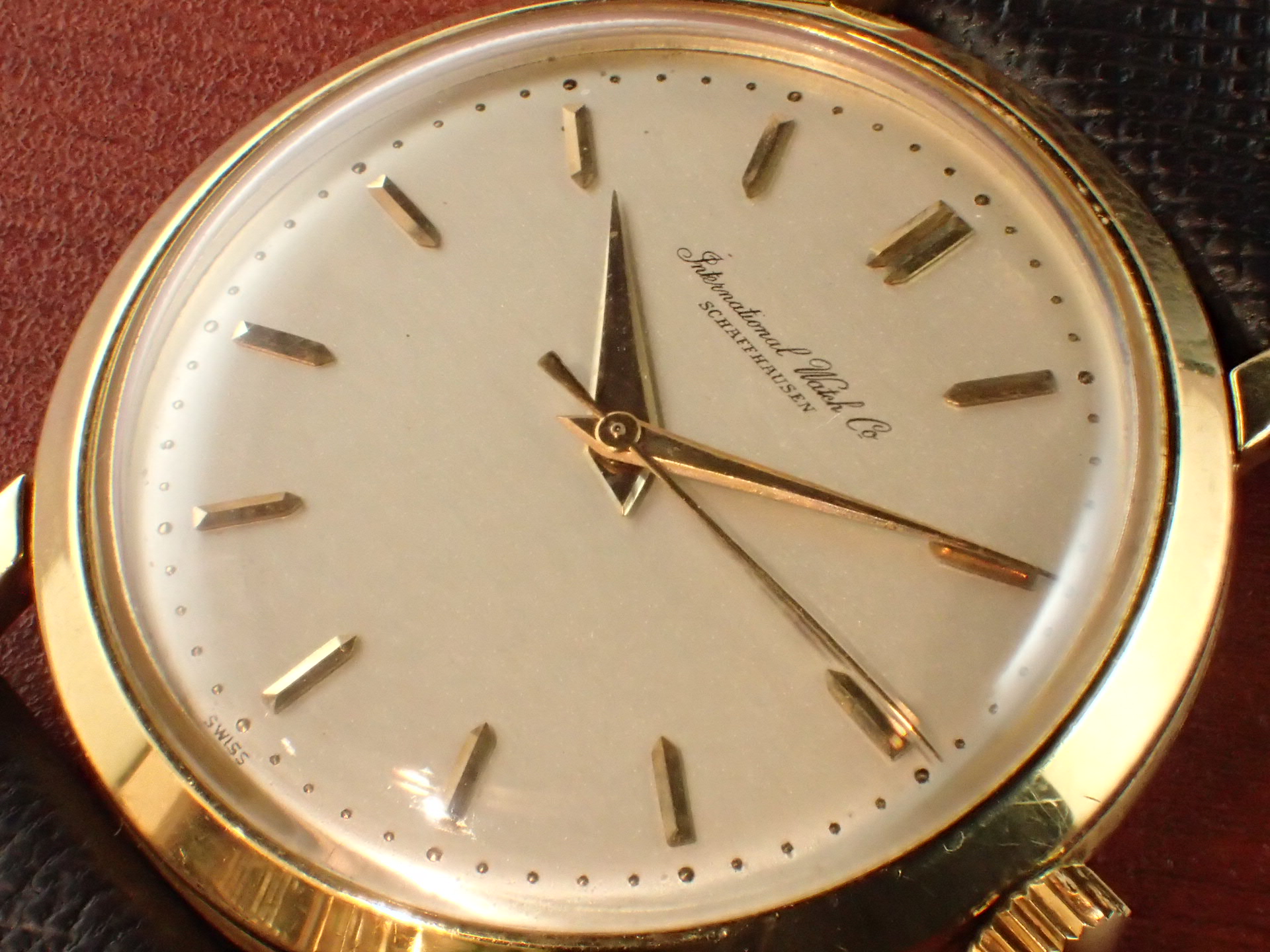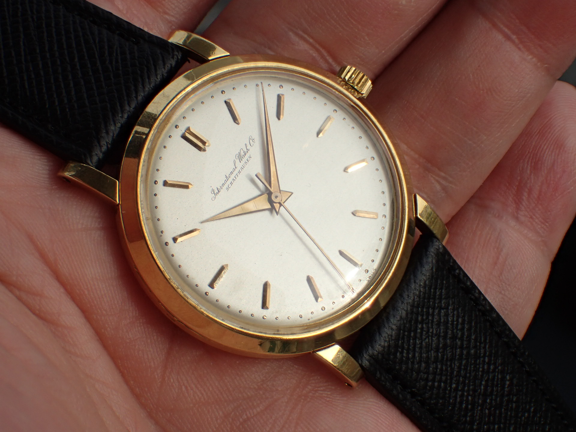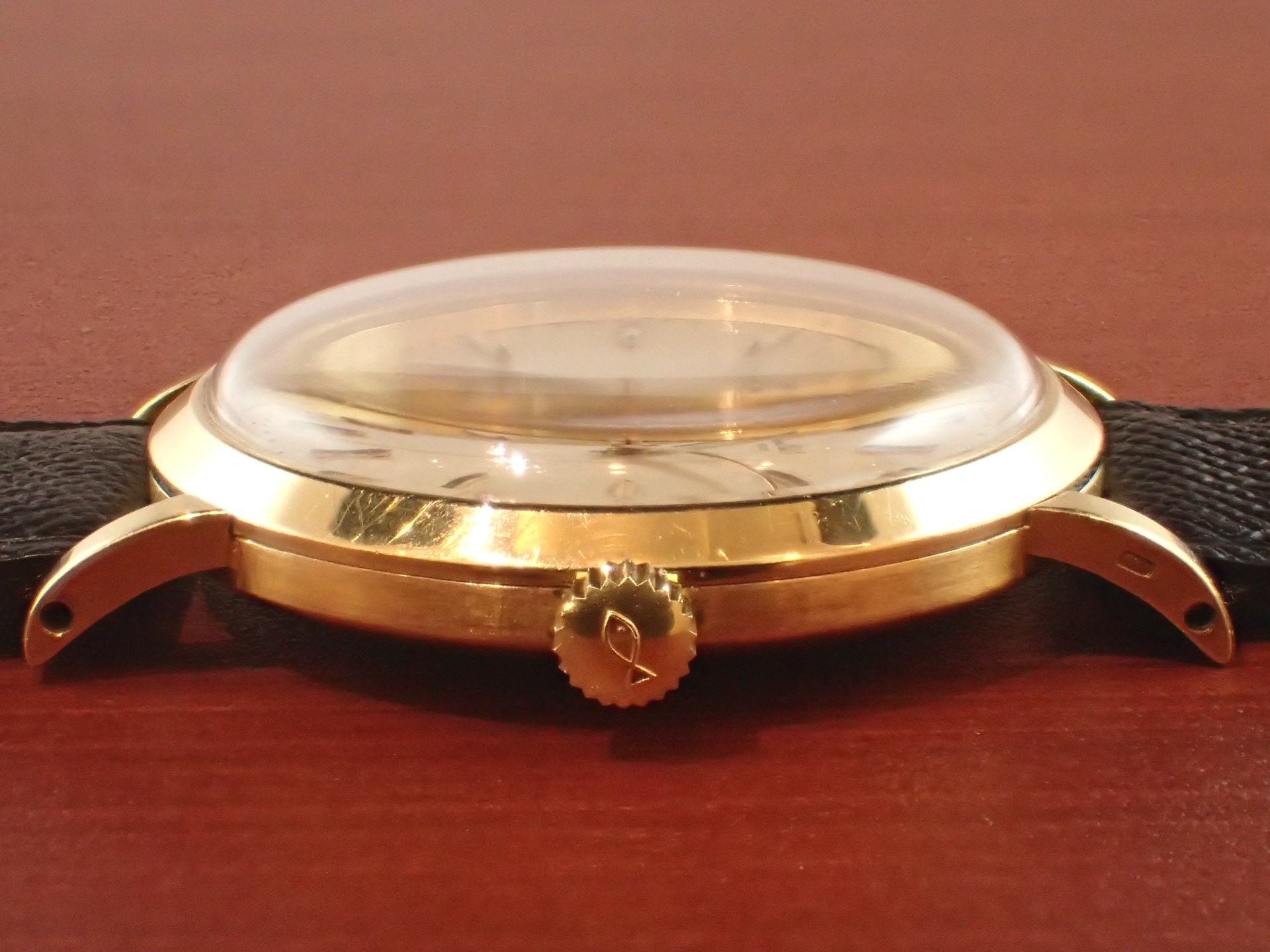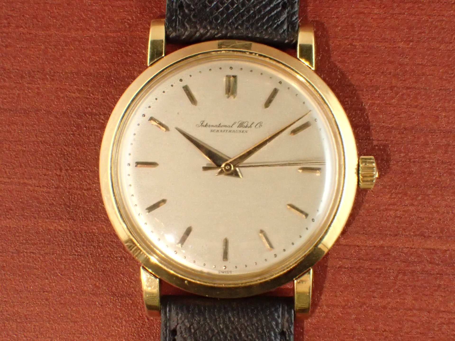 1950年代の初期にIWCが製造した時計です。センターセコンドの名機、キャリバー89を搭載しています。砲弾型のアプライドインデックスにドーフィンハンドは、この年代らしいデザインです。文字盤は、肉眼で気になるような経年変化や傷もなく、綺麗な状態です。ケースは、18金のイエローゴールドで、上品な色合いです。裏蓋に小傷はありますが、オリジナルのフォルムを残した良い状態です。ケースサイドとラグの刻印がはっきりと確認できます。ムーブメントはインカブロックの耐震装置付きで、綺麗な状態です。分解掃除後のお渡し。