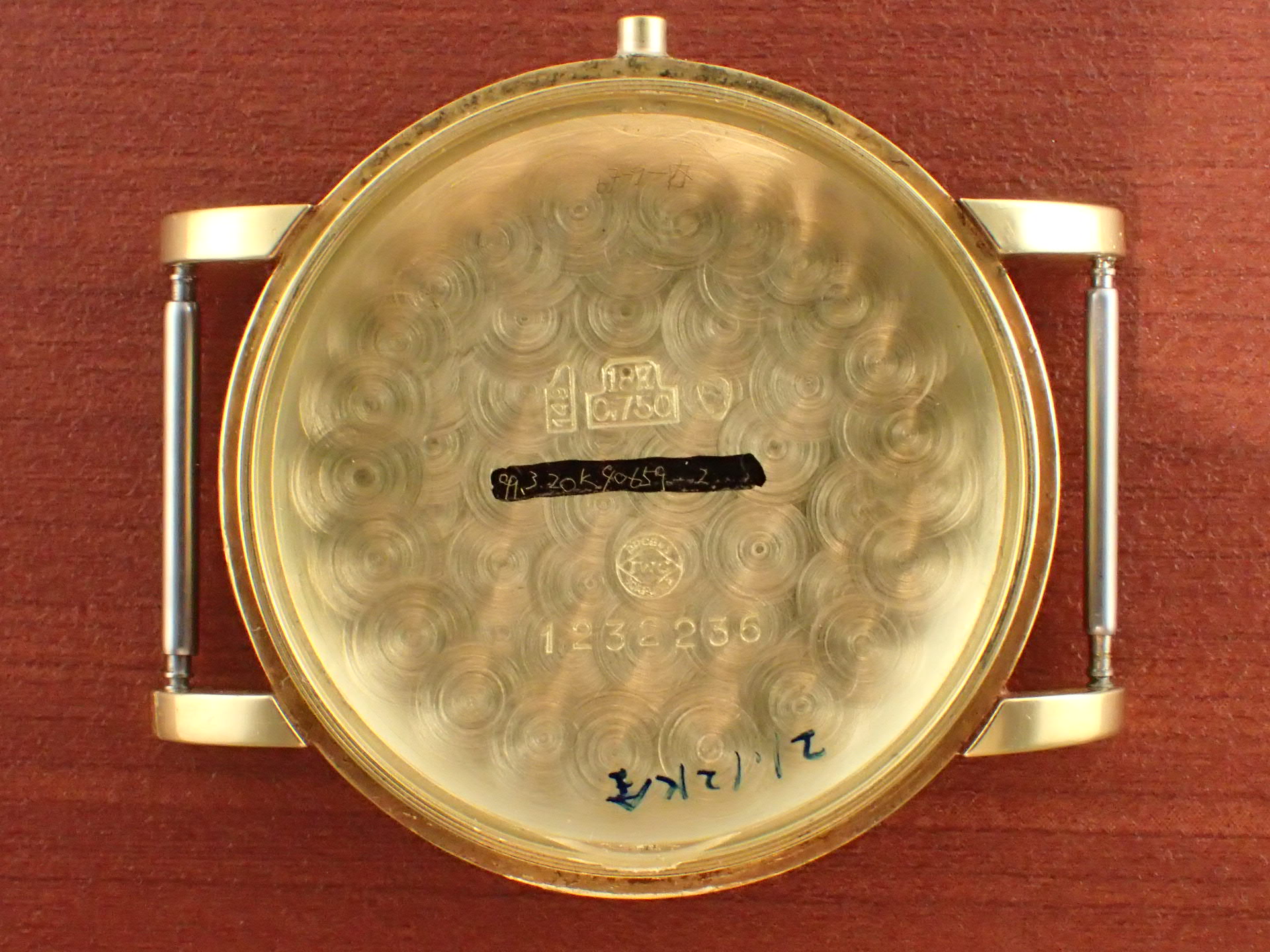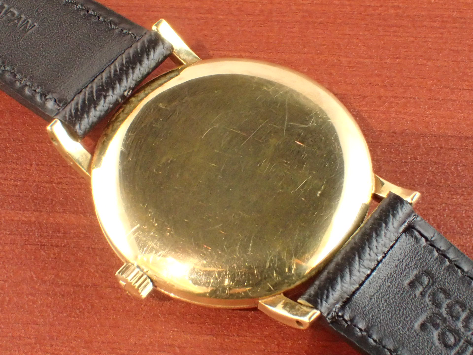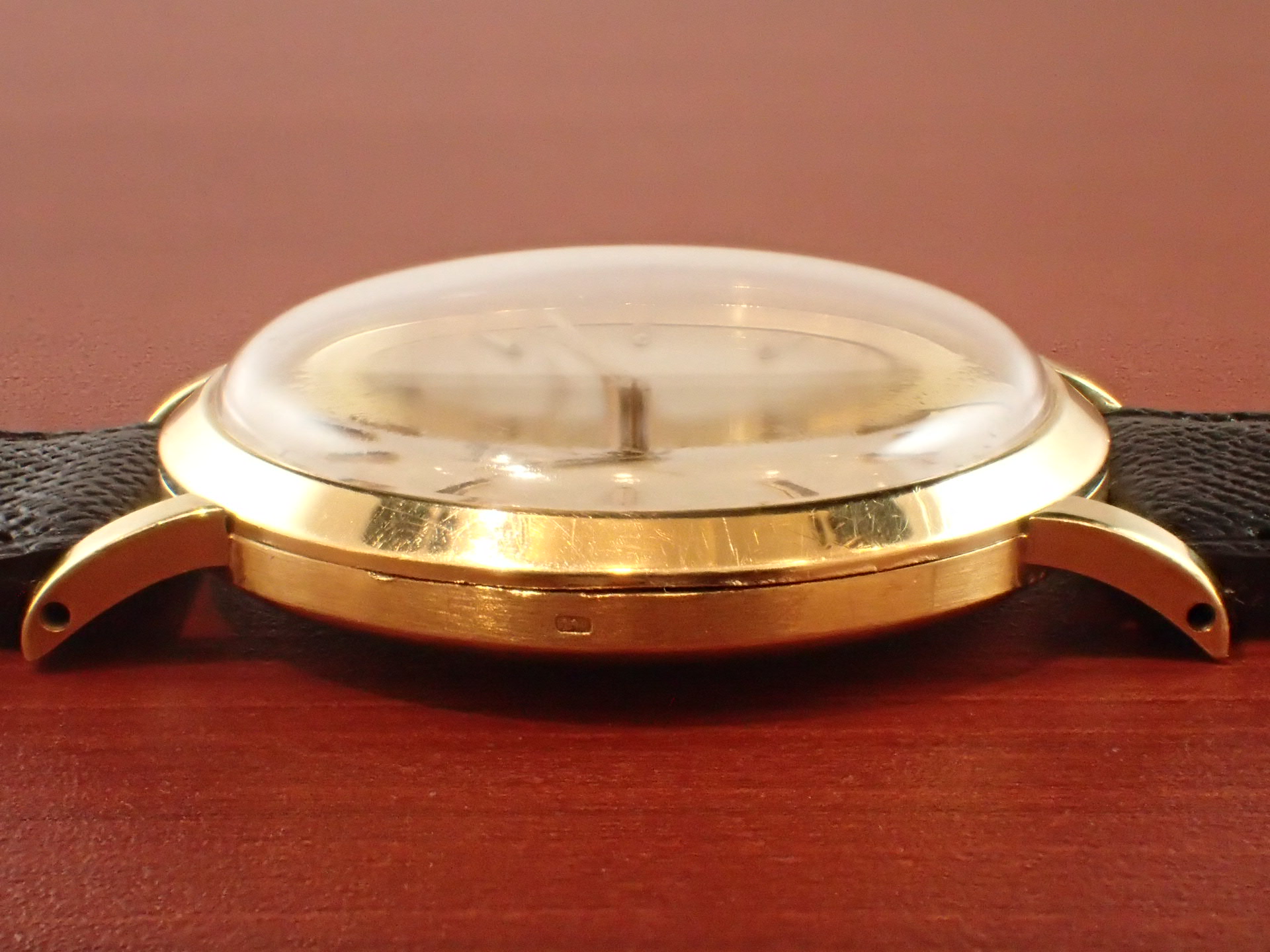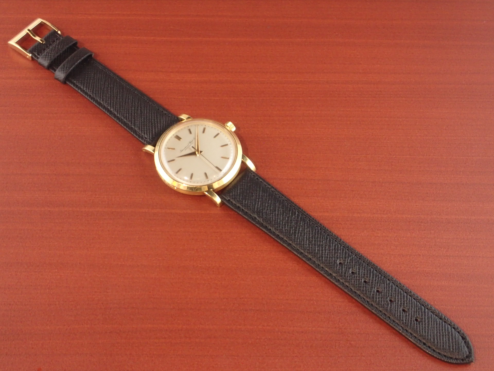 1950年代の初期にIWCが製造した時計です。センターセコンドの名機、キャリバー89を搭載しています。砲弾型のアプライドインデックスにドーフィンハンドは、この年代らしいデザインです。文字盤は、肉眼で気になるような経年変化や傷もなく、綺麗な状態です。ケースは、18金のイエローゴールドで、上品な色合いです。裏蓋に小傷はありますが、オリジナルのフォルムを残した良い状態です。ケースサイドとラグの刻印がはっきりと確認できます。ムーブメントはインカブロックの耐震装置付きで、綺麗な状態です。分解掃除後のお渡し。