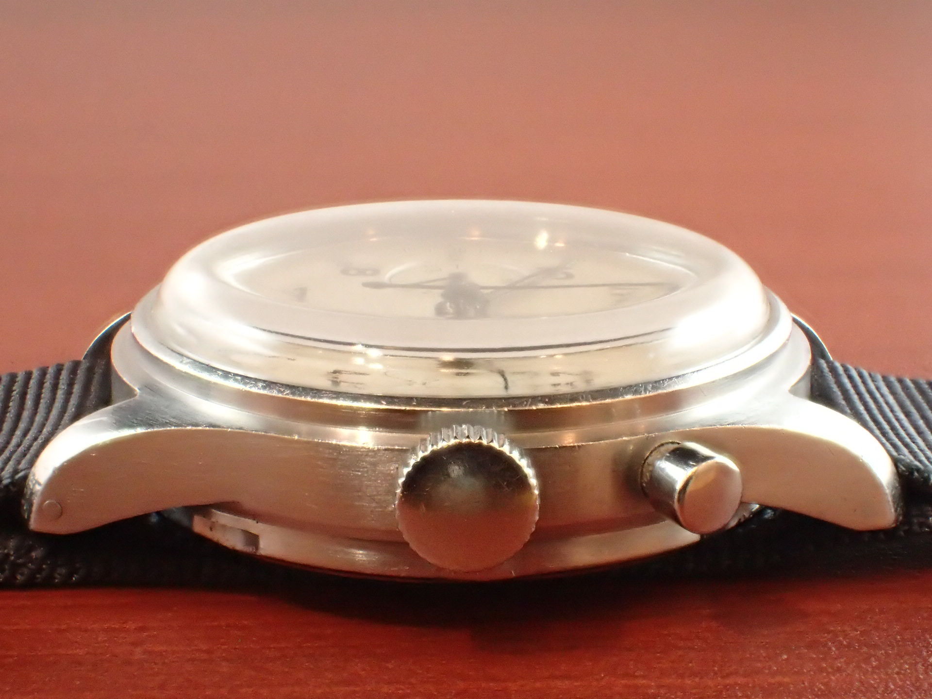 初めてイギリス海軍に納入されたシリーズ1のクロノグラフです。シリーズ1は、夜光の仕様がトリチウムに変わった時にイギリス国防省の文字盤に交換されてしまったため、オリジナルのまま残っていることは非常に稀です。ロゴとブロードアローが入らないものが、初期型ダイアルになります。文字盤は少々の小傷がありますが、気になるほどではないかと思います。ケースの状態は良く、小傷はあるものの痩せがない状態です。ムーブメントも大変綺麗で、クロノグラフファンクションも問題ありません。分解掃除済みで、日差30秒程度で稼働しています。