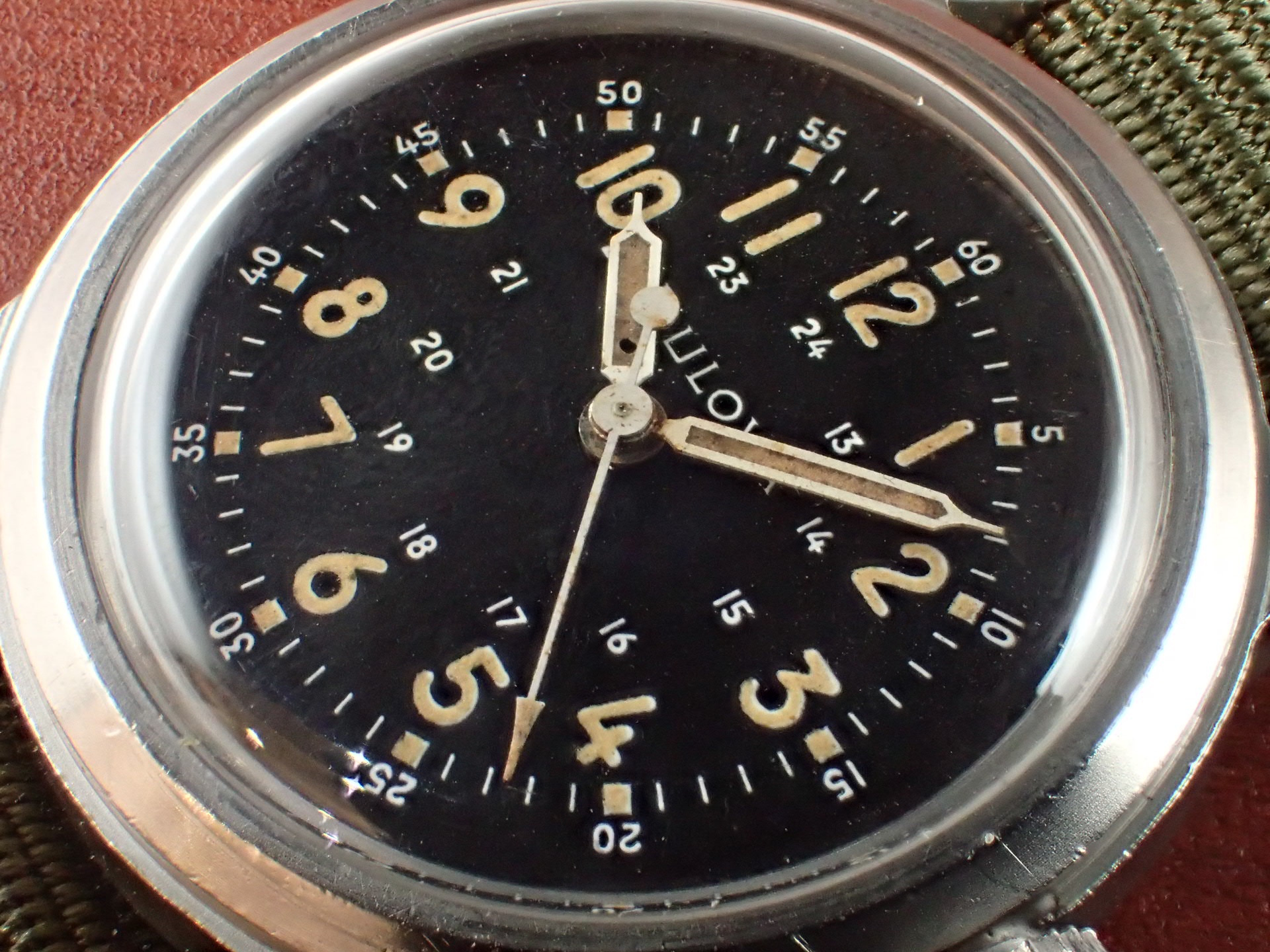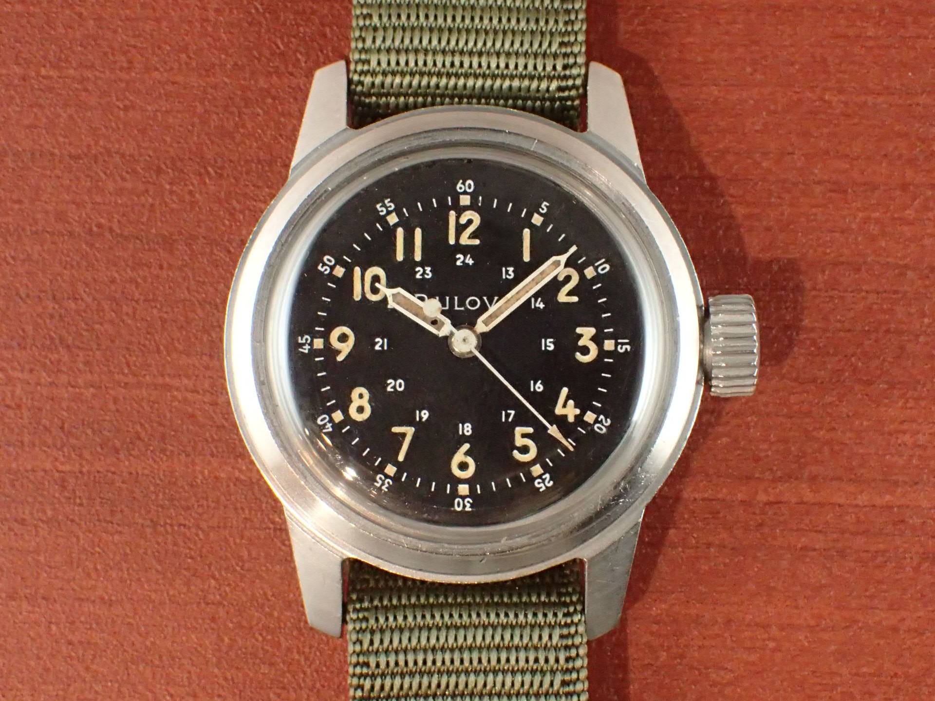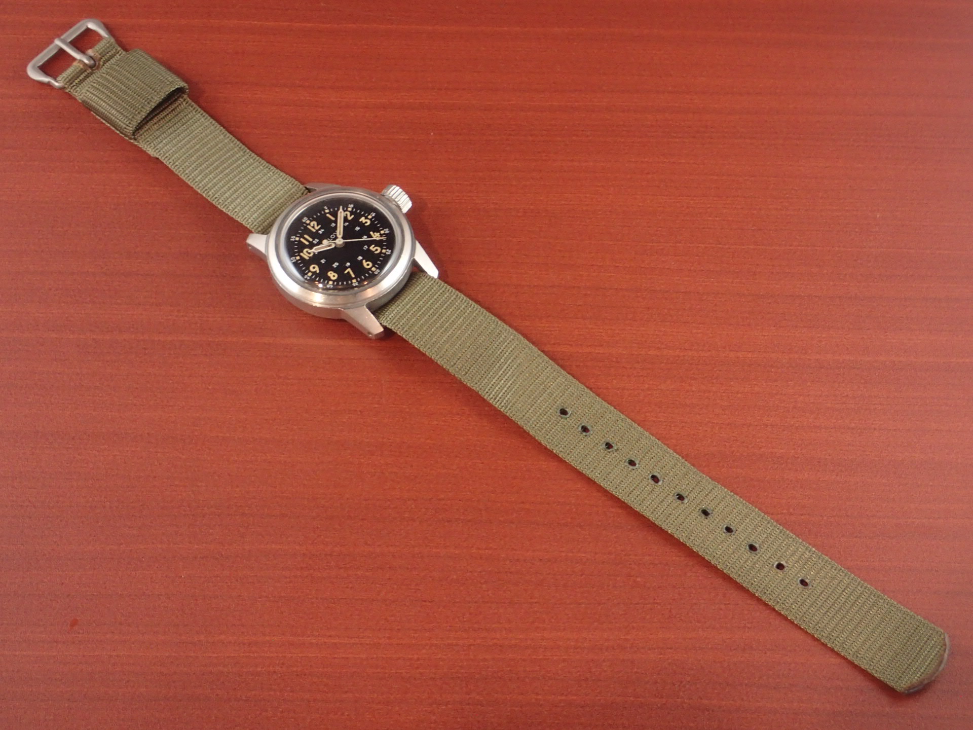 アメリカ軍が採用したブローバのタイプA17Aです。こちらは1958年に製造された個体です。文字盤は、特に気になる傷や汚れはなく、大変綺麗な状態です。ケースは他少々の傷が見られますが、ノンポリッシュで良い状態を維持しています。ムーブメントも良い状態です。ナイロンベルトは1965年に米軍に納入されたオリジナルのニューオールドストックを装着。分解掃除済みで日差30秒程度で稼働しています。