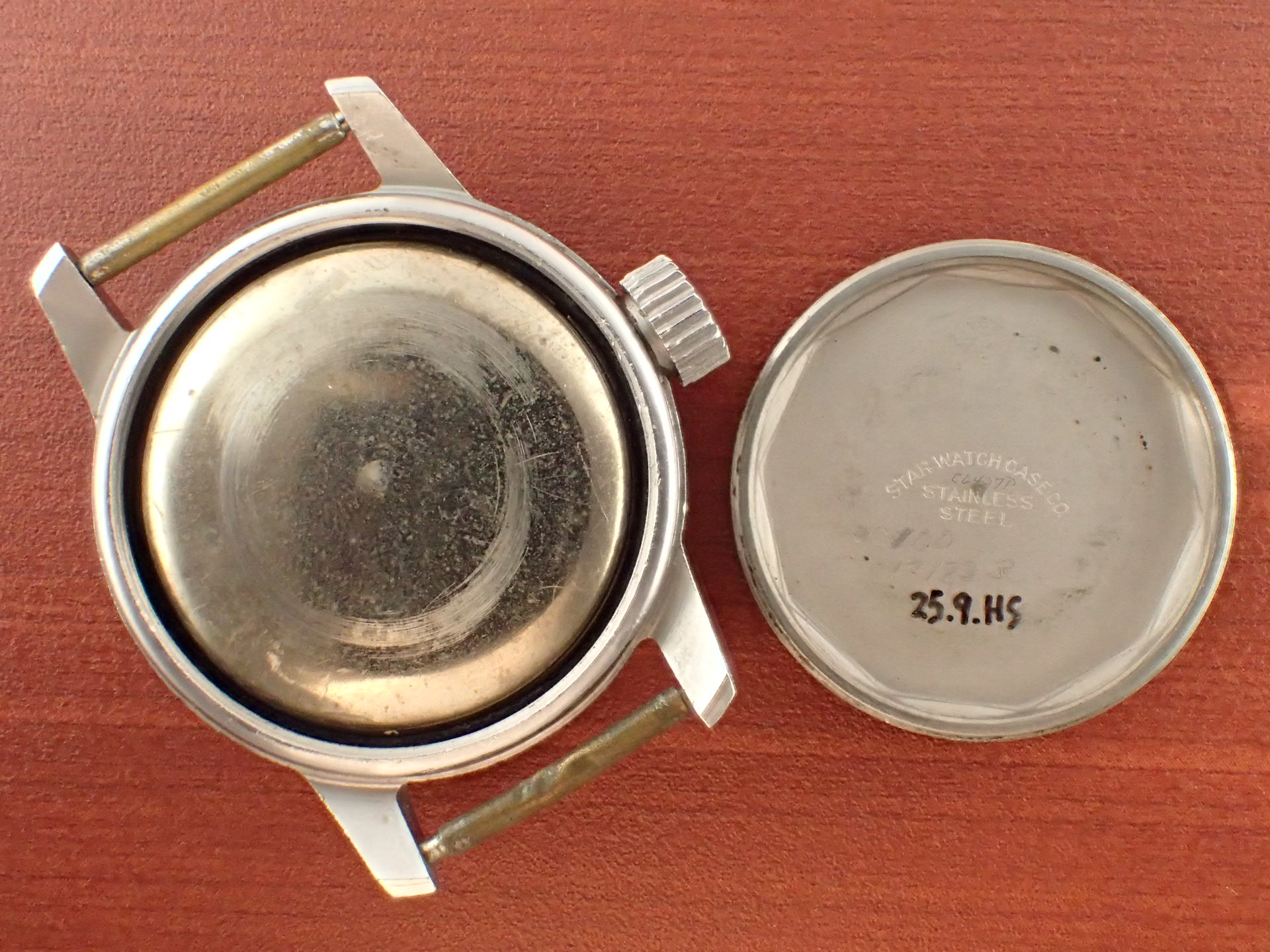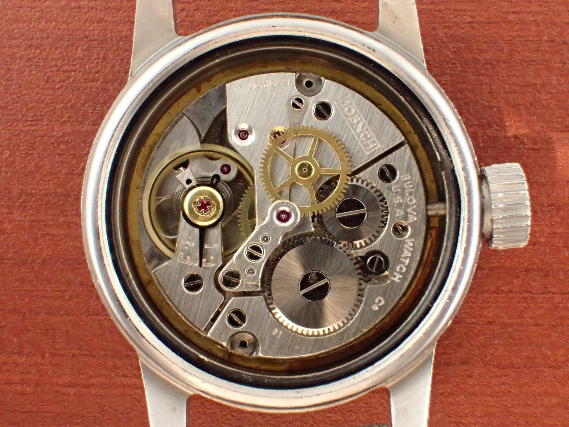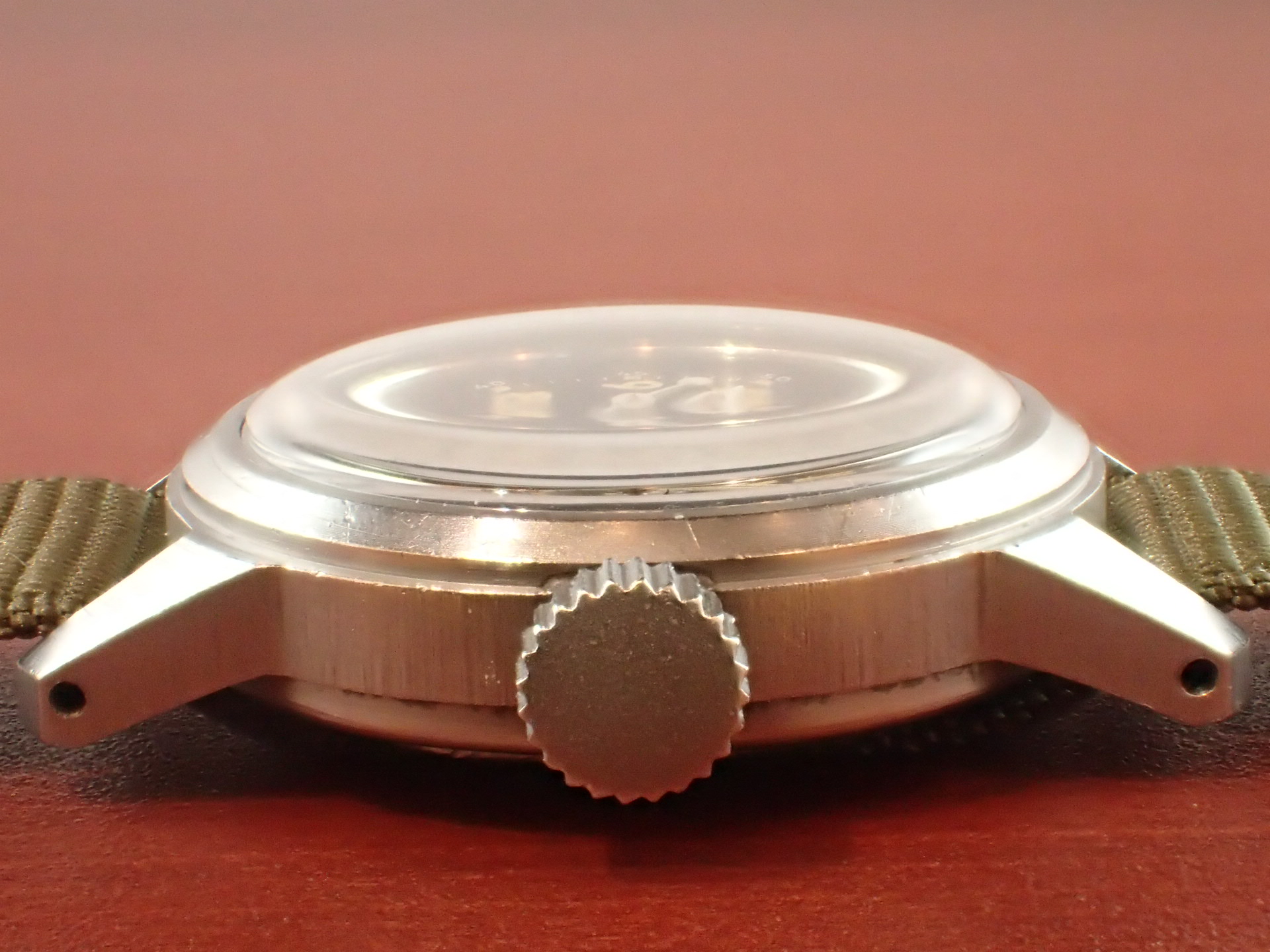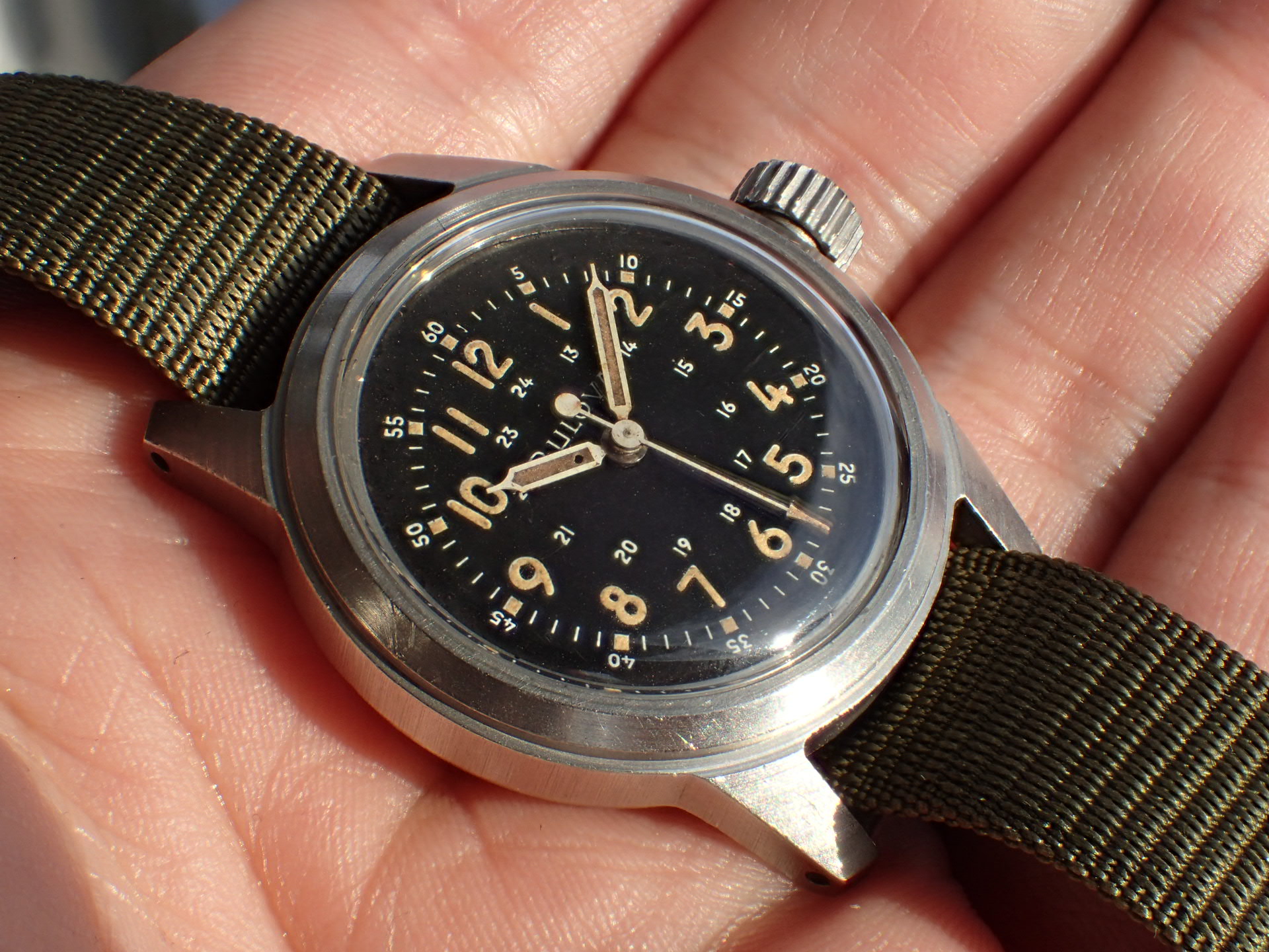 アメリカ軍が採用したブローバのタイプA17Aです。こちらは1958年に製造された個体です。文字盤は、特に気になる傷や汚れはなく、大変綺麗な状態です。ケースは他少々の傷が見られますが、ノンポリッシュで良い状態を維持しています。ムーブメントも良い状態です。ナイロンベルトは1965年に米軍に納入されたオリジナルのニューオールドストックを装着。分解掃除済みで日差30秒程度で稼働しています。