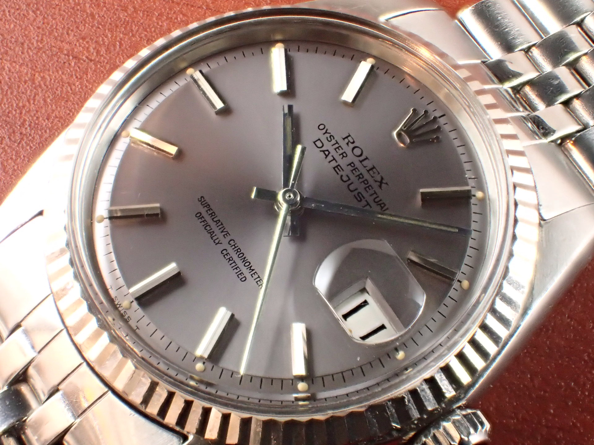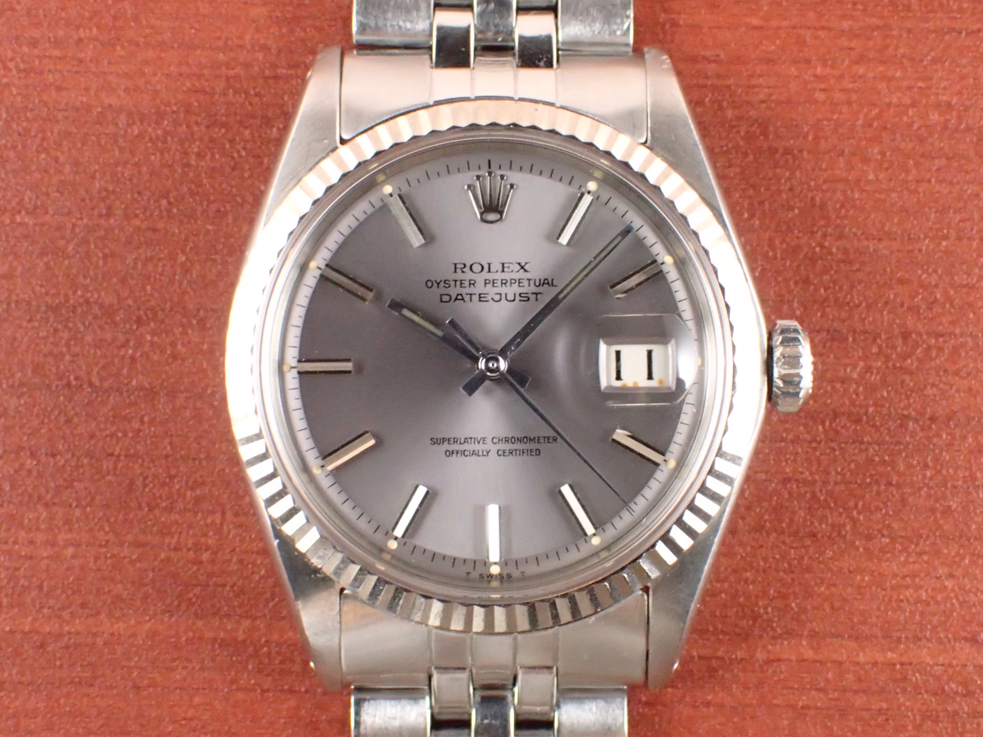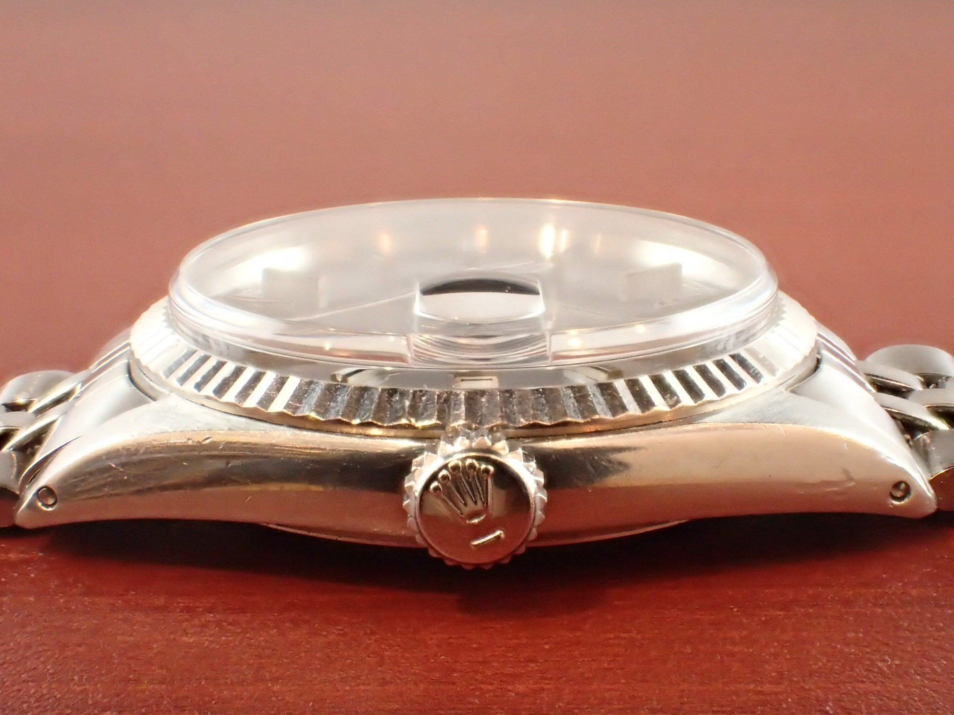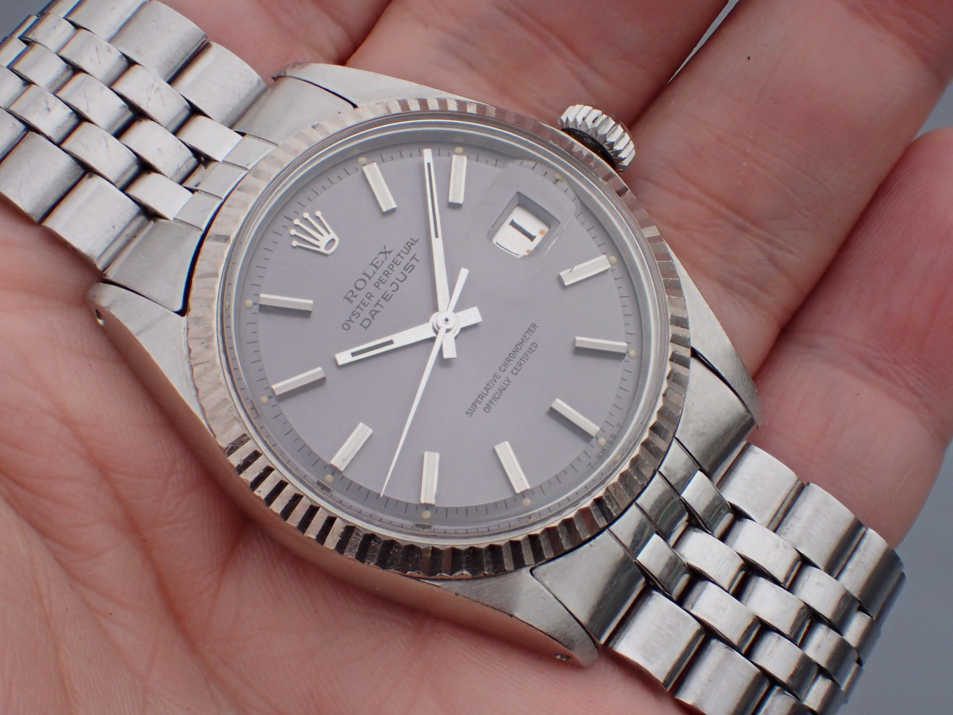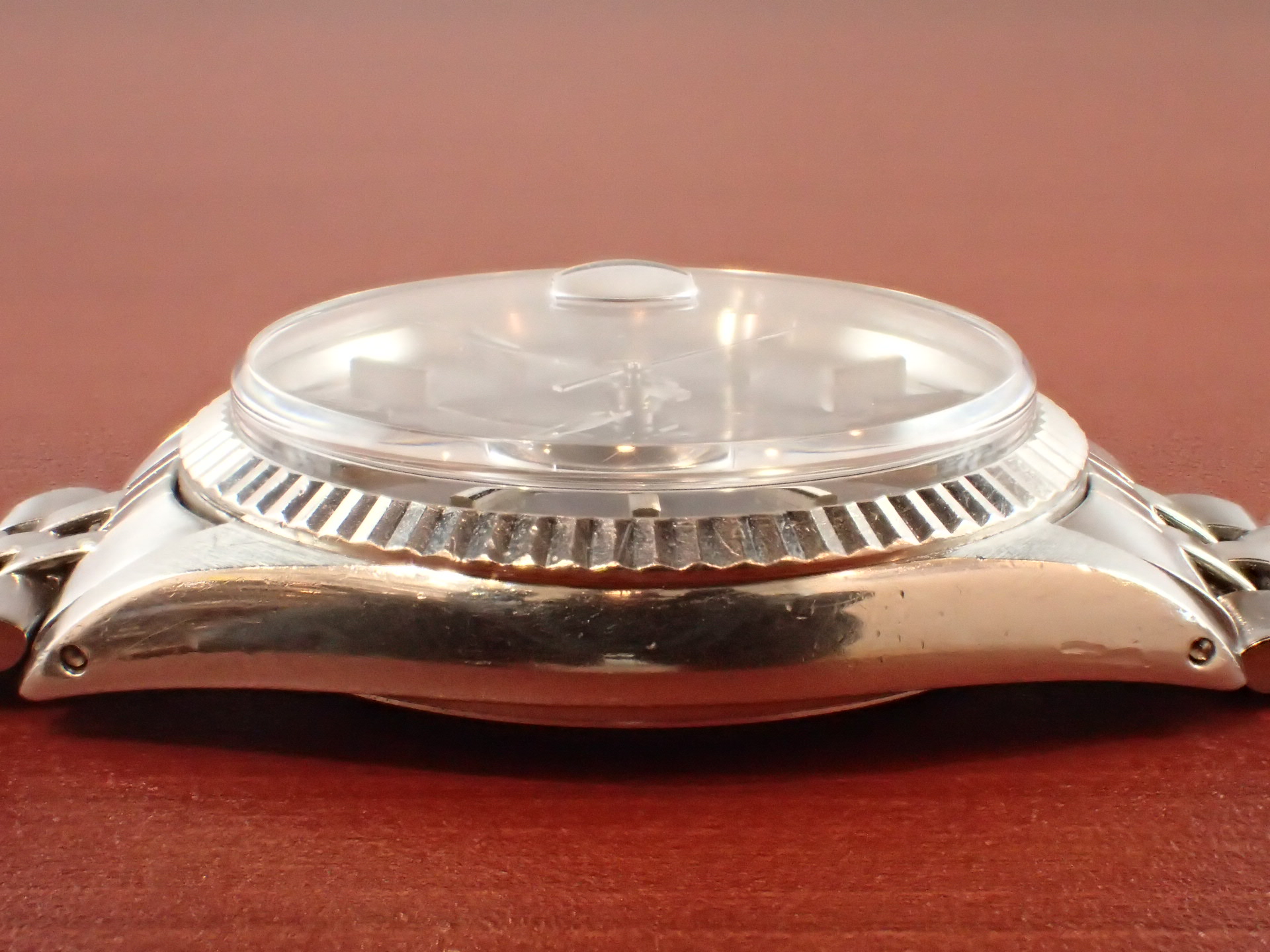 1970年に製造されたデイトジャストです。16xx系のデイトジャストの中でも珍しいパープル文字盤は、傷や経年変化のない非常に綺麗な状態です。ケースは、目立つ傷はなく良好な状態です。ホワイトゴールドベゼルも非常にシャープです。ムーブメントはキャリバー1570を搭載。ブレスレットはバックル一式が交換されていますが、フルコマで手首周り19cmの方まで装着可能です。分解掃除済みで日差30秒程度で稼働しています。