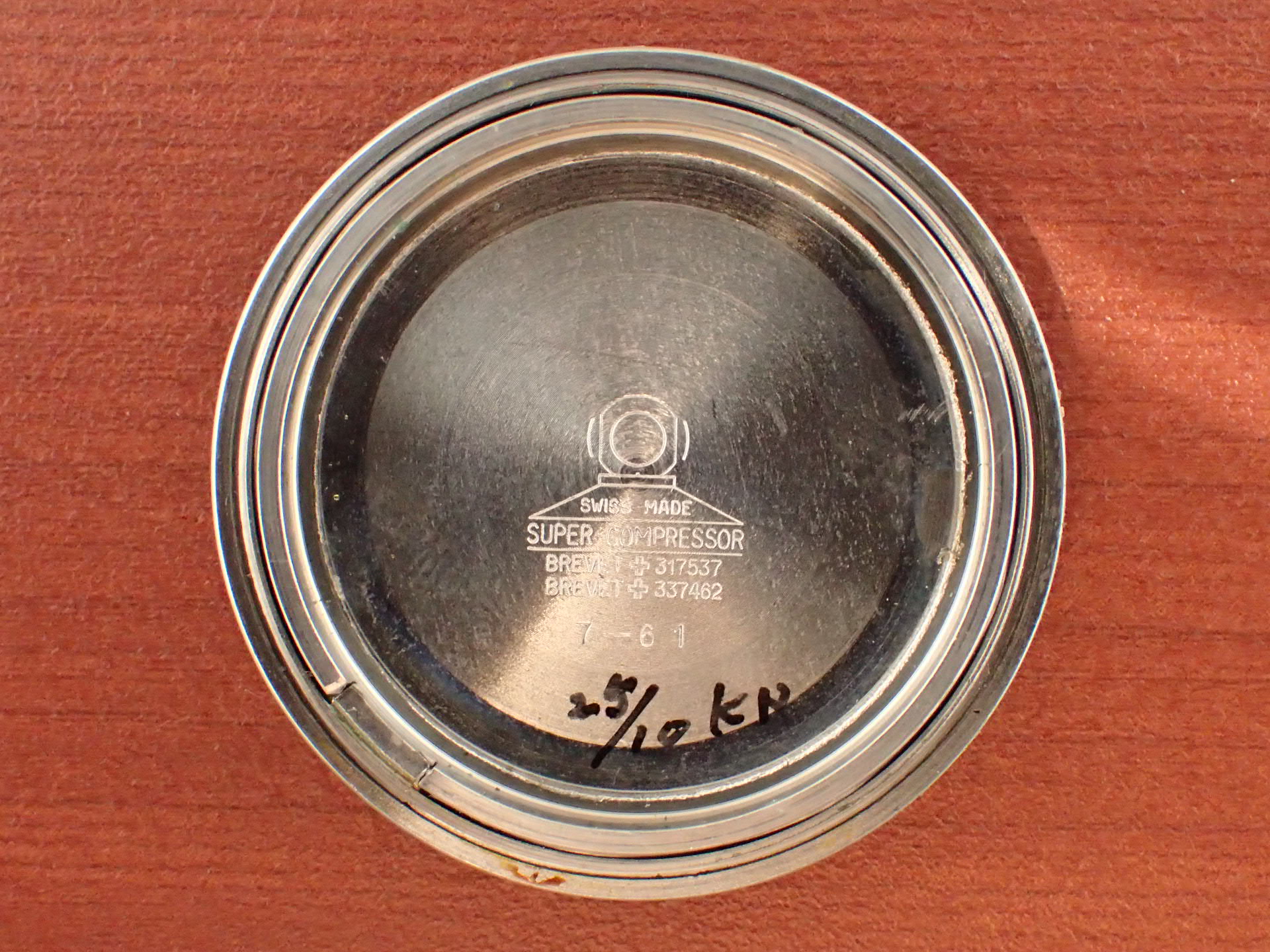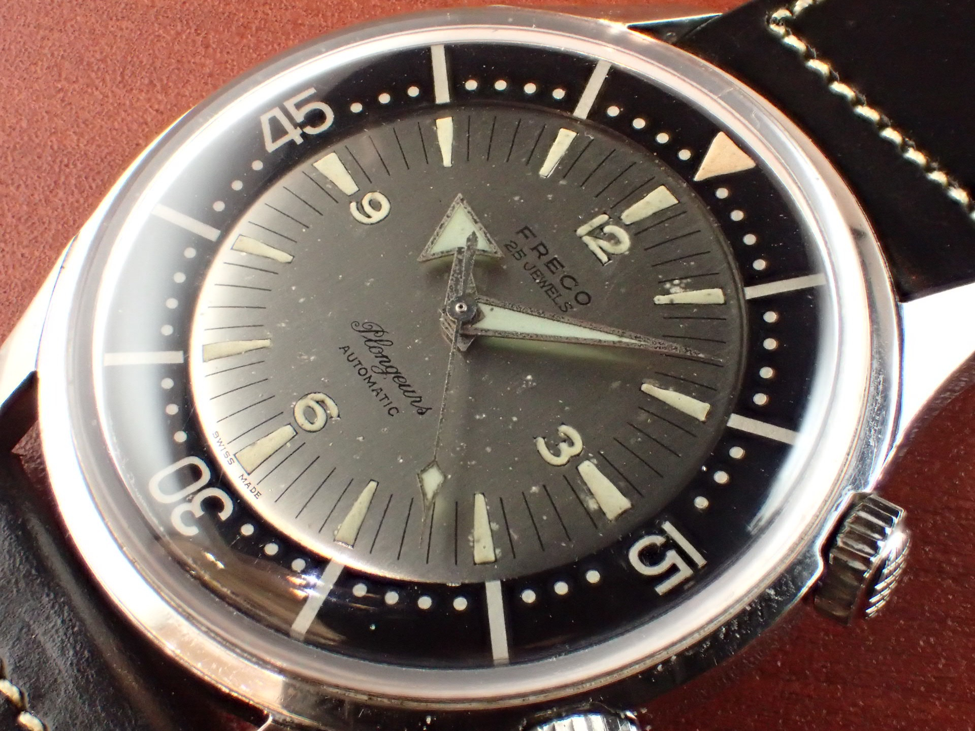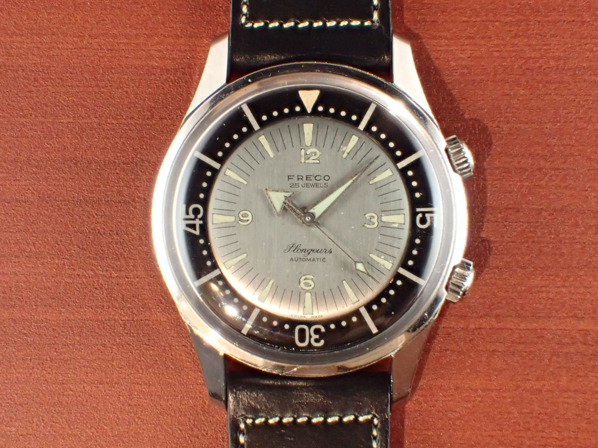 防水機構の特許を所得しているEPSA社のスーパーコンプレッサーケース、その中でもケース径42mmという大型サイズを装備するこのモデル。ロンジンのレジェンドダイバーと同じケースを採用しています。さすがにこの大きさは迫力があります。モデル名である「PLONGEURS」はフランス語で「DIVERS」を意味しています。シルバーダイアルとブラックのインナーベゼルとのコントラストもなかなかいい。アローハンドがまたいいですね。文字盤は若干の経年変化が見られますが、それが気にならないくらい迫力ある時計です。ケースはエッジが残っており、痩せが見られない良い状態を維持しています。インナーベゼルの状態は良いです。こちらは委託品となりますが、当店で分解掃除済みの為、1年間の修理保証書が付属します。
