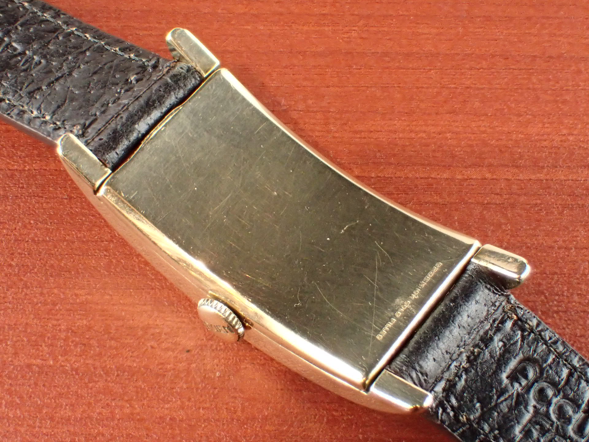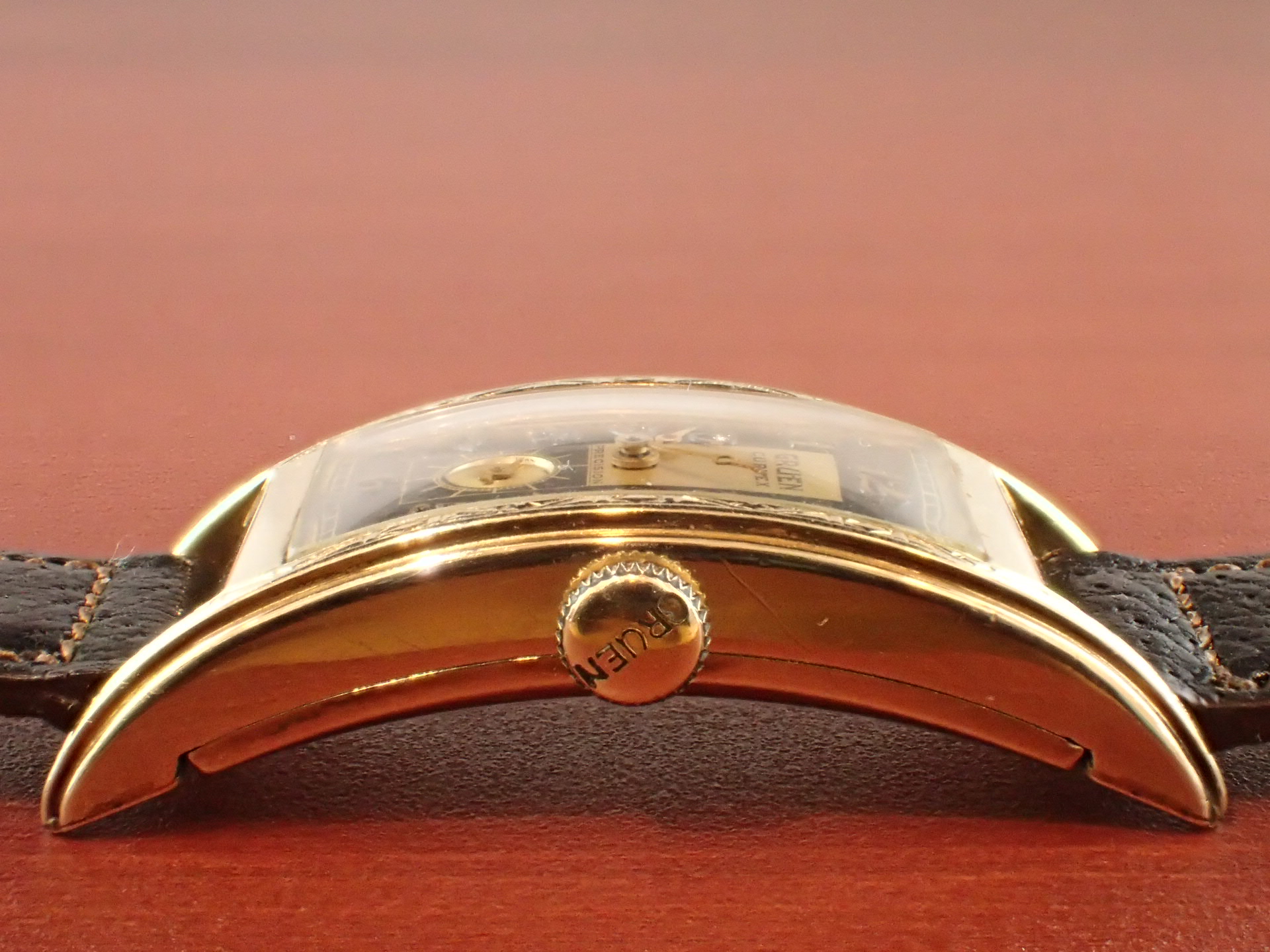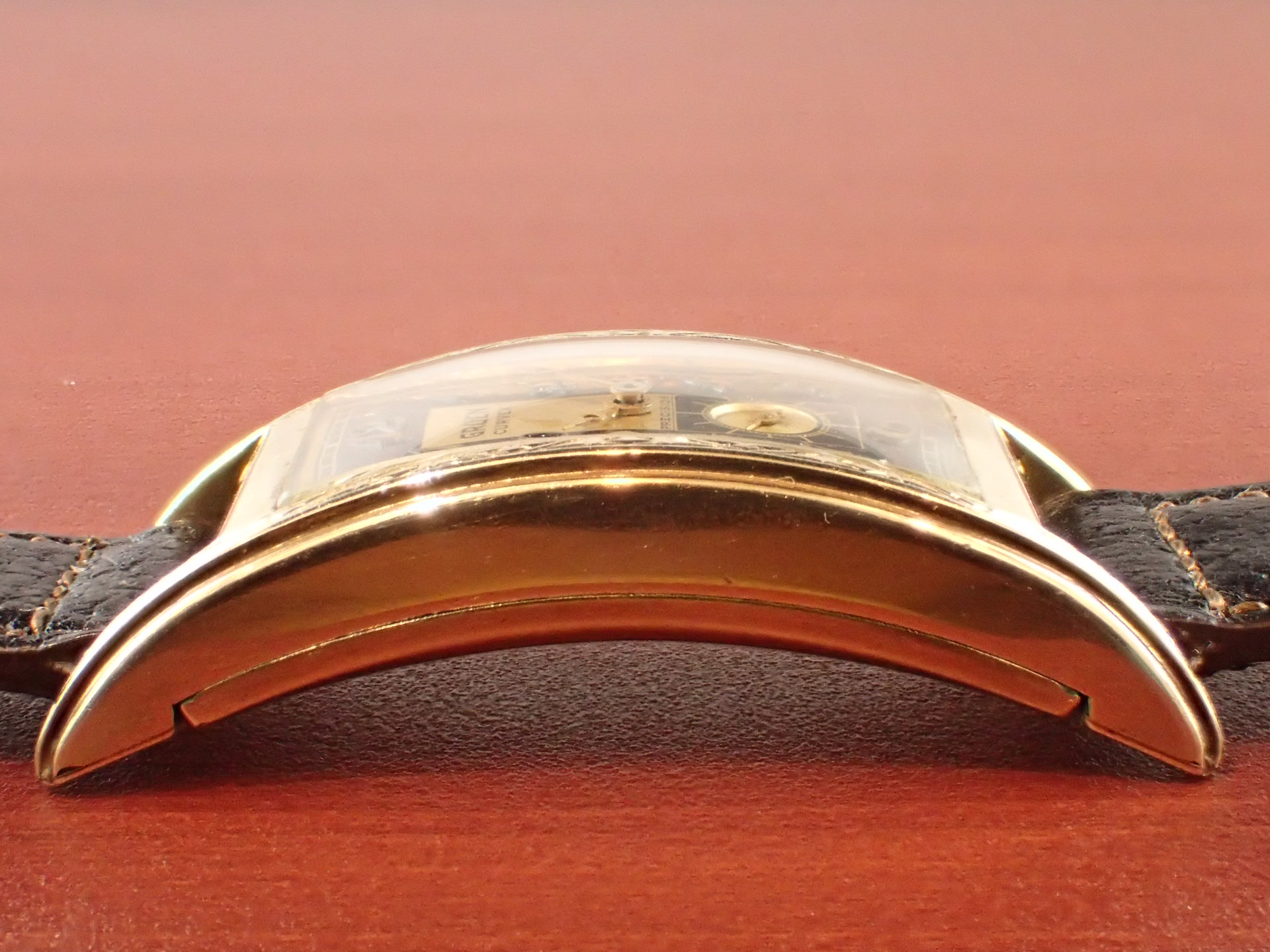 グリュエンのカーベックスにおいて、デザインの素晴らしさで私の個人的ランキング上位に入るこのモデル。Ref.280という品番ですが、幾つかのバリエーションがあり、ホワイトの2トーンダイアル、通常のホワイトダイアルが存在、ケースもベゼル部分のイングレービングがあるものとないものがあります。この中で、このブラック/ゴールドの2トーンダイアル、イングレービングケース、この組み合わせは最高です。ブレゲインデックスにブレゲハンド、このゴールデンコンビもいいですね。カーベックスはケース及びムーブメントがカーブを描いていることから名づけられている訳ですが、そのケース形状は様々。特にこのサイドから見たときの三日月型の形状はたまりませんね。フィット感が素晴らしいです。リダン文字盤も多く、コンディションが良い個体が少なくなってきましたが、こちらは、6時下に少々のダメージがあるものの、良好な状態を維持しています。ケースは小傷がありますが、気になるような大きな傷はありません。分解掃除済みで日差30秒程度で稼働しています。