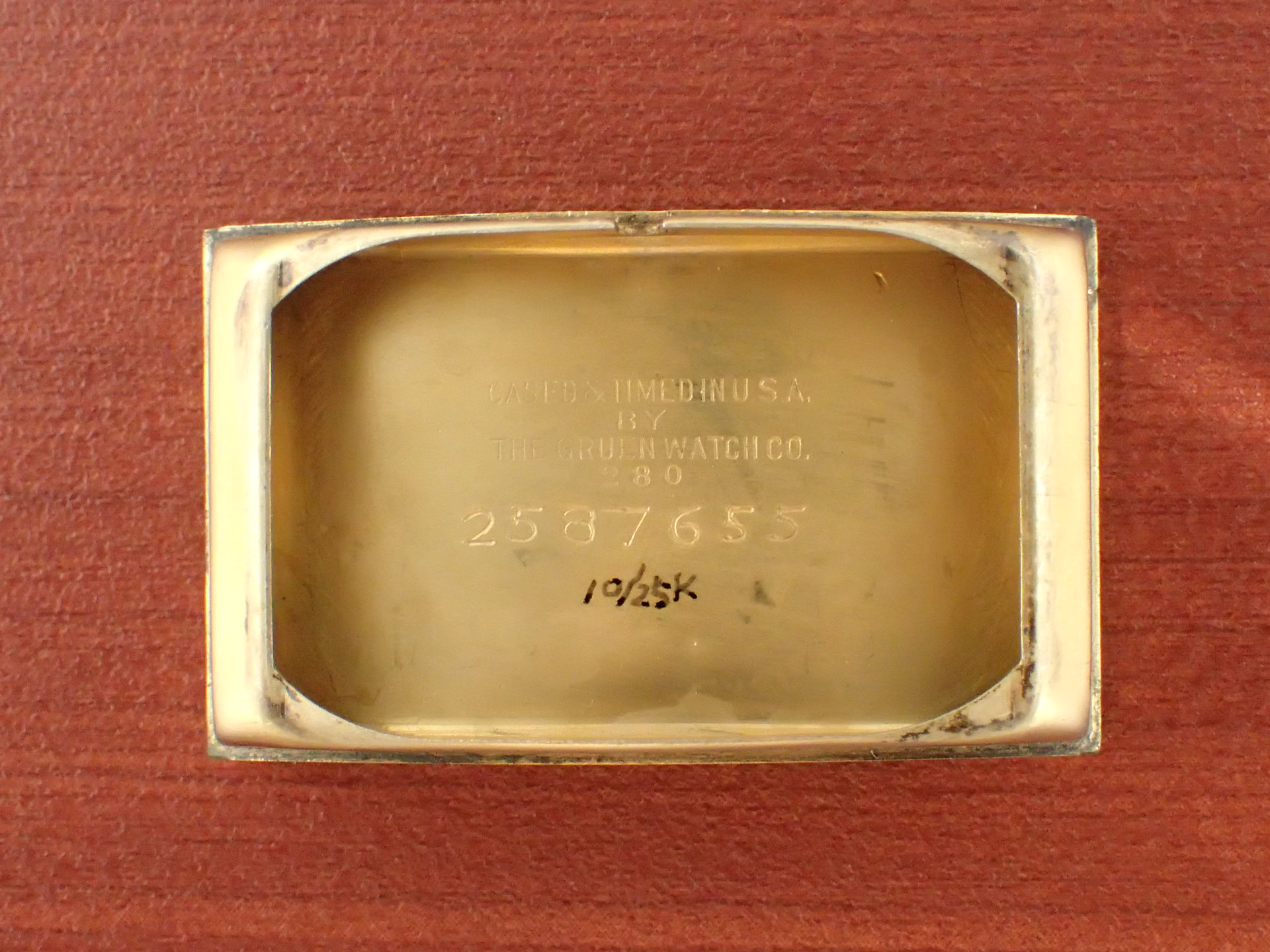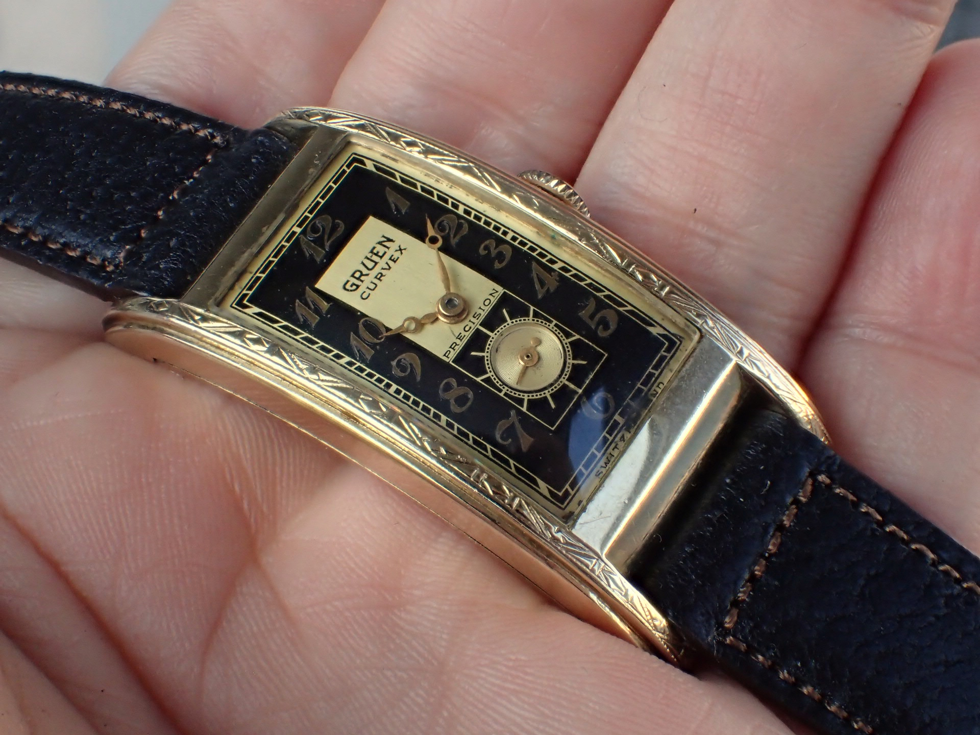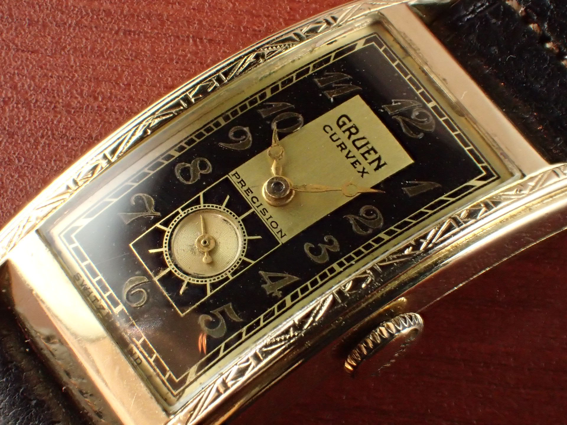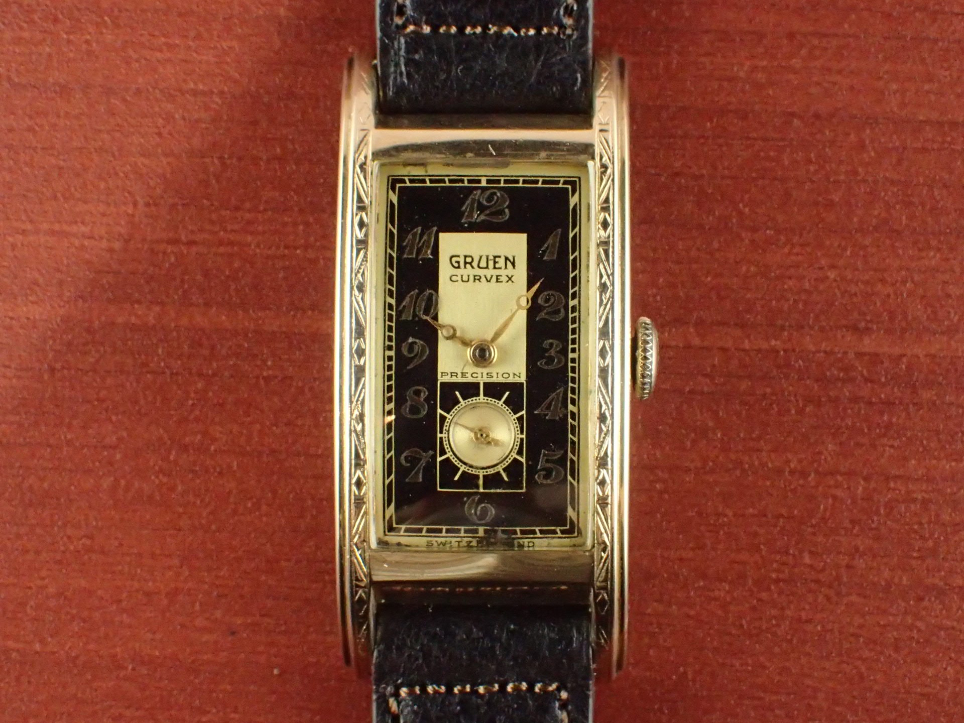 グリュエンのカーベックスにおいて、デザインの素晴らしさで私の個人的ランキング上位に入るこのモデル。Ref.280という品番ですが、幾つかのバリエーションがあり、ホワイトの2トーンダイアル、通常のホワイトダイアルが存在、ケースもベゼル部分のイングレービングがあるものとないものがあります。この中で、このブラック/ゴールドの2トーンダイアル、イングレービングケース、この組み合わせは最高です。ブレゲインデックスにブレゲハンド、このゴールデンコンビもいいですね。カーベックスはケース及びムーブメントがカーブを描いていることから名づけられている訳ですが、そのケース形状は様々。特にこのサイドから見たときの三日月型の形状はたまりませんね。フィット感が素晴らしいです。リダン文字盤も多く、コンディションが良い個体が少なくなってきましたが、こちらは、6時下に少々のダメージがあるものの、良好な状態を維持しています。ケースは小傷がありますが、気になるような大きな傷はありません。分解掃除済みで日差30秒程度で稼働しています。