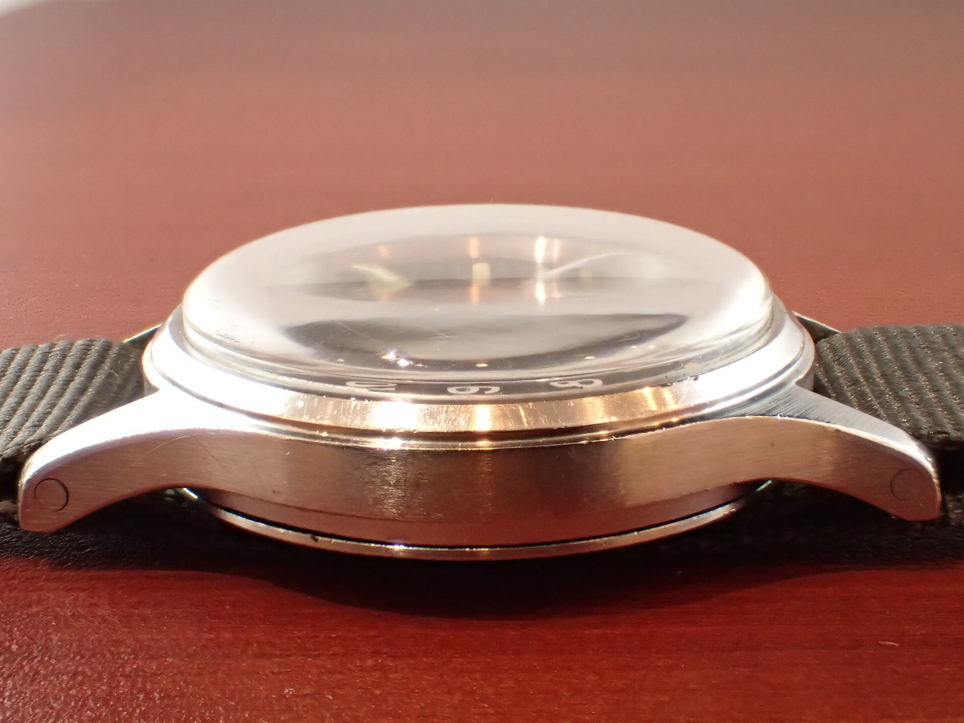 1960年代にイギリス空軍に支給されたパイロットウォッチです。このモデルには前期と後期があり、前期タイプのスペックコードは「6B-9101000」で搭載ムーブメントはキャリバー75のハック機能が付かないタイプ。そして、1967年に支給された後期タイプのスペックコードは「6B-9614045」で搭載ムーブメントはキャリバー75にハック機能を追加したキャリバーS75Sを搭載しています。本個体は前期タイプになります。デザインはIWCのマーク11に似ています。文字盤は気になるような傷や汚れはなく良好な状態です。ケース全体に小傷がありますが、痩せている感じはなく、良好な状態と言えます。ムーブメントも綺麗な状態です。ベルト取り付け部はパリス管(はめ殺し)です。分解掃除後のお渡し。