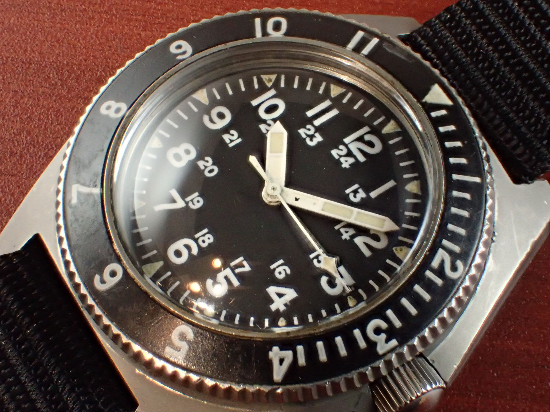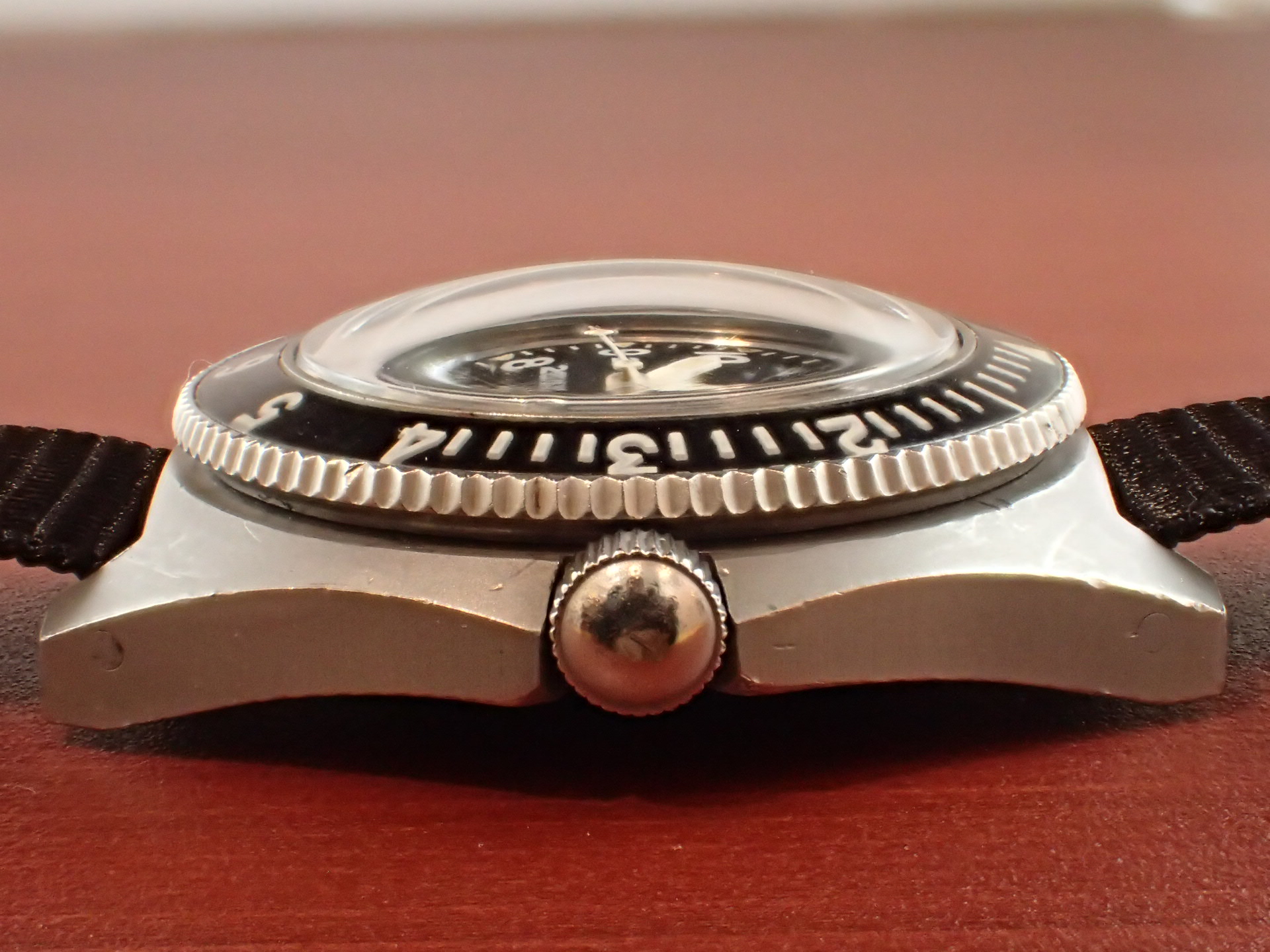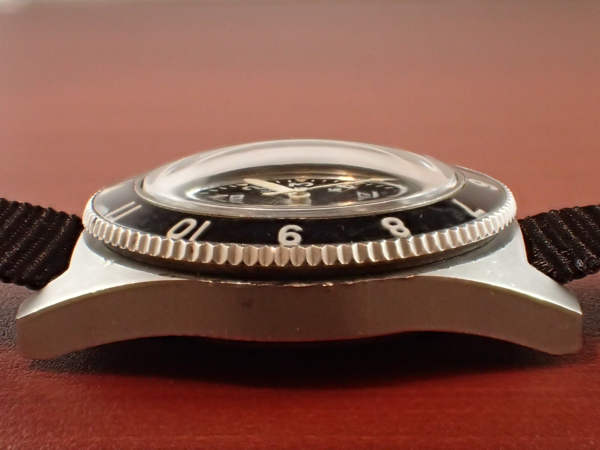 1970年代にアメリカ海軍、特殊部隊で使用されたベンラスのタイプⅡクラスAです。タイプⅡクラスAは陸軍特殊部隊、陸軍レンジャー部隊、CIA海洋部隊にも支給されています。厚みがあり堅牢なケースで、大変重く、まるで鉄の塊みたい・・・まさに特殊部隊用といった印象です。文字盤にブランド名が入らず、余計なデザインもない・・・といった部分がいいですね。リューズはスクリューロック式で、防水性能は150mほどと言われています(古いモデルですので水には浸けないで下さい)。裏蓋の刻印がとても良い雰囲気です。ケースの構造が特殊で、裏蓋のないワンピースケースの内部にさらにケースが入った2重構造です。このモデルはキャリバーGS1D2を搭載した前期とKG1D2を搭載した後期タイプがあります。この個体は後期タイプです。