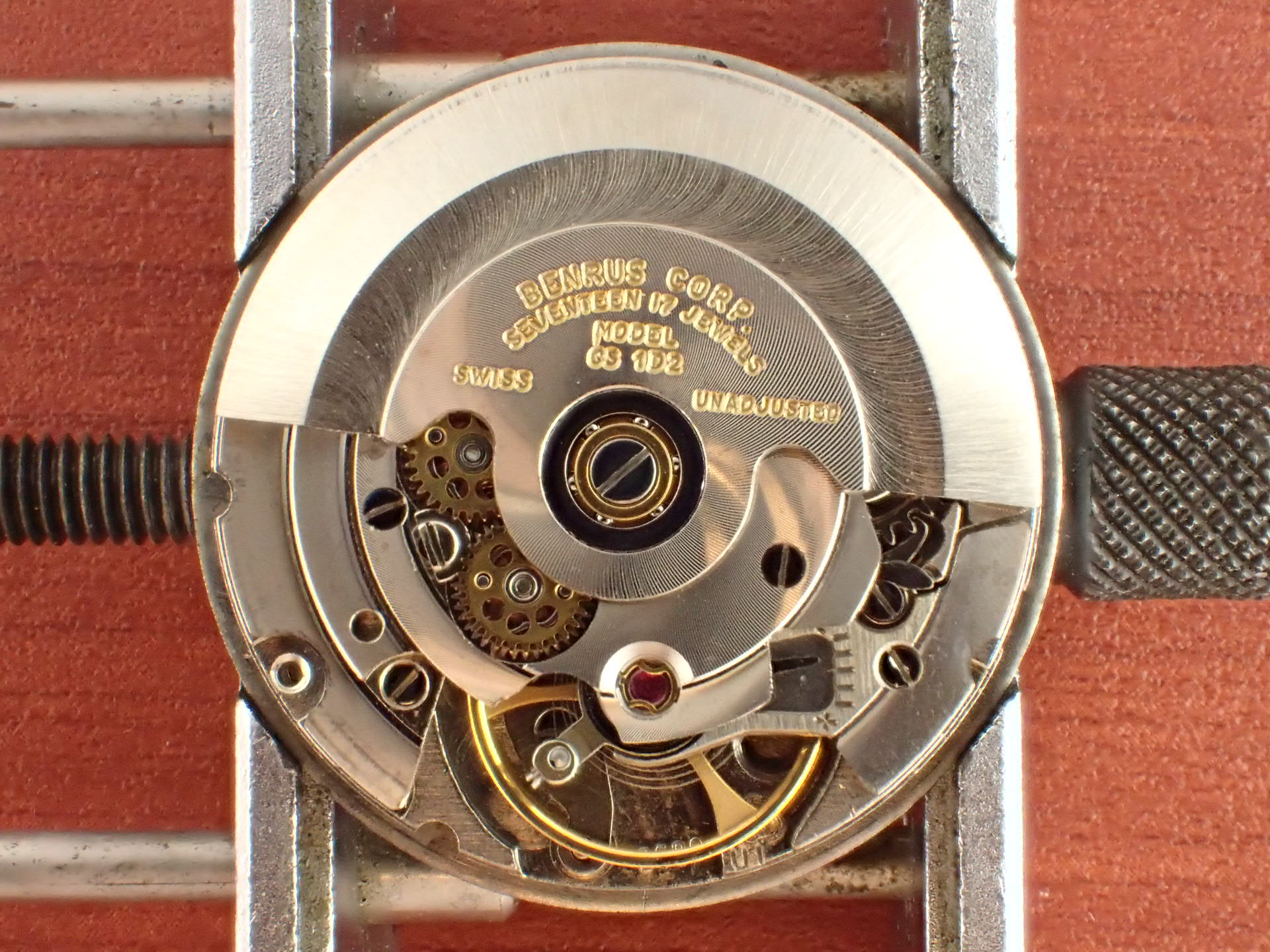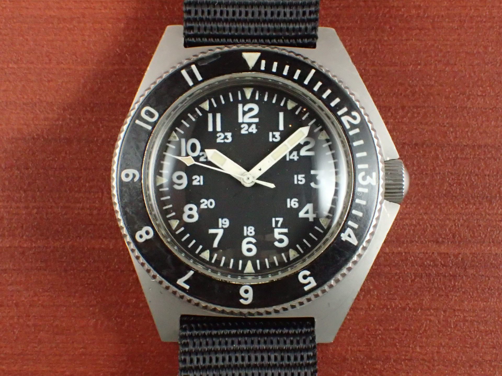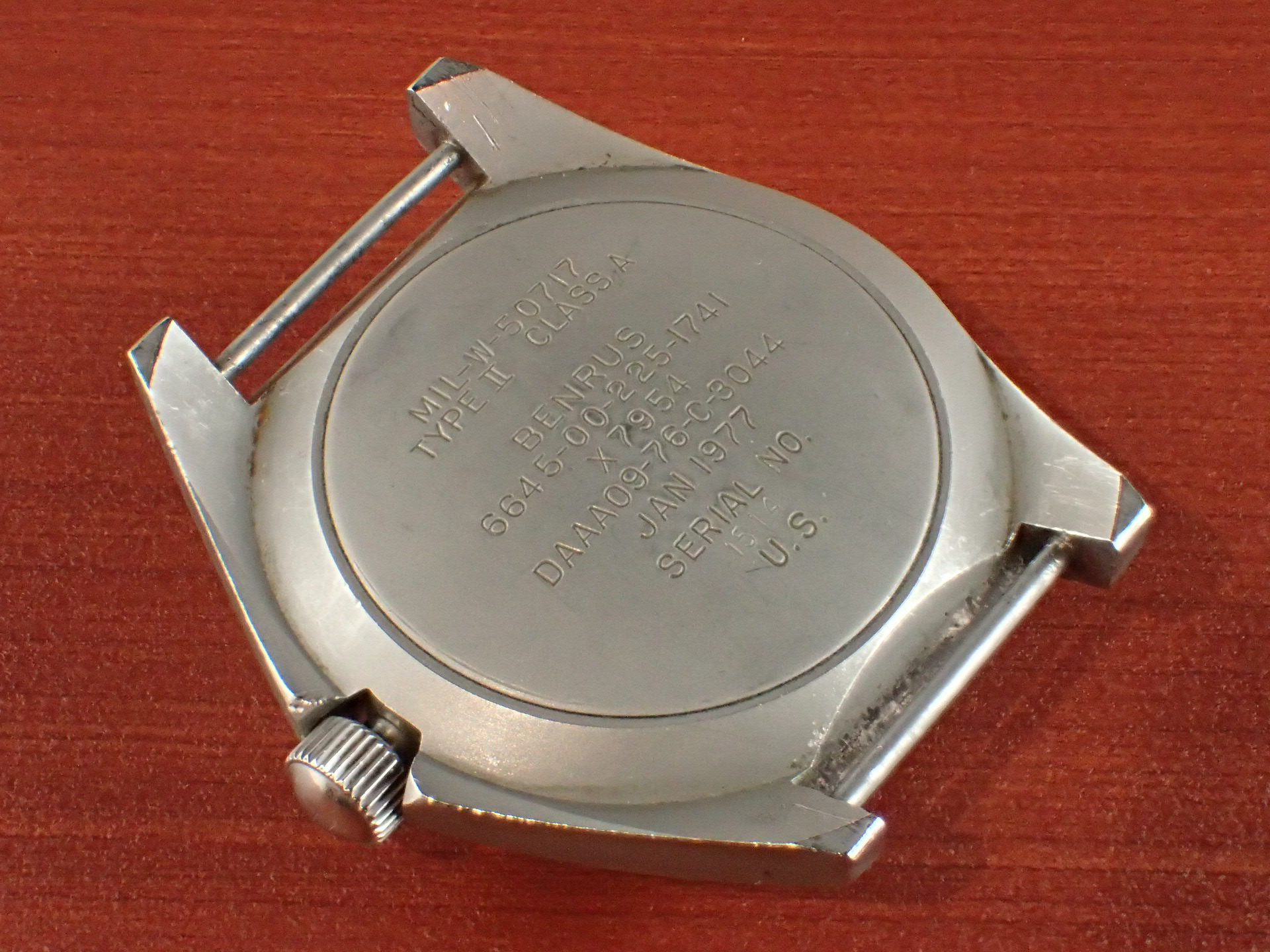 1970年代にアメリカ海軍、特殊部隊で使用されたベンラスのタイプⅡクラスAです。タイプⅡクラスAは陸軍特殊部隊、陸軍レンジャー部隊、CIA海洋部隊にも支給されています。厚みがあり堅牢なケースで、大変重く、まるで鉄の塊みたい・・・まさに特殊部隊用といった印象です。文字盤にブランド名が入らず、余計なデザインもない・・・といった部分がいいですね。リューズはスクリューロック式で、防水性能は150mほどと言われています(古いモデルですので水には浸けないで下さい)。裏蓋の刻印がとても良い雰囲気です。ケースの構造が特殊で、裏蓋のないワンピースケースの内部にさらにケースが入った2重構造です。このモデルはキャリバーGS1D2を搭載した前期とKG1D2を搭載した後期タイプがあります。この個体は後期タイプです。