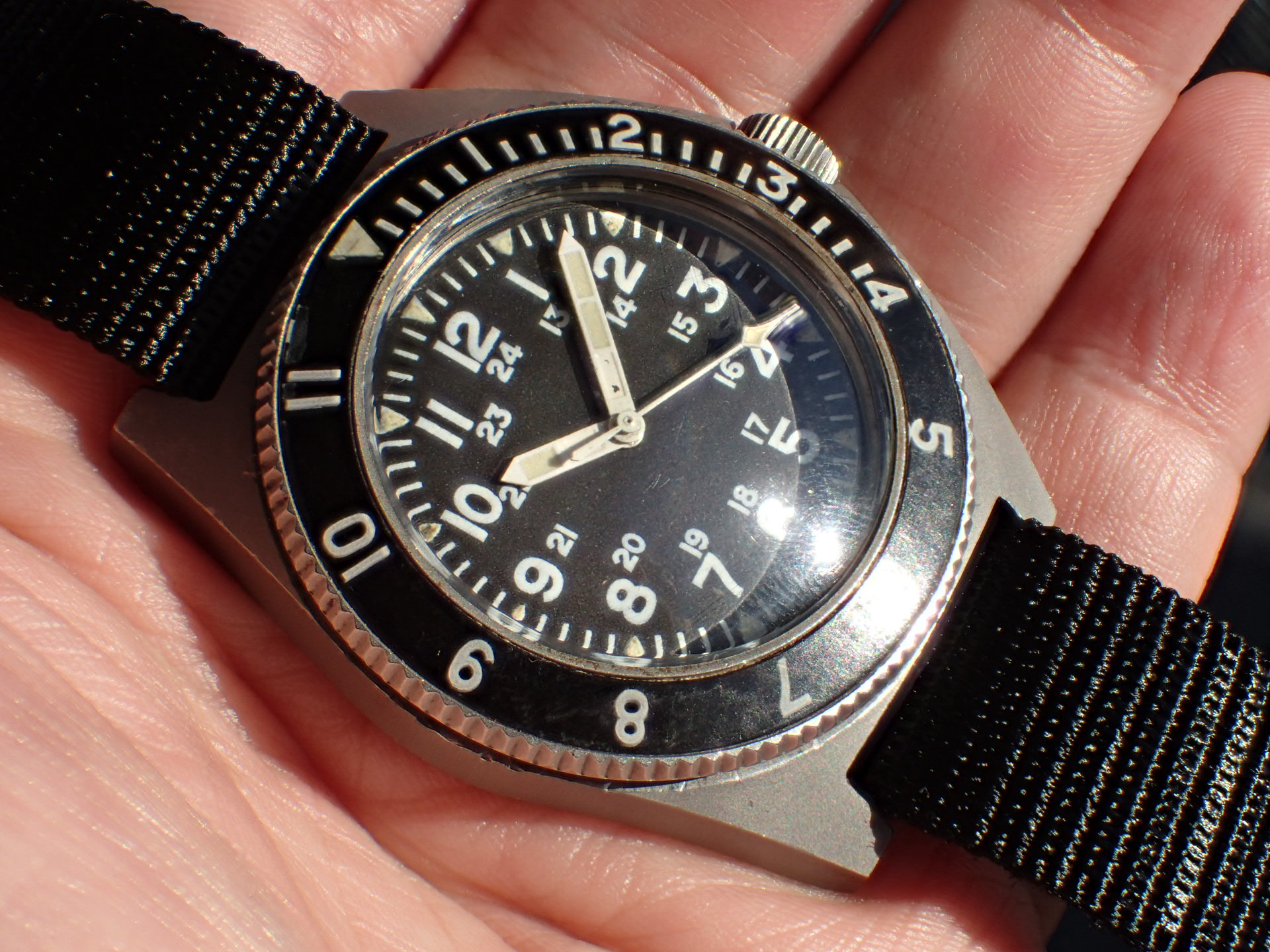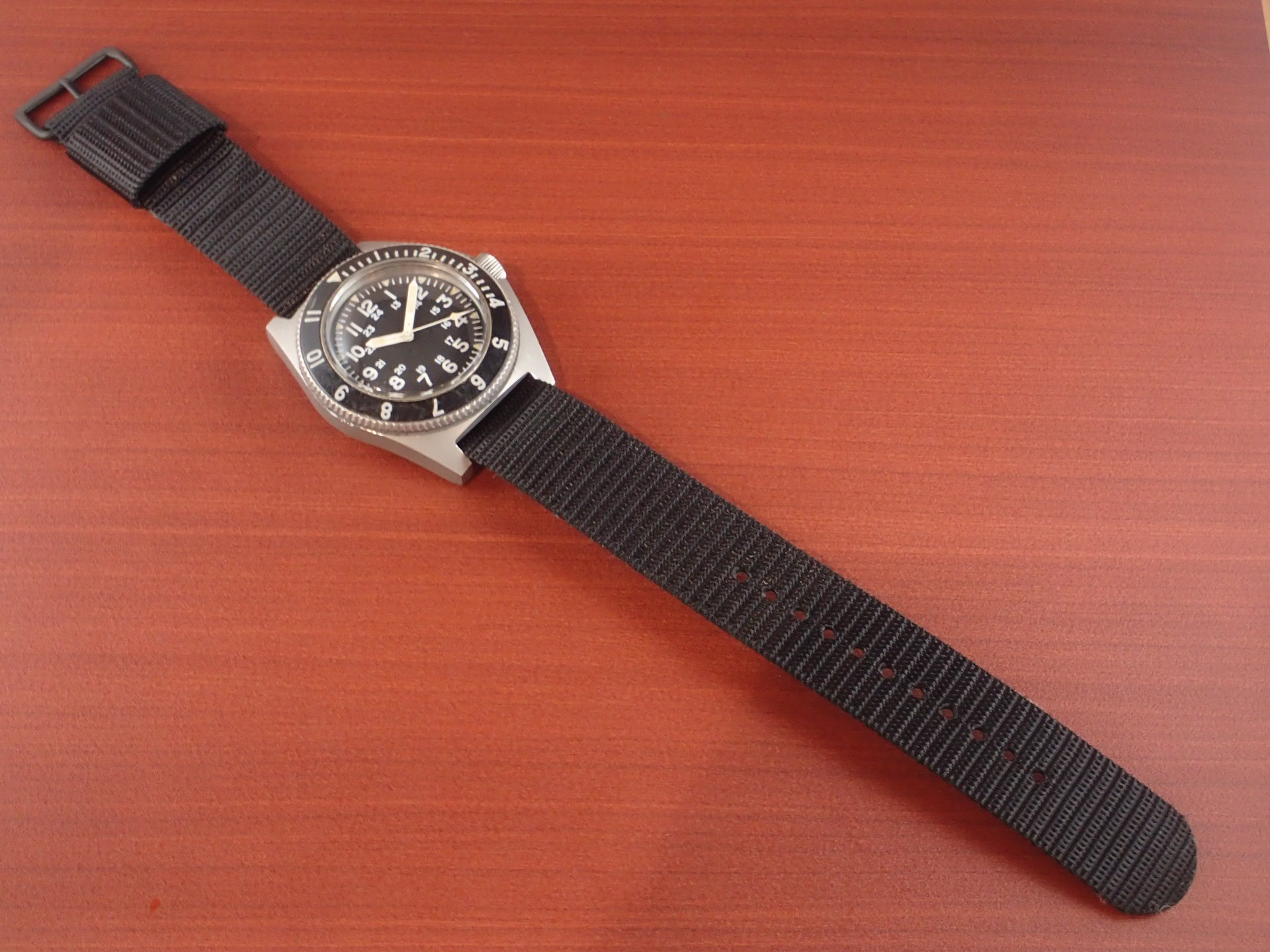 文字盤はマットブラックで、微細な小傷がありますが、良い状態です。このモデルはベゼルの状態が良いものが少ないですが、この個体は、多少の小傷があるものの、ヒビや大きな内部剥離が見られず、概ね良好な状態です。ケースは小傷がありますが、エッジもしっかりと残っていて、研磨された形跡はありません。リューズはジョイント巻真で抜ける構造になっていますので、時間合わせの際にリューズを引く時は軽く慎重にお願いします。ベルトは、MARATHON(マラソン)の米軍ナイロンベルト、MIL-S-46383を装着しています。こちらは委託品となりますが、当店で分解掃除をしてお渡しするため、1年間の修理保証書が付属します。