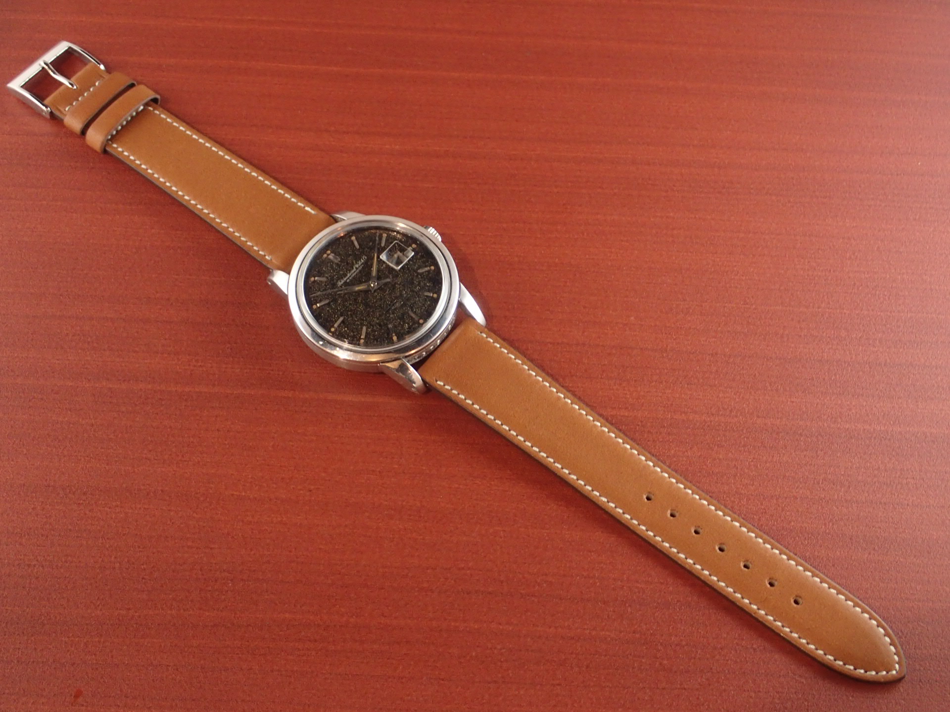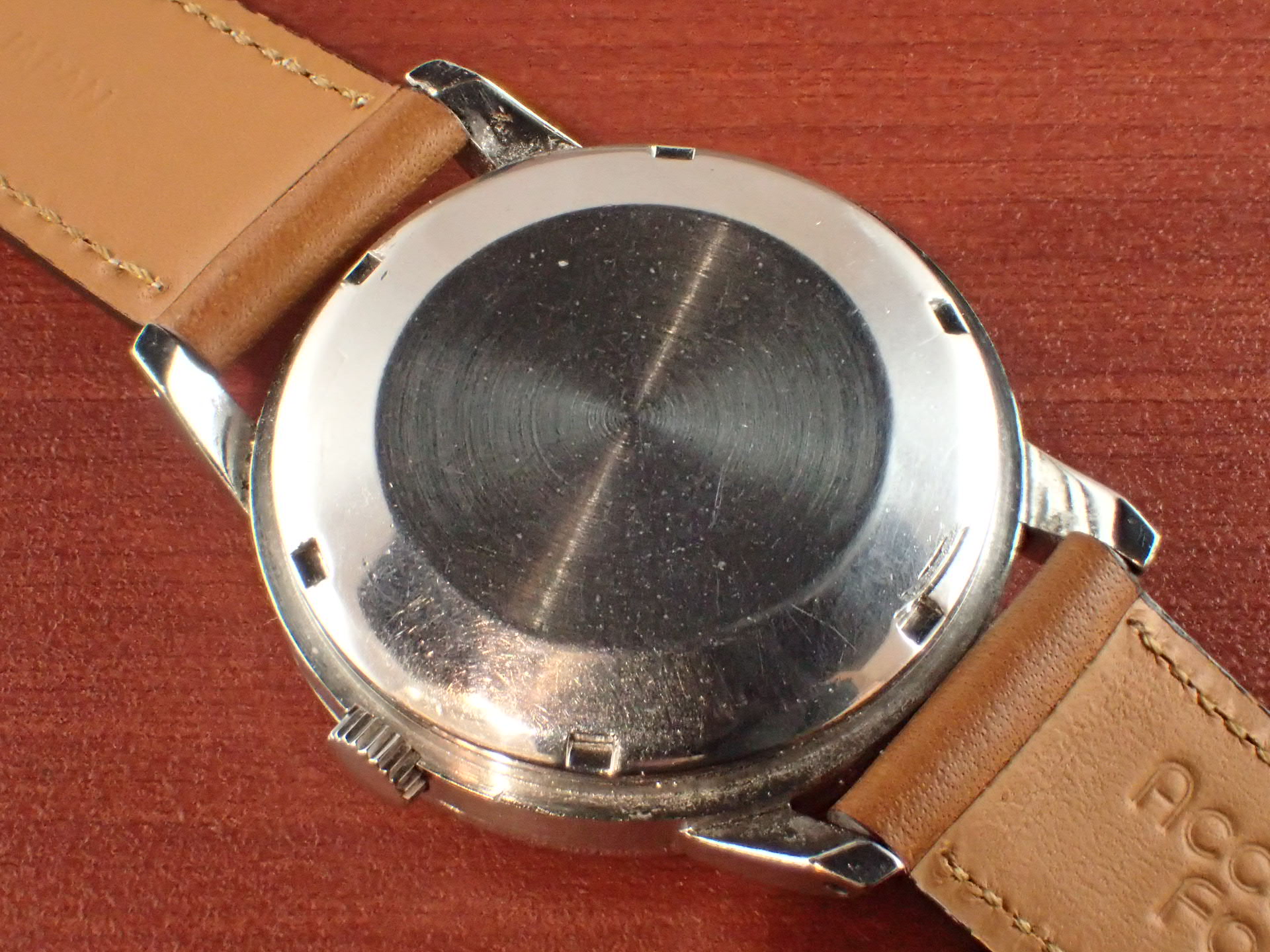 文字盤は、ツヤを残しながらも全体が均一に経年変化した唯一無二の表情です。ケースは若干のポリッシュを感じますが、痩せている感じはありません。リューズも初期に見られる魚マーク無しです。ムーブメントは、ペラトン式巻き上げ機構で、インカブロック付きのキャリバー8521を搭載しています。分解掃除済みで日差30秒程度で稼働しています。