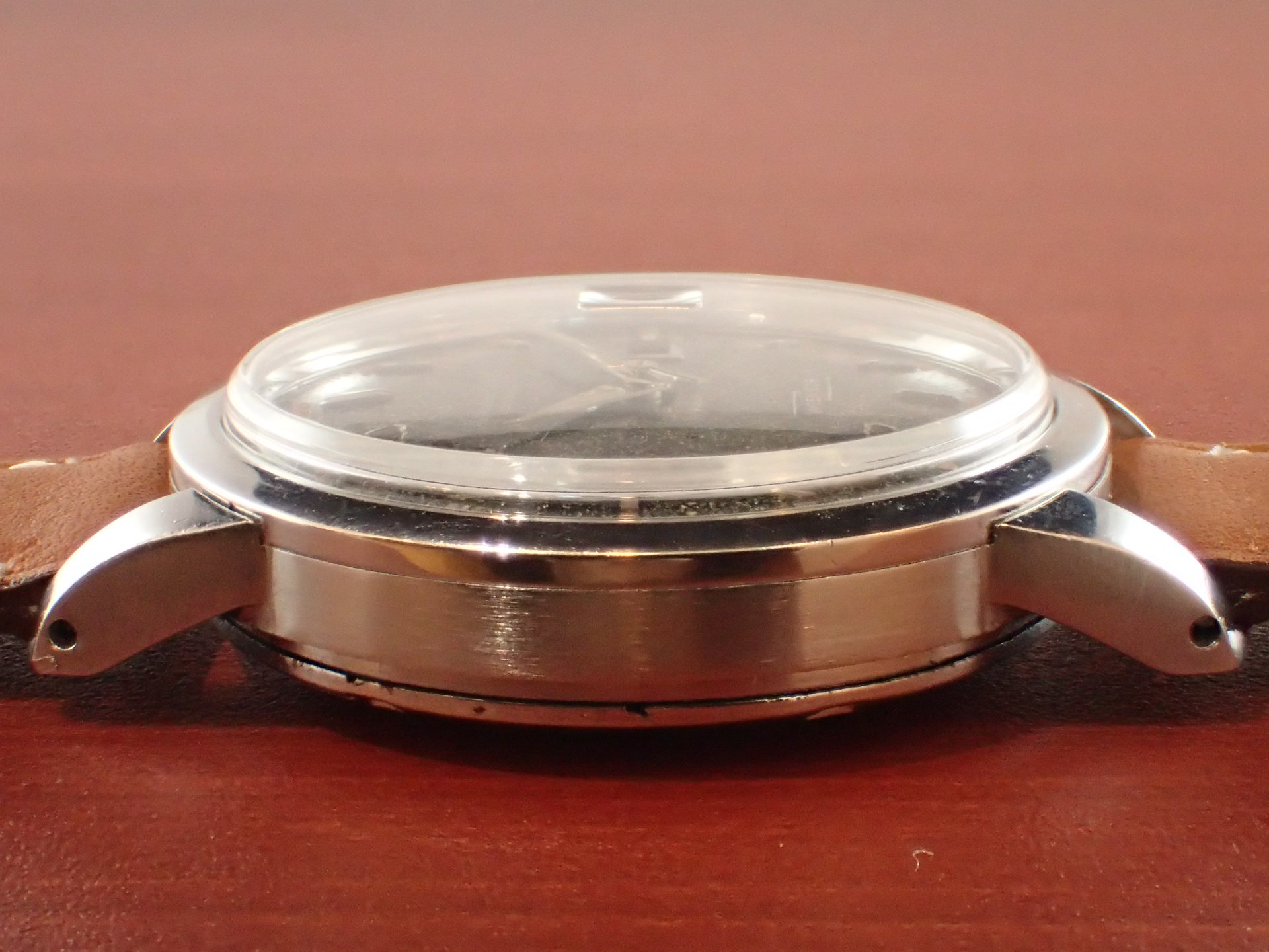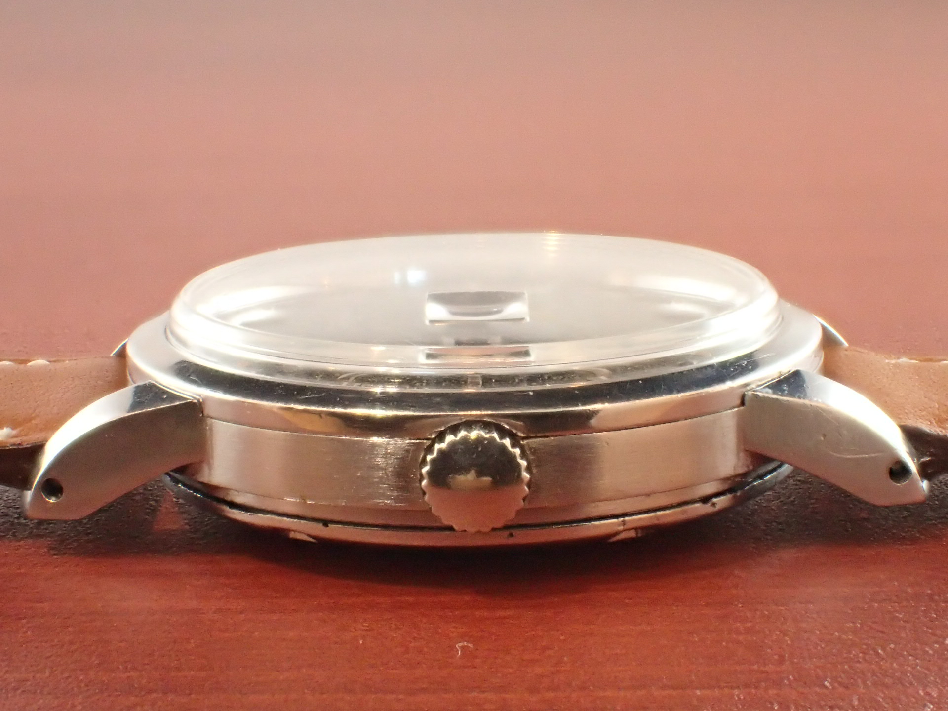 1955年に登場し、現在に至るまで継続して製造されている高い耐磁性能を有したモデル、インヂュニアです。ムーブメントがキャリバー852、853、デイト付きの8521、8531を搭載したモデルは、ファーストジェネレーションに位置づけられています。ファーストジェネレーションは1967年頃まで製造されました。この個体はキャリバー8521搭載、1955年頃の製造ですので、インヂュニア発売年の最初期という事になります。軟鉄の2重ケースにより耐磁性能を高めています。ドレス系でありながらスポーツモデルのような堅牢なつくりが魅力的です。