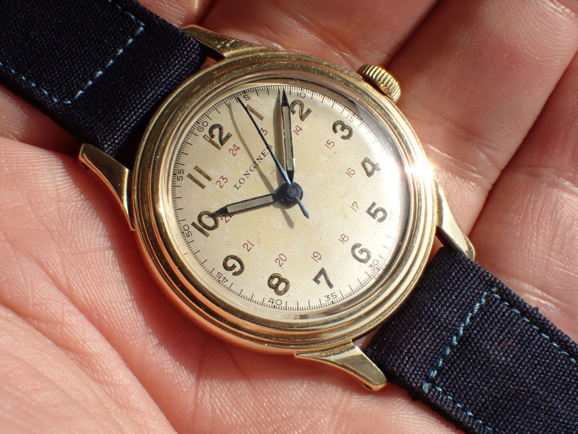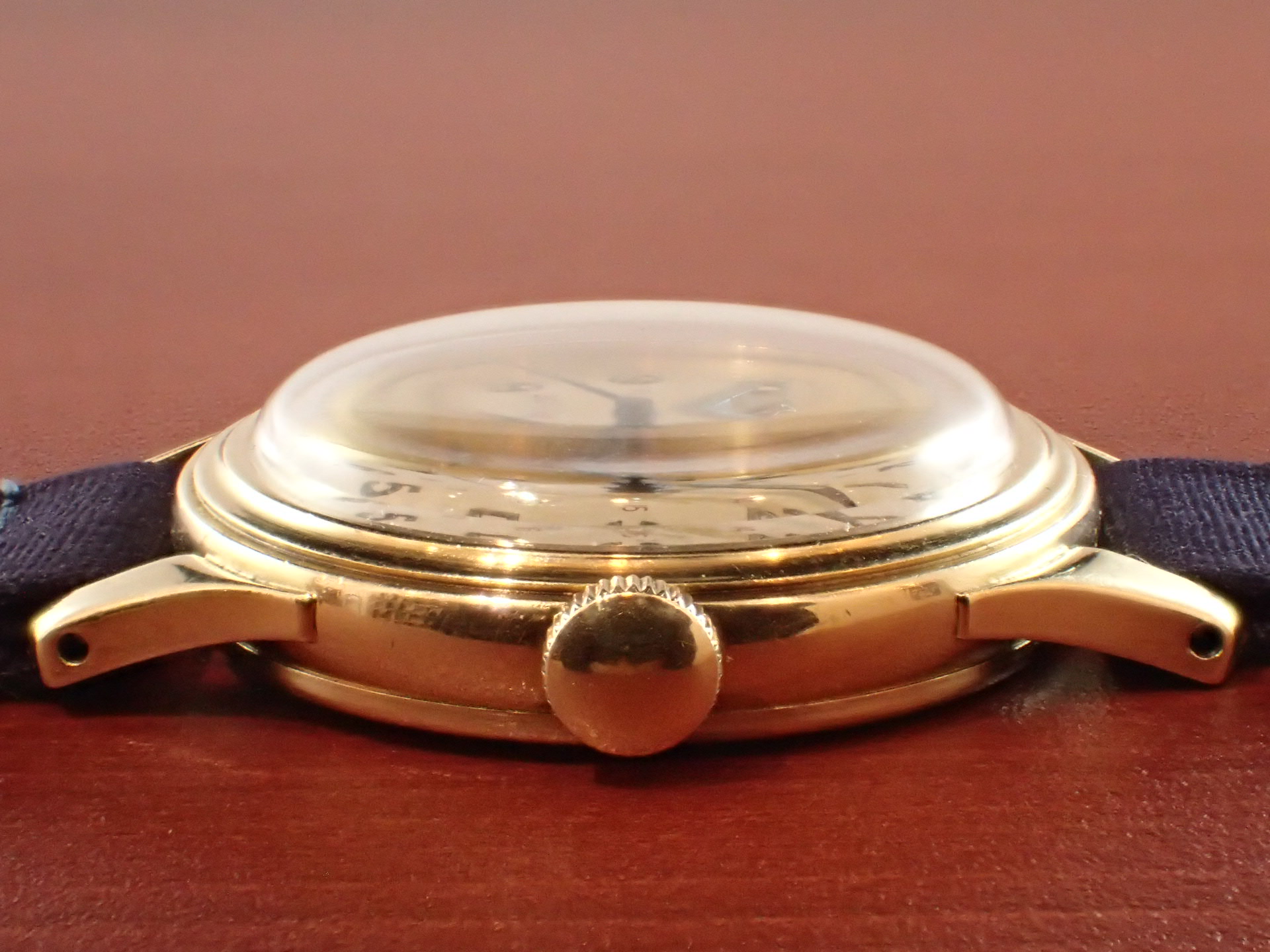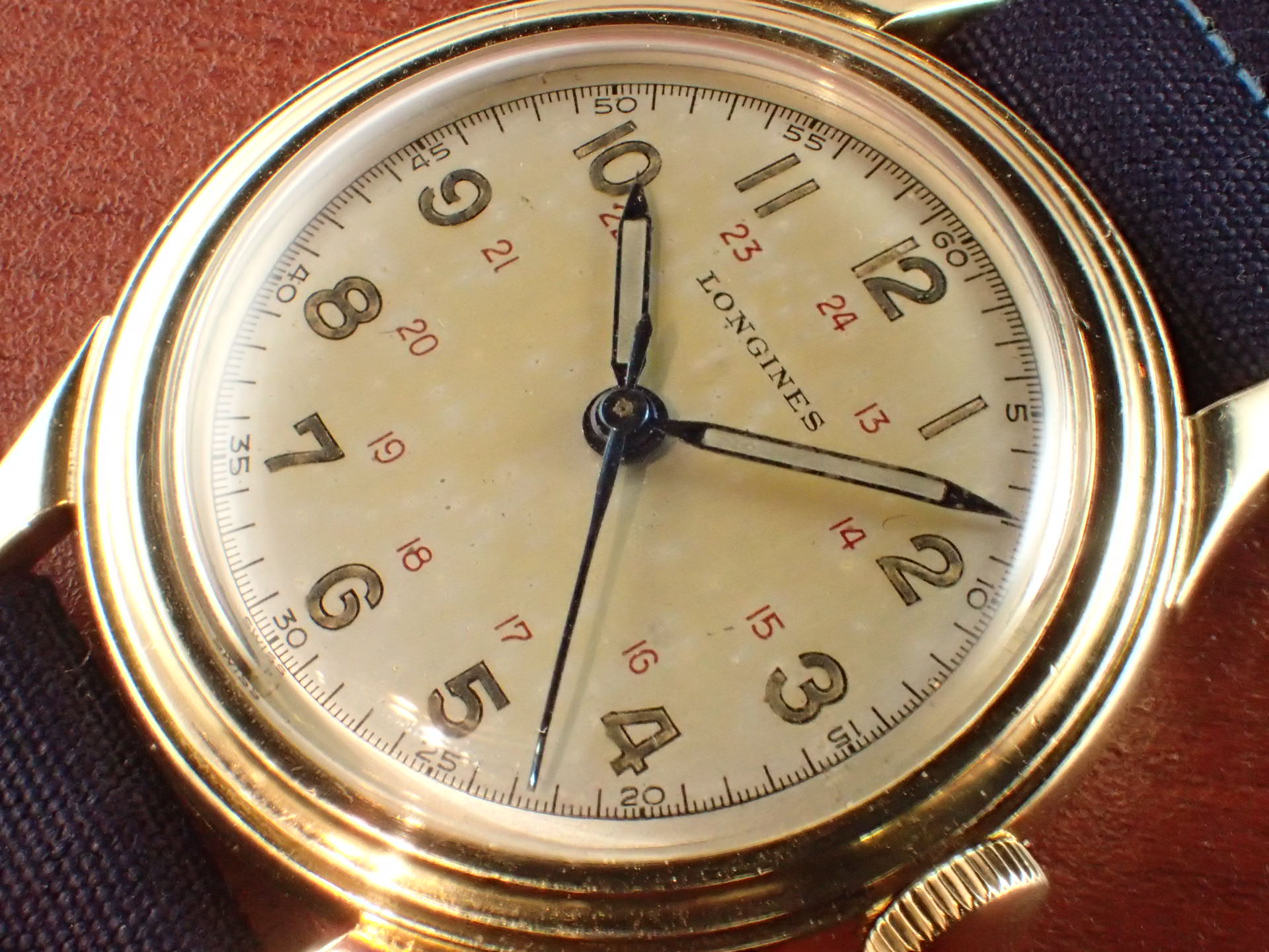 1944年にロンジンが製造した時計です。裏蓋は6つ爪の「Sei-Tacche(セイタケ)」と呼ばれるケースです。ムーブメントはやや薄型のキャリバー23Mを搭載しています。この個体は珍しい14KYGのセイタケケースと、24時間表記が入るミリタリーライクな文字盤の組み合わせが素晴らしいです。文字盤は雰囲気良く経年変化しており、目立つ傷がない良い状態を維持しています。ケースは過度な仕上げもなく、アタリの様なダメージもありません。ムーブメントは、ショックレジスティングの耐震装置付きです。分解掃除済みで日差30秒程度で稼働しています。