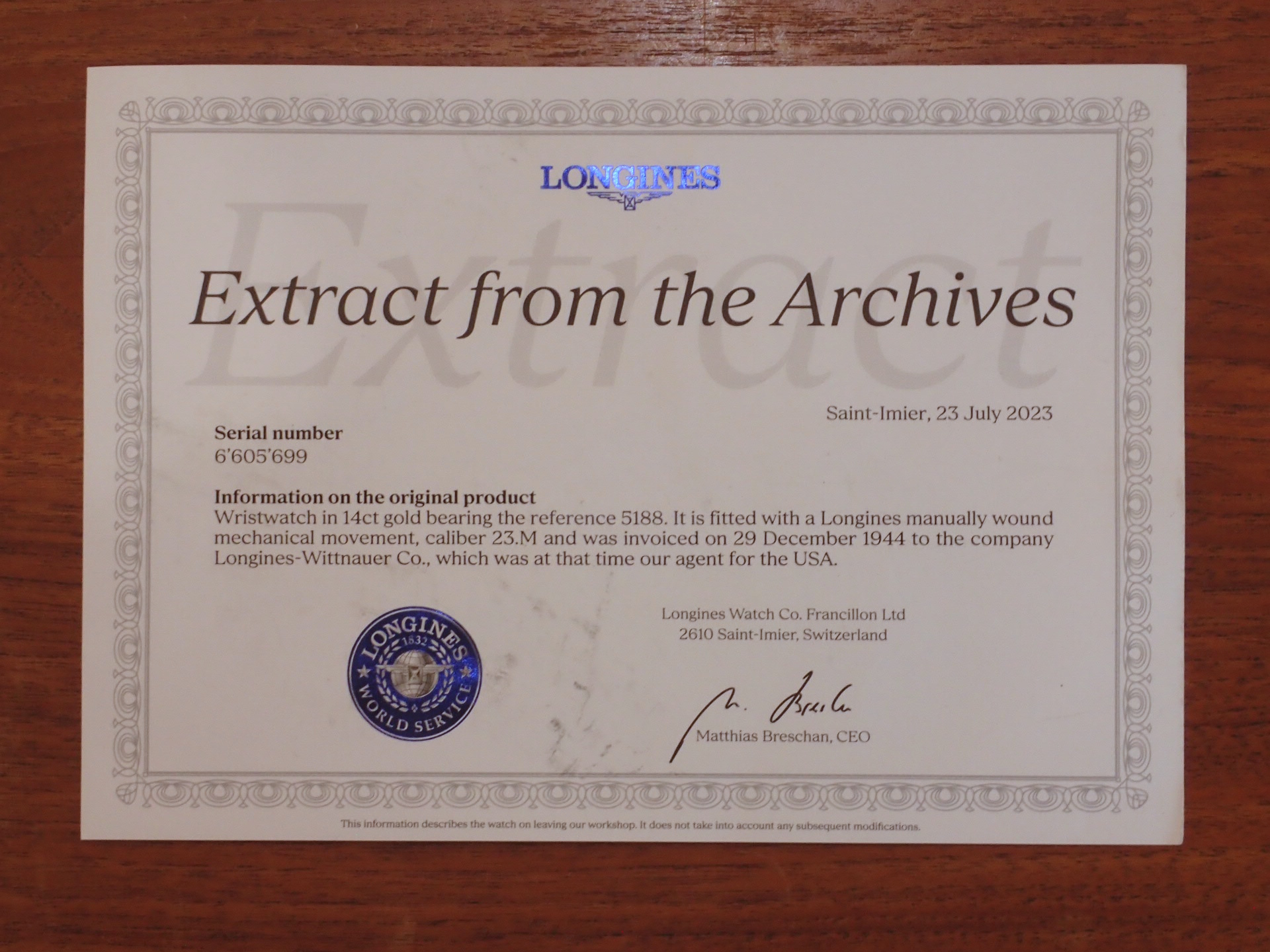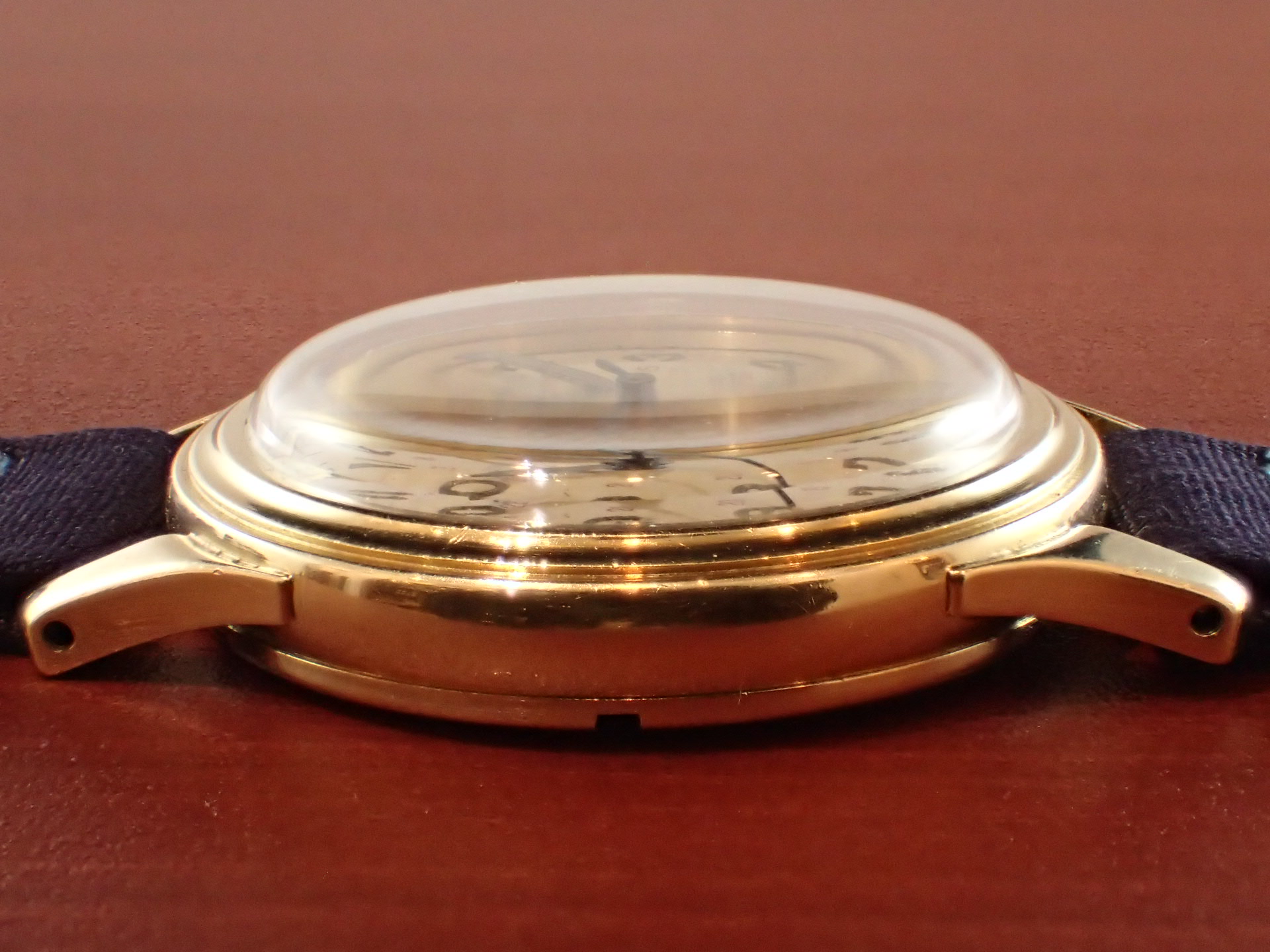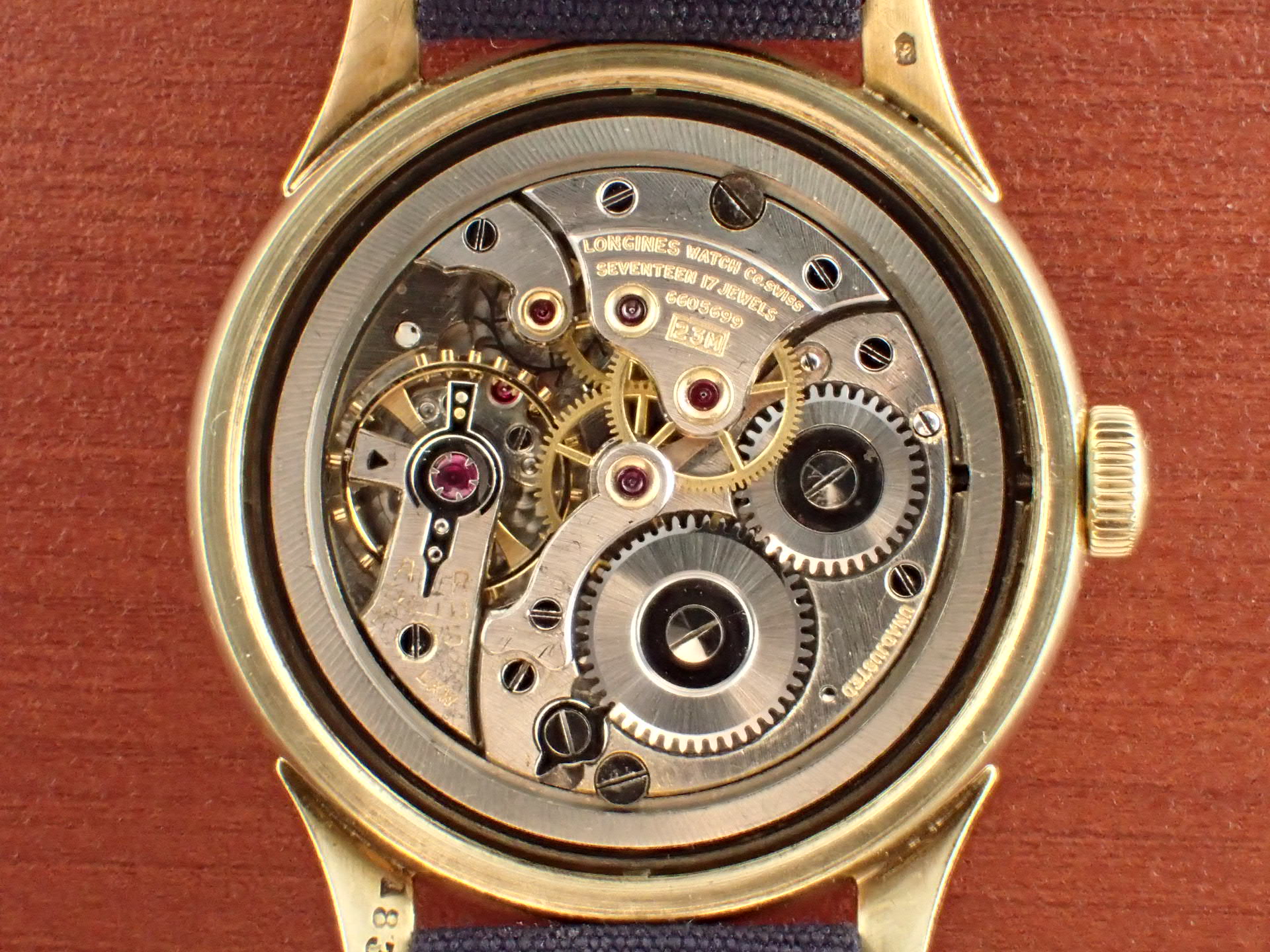 1944年にロンジンが製造した時計です。裏蓋は6つ爪の「Sei-Tacche(セイタケ)」と呼ばれるケースです。ムーブメントはやや薄型のキャリバー23Mを搭載しています。この個体は珍しい14KYGのセイタケケースと、24時間表記が入るミリタリーライクな文字盤の組み合わせが素晴らしいです。文字盤は雰囲気良く経年変化しており、目立つ傷がない良い状態を維持しています。ケースは過度な仕上げもなく、アタリの様なダメージもありません。ムーブメントは、ショックレジスティングの耐震装置付きです。分解掃除済みで日差30秒程度で稼働しています。