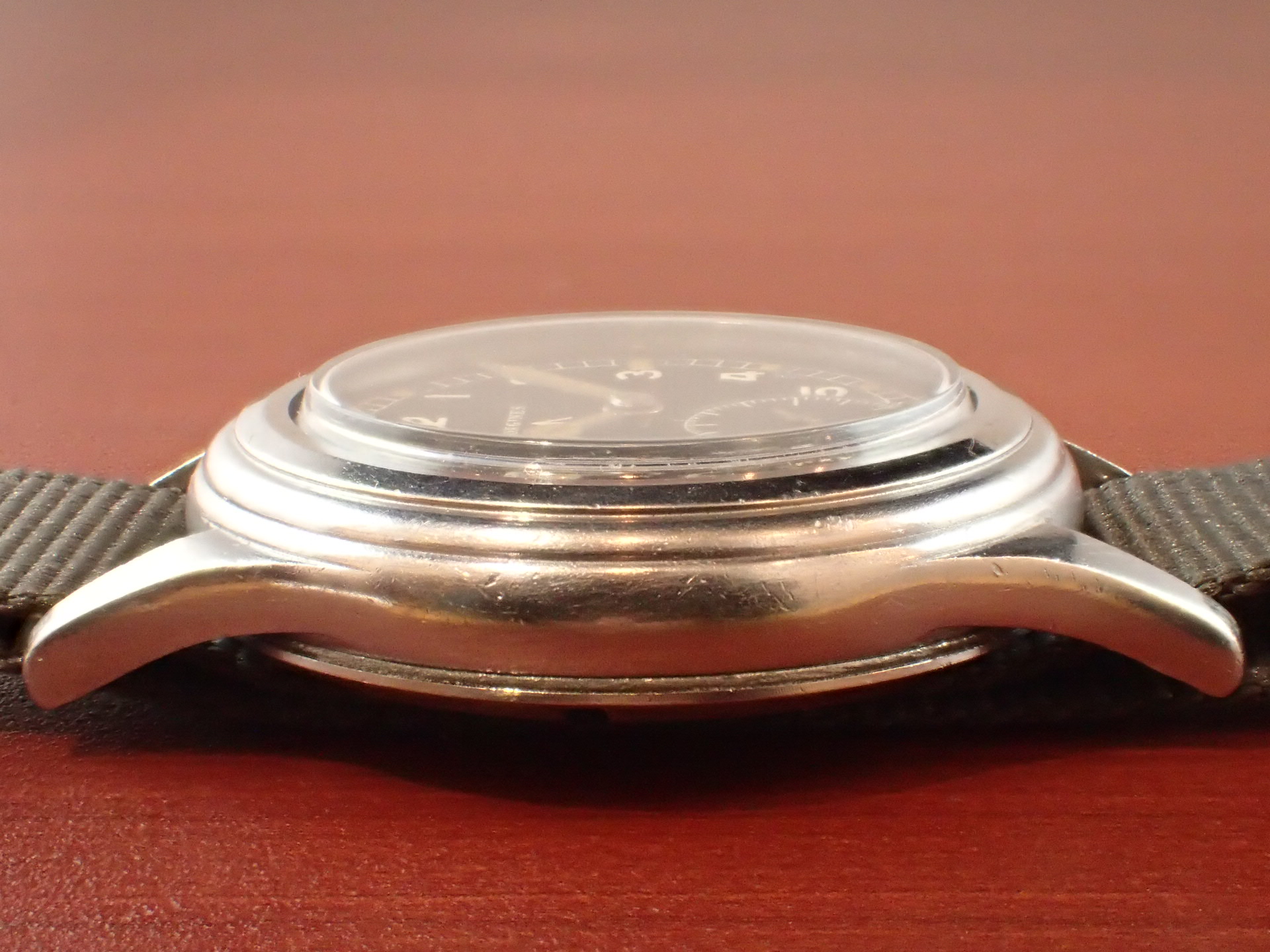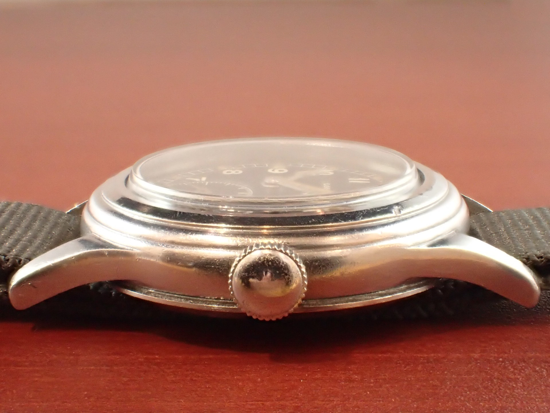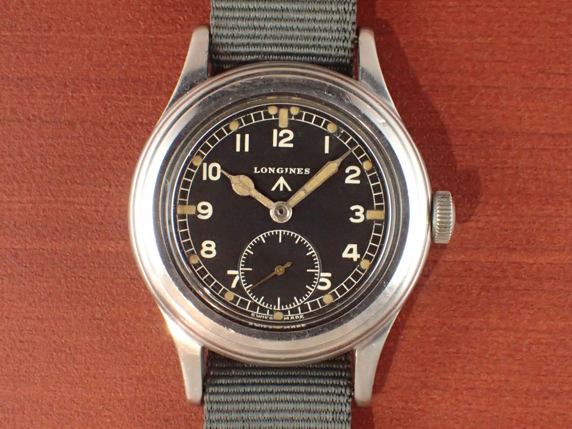 第二次世界大戦時にイギリス陸軍に納入されたW.W.W.シリーズ、通称「ダーティダース」のロンジンです。製造数は約5,000個と言われています。1950年代の初めに行われたグリーンランド遠征でイギリス陸軍部隊が使用したことから、「グリーンランダー」とも呼ばれています。大型のステンレススチールケースに耐震装置付きのムーブメント、傘型防水風防・・・・W.W.W.シリーズの中でスペックが高いのがこのロンジンです。そして、デザインがとても良いです。