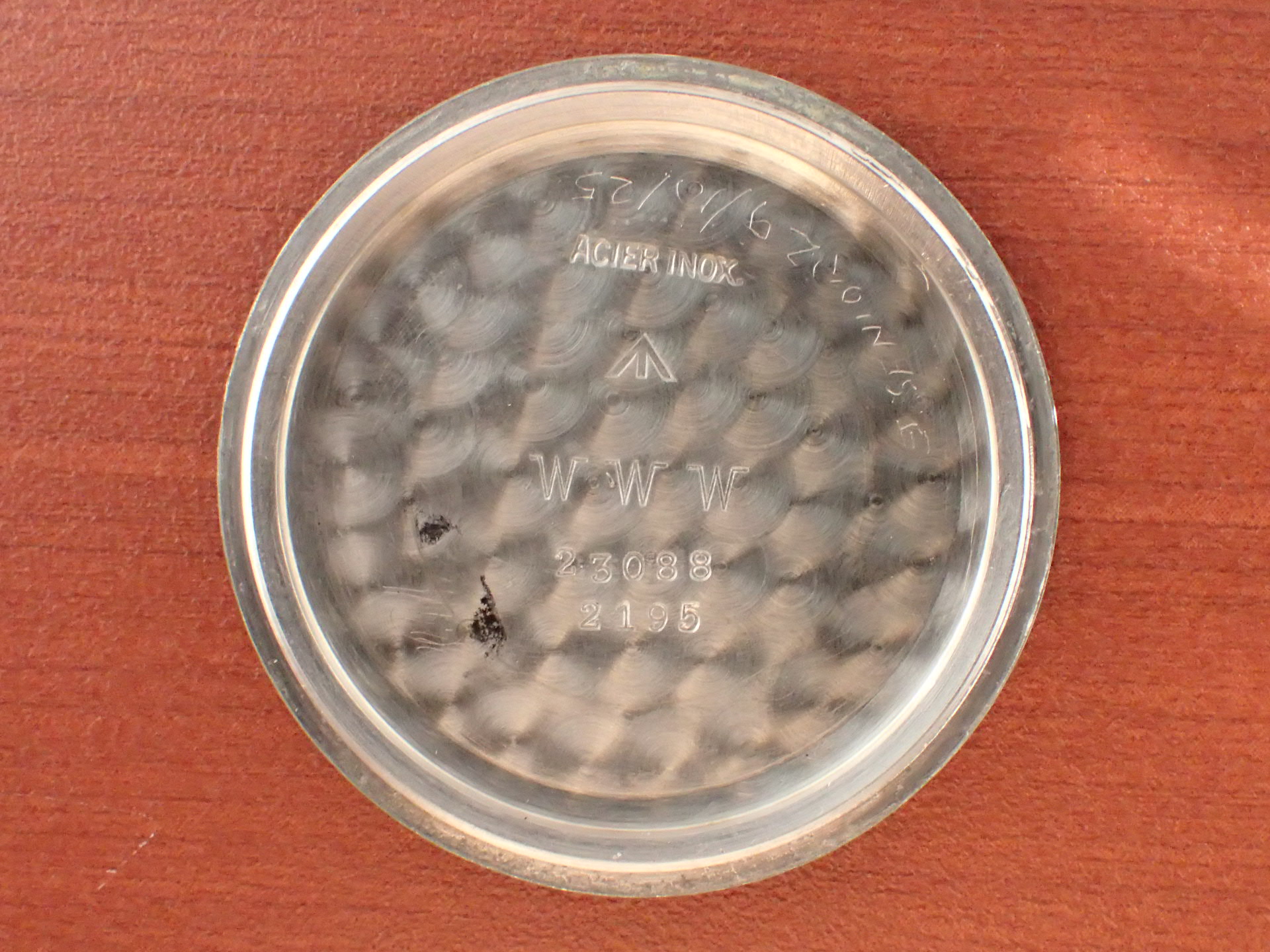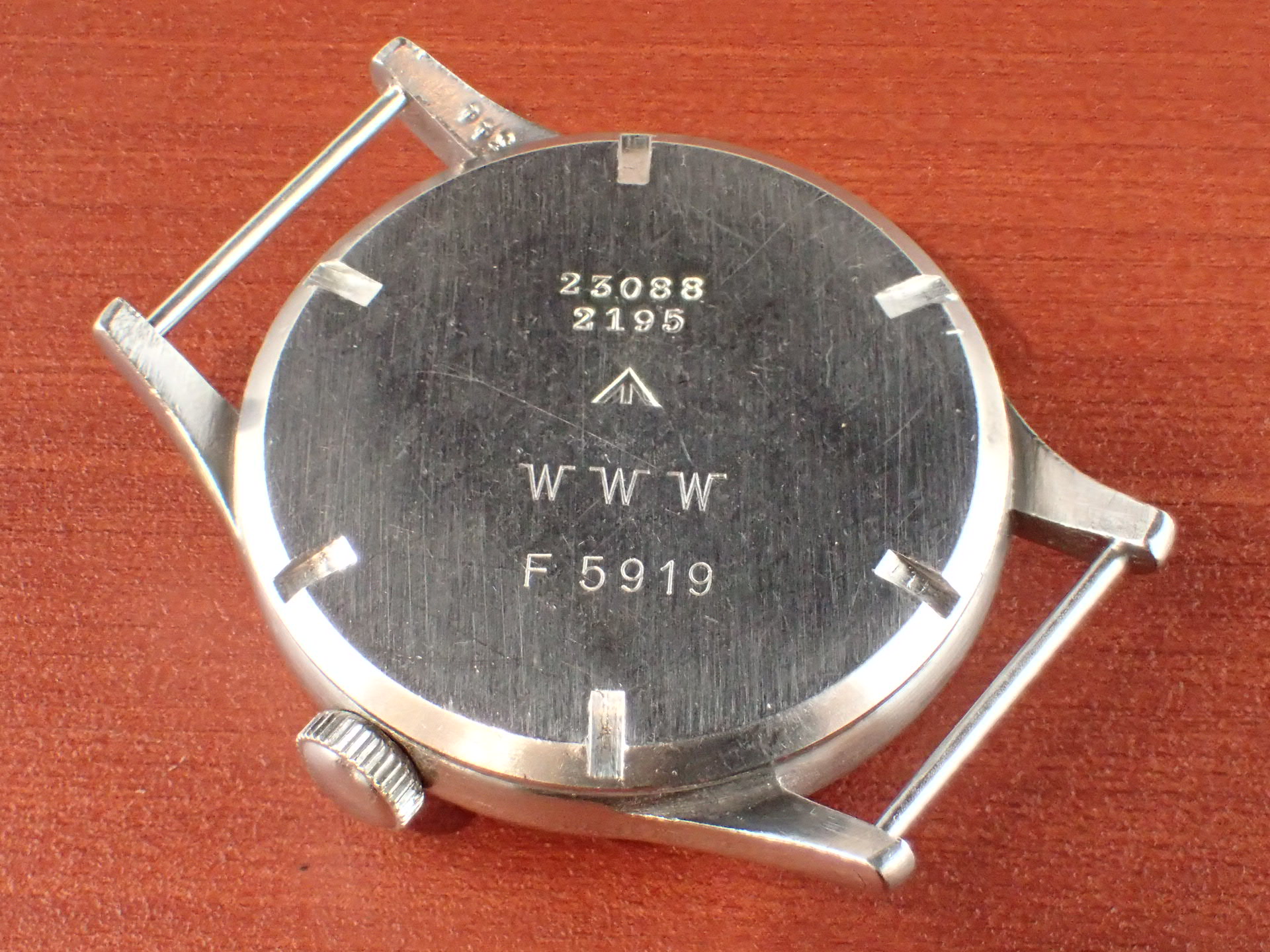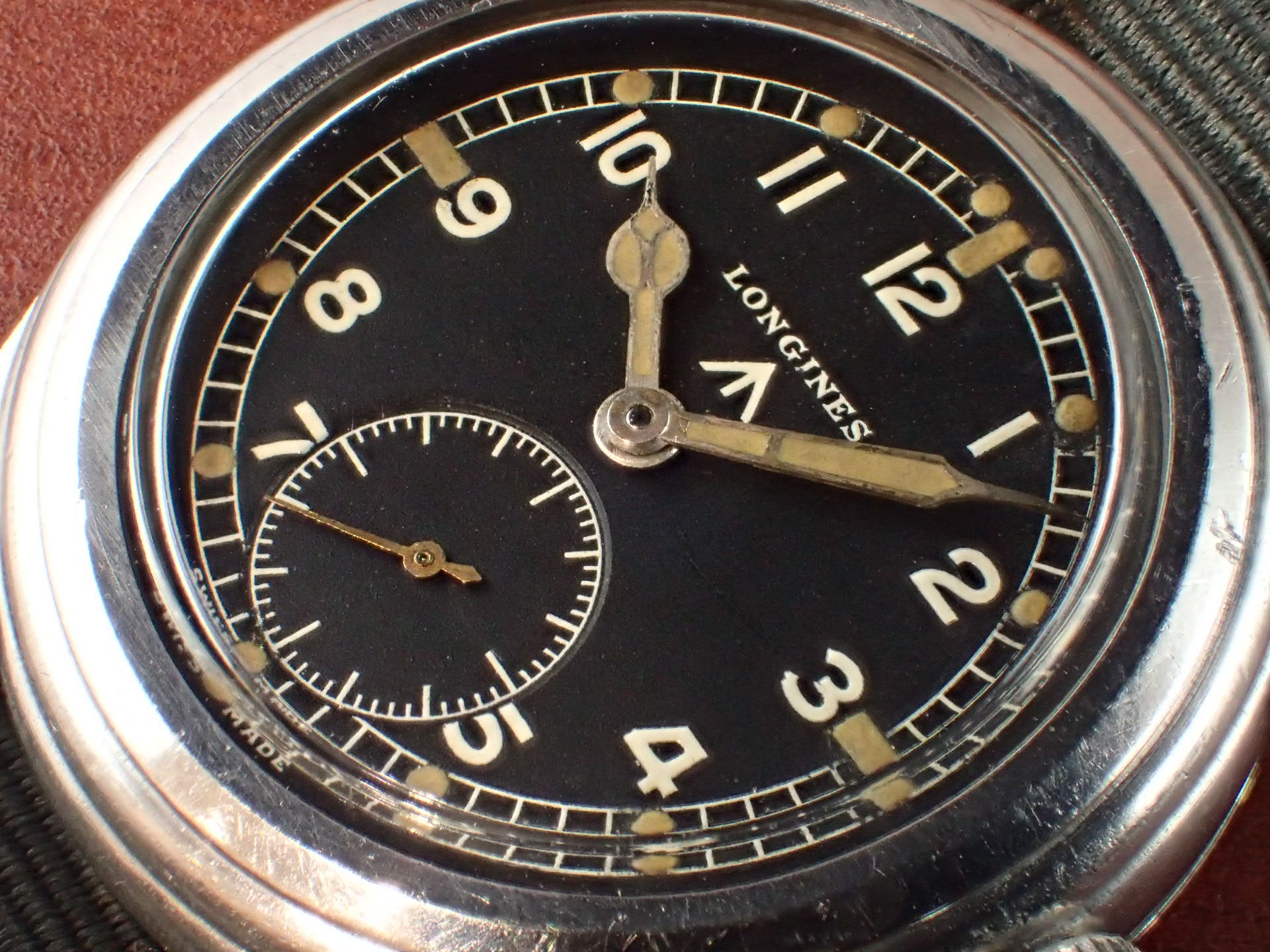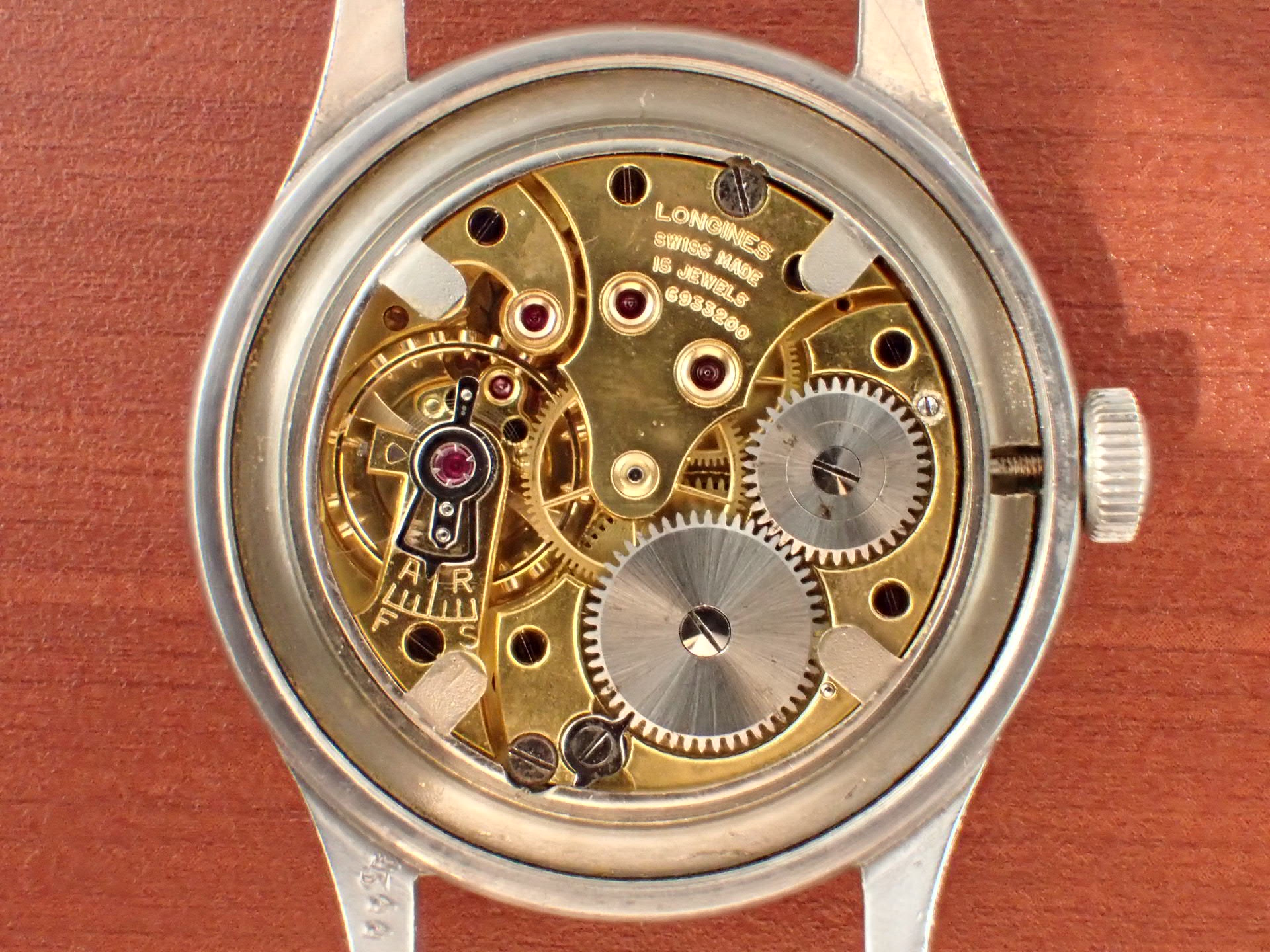 文字盤は3時の辺りにうっすらと擦れがありますが、肉眼ではさほど気にならない程度で、ホワイトプリントがしっかりと残った良い状態です。ケースは多少の小傷は見られますが、痩せている感じはなく、概ね良好な状態を維持しています。ロンジンの場合、ミドルケースラグ裏の番号と裏蓋の番号が一致することが基本ですが、このモデルの場合、イギリス軍でメンテナンスをしているため、裏蓋が入れ替わってしまうことは珍しくありません。そのような背景から、軍用時計として、このモデルは番号が一致しなくても良いという判断をしています。分解掃除済みで日差30秒程度で稼働しています。