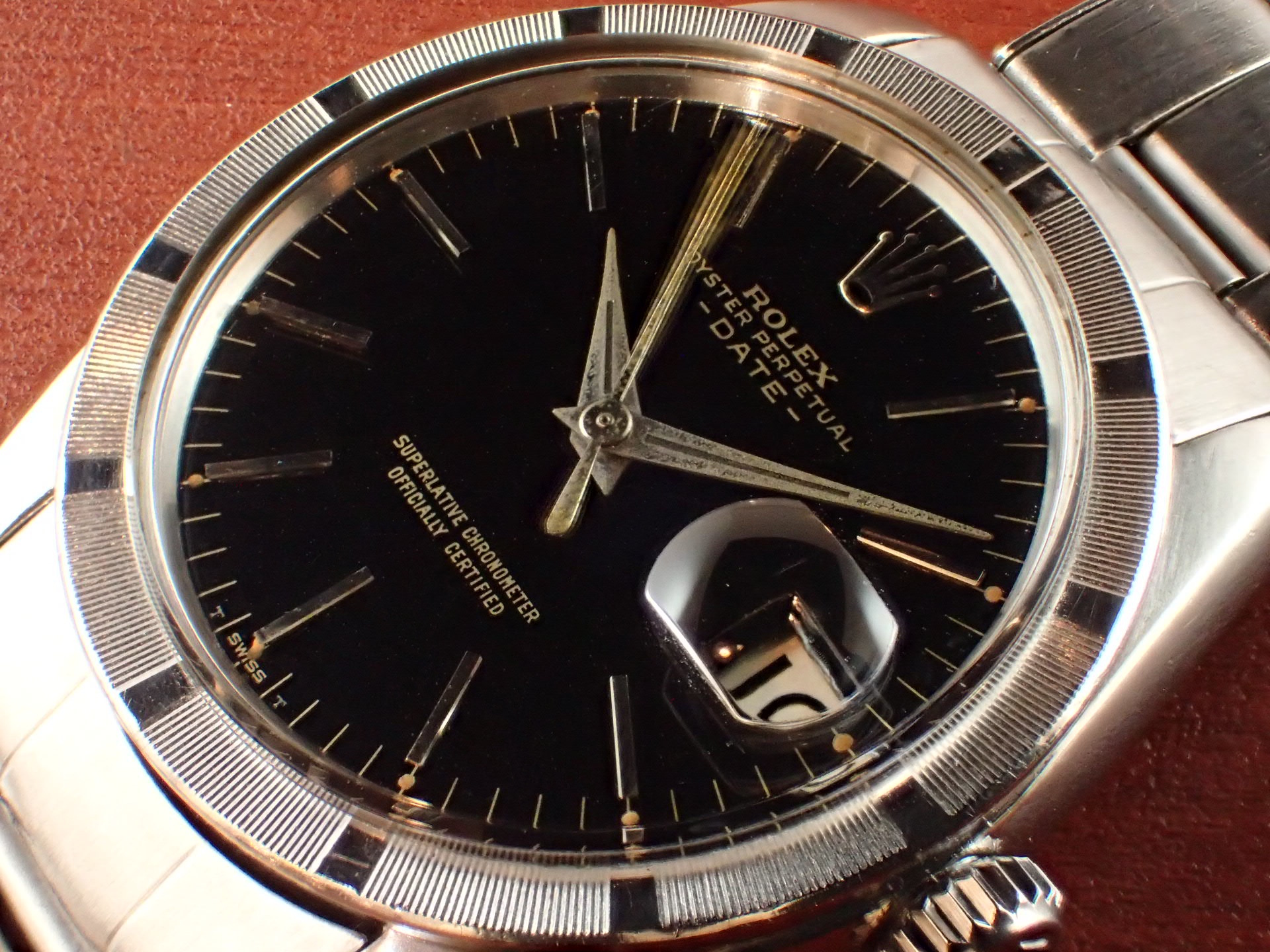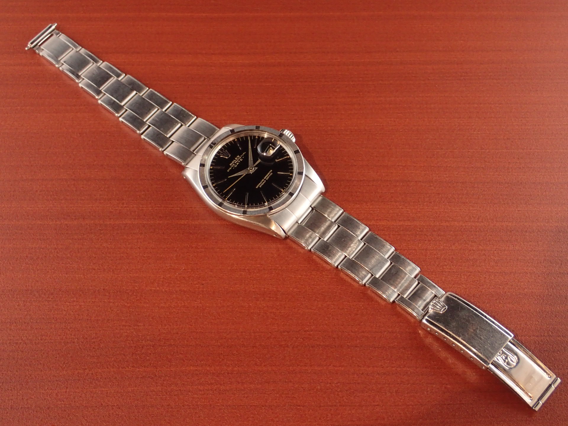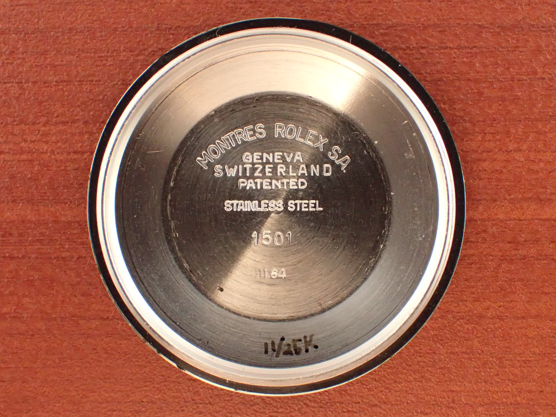 1964年に製造されたオイスターパーペチュアルデイト、Ref.1501です。ブラックミラー文字盤は経年変化やキズのない素晴らしい状態です。レターは抜き字ですが、6時のT SWISS TのTのみプリントになっています。これは64年以前のシングルスイス表記の文字盤に、Tを後からプリントした為です。秒針はメッキが薄くなっていますが、下地の金色が出た良い雰囲気になっています。ケースは少々の小傷がありますが、目立つ大きな傷はなく、概ね良好な状態です。ブレスレットは64年3期のリベットブレス(7x5コマ)です。小傷はありますが、伸びも比較的少ない状態です。手首周り18cmの方まで装着可能です。分解掃除済みで日差30秒程度で稼働しています。