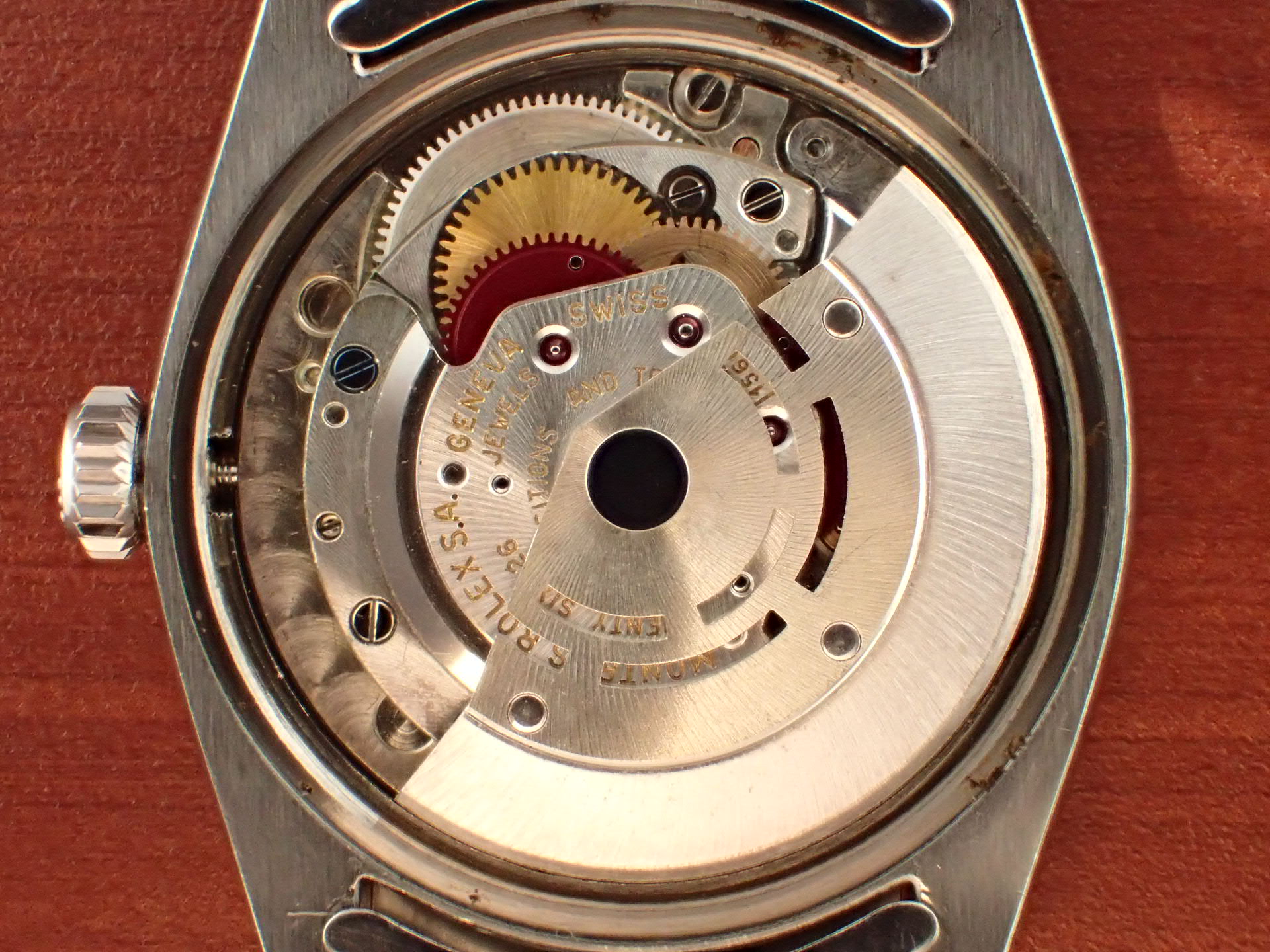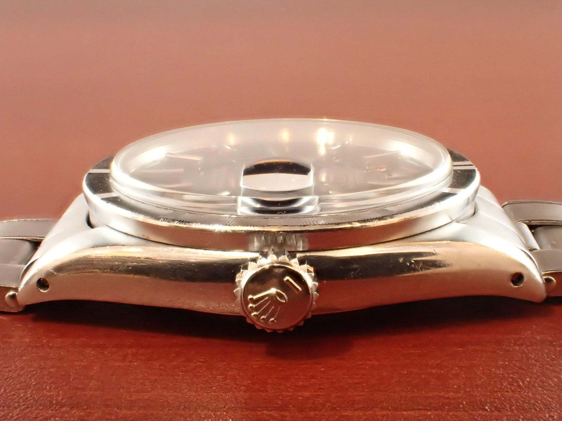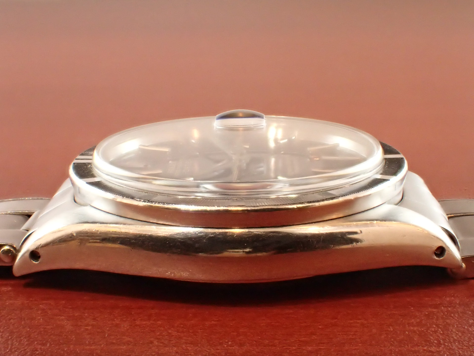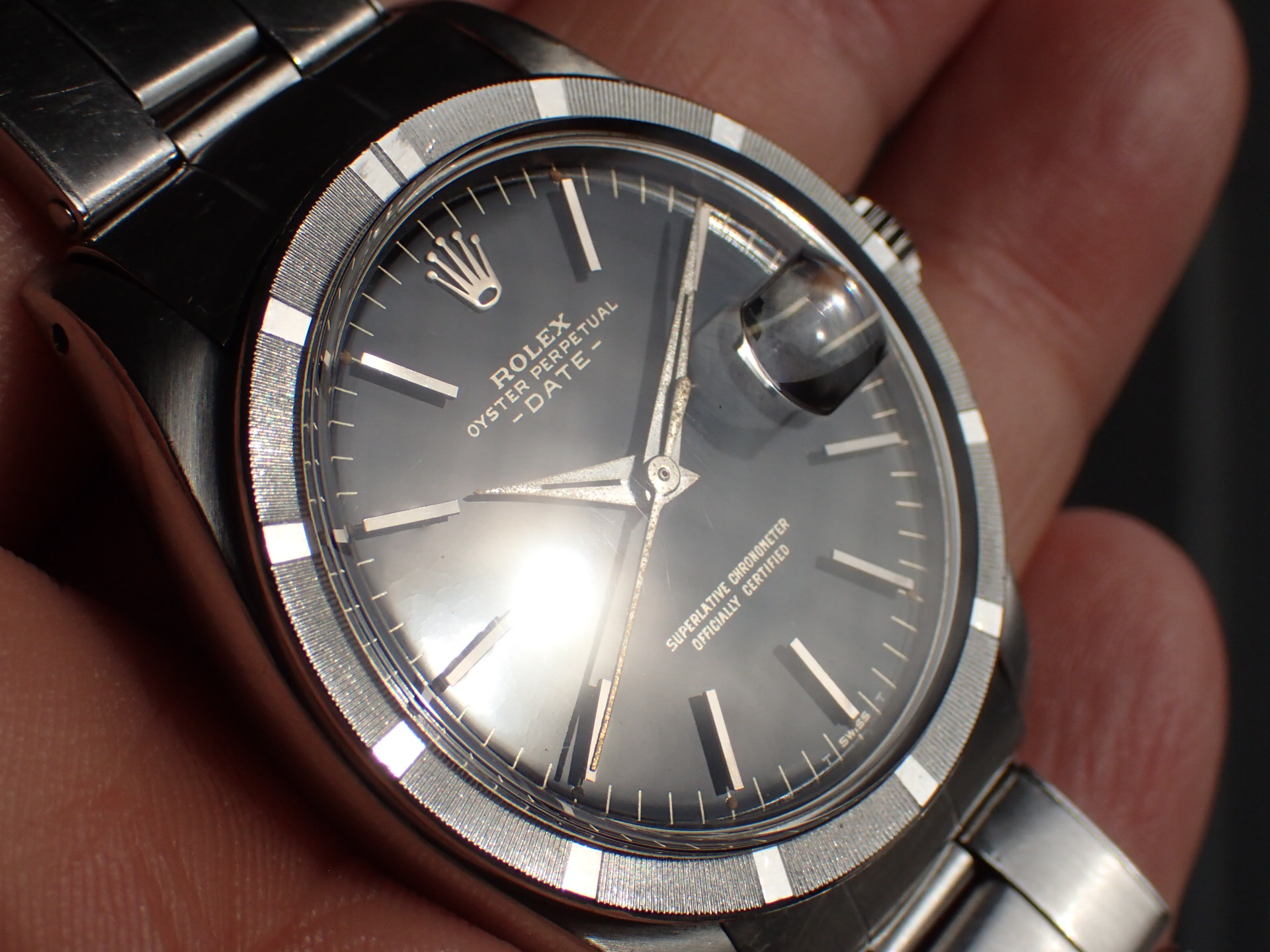 1964年に製造されたオイスターパーペチュアルデイト、Ref.1501です。ブラックミラー文字盤は経年変化やキズのない素晴らしい状態です。レターは抜き字ですが、6時のT SWISS TのTのみプリントになっています。これは64年以前のシングルスイス表記の文字盤に、Tを後からプリントした為です。秒針はメッキが薄くなっていますが、下地の金色が出た良い雰囲気になっています。ケースは少々の小傷がありますが、目立つ大きな傷はなく、概ね良好な状態です。ブレスレットは64年3期のリベットブレス(7x5コマ)です。小傷はありますが、伸びも比較的少ない状態です。手首周り18cmの方まで装着可能です。分解掃除済みで日差30秒程度で稼働しています。