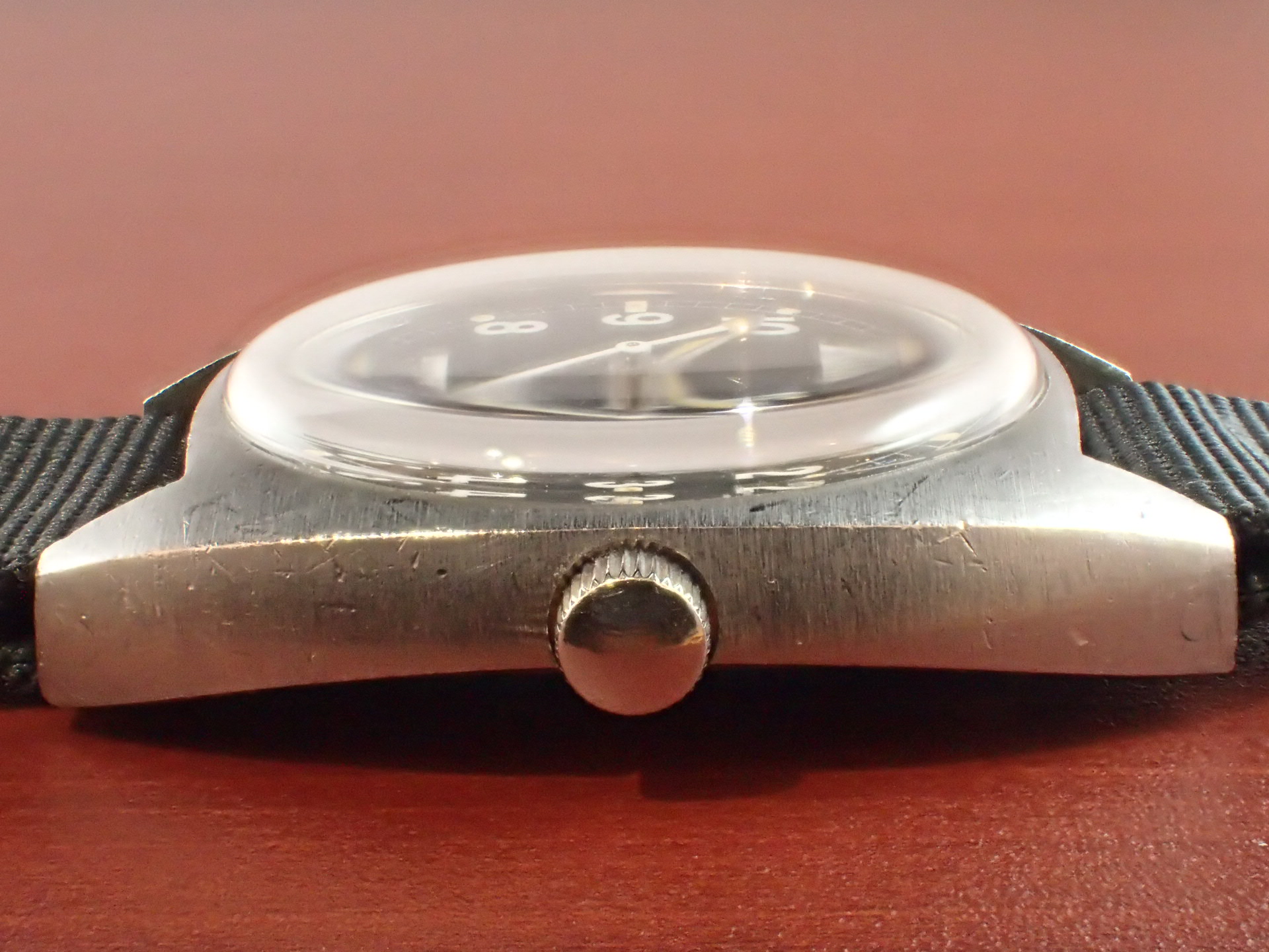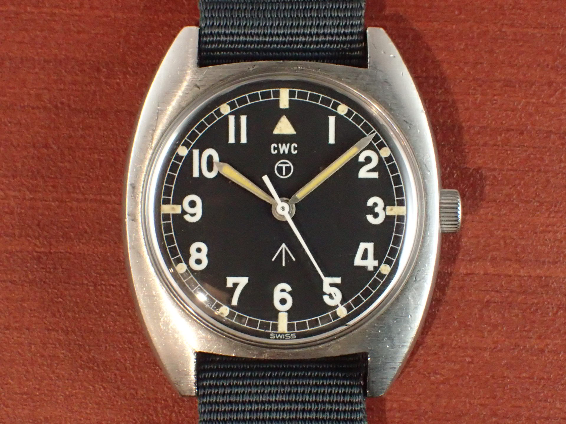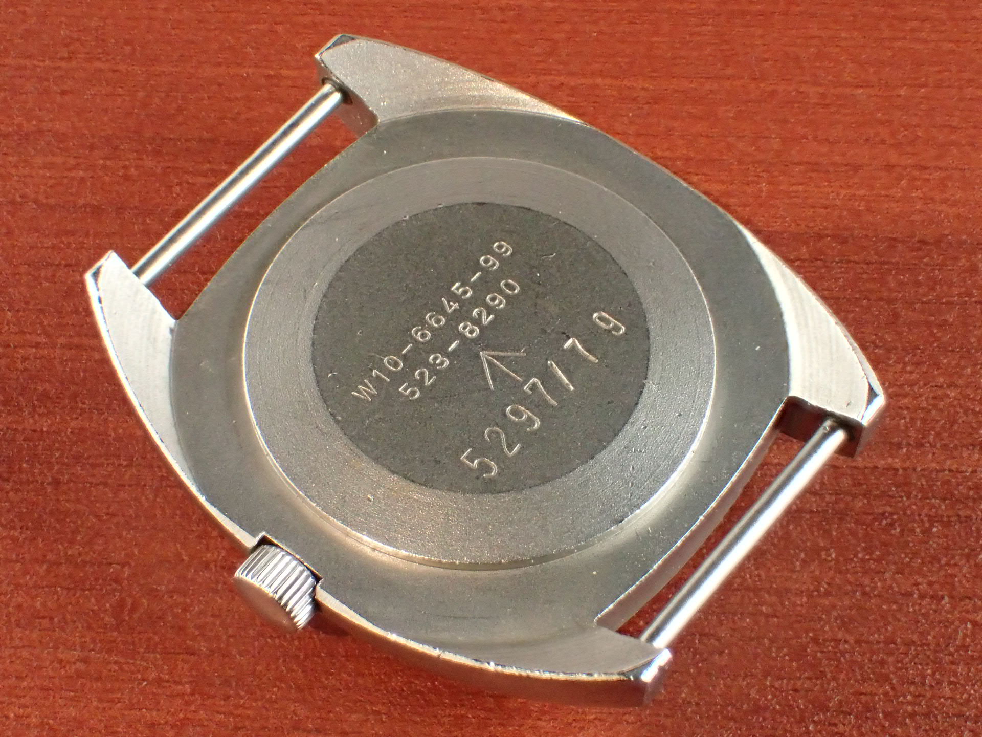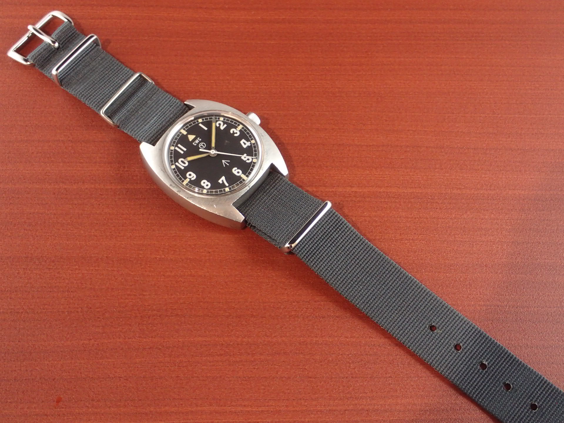 1972年から1980年までイギリス陸軍に支給されたトノーケースのモデルで、こちらはCWC(カボット・ウォッチ・カンパニー)が製造したものです。1975年まではハミルトンが製造し、1976年以降はCWCが担当しました。1980年になるとクオーツタイプの「G10」が登場し、その後のモデルはすべてクオーツに替わりました。ステンレスの塊をくり貫いて成形したワンピースケースに防水型テンション風防で防水性を高め、ムーブメントにはインカブロックの耐震装置が装備されていますので、スペック的に日常気兼ねなく使用できると思います。文字盤は特に気になるような傷や汚れはなく、綺麗な状態です。ケースは多少の小傷がありますが、概ね良好な状態です。ベルト取付部はパリス管(はめ殺し)です。分解掃除済みで日差30秒程度で稼働しています。