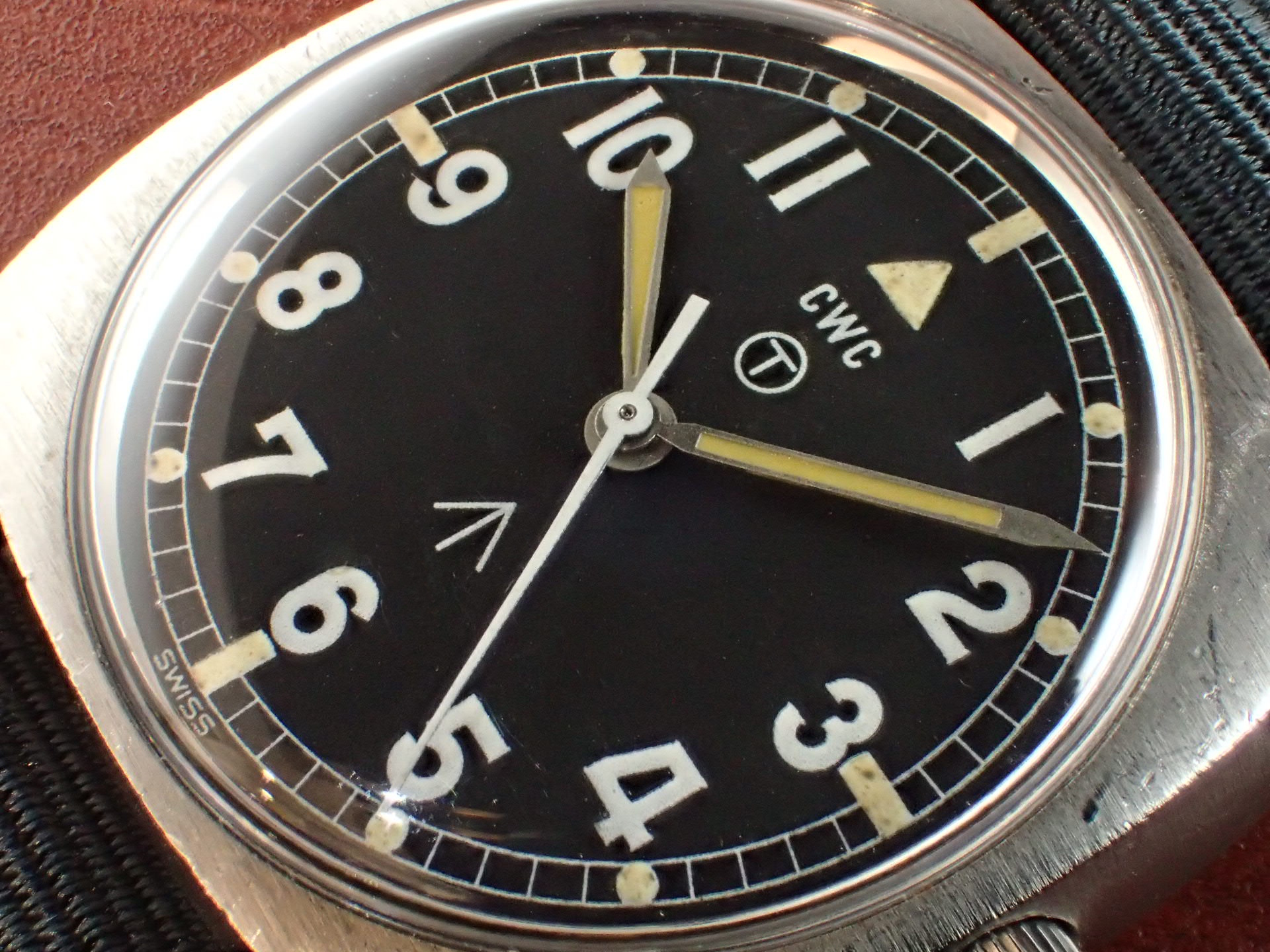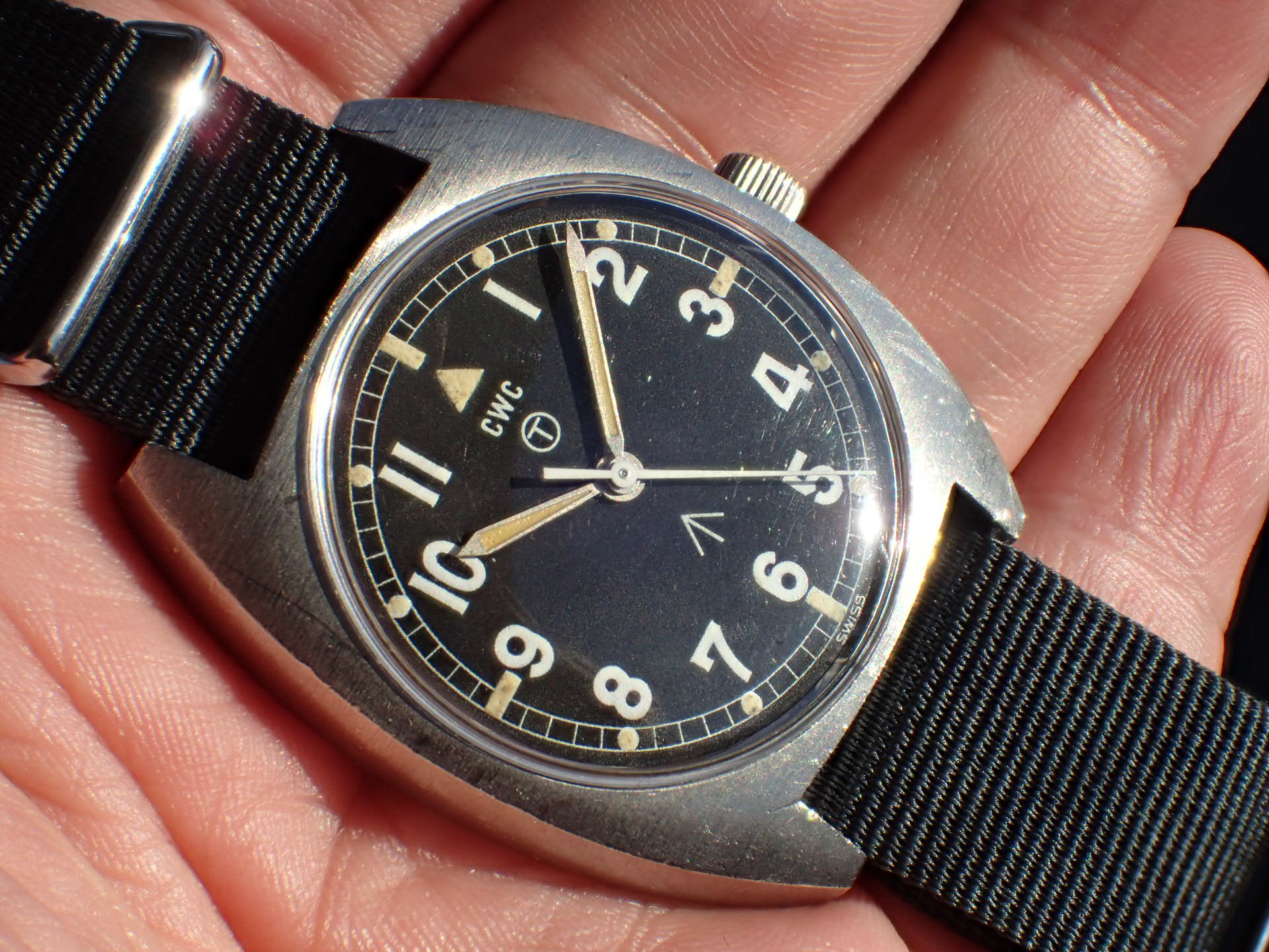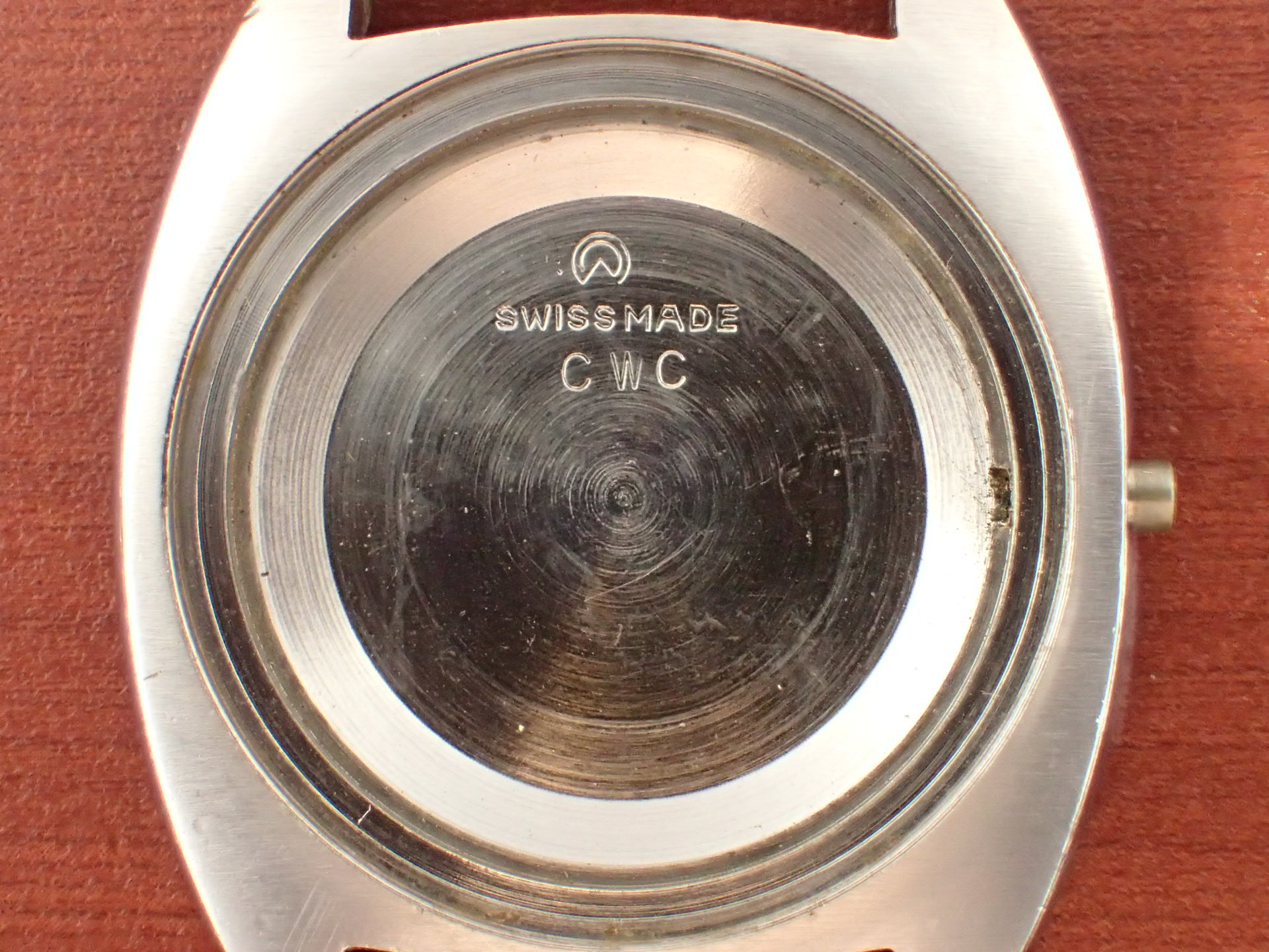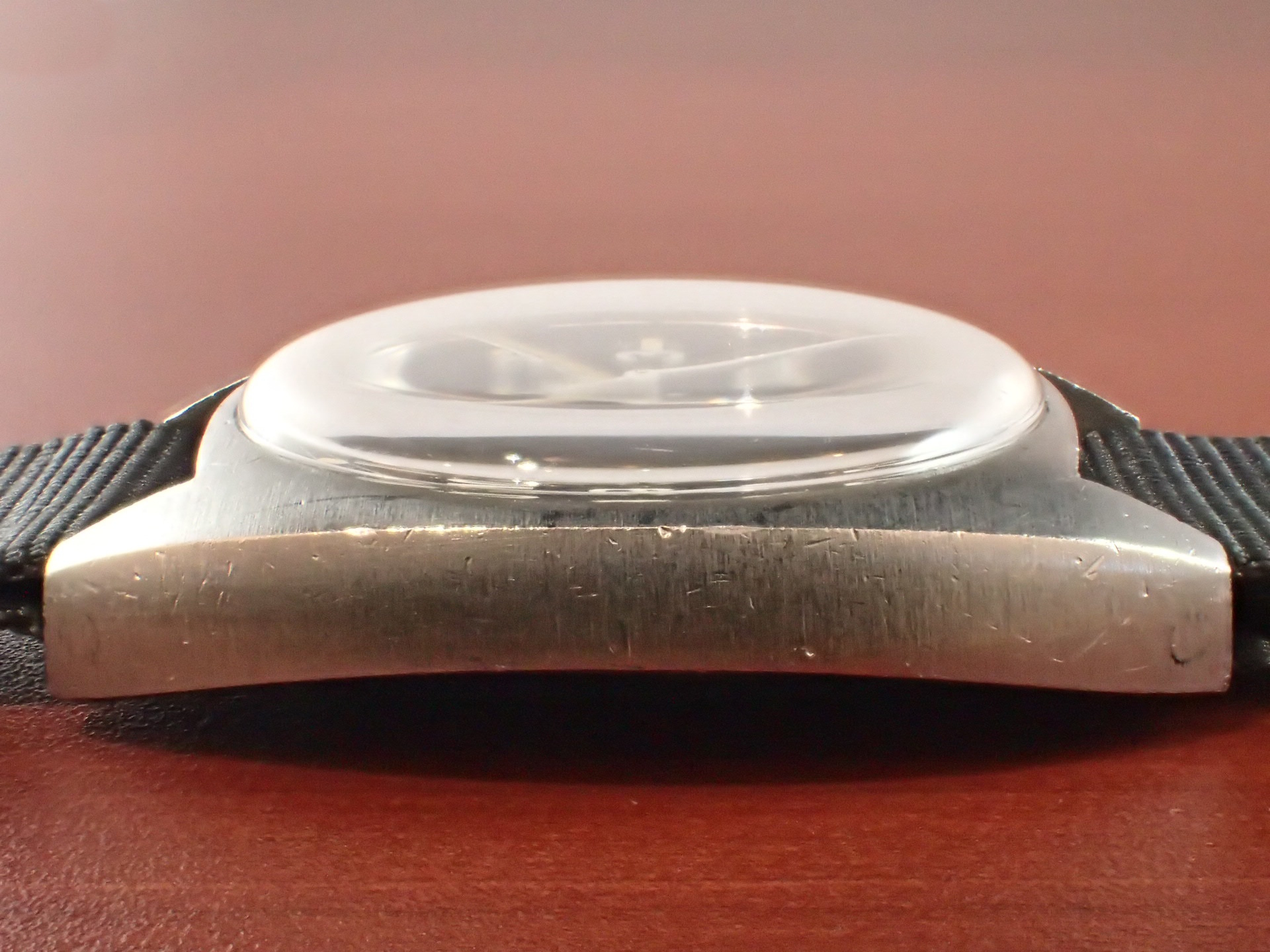 1972年から1980年までイギリス陸軍に支給されたトノーケースのモデルで、こちらはCWC(カボット・ウォッチ・カンパニー)が製造したものです。1975年まではハミルトンが製造し、1976年以降はCWCが担当しました。1980年になるとクオーツタイプの「G10」が登場し、その後のモデルはすべてクオーツに替わりました。ステンレスの塊をくり貫いて成形したワンピースケースに防水型テンション風防で防水性を高め、ムーブメントにはインカブロックの耐震装置が装備されていますので、スペック的に日常気兼ねなく使用できると思います。文字盤は特に気になるような傷や汚れはなく、綺麗な状態です。ケースは多少の小傷がありますが、概ね良好な状態です。ベルト取付部はパリス管(はめ殺し)です。分解掃除済みで日差30秒程度で稼働しています。
