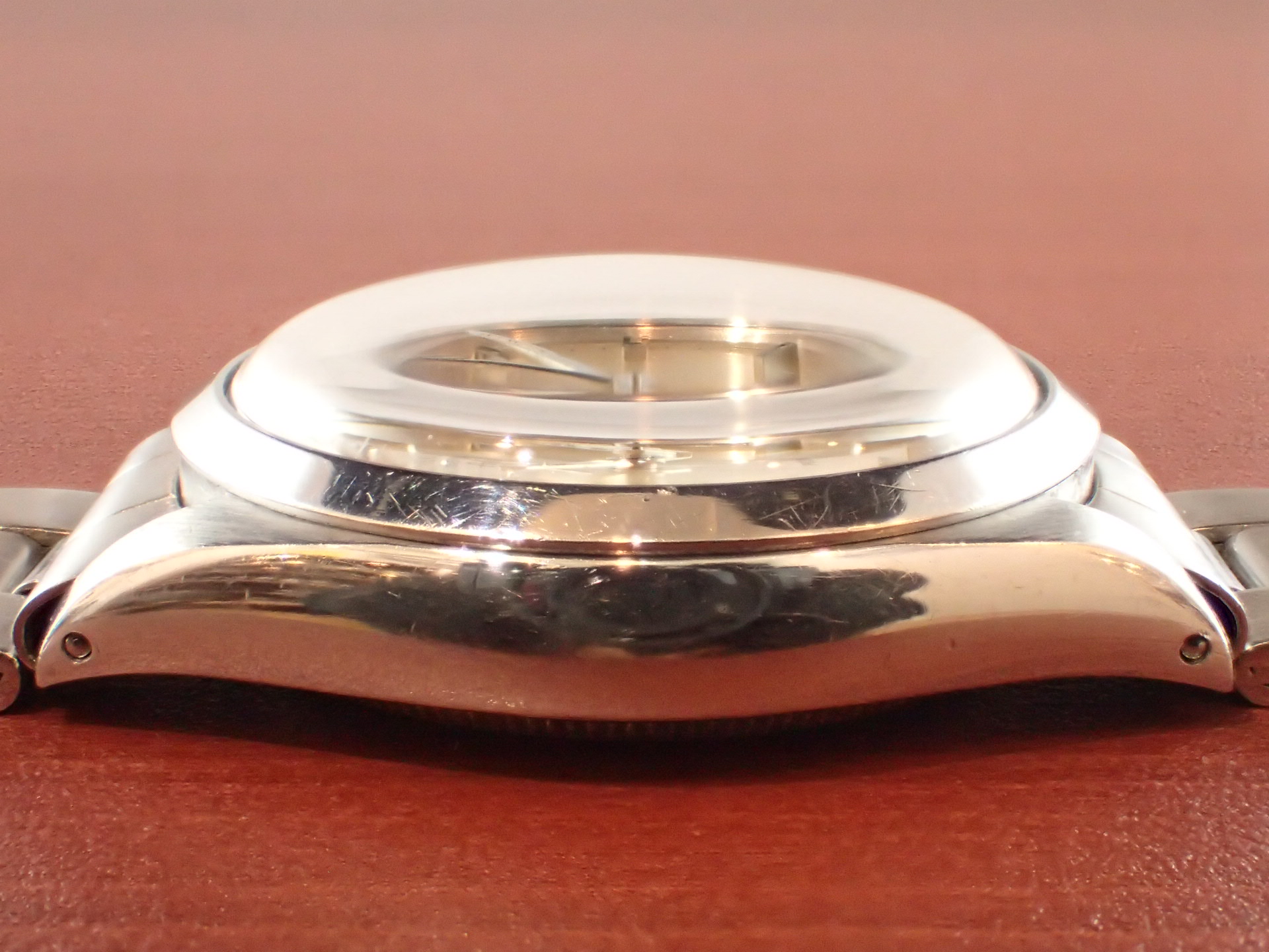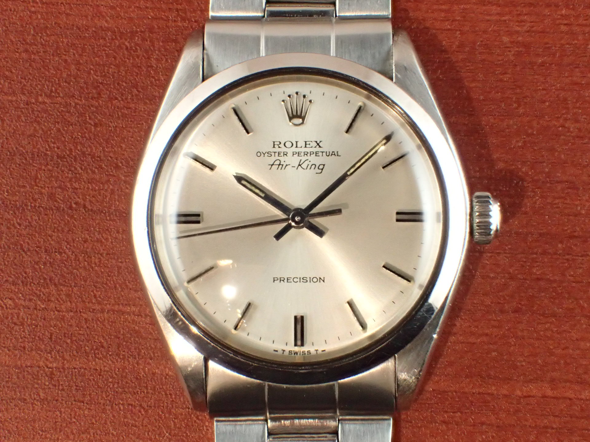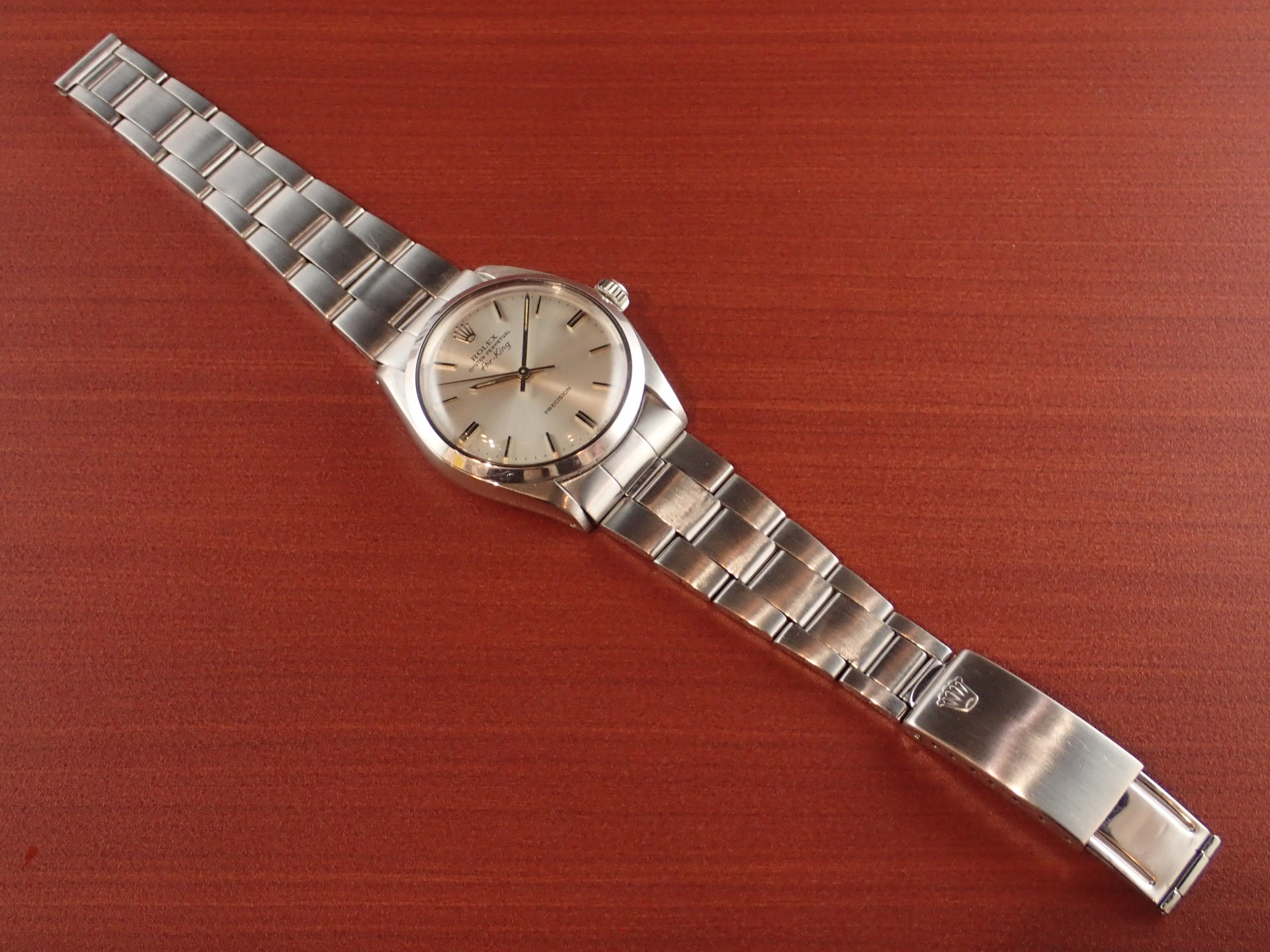 1970年代に製造されたエアキング、Ref.5500です。文字盤はサンバースト仕上げのシルバーにブラックレターです。目立つような汚れはなく、綺麗な状態です。針のメッキもダメージが少なく良い状態です。ケースは全体に小傷がありますが、痩せは感じません。ブレスレットは、巻きブレスが装着されています。若干の伸びはありますが、使用に問題はありません。12コマで手首周り18cmの方まで対応可能です。分解掃除済みで日差30秒程度で稼働しています。