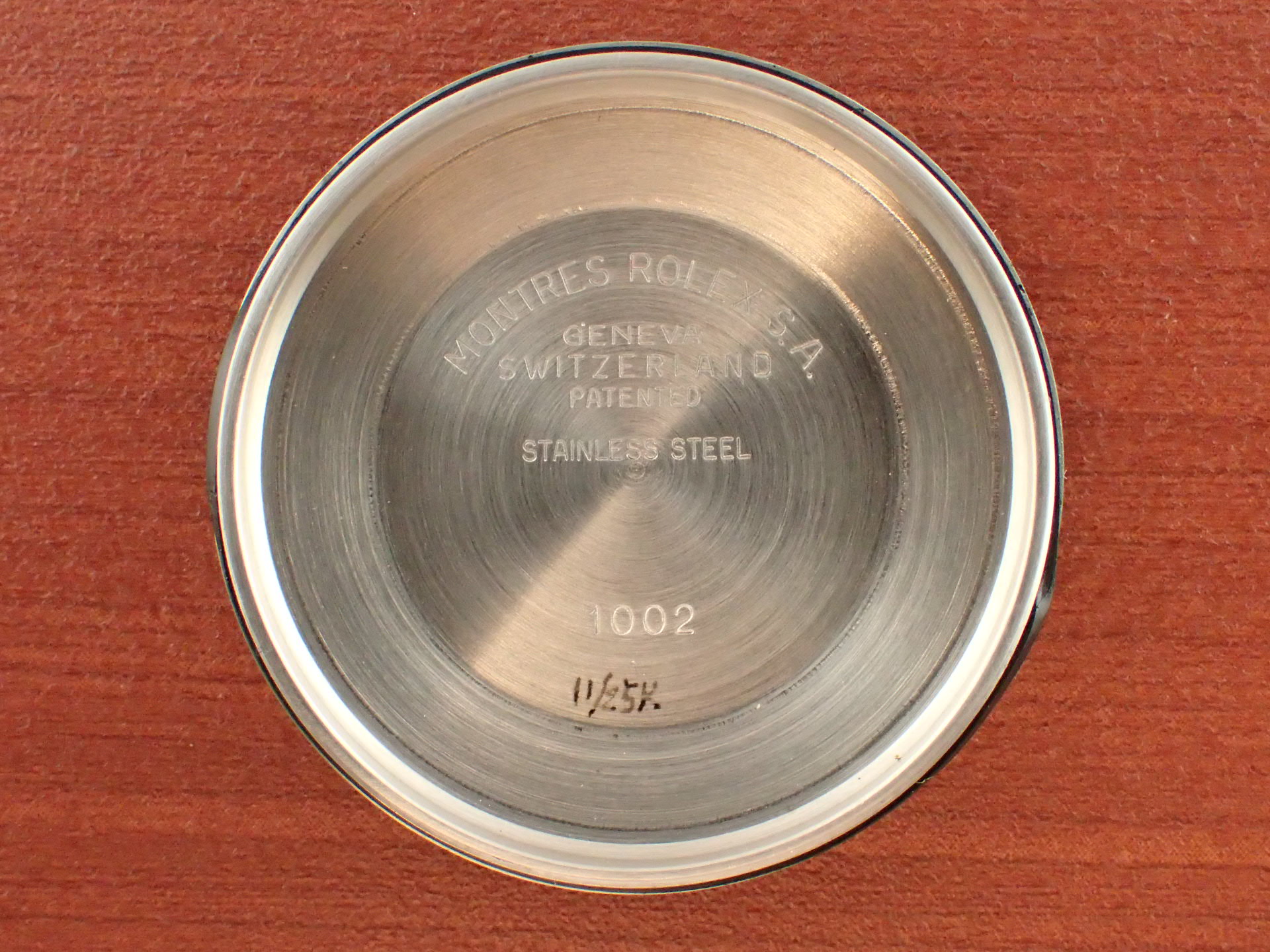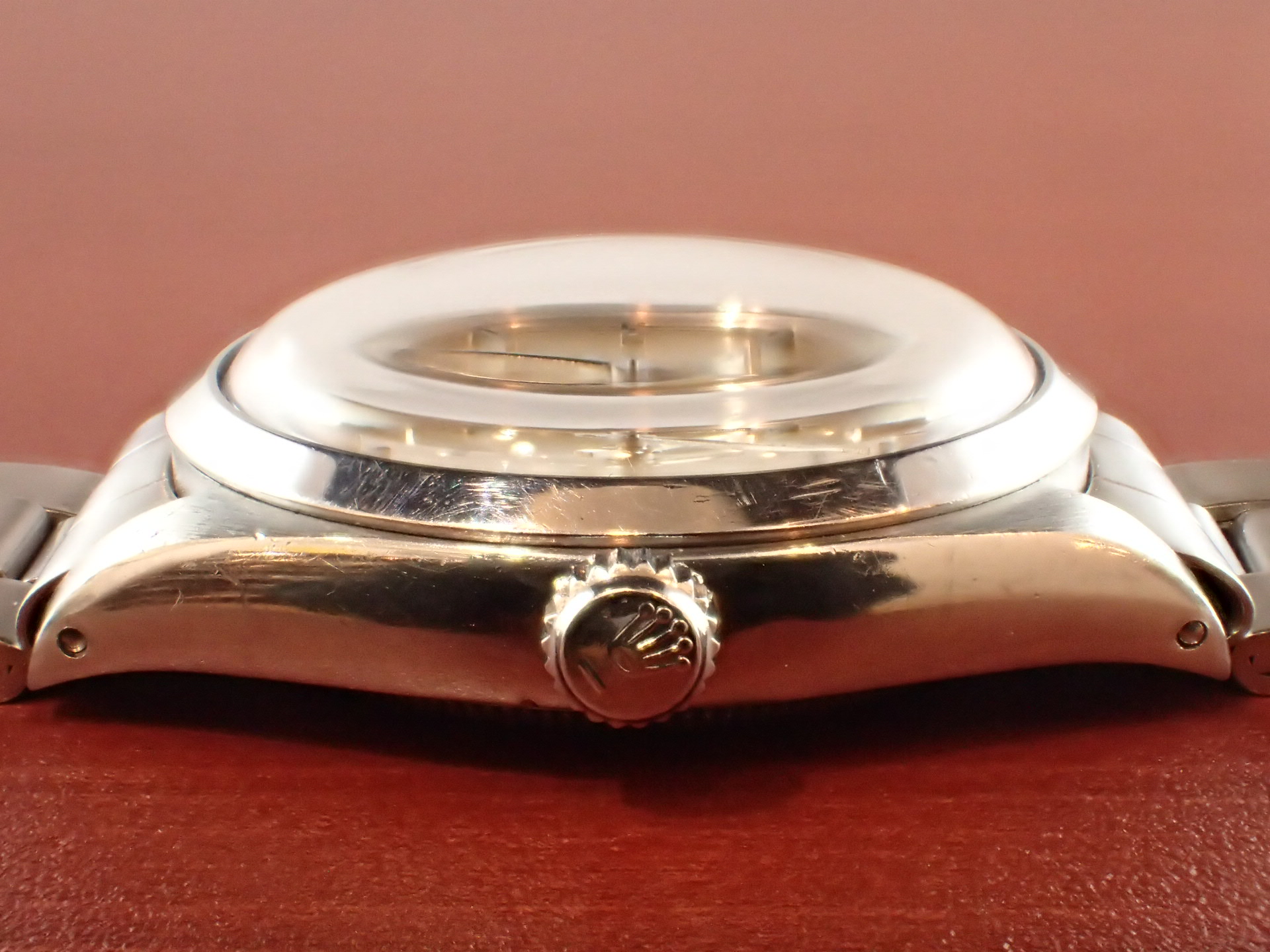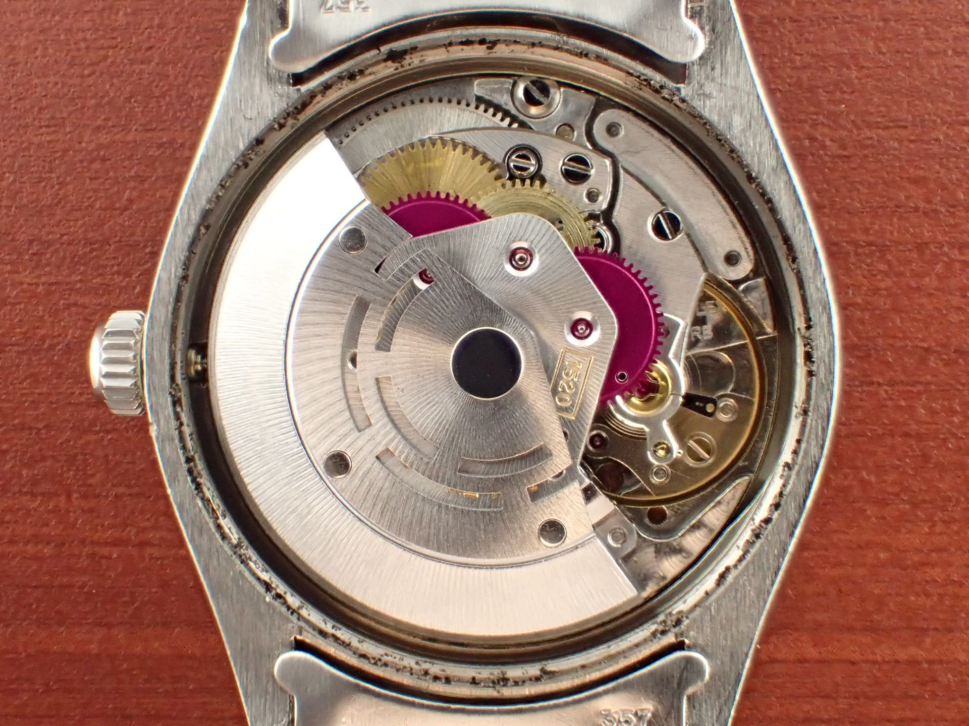 1970年代に製造されたエアキング、Ref.5500です。文字盤はサンバースト仕上げのシルバーにブラックレターです。目立つような汚れはなく、綺麗な状態です。針のメッキもダメージが少なく良い状態です。ケースは全体に小傷がありますが、痩せは感じません。ブレスレットは、巻きブレスが装着されています。若干の伸びはありますが、使用に問題はありません。12コマで手首周り18cmの方まで対応可能です。分解掃除済みで日差30秒程度で稼働しています。