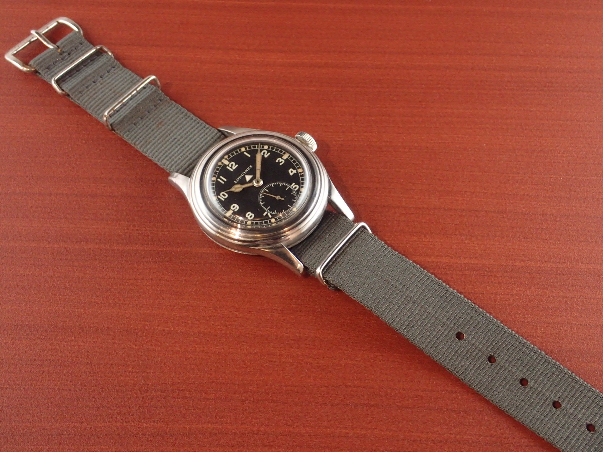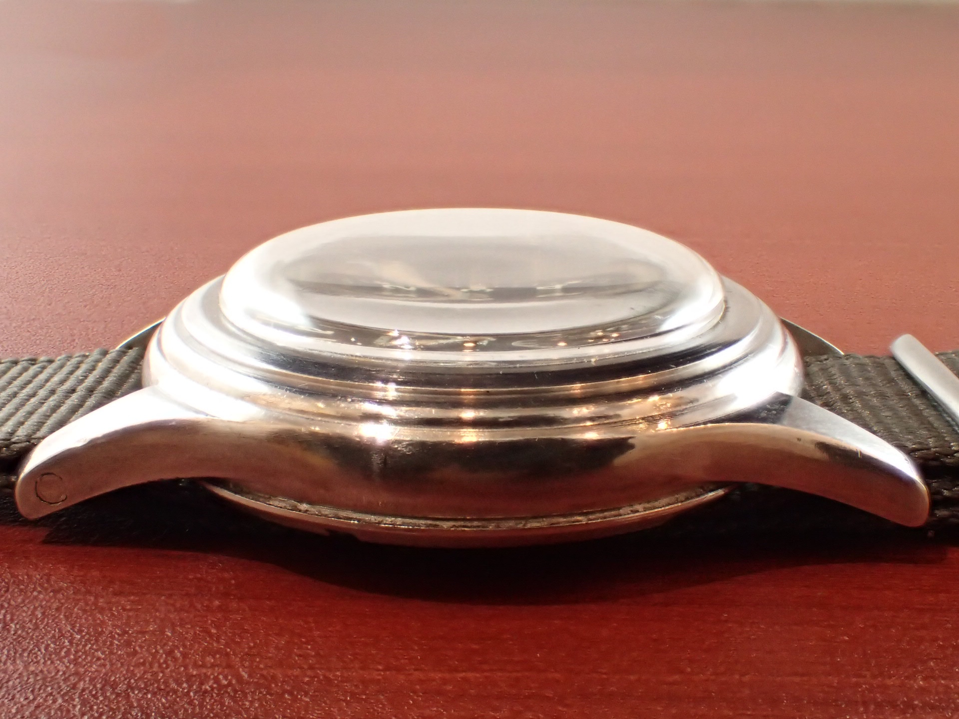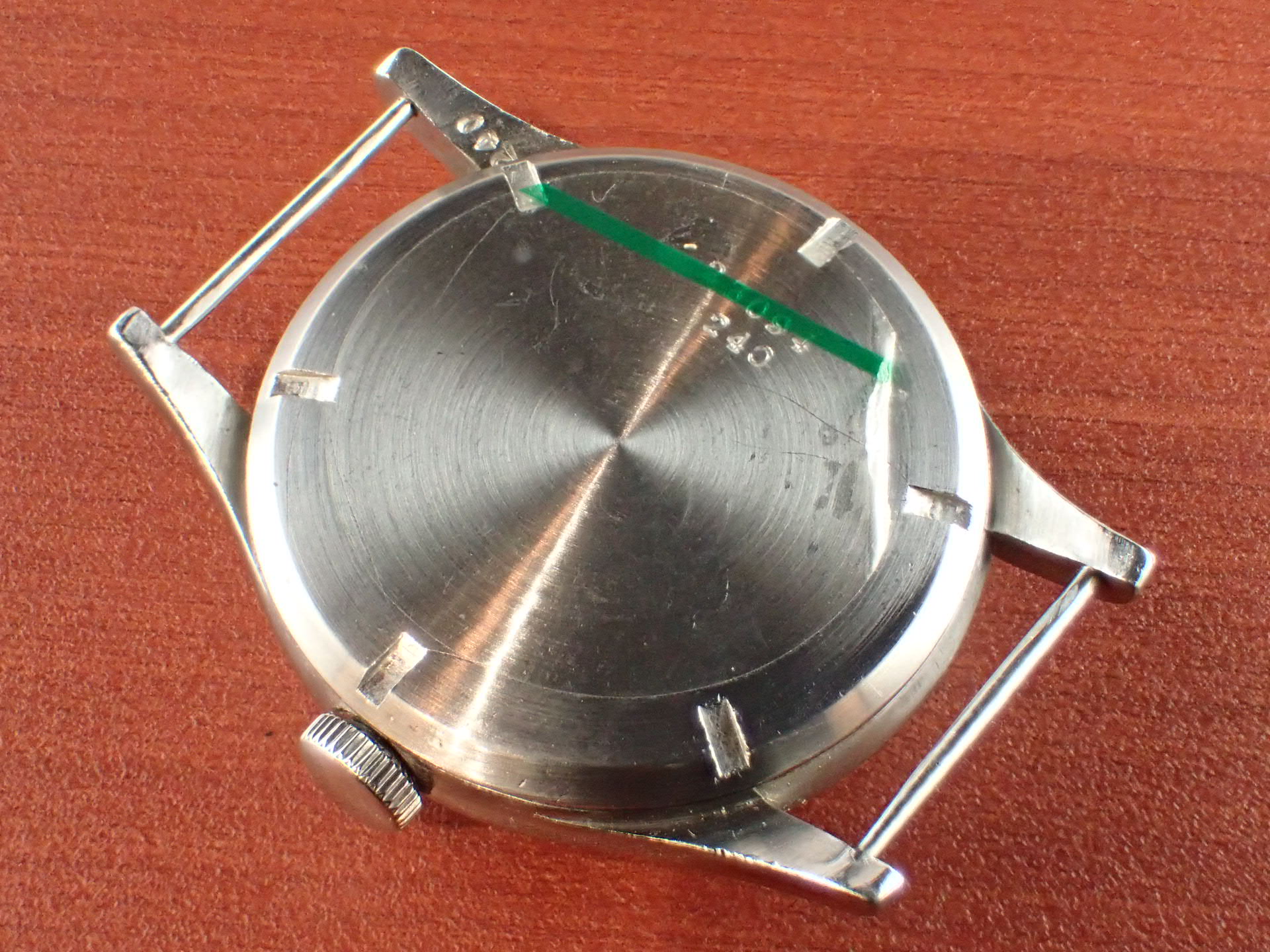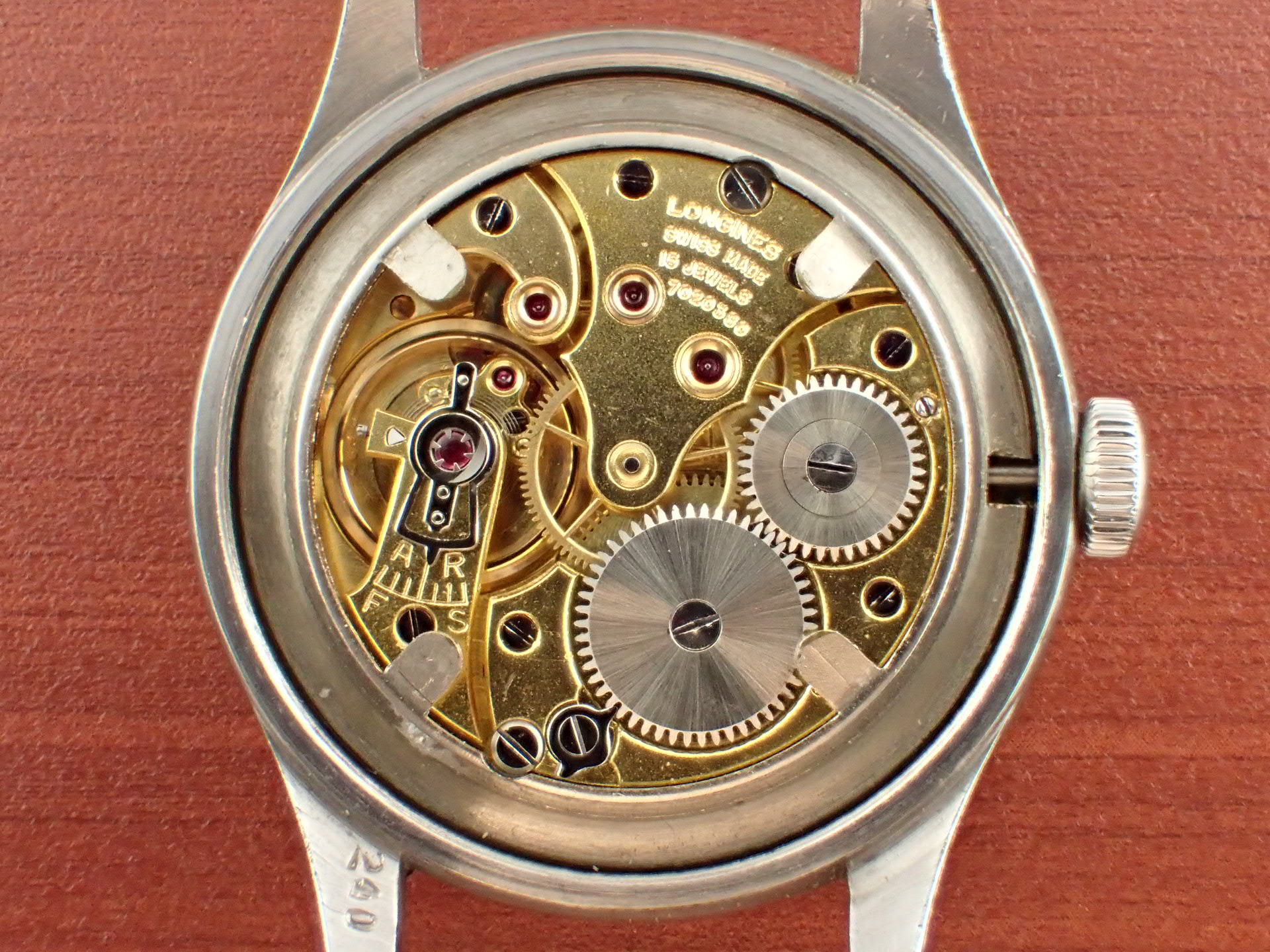 第二次世界大戦末期に支給されたイギリス陸軍モデル、W.W.W.グリーンランダーと同じスペック(Ref.5707)を持つ民生用です。軍用として製造されたパーツを流用し、新たなオーダーナンバーである「23094」(軍用は「23088」)を発行しています。文字盤のブロードアローは三角形に塗りつぶされ、裏蓋には軍用のマーキングはありません。出荷は戦後の1946年で、スイスの代理店、Wirth社宛てになっています。市場で見られるのは稀で、製造数はかなり少ないと思われます。文字盤は、夜光塗料の欠落はありますが、目立つ傷や汚れのない状態です。ケースは若干の仕上げは感じますが、痩せている感じはありません。ロンジンから発行されたアーカイブが付属します。こちらは委託品となりますが、当店で分解掃除後にお渡しする為、1年間の修理保証書が付属します。