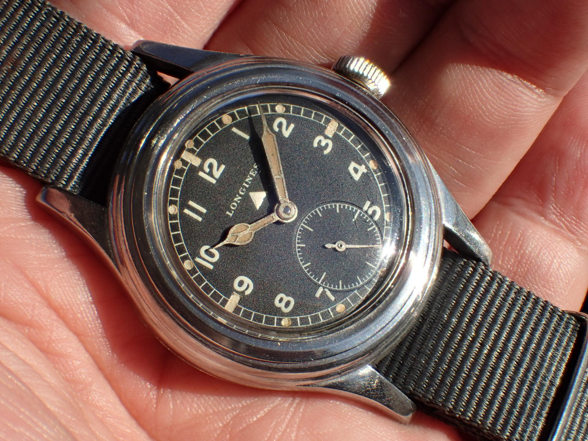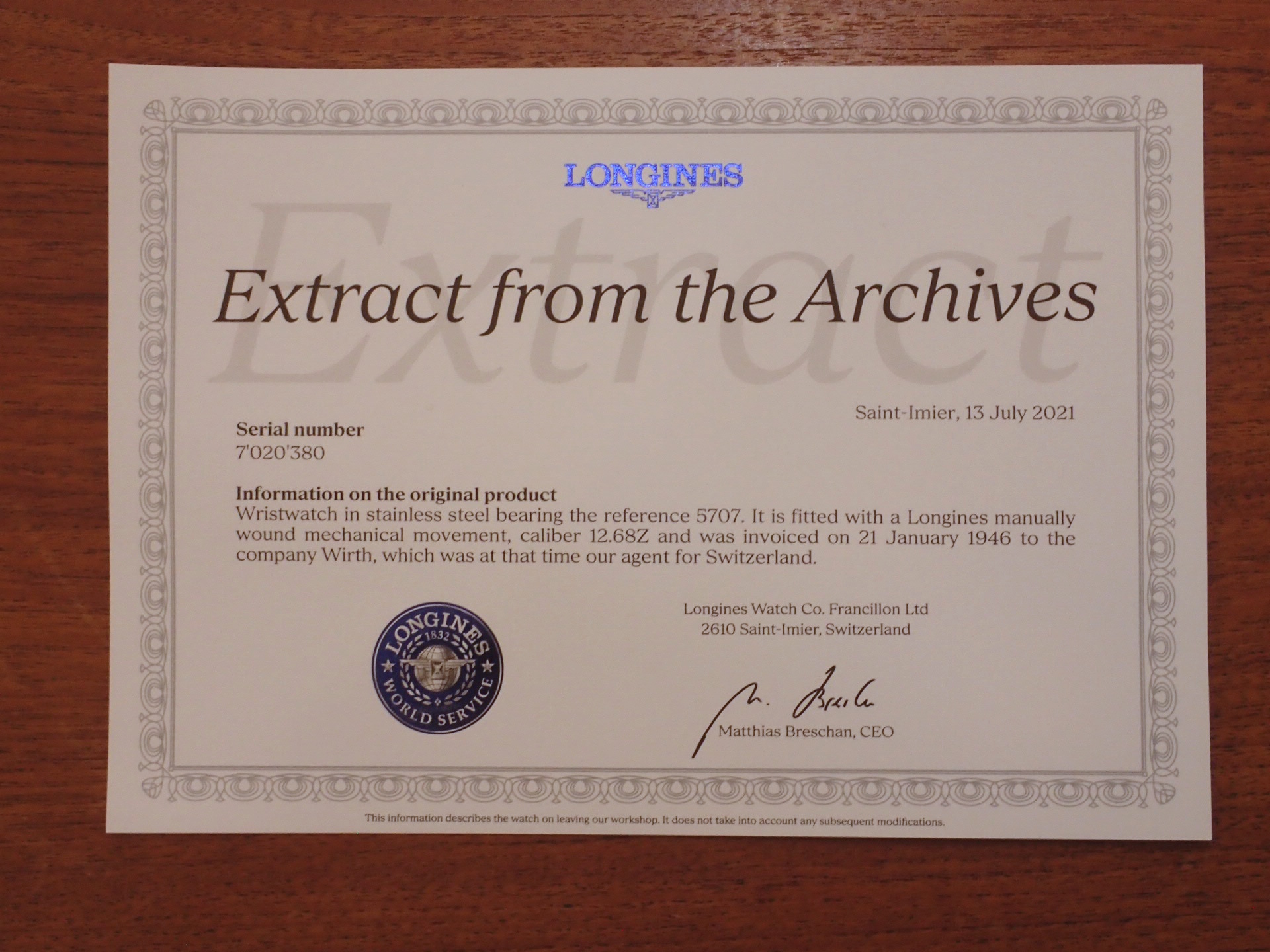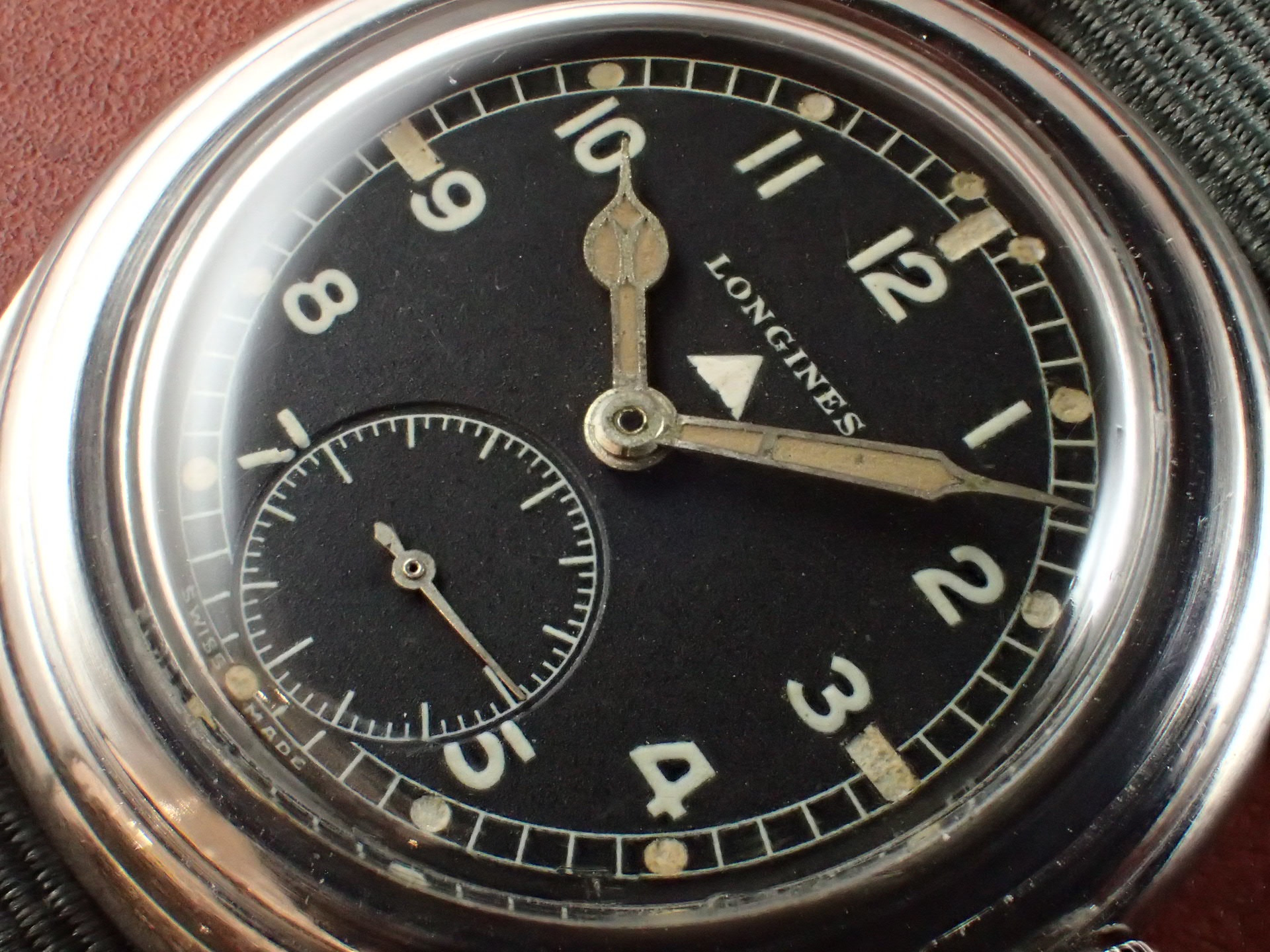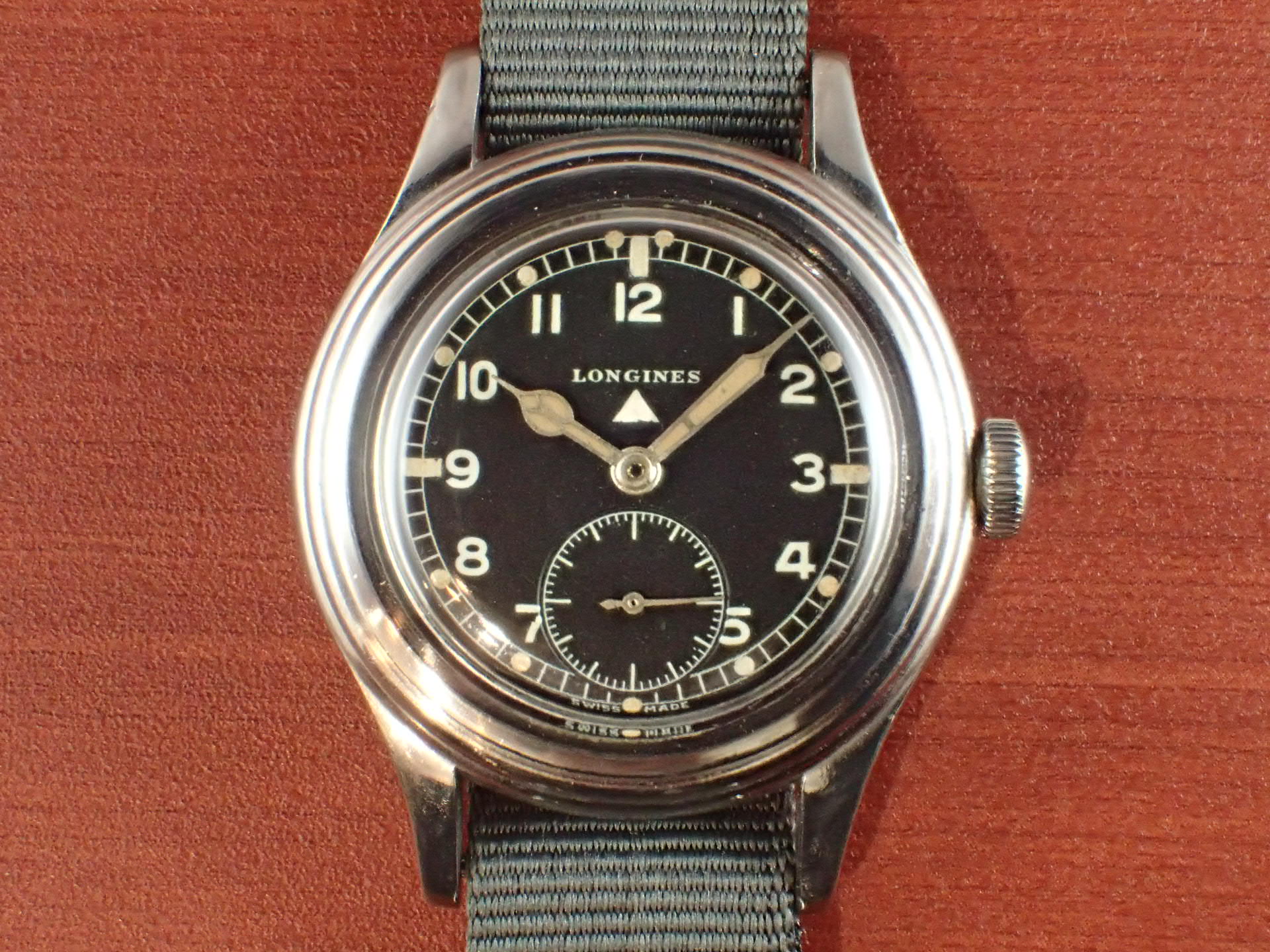第二次世界大戦末期に支給されたイギリス陸軍モデル、W.W.W.グリーンランダーと同じスペック(Ref.5707)を持つ民生用です。軍用として製造されたパーツを流用し、新たなオーダーナンバーである「23094」(軍用は「23088」)を発行しています。文字盤のブロードアローは三角形に塗りつぶされ、裏蓋には軍用のマーキングはありません。出荷は戦後の1946年で、スイスの代理店、Wirth社宛てになっています。市場で見られるのは稀で、製造数はかなり少ないと思われます。文字盤は、夜光塗料の欠落はありますが、目立つ傷や汚れのない状態です。ケースは若干の仕上げは感じますが、痩せている感じはありません。ロンジンから発行されたアーカイブが付属します。こちらは委託品となりますが、当店で分解掃除後にお渡しする為、1年間の修理保証書が付属します。