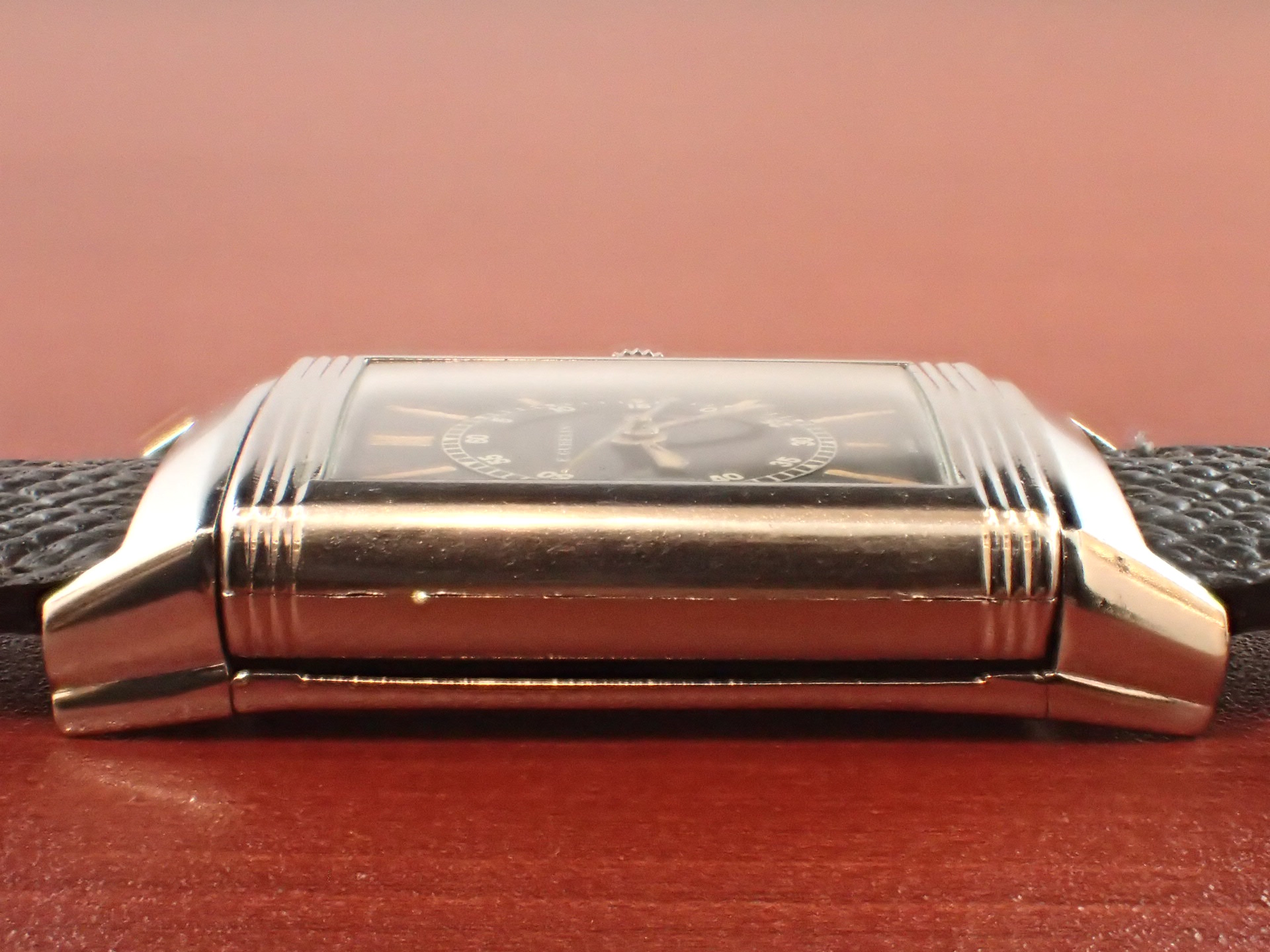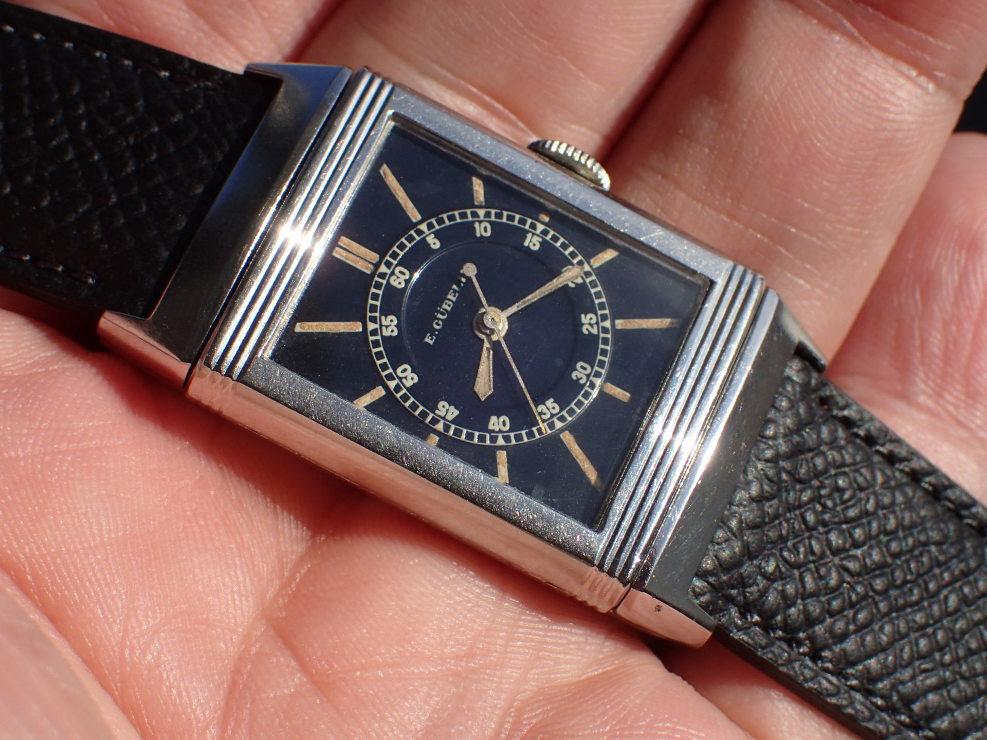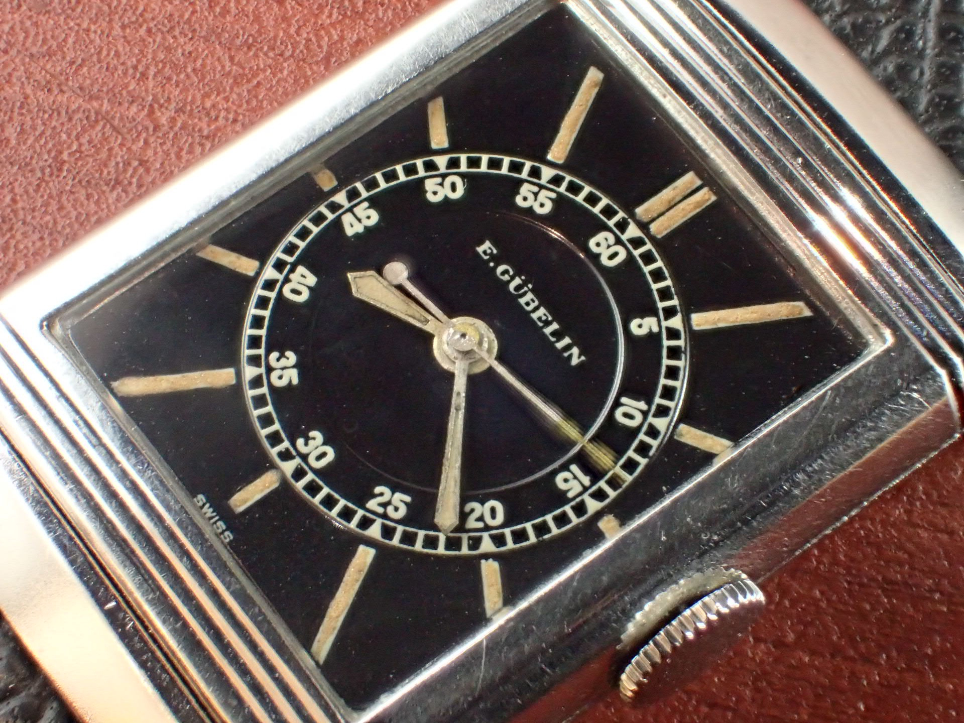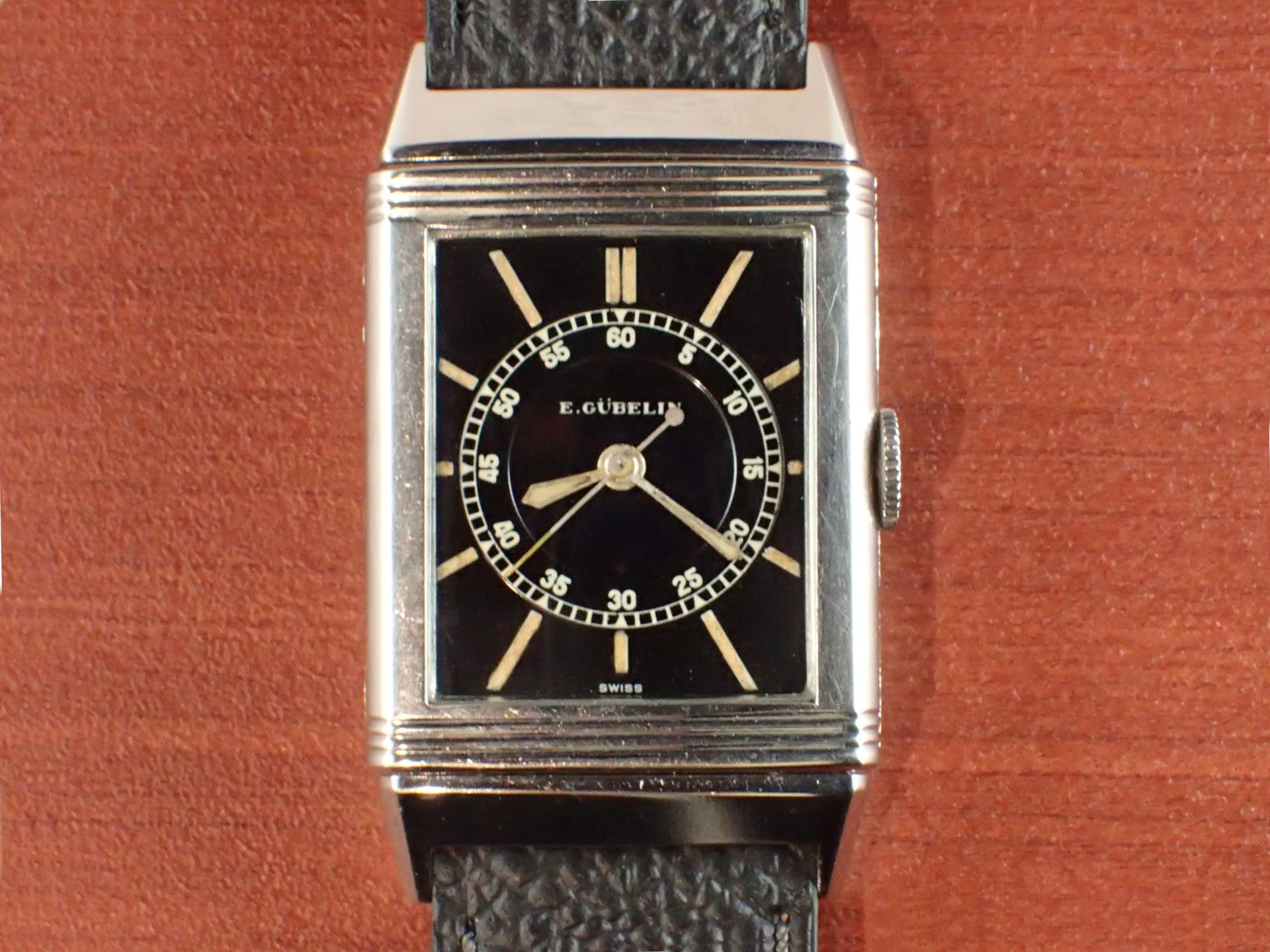 1930年代に製造されたスイスの高級宝飾店ギュブランネームのレベルソです。製造はジャガールクルトですが、文字盤にはギュブランのみ表記されており、お店の影響力が強かった時代背景を感じます。文字盤はツヤのあるブラックで、セクター系のデザインが素晴らしいです。状態も素晴らしくブラックのツヤをしっかりと残し、気になるダメージもありません。反転ケースは、小傷がありますが概ね良好です。ムーブメントも綺麗な状態です。こちらは委託品となりますが、当店で分解掃除済みのため、1年間の修理保証書が付属します。