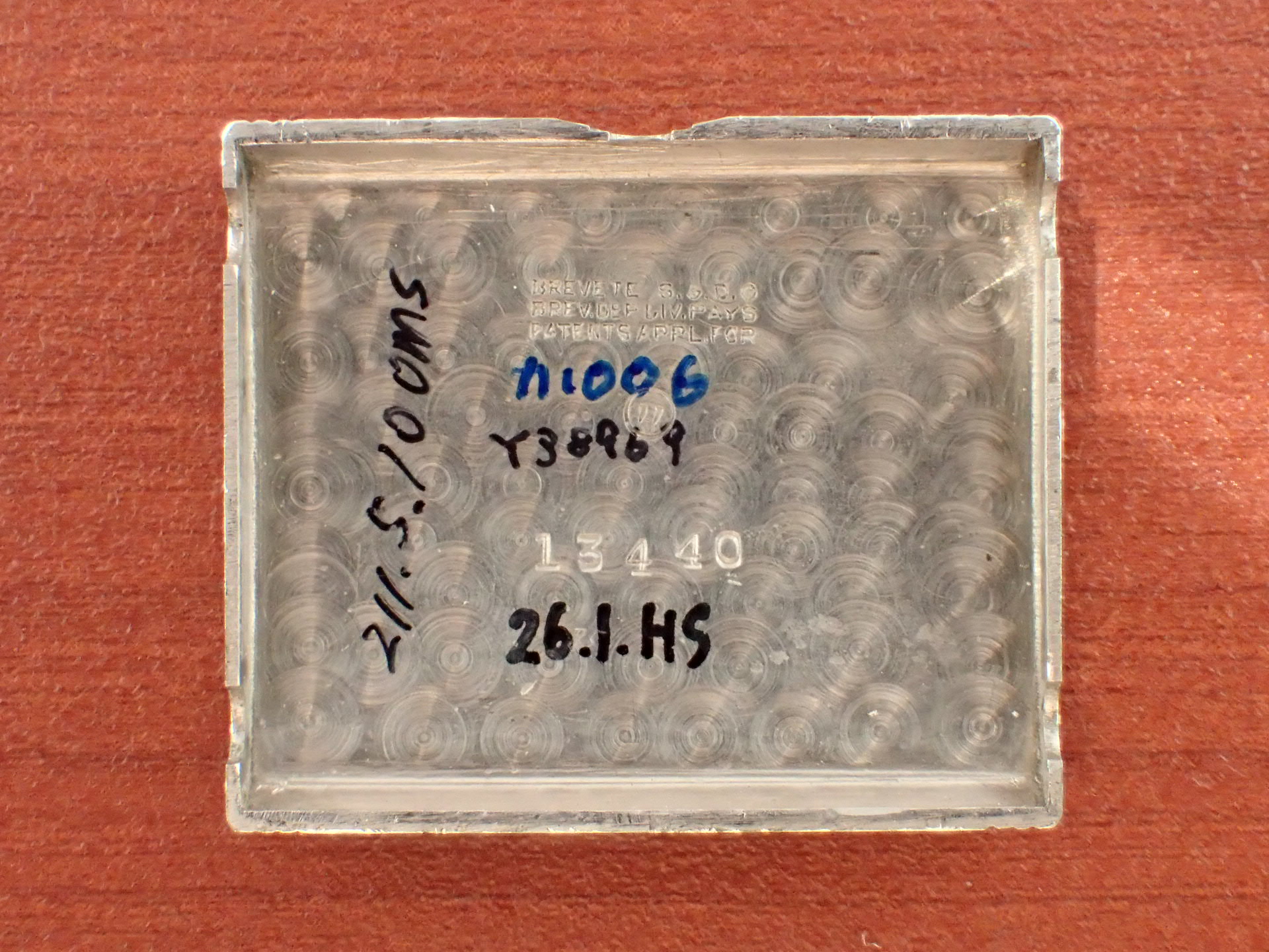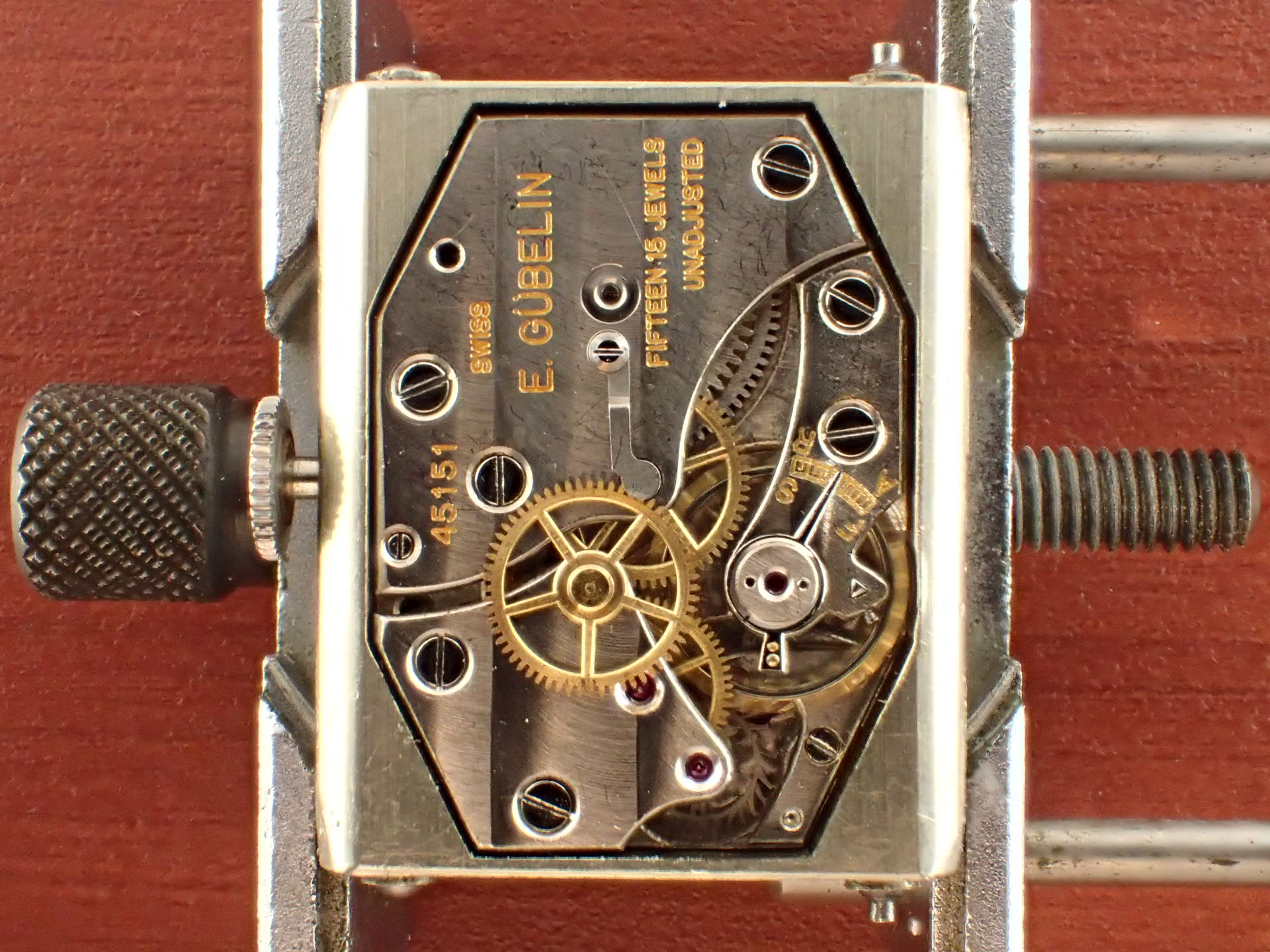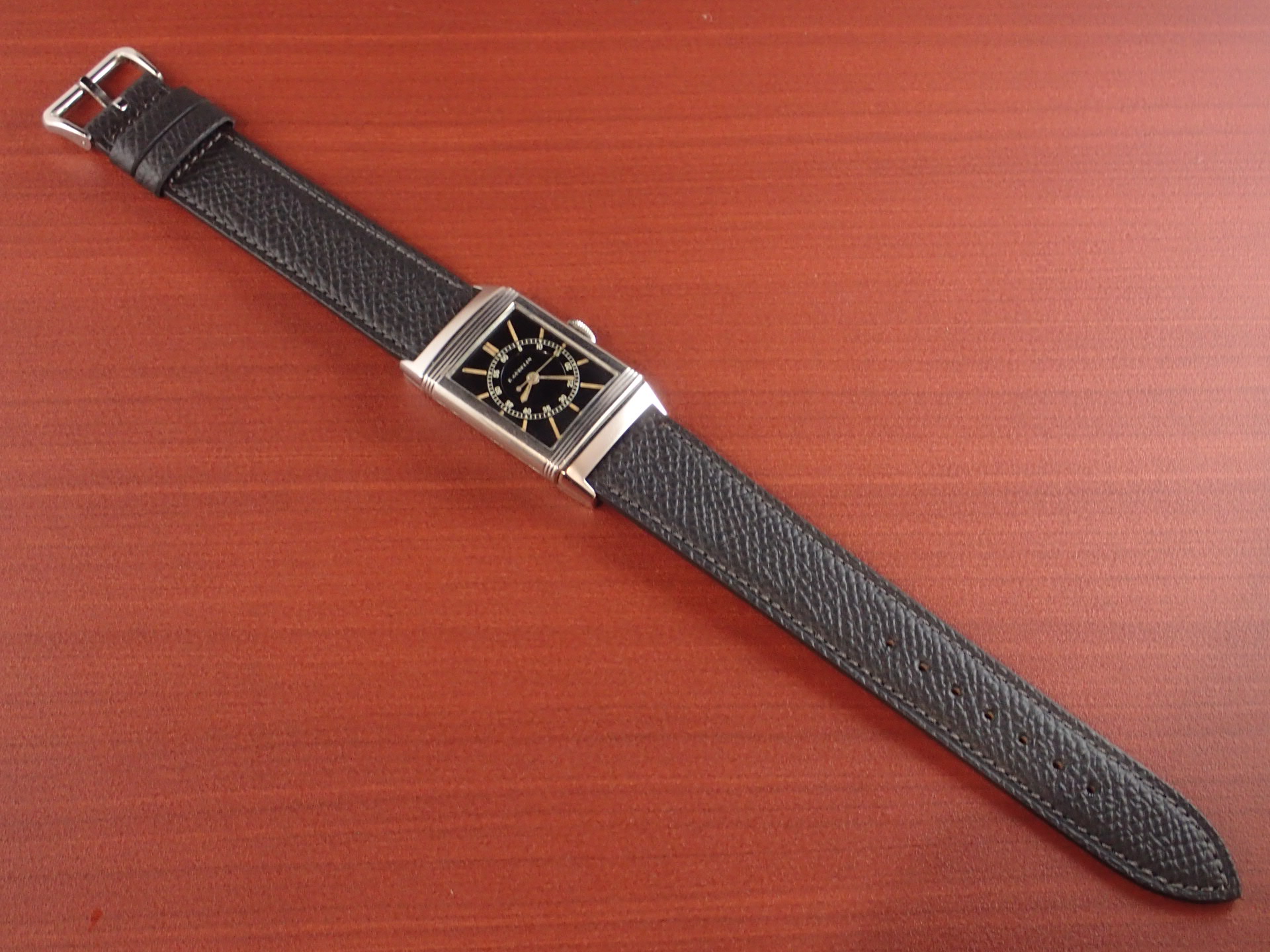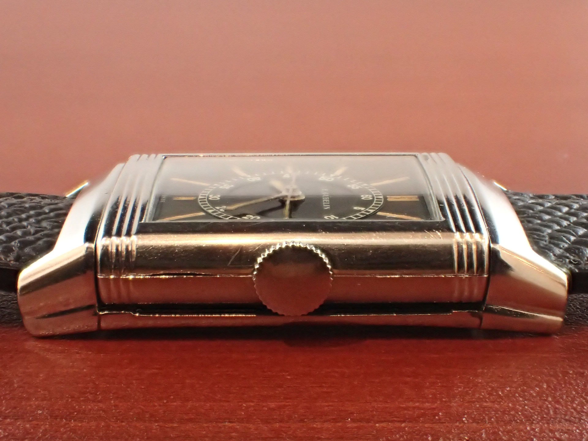 1930年代に製造されたスイスの高級宝飾店ギュブランネームのレベルソです。製造はジャガールクルトですが、文字盤にはギュブランのみ表記されており、お店の影響力が強かった時代背景を感じます。文字盤はツヤのあるブラックで、セクター系のデザインが素晴らしいです。状態も素晴らしくブラックのツヤをしっかりと残し、気になるダメージもありません。反転ケースは、小傷がありますが概ね良好です。ムーブメントも綺麗な状態です。こちらは委託品となりますが、当店で分解掃除済みのため、1年間の修理保証書が付属します。