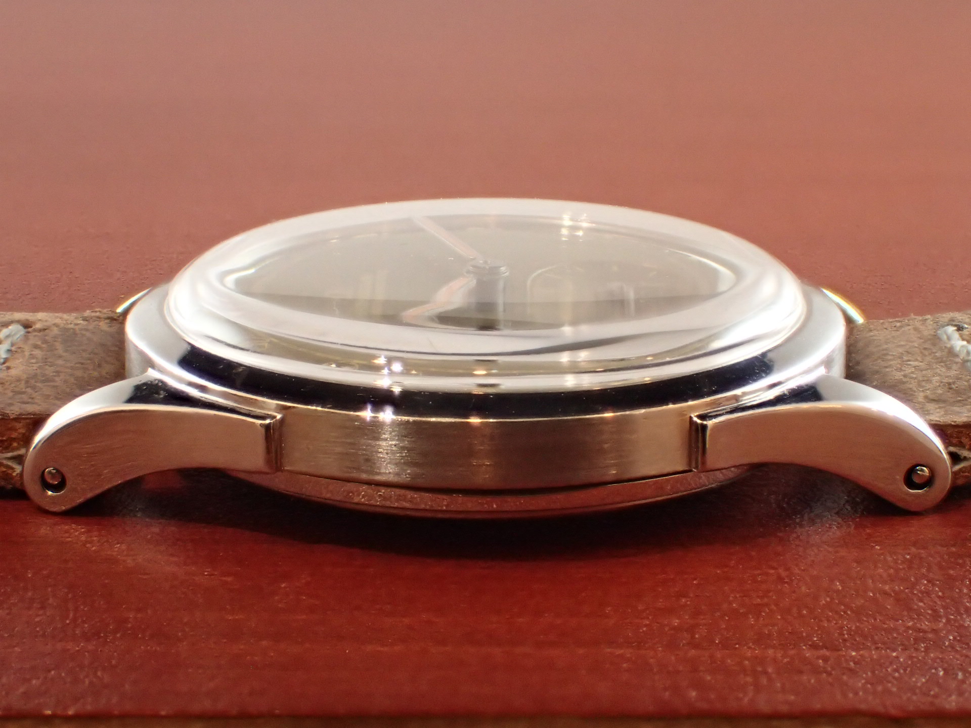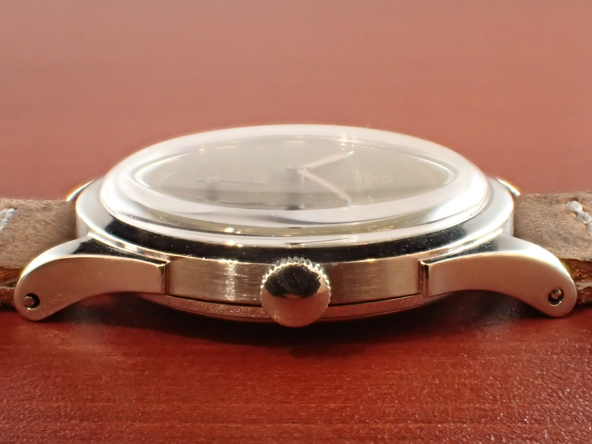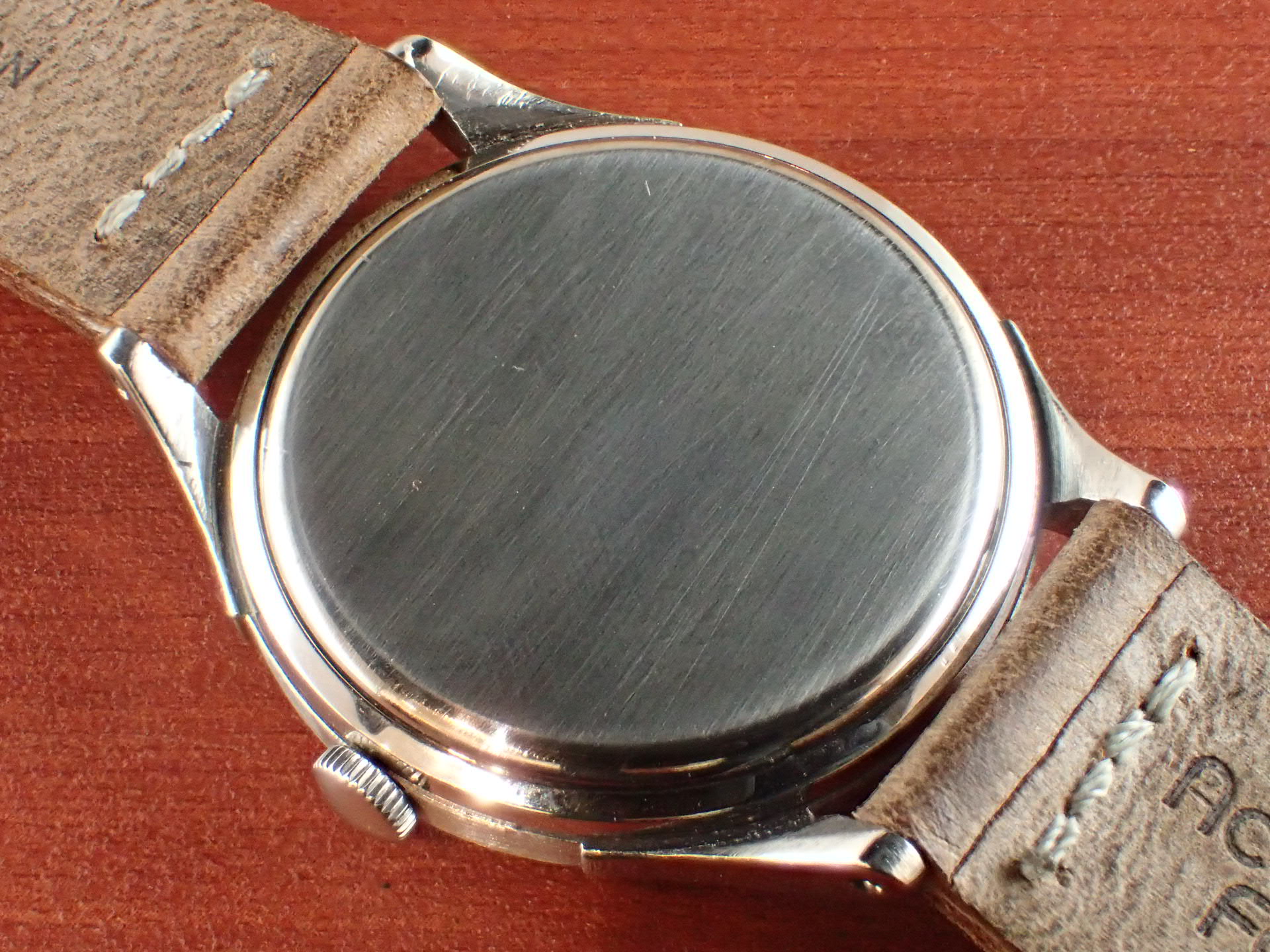 1940年代に製造されたバンパーオートマチック、キャリバー30.10 R.A.搭載モデルです。ケースは、裏蓋をリングで止めるあまり他のモデルは見られない構造です。文字盤はインデックスのフォントが可愛らしく、グレーの色味が経年変化により、良い雰囲気になっています。少々の経年変化が見られますが、目立つ傷や汚れはなく、概ね良好な状態です。ケースは若干の磨きを感じますが、大きなダメージはりません。リューズは交換されていると思われますが、雰囲気のあったものが付いています。ムーブメントは、当時としてはハイスペックで、自動巻きに加え、当時としては出始めのインカブロック(耐震装置)を装備しています。分解掃除済みで日差30秒程度で稼働しています。