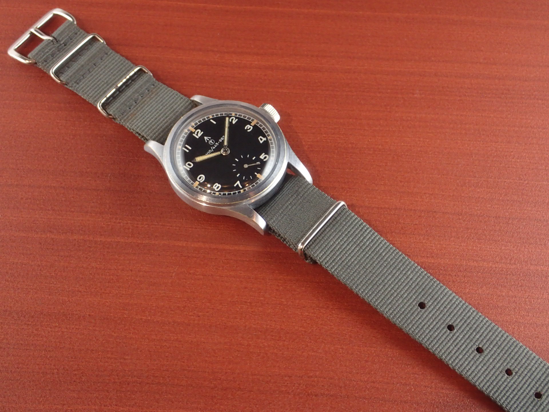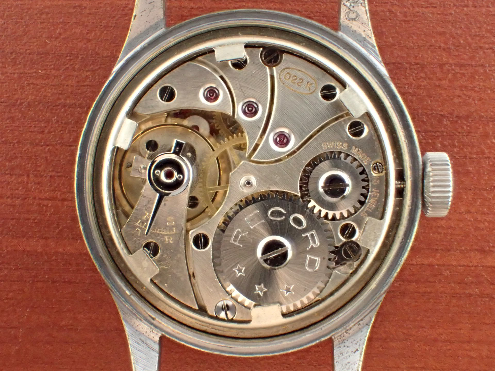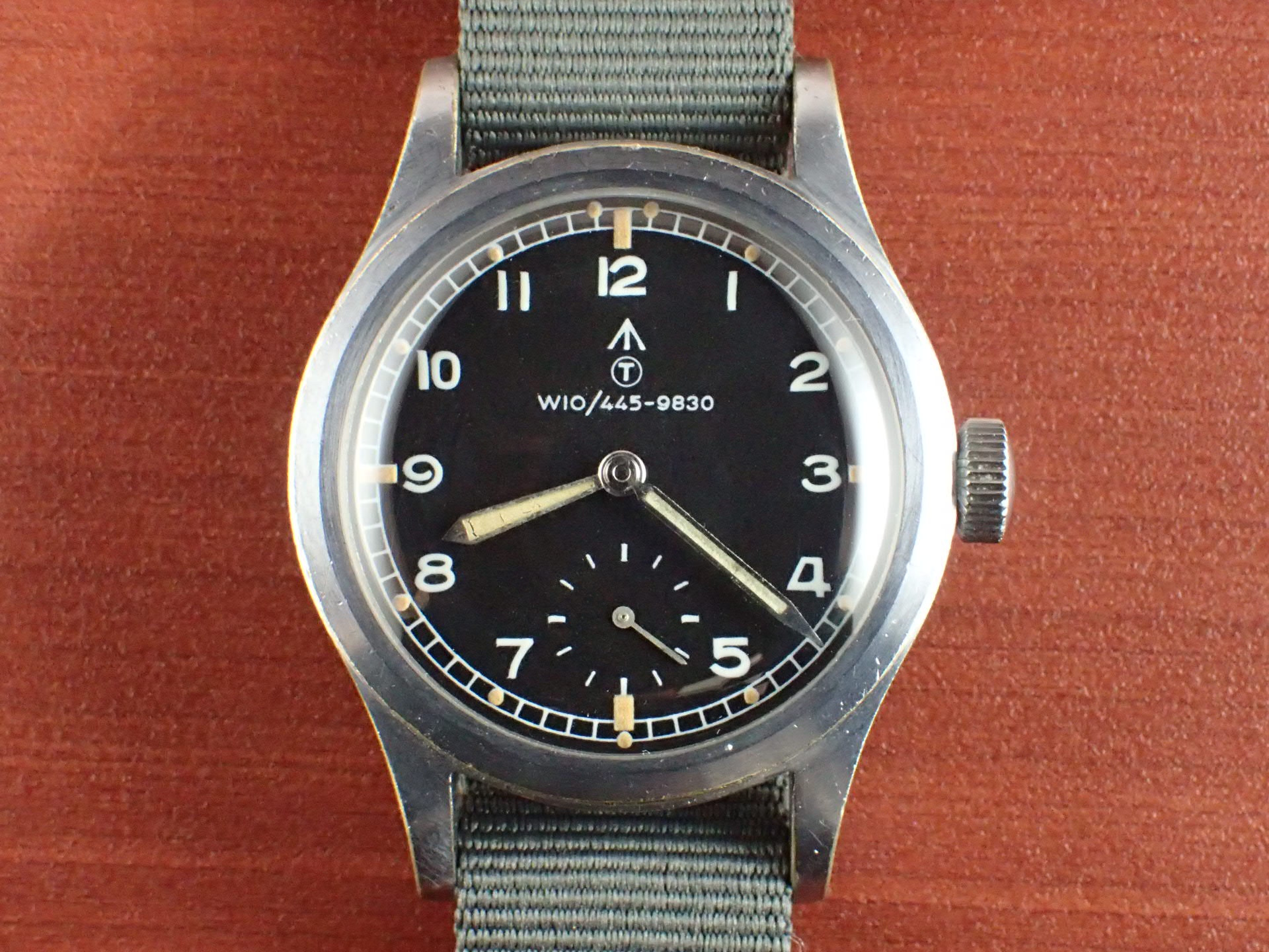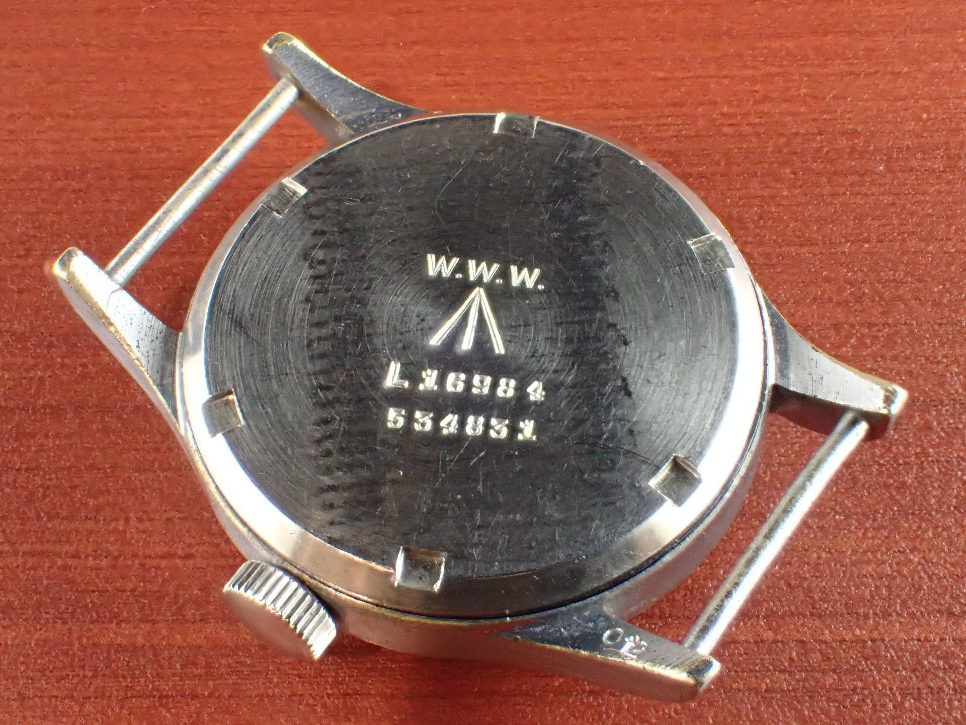第二第二次世界大戦でイギリス陸軍が使用したW.W.W.、通称「ダーティダース」シリーズ。大戦末期に製造されたこのシリーズのモデルは、戦後においても長く使用されました。このモデルは、イギリス国防省(MoD)が、1960年代にそのモデルをNATOストックナンバーが入った文字盤に交換して使用したもの。文字盤にブランド名は入らず、NATOストックナンバーのみを表記。「W10」は陸軍を表す識別記号。このNATO文字盤、レコードの他には、IWC、オメガ、ティモールにも存在しています。記号はそれぞれ次のようになっています。レコード:W10/445-9830、IWC:W10/445-5890、オメガ:W10/445-2031、ティモール:W10/445-9855。裏蓋の「L」はレコードを表す識別コードです。ミリタリーウォッチならではのヒストリーがあるモデルで面白く、またカッコイイです。文字盤は、目立つ傷や汚れがない綺麗な状態です。ケースサイドにメッキの薄くなった箇所がありますが、概ね良好です。分解掃除済みで日差30秒以内で稼働しています。