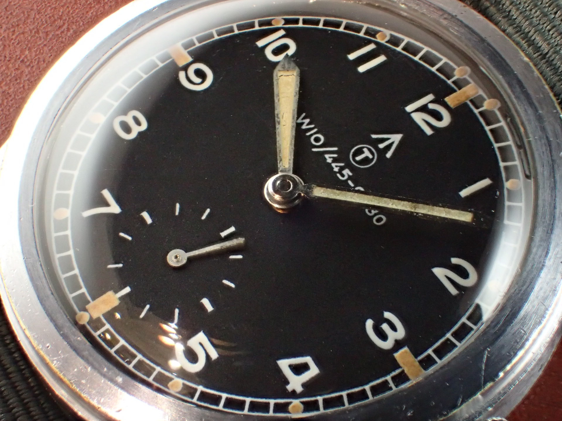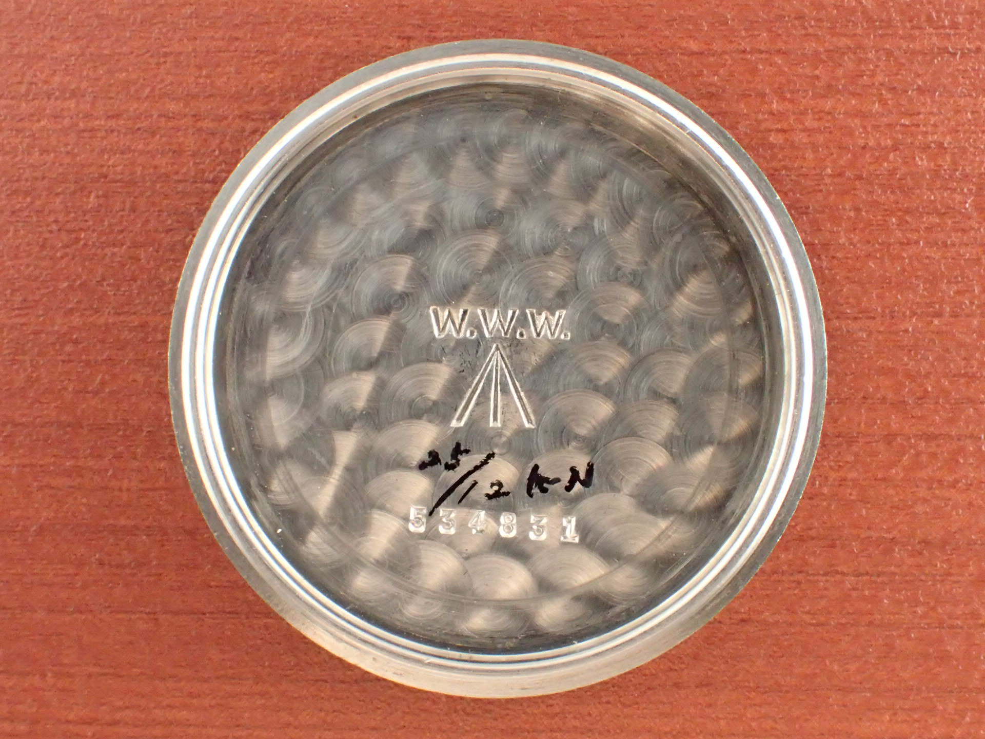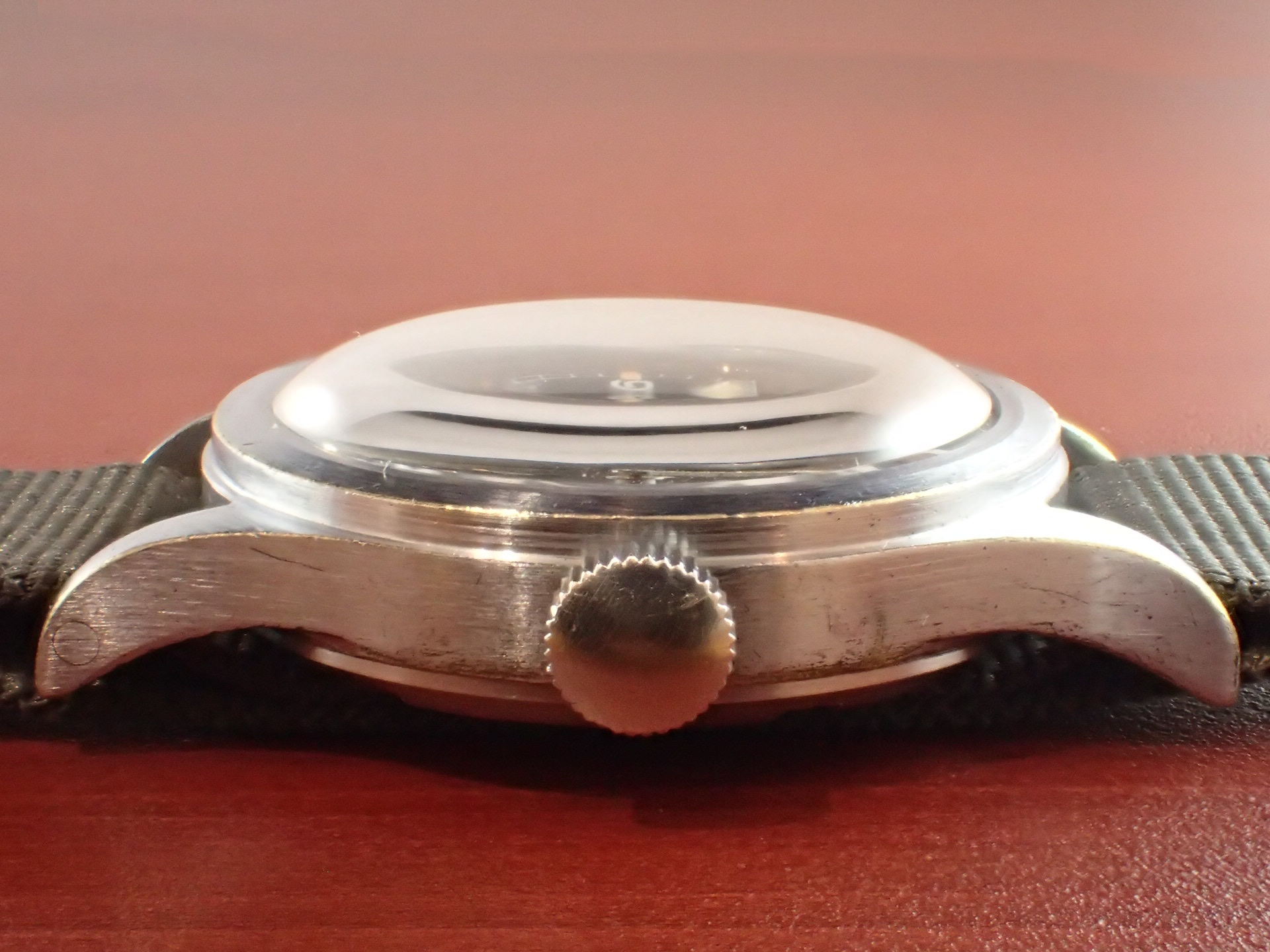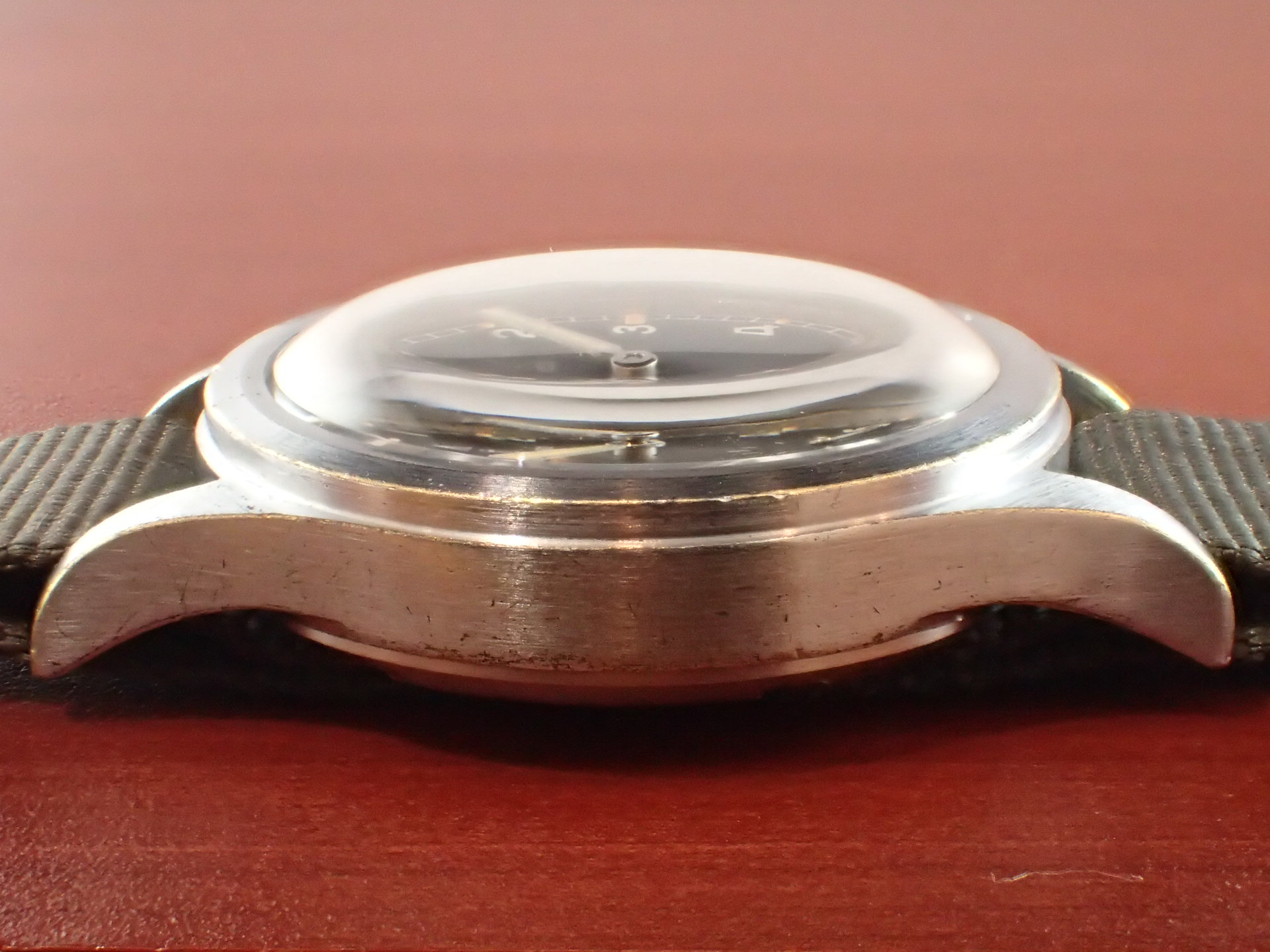 第二第二次世界大戦でイギリス陸軍が使用したW.W.W.、通称「ダーティダース」シリーズ。大戦末期に製造されたこのシリーズのモデルは、戦後においても長く使用されました。このモデルは、イギリス国防省(MoD)が、1960年代にそのモデルをNATOストックナンバーが入った文字盤に交換して使用したもの。文字盤にブランド名は入らず、NATOストックナンバーのみを表記。「W10」は陸軍を表す識別記号。このNATO文字盤、レコードの他には、IWC、オメガ、ティモールにも存在しています。記号はそれぞれ次のようになっています。レコード:W10/445-9830、IWC:W10/445-5890、オメガ:W10/445-2031、ティモール:W10/445-9855。裏蓋の「L」はレコードを表す識別コードです。ミリタリーウォッチならではのヒストリーがあるモデルで面白く、またカッコイイです。文字盤は、目立つ傷や汚れがない綺麗な状態です。ケースサイドにメッキの薄くなった箇所がありますが、概ね良好です。分解掃除済みで日差30秒以内で稼働しています。
