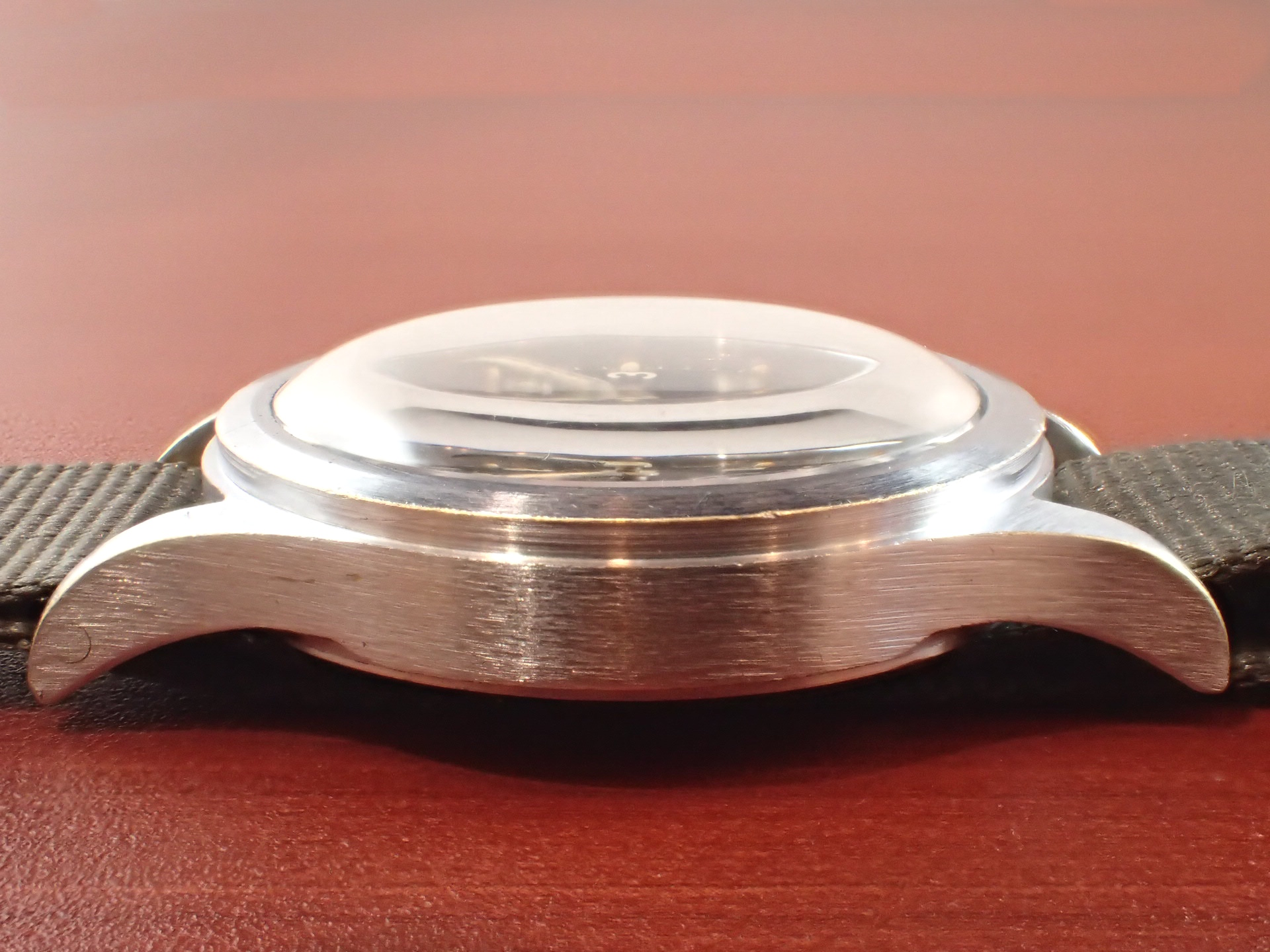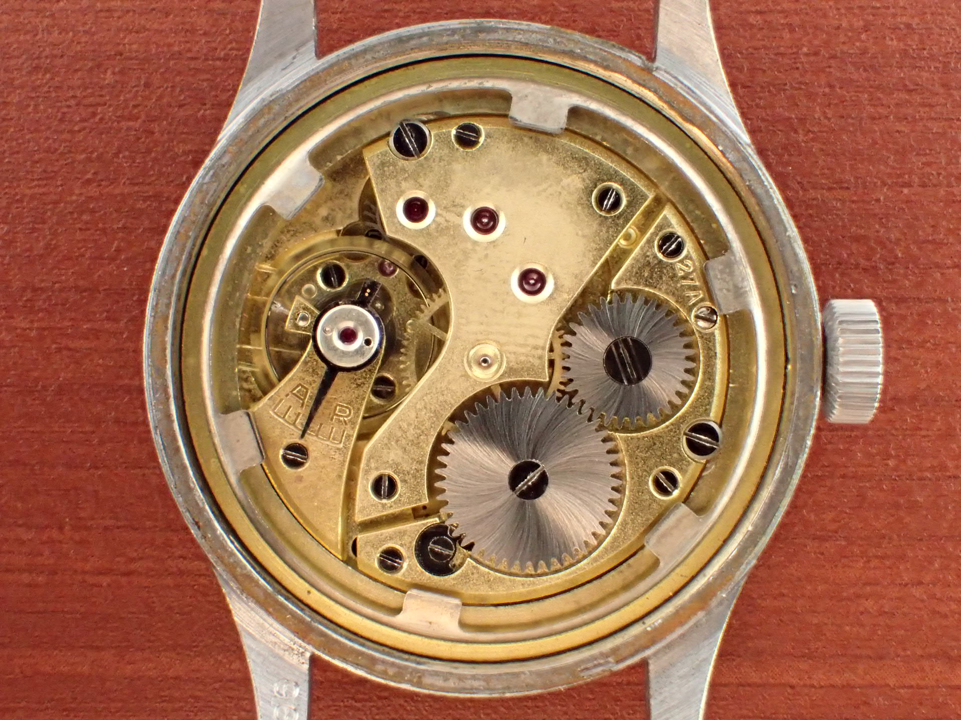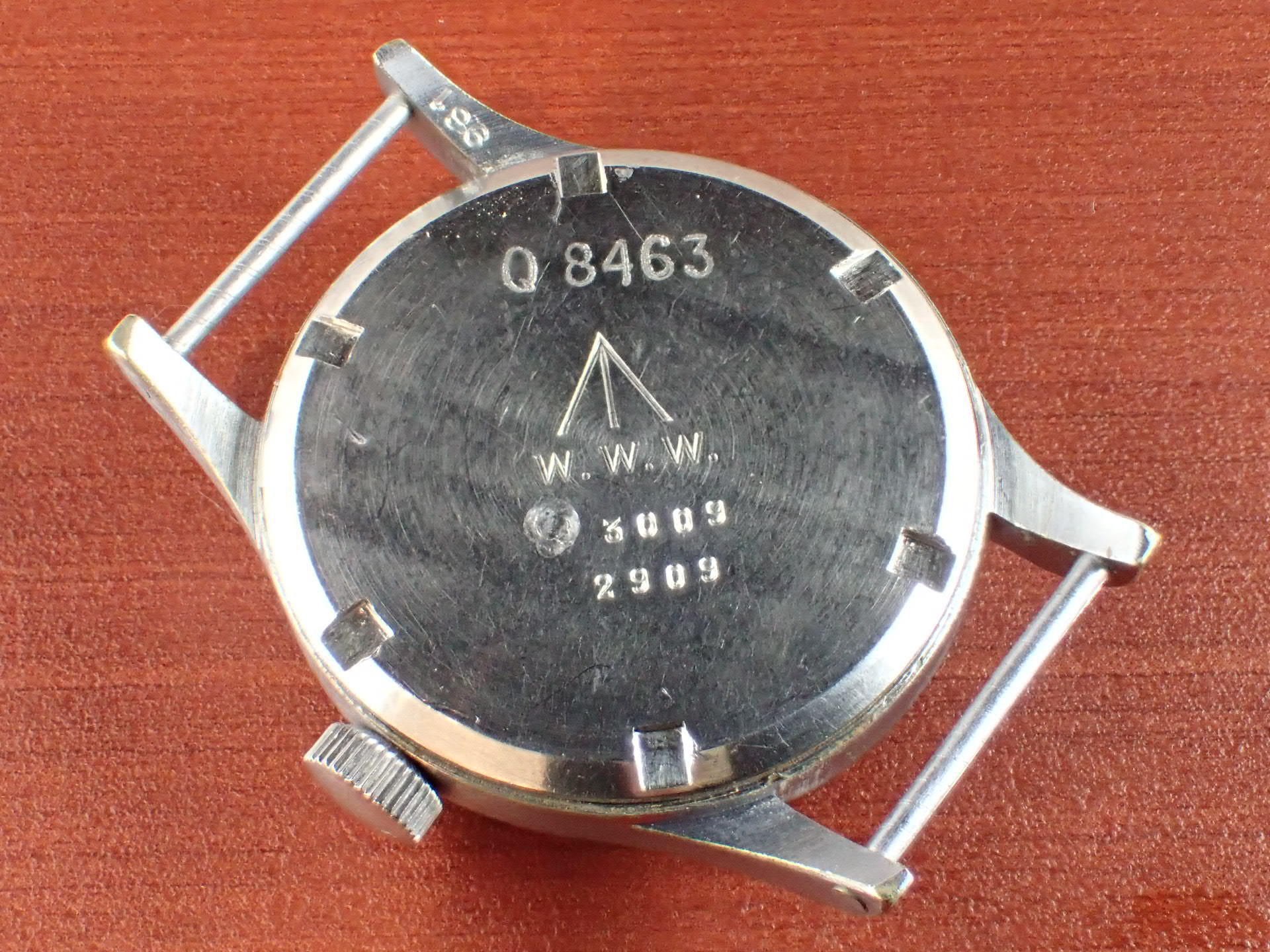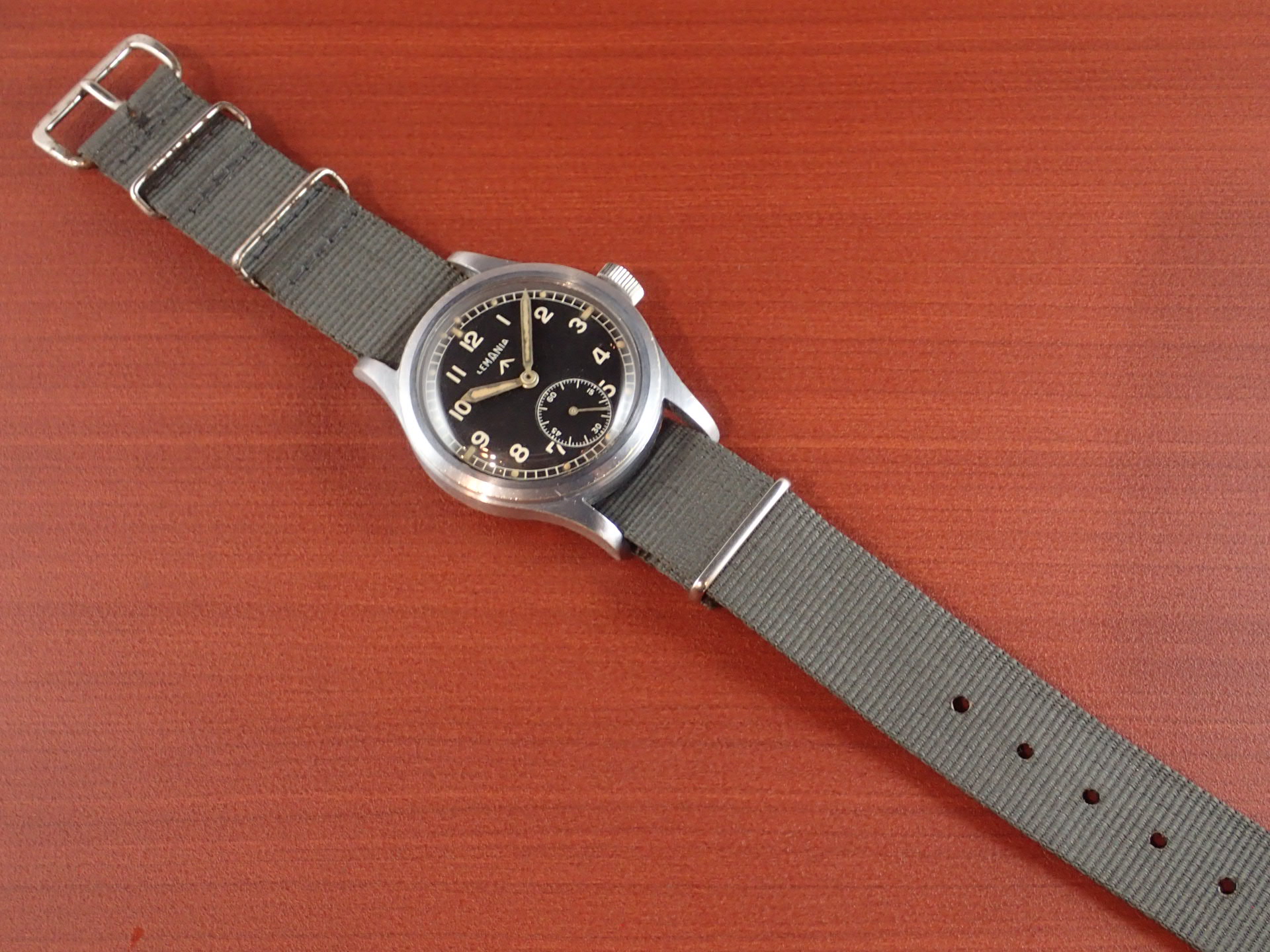 第二次世界大戦末期にイギリス陸軍のために製造された通称「W.W.W.」。このシリーズの中でも人気が高いのがこのレマニア。レマニアの製造数は8,000個と言われています。文字盤は2時のインデックスに、肉眼では分からない程度の極僅かなダメージがありますが、大変綺麗な状態です。ケースは、大きなダメージやメッキ剥がれもなく、このモデルとしては非常に良好です。裏蓋の刻印はくっりきしています。レマニアのW.W.W.は最近価格が高騰しています。分解掃除済みで日差30秒程度で稼働しています。