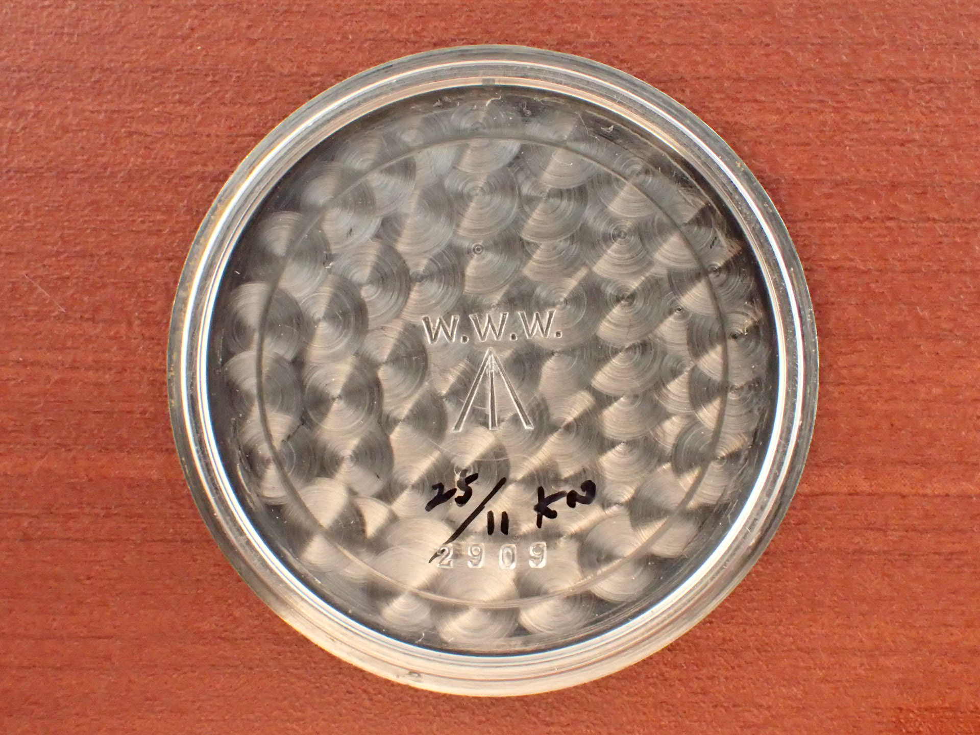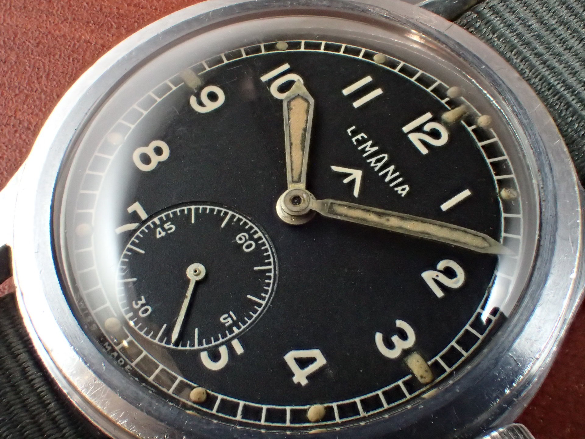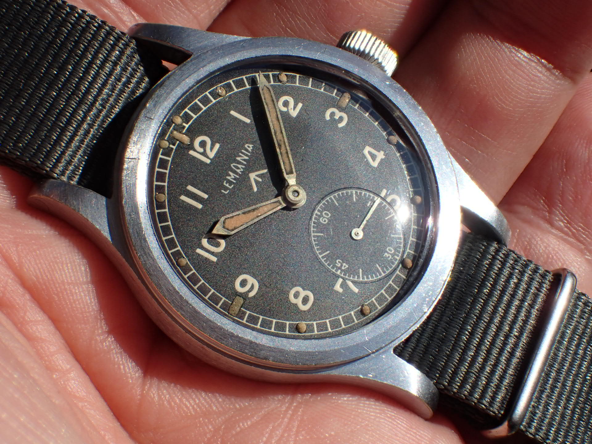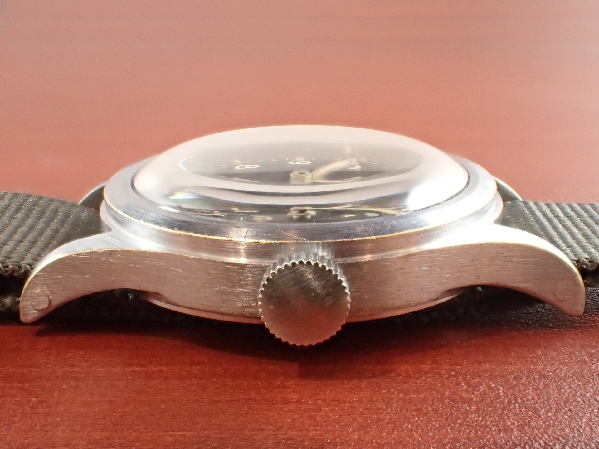 第二次世界大戦末期にイギリス陸軍のために製造された通称「W.W.W.」。このシリーズの中でも人気が高いのがこのレマニア。レマニアの製造数は8,000個と言われています。文字盤は2時のインデックスに、肉眼では分からない程度の極僅かなダメージがありますが、大変綺麗な状態です。ケースは、大きなダメージやメッキ剥がれもなく、このモデルとしては非常に良好です。裏蓋の刻印はくっりきしています。レマニアのW.W.W.は最近価格が高騰しています。分解掃除済みで日差30秒程度で稼働しています。