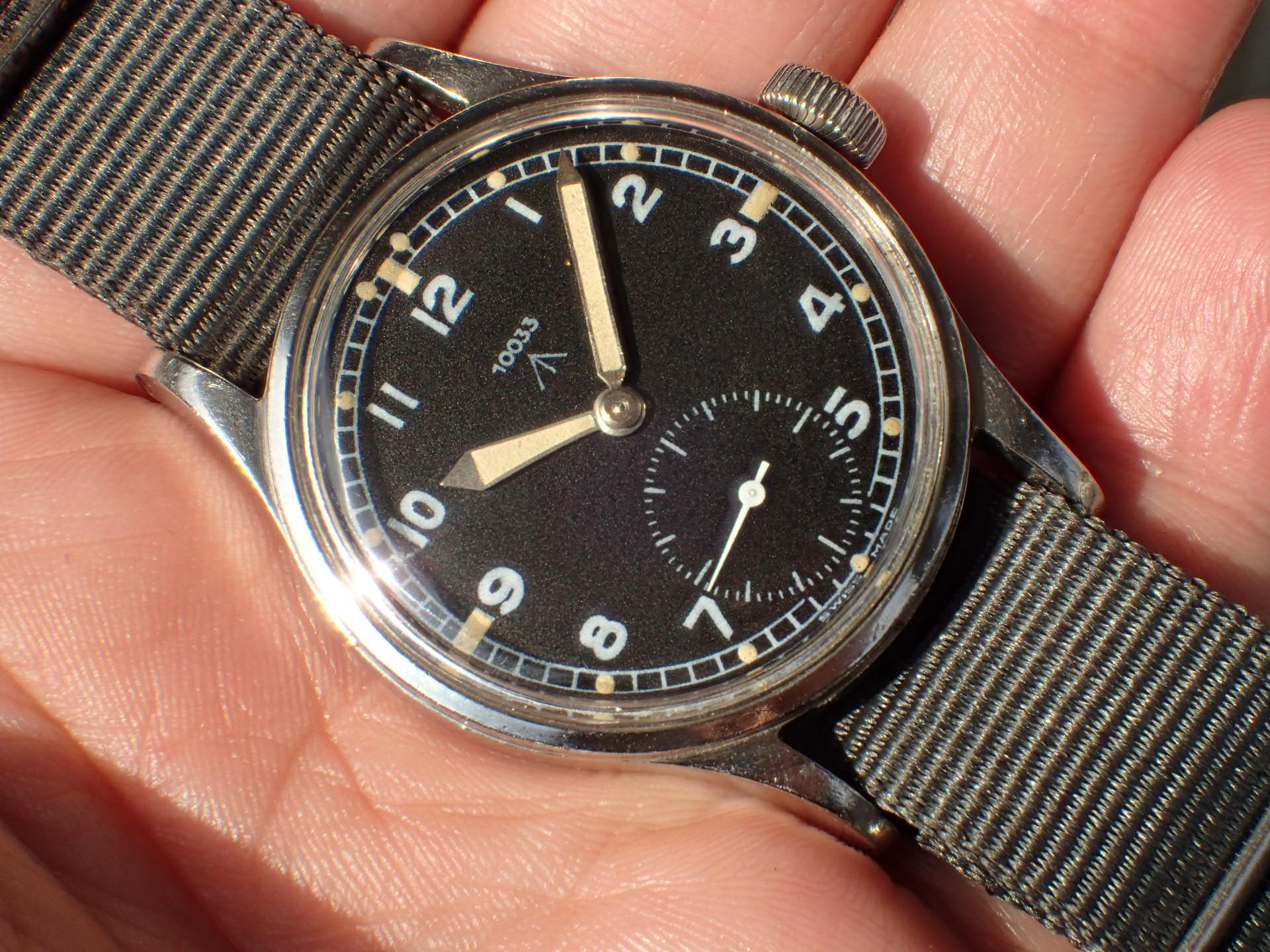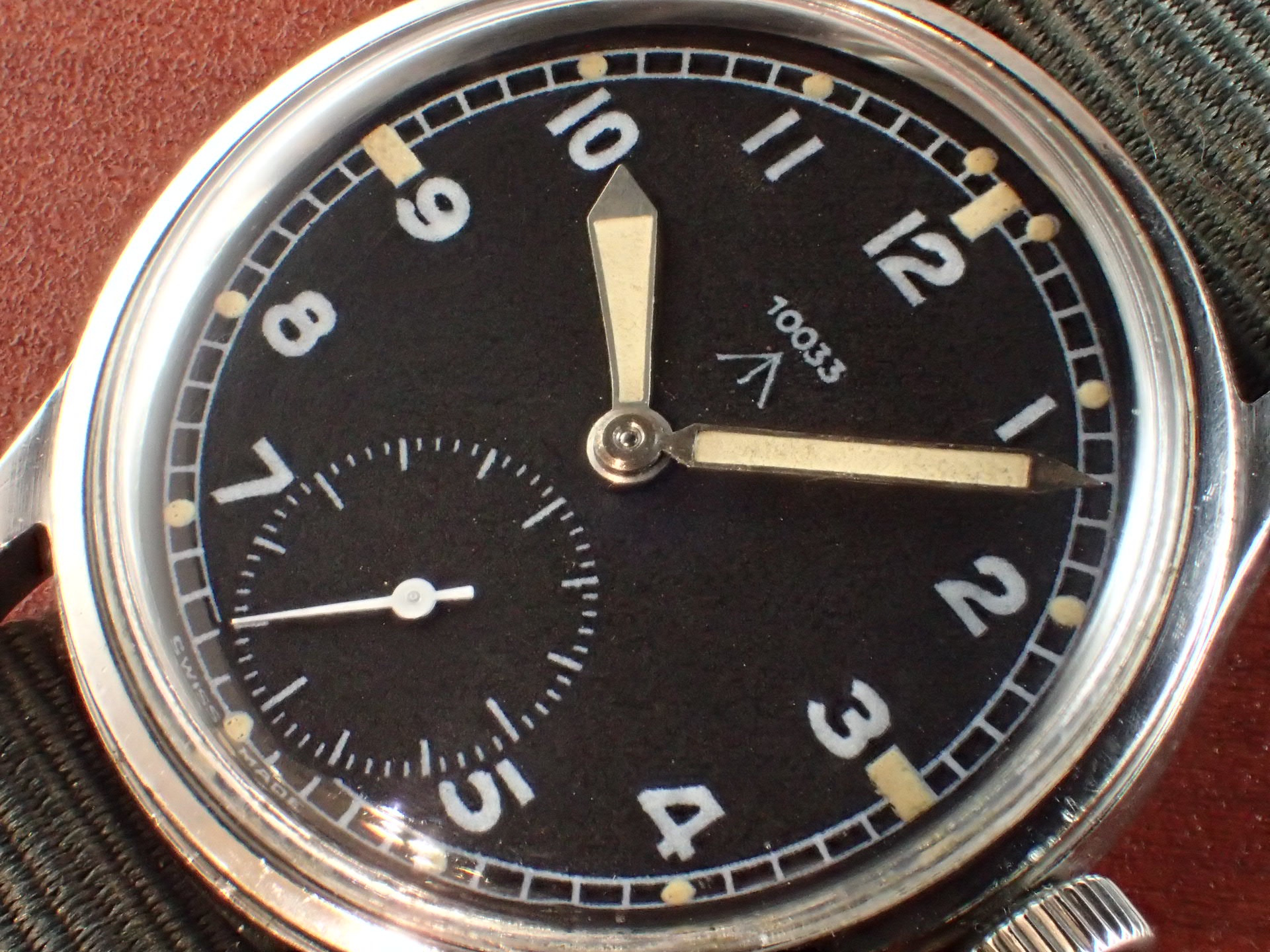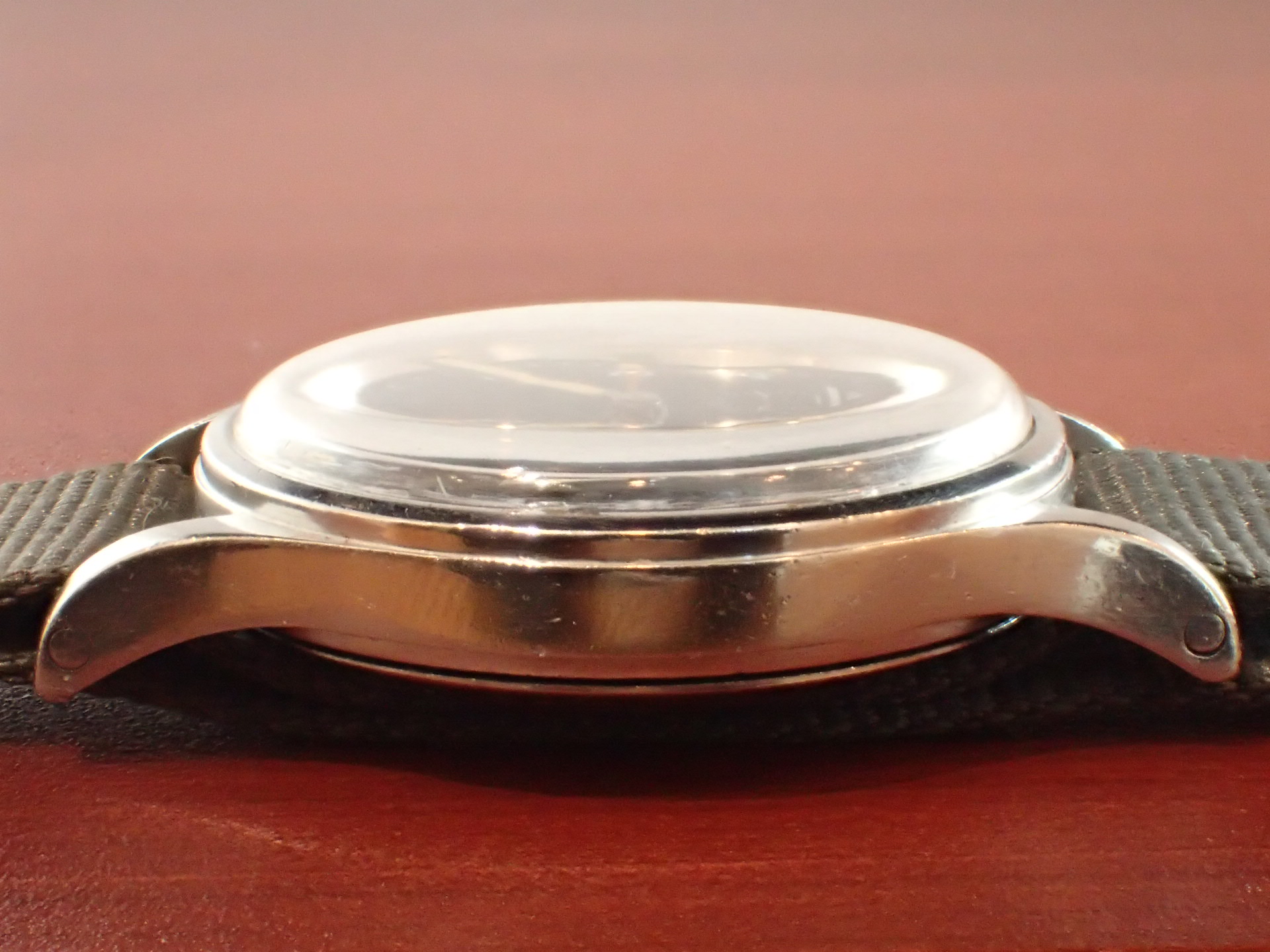 第二次世界大戦でイギリス陸軍が使用したW.W.W.シリーズには、モデルによっていくつかの文字盤バリエーションがあります。このモデルもその一つですが、これは、1960年代にイギリス国防省(MoD)においてリプレイスされた文字盤です。ブランド名は入らず、ブロードアローとコードのみが表記されたこの文字盤、いかにもミリタリーらしいデザインでかなりカッコいいです。そして、滅多に市場には出ないレアモデルです。文字盤は目立つ傷や汚れはなく綺麗な状態を維持しています。ケースは小傷と若干のポリッシュが見られます。変わり種のW.W.W.も面白いです。こちらは委託品となりますが、当店で分解掃除後にお渡しする為、1年間の修理保証書が付属します。