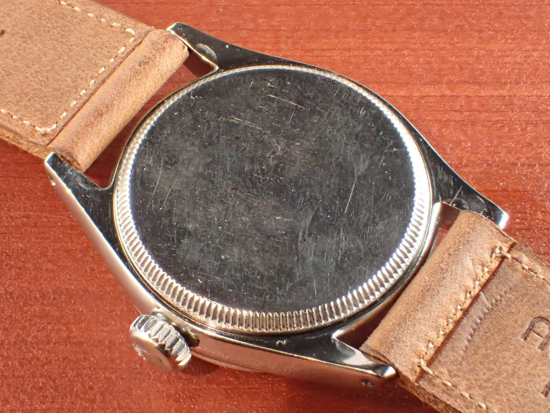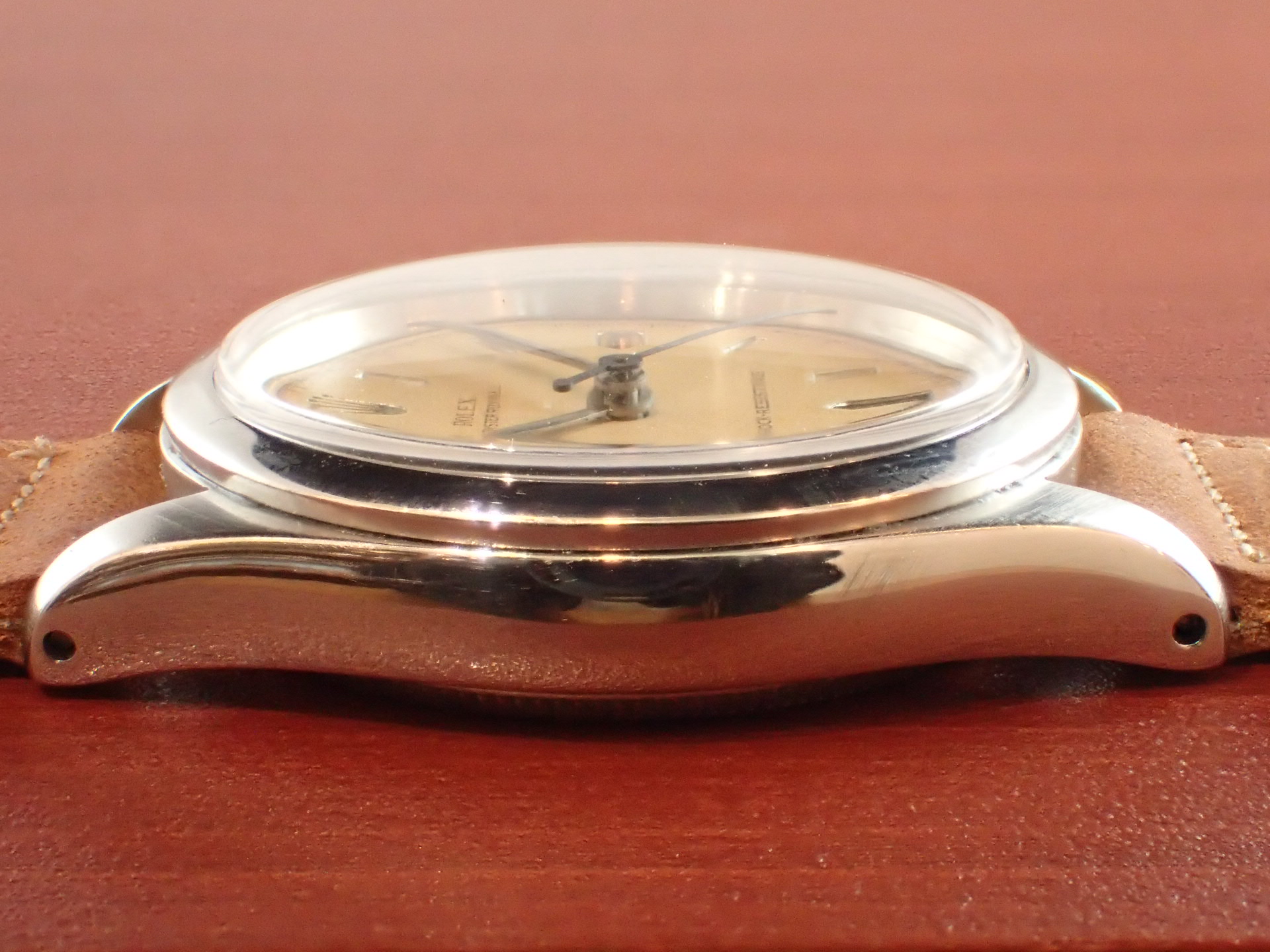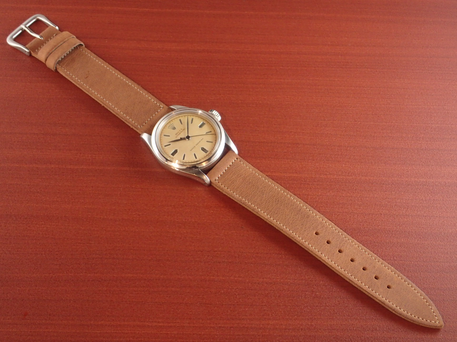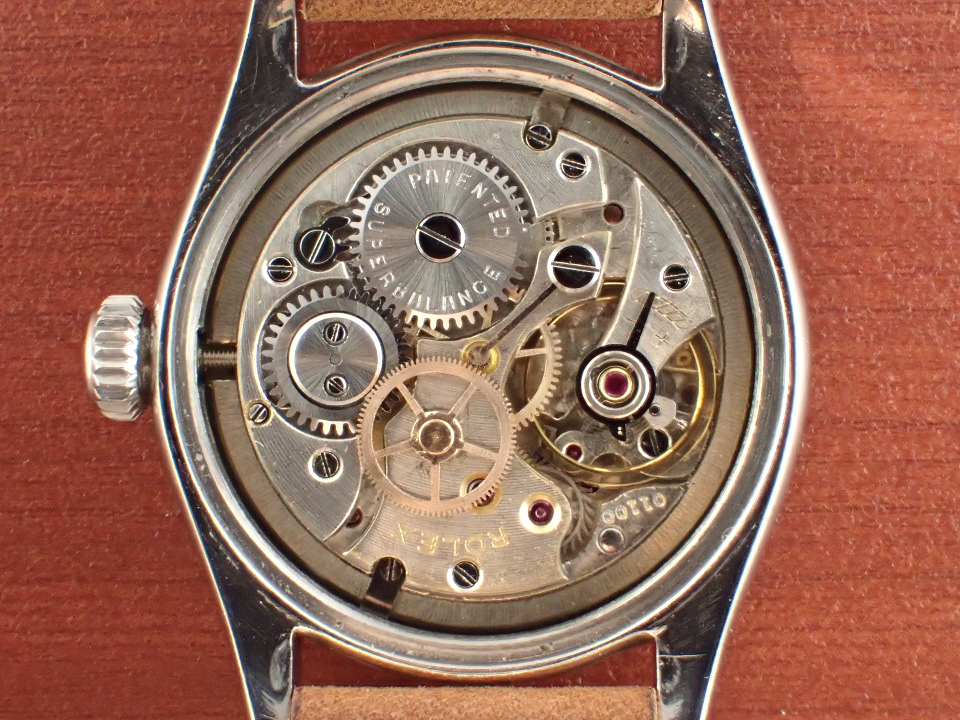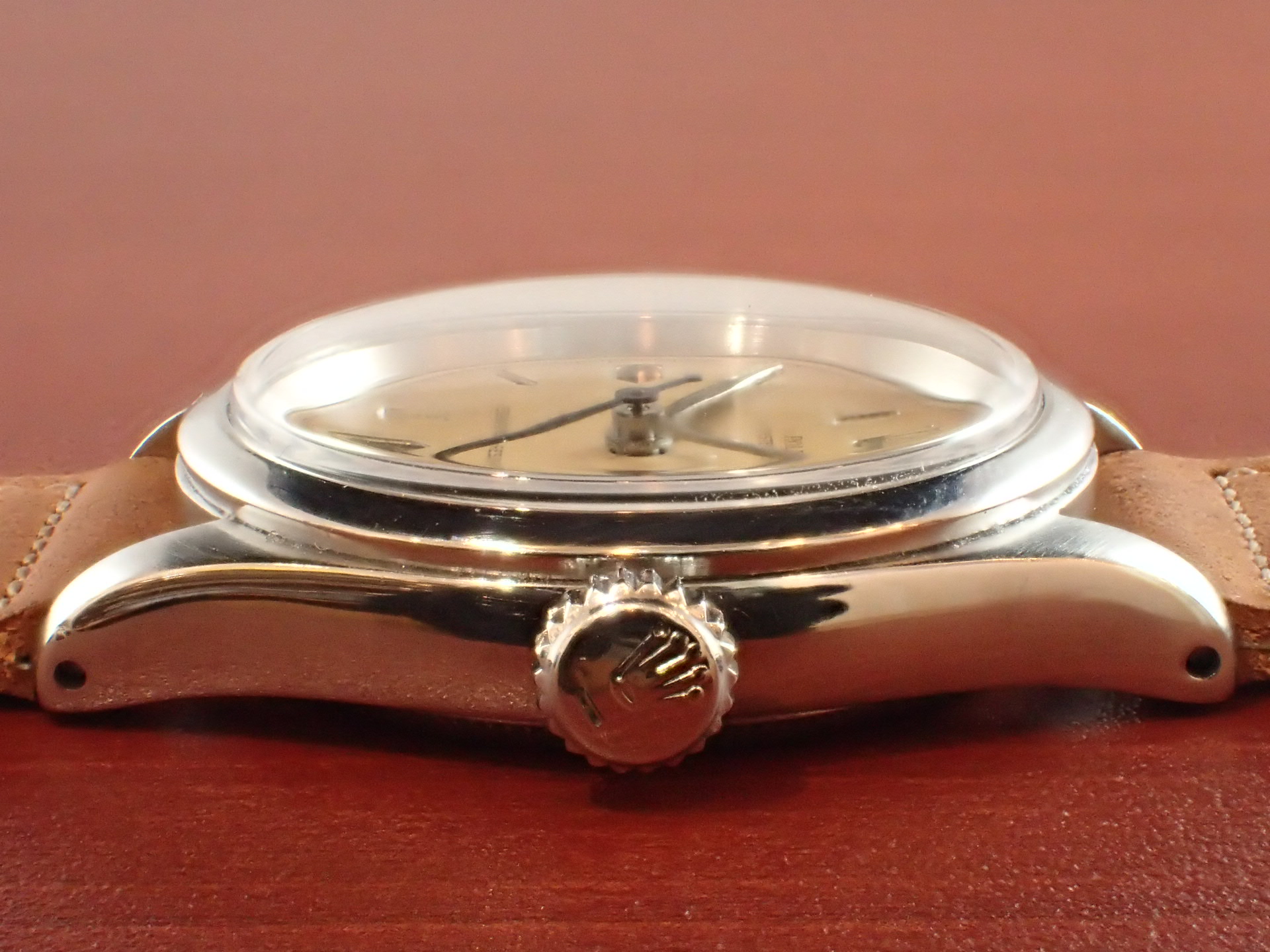 1950年代にロレックスが製造したボーイズサイズの手巻きモデルです。Ref.6244はさまざまな文字盤デザインが存在しますが、このモデルは、掘り込みの砲弾インデックスにリーフハンドの組み合わせです。ダイヤル全体が均一に経年変化した大変良い雰囲気です。秒針はブルースチールです。ケースはやや磨きを感じますが、目立つ大きな傷はなく、概ね良好な状態です。ケースサイドのリファレンスナンバーやシリアルナンバーもしっかり読み取れます。ムーブメントは耐震装置付きです。分解掃除済みで日差30秒程度で稼働しています。