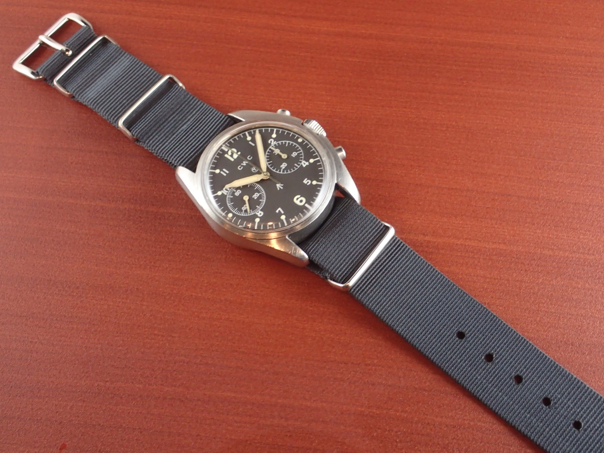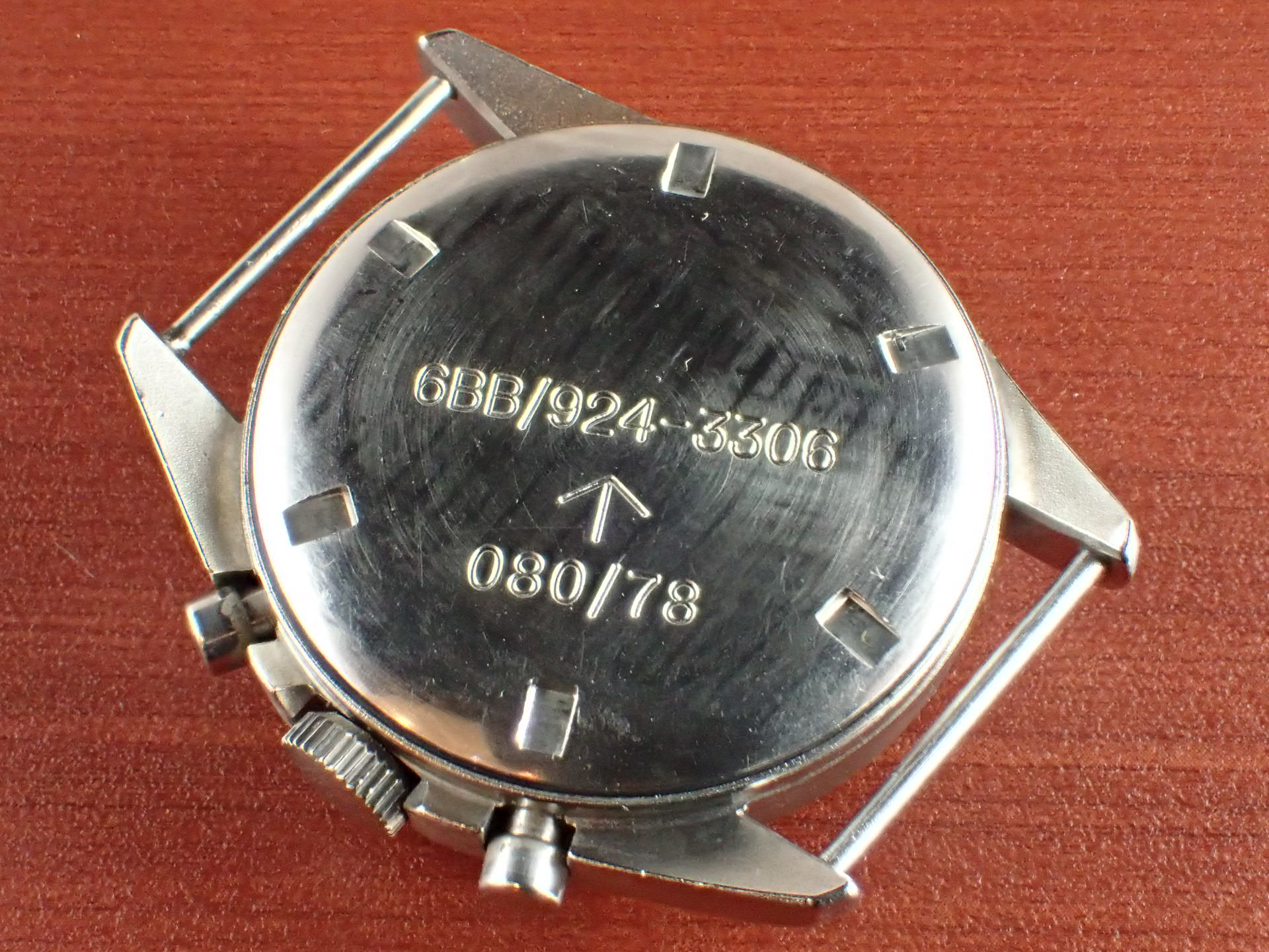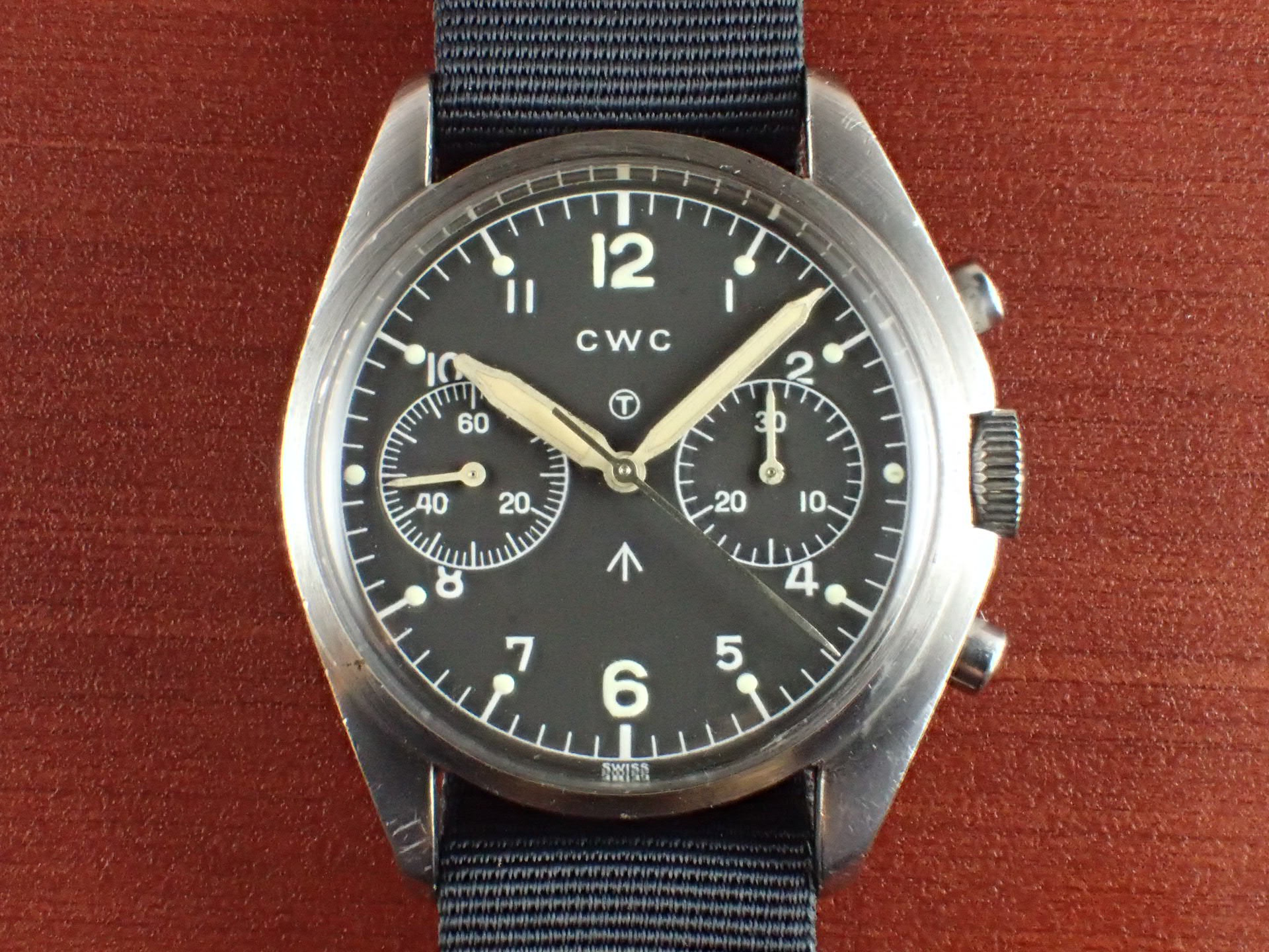 1970年~1981年までイギリス空軍(6BB)及び海軍(0552)、少量に陸軍(W10)のパイロットに支給された、バルジュー7733を搭載したクロノグラフシリーズ。ハミルトン、プレシスタ、ニューマーク、そしてこのCWC(Cabot Watch Co.)が同スペックで製造しました。同仕様で製造されたこれらのシリーズは「FAB FOUR(ファブフォー)」と呼ばれています。こちらは1978年に空軍に支給された個体です。