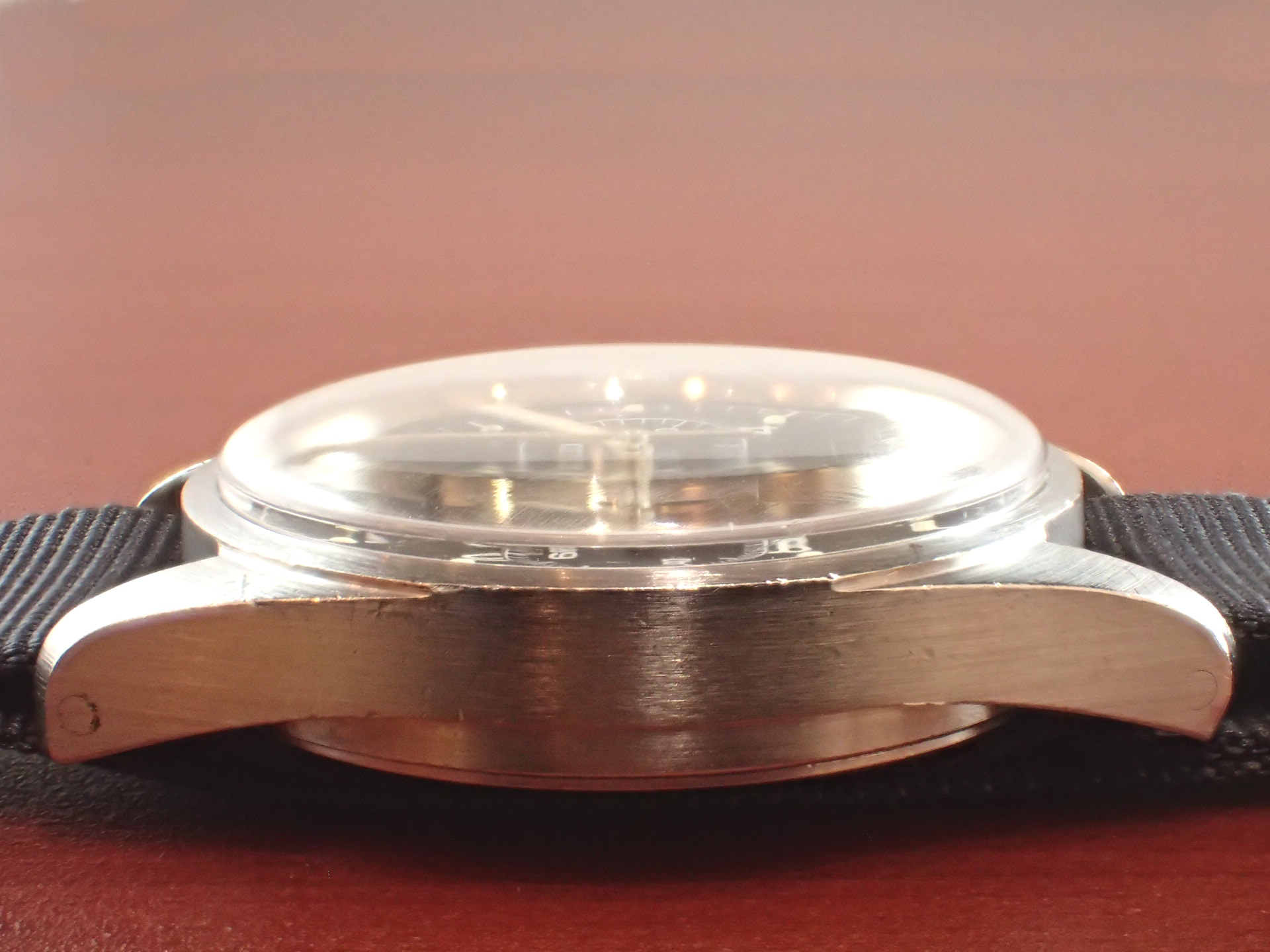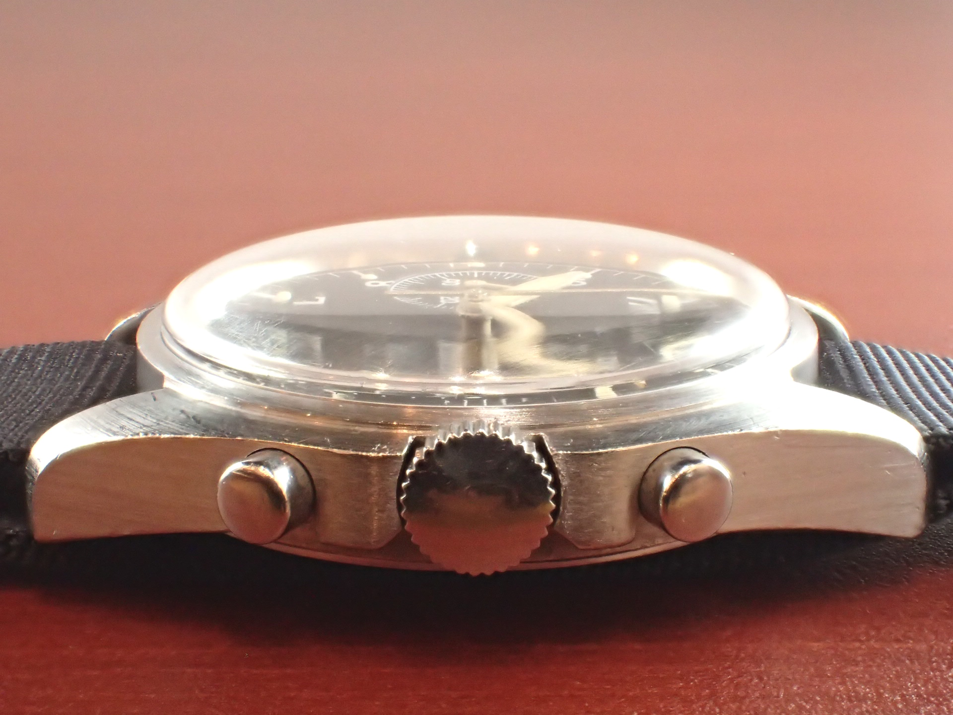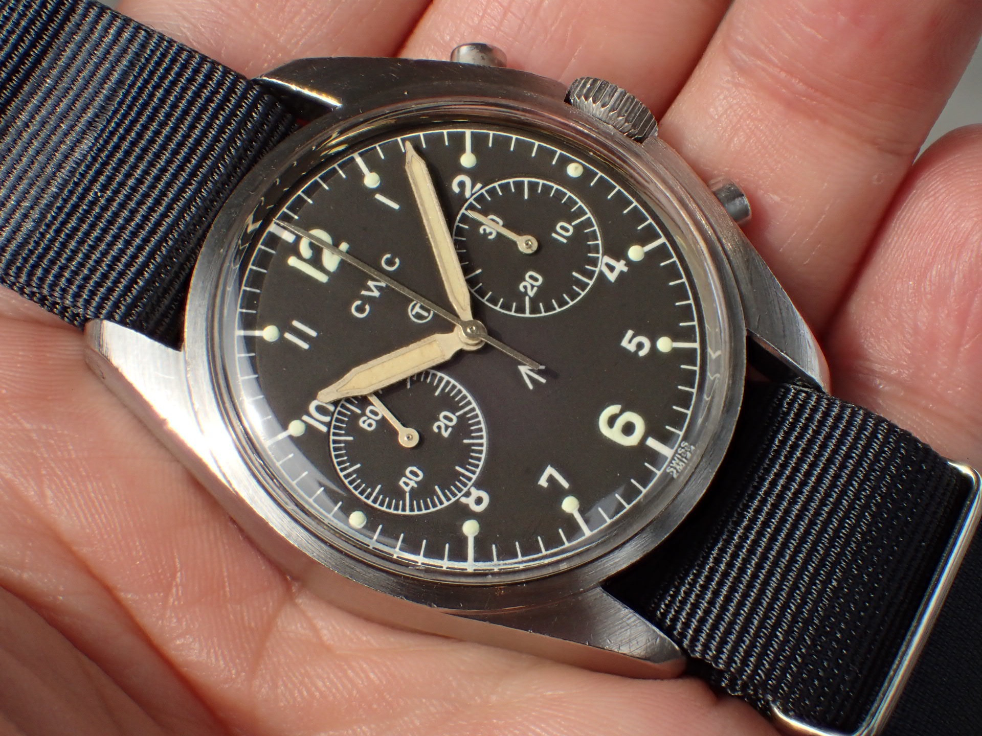 1970年~1981年までイギリス空軍(6BB)及び海軍(0552)、少量に陸軍(W10)のパイロットに支給された、バルジュー7733を搭載したクロノグラフシリーズ。ハミルトン、プレシスタ、ニューマーク、そしてこのCWC(Cabot Watch Co.)が同スペックで製造しました。同仕様で製造されたこれらのシリーズは「FAB FOUR(ファブフォー)」と呼ばれています。こちらは1978年に空軍に支給された個体です。